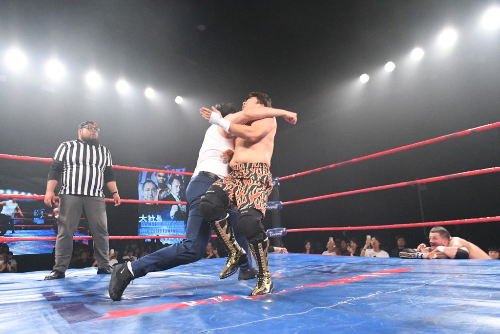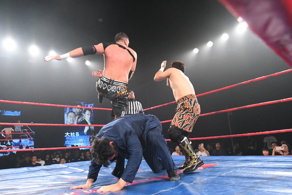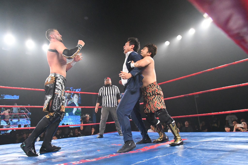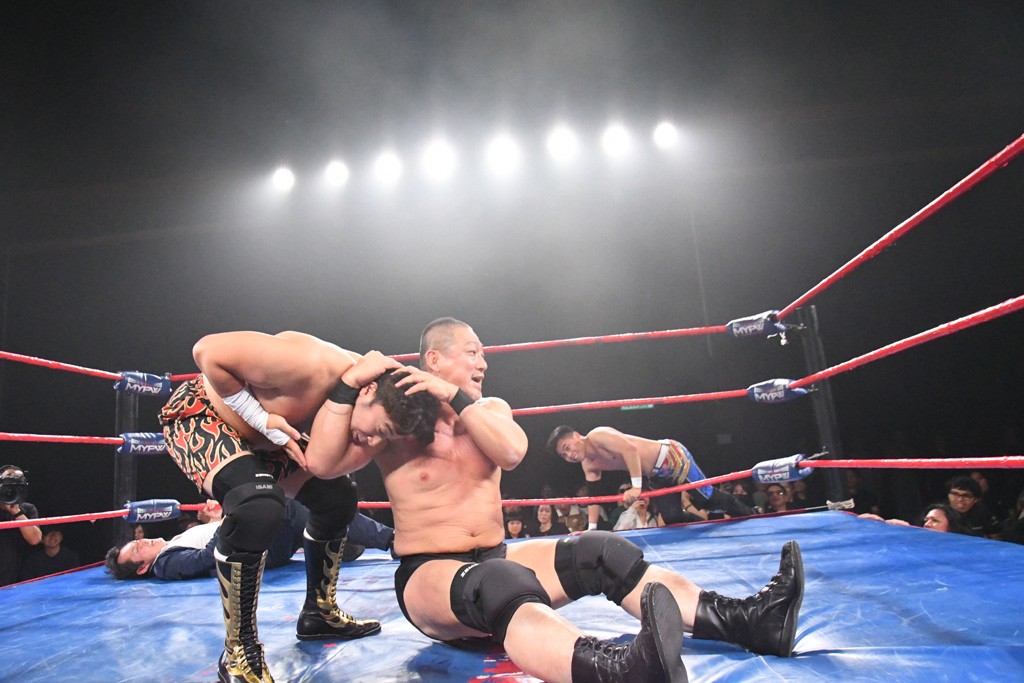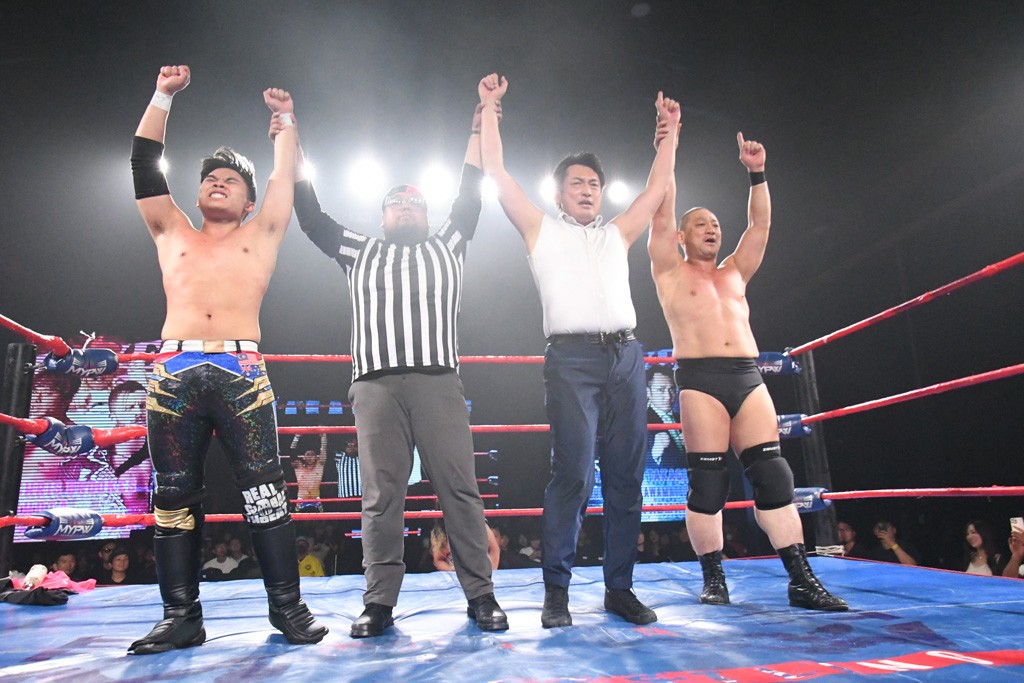 今大会の開催に尽力した髙木、川松の重鎮コンビとMYPWからエマンが加わったトリオ。対するはクリス、翔太、アレキサンダーはヒールっぽいスタンス。クリス組が襲い掛かって試合がスタートすると、のっけからの場外戦で地元マレーシアのお客さんは大興奮。リングに戻した川松に3人はシャーデンタワー。これは髙木とエマンがカットに入って川松を救出。髙木が翔太とアレキサンダーに両腕ラリアット。しかしながらドラゴンリングインはマレーシアでも迎撃されてしまうと、クリスがゴムベルトを持ちだして髙木の口に突っ込むと、ステージまで引っ張ってのゴムパッチンの刑。苦しい髙木だったがクリスのブレーンバスター狙いを切り返してぶん投げてピンチを脱出。エマンがクリスにエプロンからのスイングDDT。クリスもエマンをトップロープに叩きつけてのネックスクリューでやり返し、アレキサンダーとタッチ。エマンとアレキサンダーのラリアットが相打ちとなって戦況は川松vs翔太。川松が東京スカイツリーボムを放つも続くアックスボンバーは翔太に見切られ、クリス組の串刺し攻撃の餌食に。翔太が川松を羽交い絞め。クリスがビンタもかわされて翔太に誤爆。エマンがウラカンホイップでクリスも場外に出すとトペ・スイシーダ。髙木が飛ぶと思われたがアレキサンダーが阻止。アレキサンダーはトルニージョを投下。勝機と見た翔太がリングに戻された川松にフロッグスプラッシュもかわされて自爆。髙木がスタナー、エマンがスイングDDTで加勢。川松の下町ロケットはクリスとアレキサンダーがカット。髙木とエマンが2人を排除し、川松が孤立した翔太にアックスボンバーを放って3カウント。