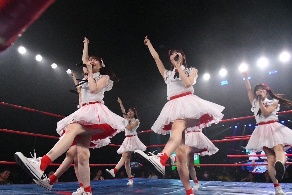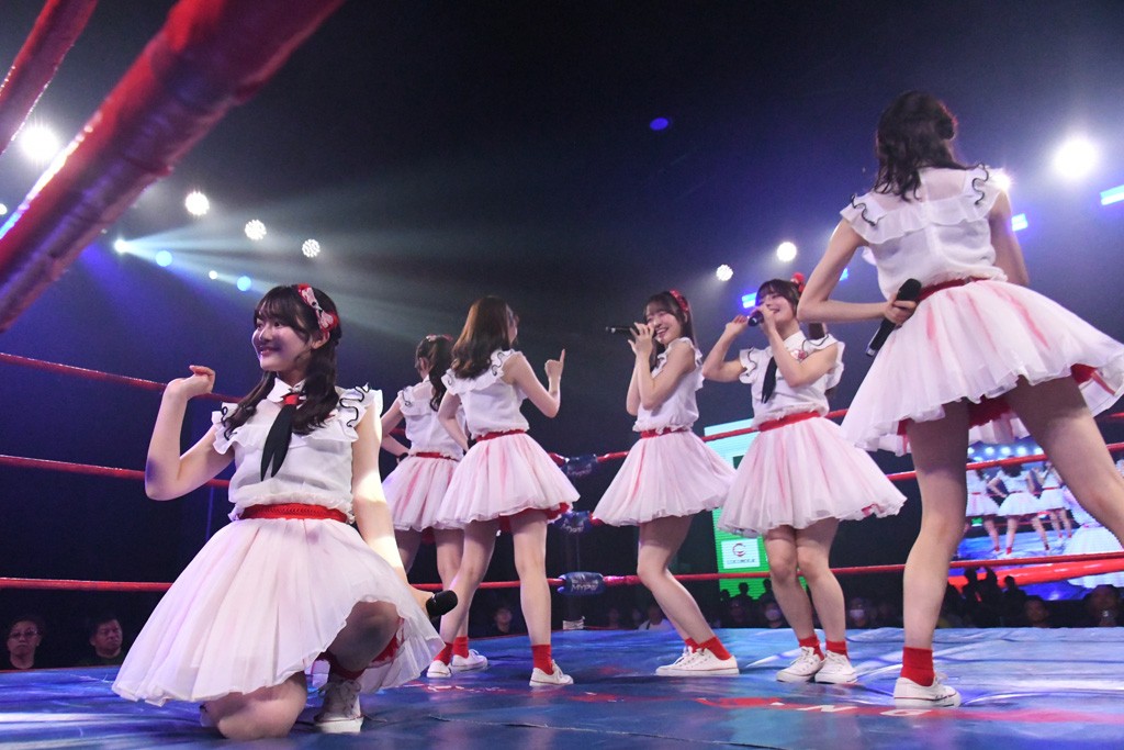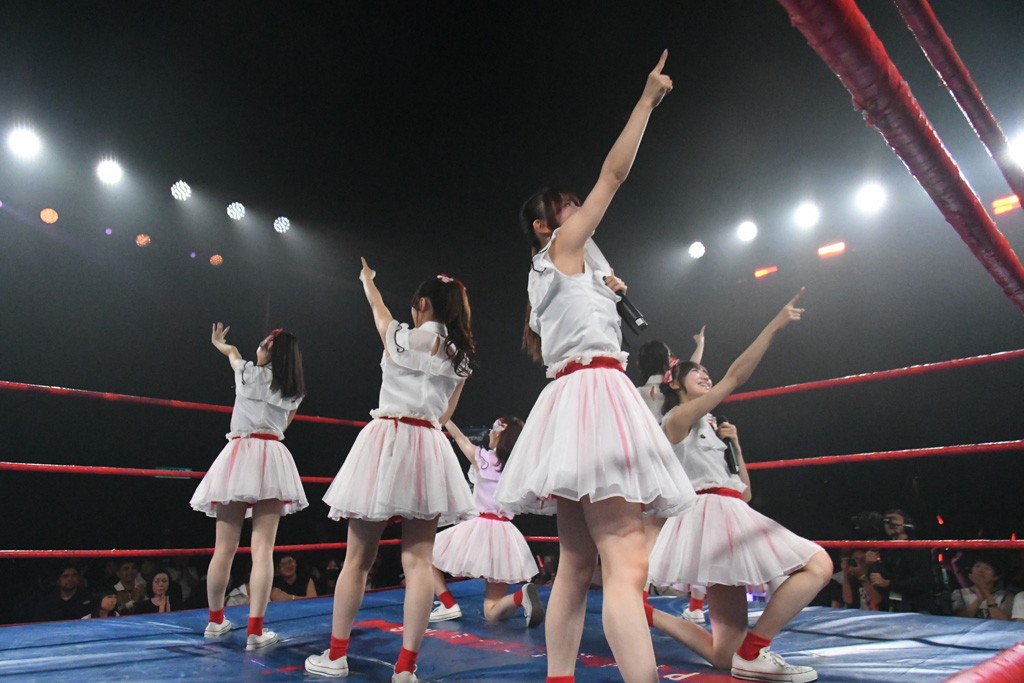 メインイベントが終わるとKLP48とNGT48が登場し『会いたかった』を披露。KLP48ともえあずさんの呼び込みで矢口さんのほか荒井優希、アップアップガールズ(プロレス)、KLP48、NGT48のメンバーがリングインし『LOVEマシーン』を熱唱。全出演者も出てきて大盛り上がりの中、マレーシア『LOVE & PEACE』は幕を下りた。
