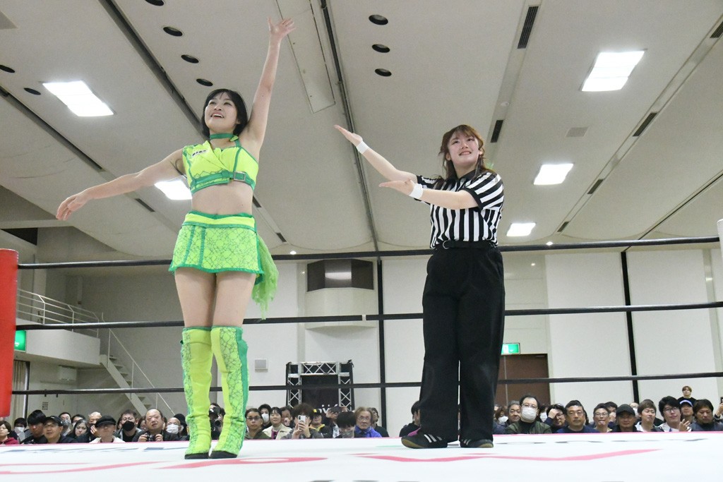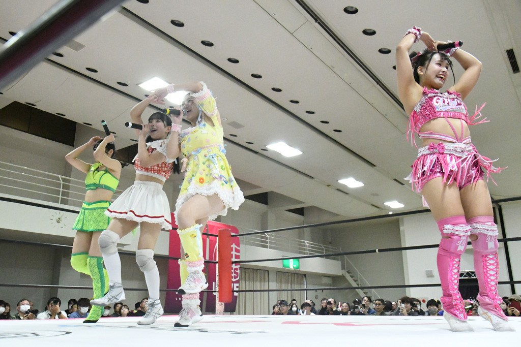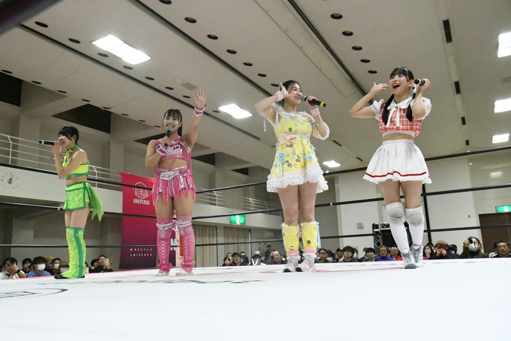 試合後、中島がマイクを取る。中島「汐珠、勝ちたかったね。でも、中島翔子さんはお前の倍の倍ぐらいプロレスやってるからちょっと厳しかったね~。でも、今日は楽しかったから花マルじゃないでしょうか? オマエに花マルをやろう」汐珠「今日、はじめての凱旋で東京女子で石川県も初めてなのに、こんなに来てくださったことはすごく花マルなことだけど、今日の今の汐珠はまだ花マルじゃないので。中島さんが花マルと言ってくださったのはすごく嬉しいけど、まだまだなので。もっと花マルな汐珠を石川県でもこれからの東京女子でも見せていきます!」中島「じゃあその第一歩として、この金沢の地を最後に挨拶してみんなをハッピーにして興行を終わらせるんだ」場内「ウタ」コール。汐珠「また石川県に東京女子が来られるように、もっと大きくなって、汐珠も東京女子の選手もみんなで大きくなって帰ってきます! 今日は本当にありがとうございました!」最後は汐珠が石川県のハンドサインを3人に促して記念撮影。