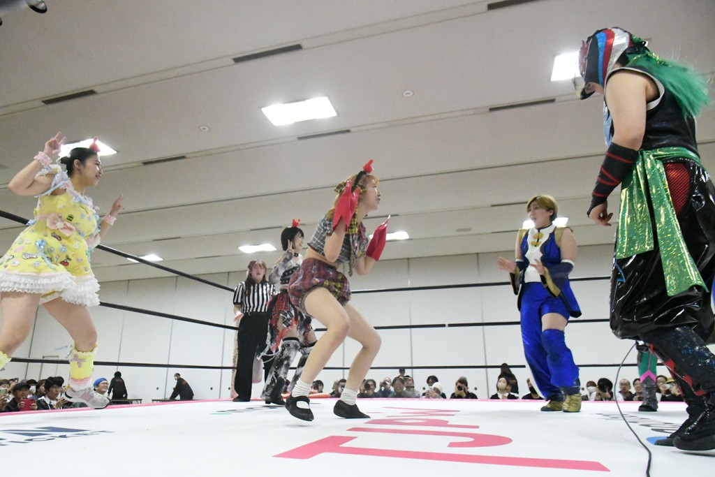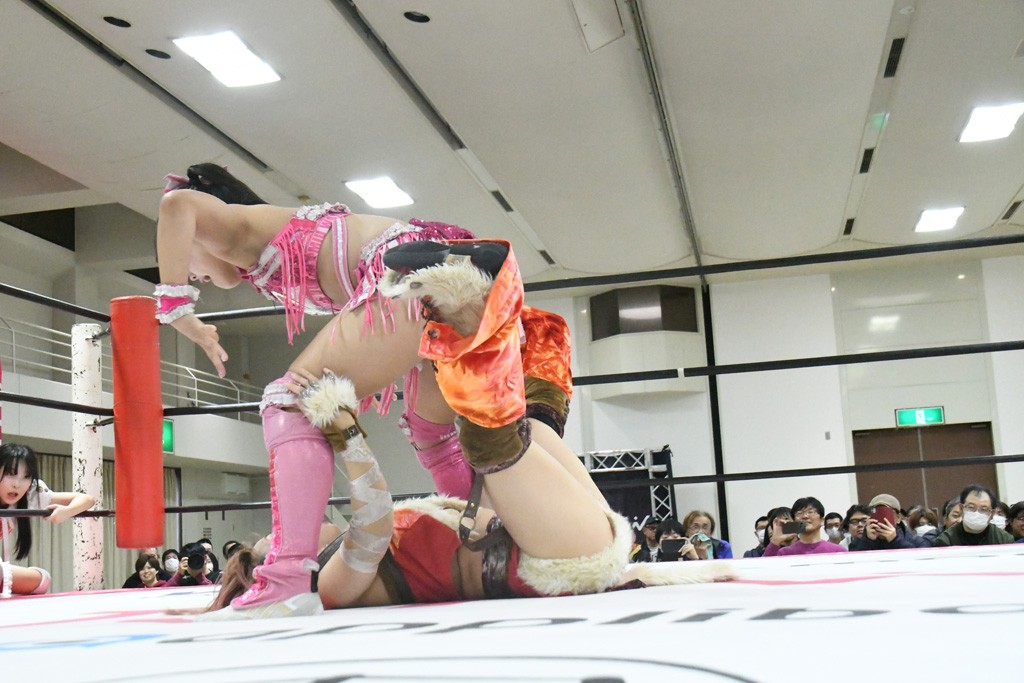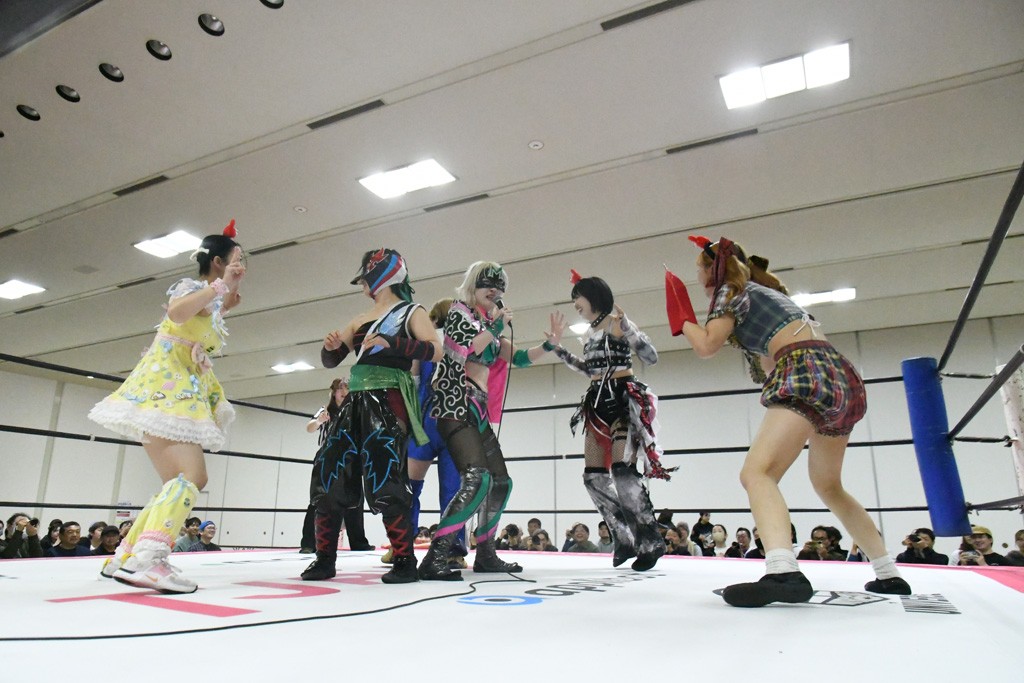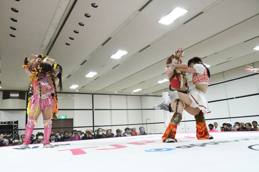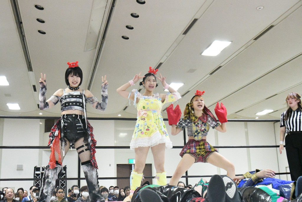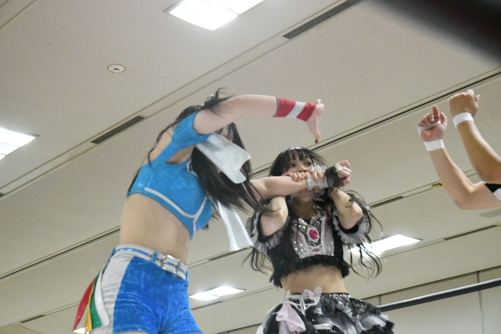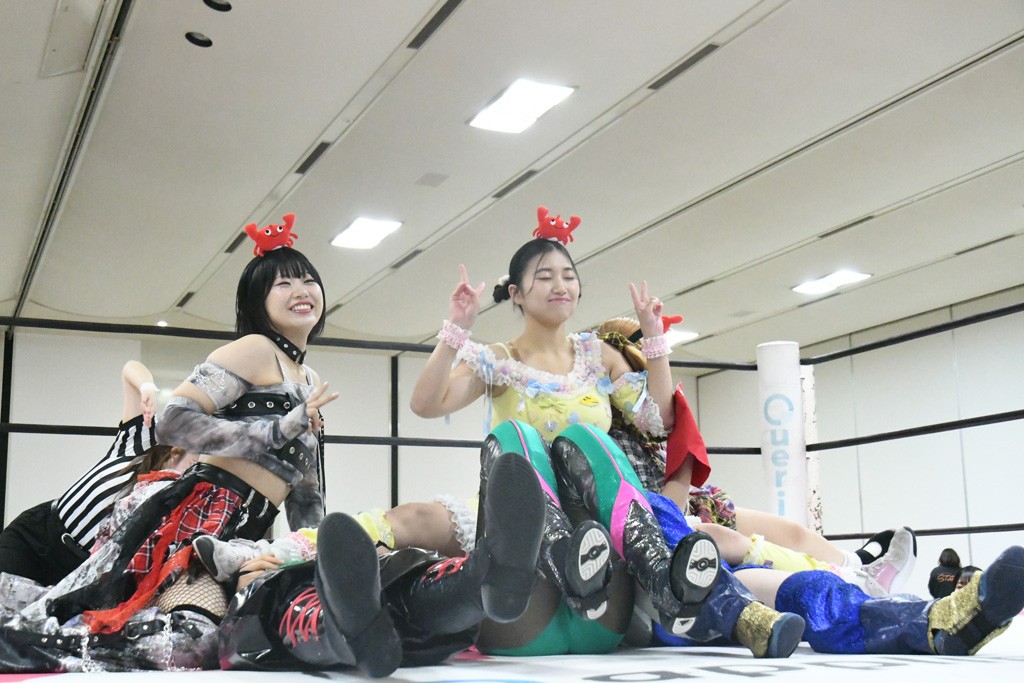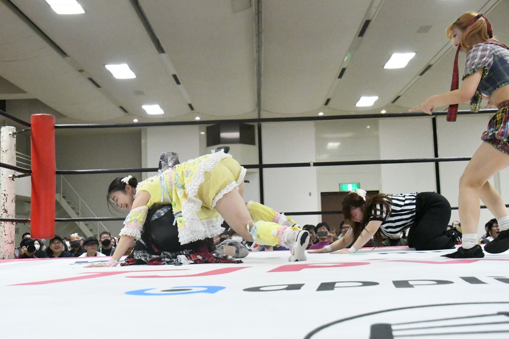 ミサヲのマイク中にリカ、らく、ぽむはなぜかカニに変身。さらにカニに囲まれ、ツメでのサミングで3人がダウン。リカ、らく、ぽむはカニカニエクスプレスを発動し、横移動での踏みつけからカニカニフォールもカウント2。カニのボディーアタックを同士討ちさせた3人。ミサヲがすかさずスプレーを噴霧し逆転。ぽむがじゃんけん勝負を真弥に申し出る。真弥がグーを出すも、ぽむはツメを取って素手であっさりパーを出して勝負あり。動揺する真弥を丸め込むもカウント2。怒りの真弥はボディースラムから「悪いヤツに騙されてしまって大変申し訳ございませんでした!」と謝罪。その後は捕まったぽむだが、鳥喰へのラフォーレ原宿で逆転。らくがぽっぽーチョップ連打。ダイビング・ぽっぽーチョップはカウント2。鳥喰はらくに縦アームドラッグでやり返してミサヲとタッチ。らくがミサヲにフロント・ネックロック。ミサヲがかわしてチキンウイング・フェースロックもらくがロープエスケープ。らくがかがやきでやり返してリカと交替。ミサヲはリカにレインメーカー式ニーを発射。真弥が出てくるとリカがミサイルヒップ。これはミサヲと鳥喰がカット。その2人をらくぽむが連係で排除。リカのドラゴンスリーパーを潰した真弥が河底撈魚。スパインバスター狙いがリカが首絞めで回避。リカをエプロンに出した真弥がニーアタック。ミサヲもエプロンからヒザを繰り出し、鳥喰はセカンドロープ・ローリングセントーンで追撃。真弥はコーナーに登ると「ベルト防衛するぞ!」とダイビング・謝罪ニードロップを投下もかわされて自爆。すかさずリカがホワイトドラゴンスリーパーで絡みついてギブアップ勝ち。これでアイアンマンが再びリカに移動。試合後にらくがアイマスクをつけさせて丸め込んだがカウント2で返されて奪取失敗。リカは脱兎のごとく逃げていった。