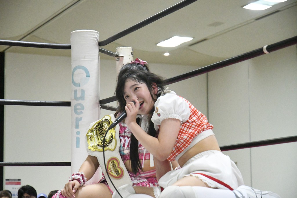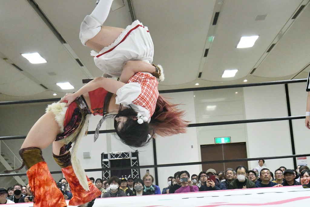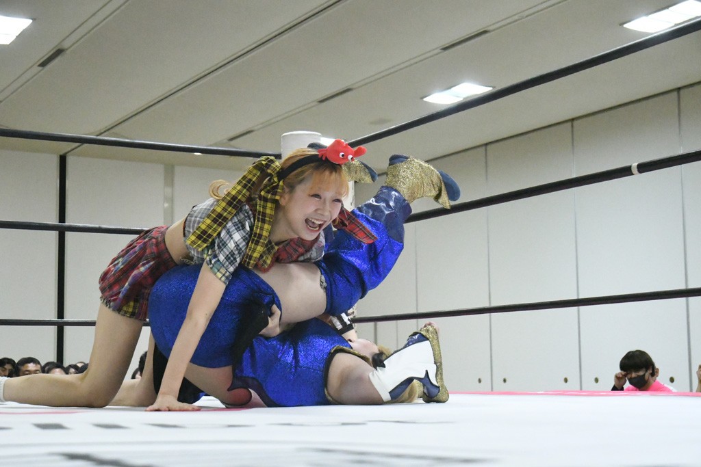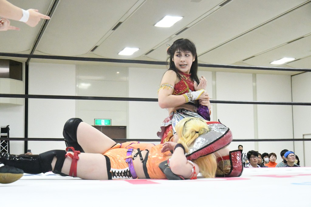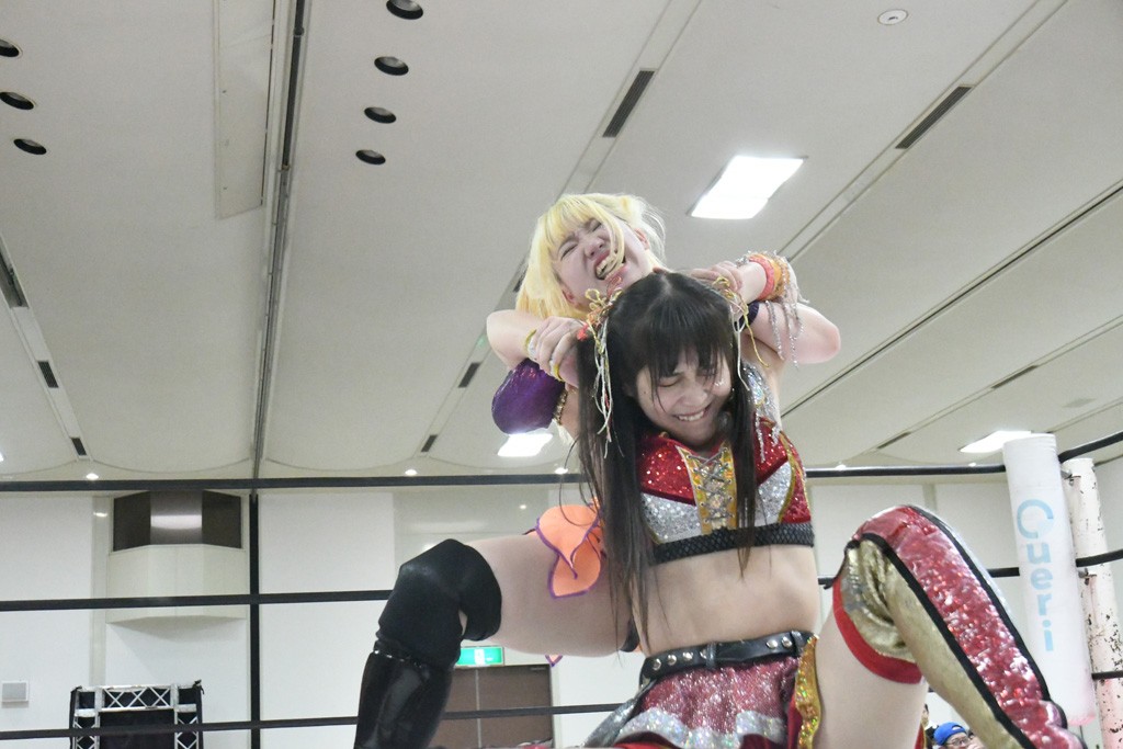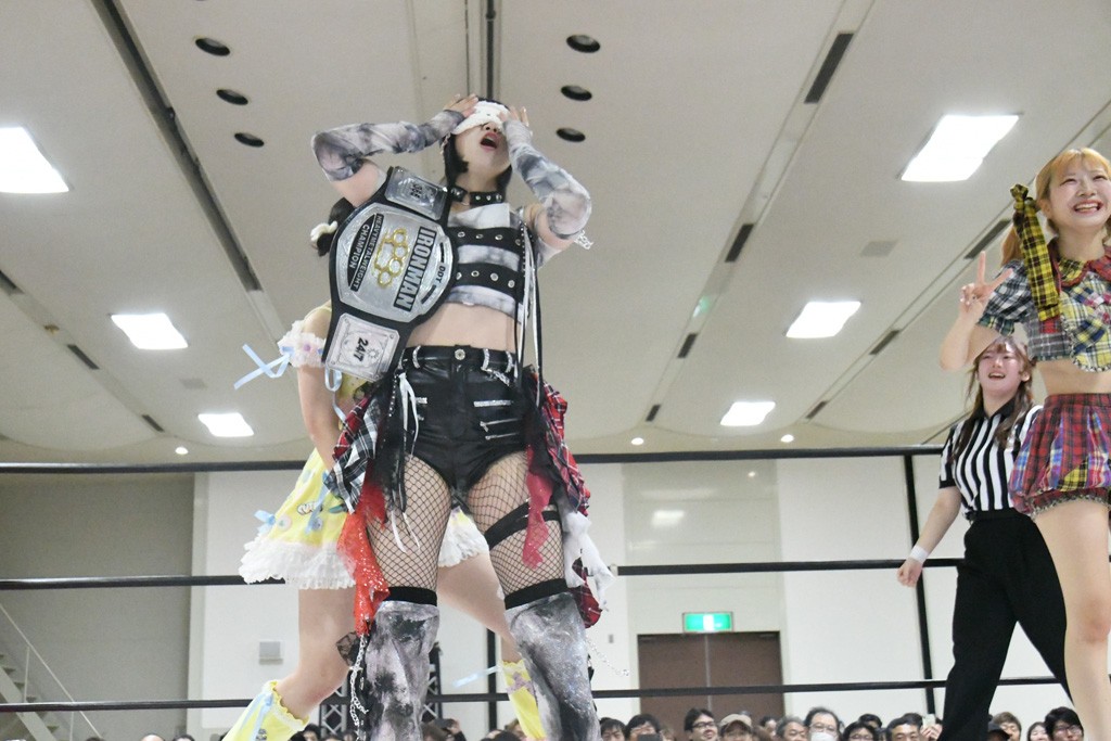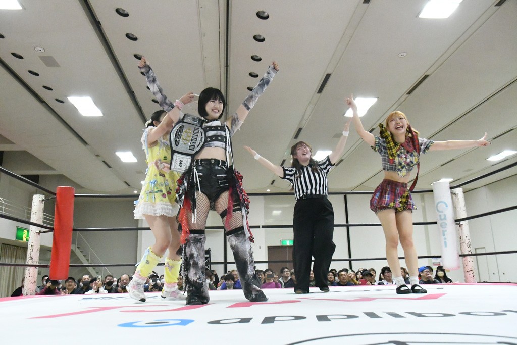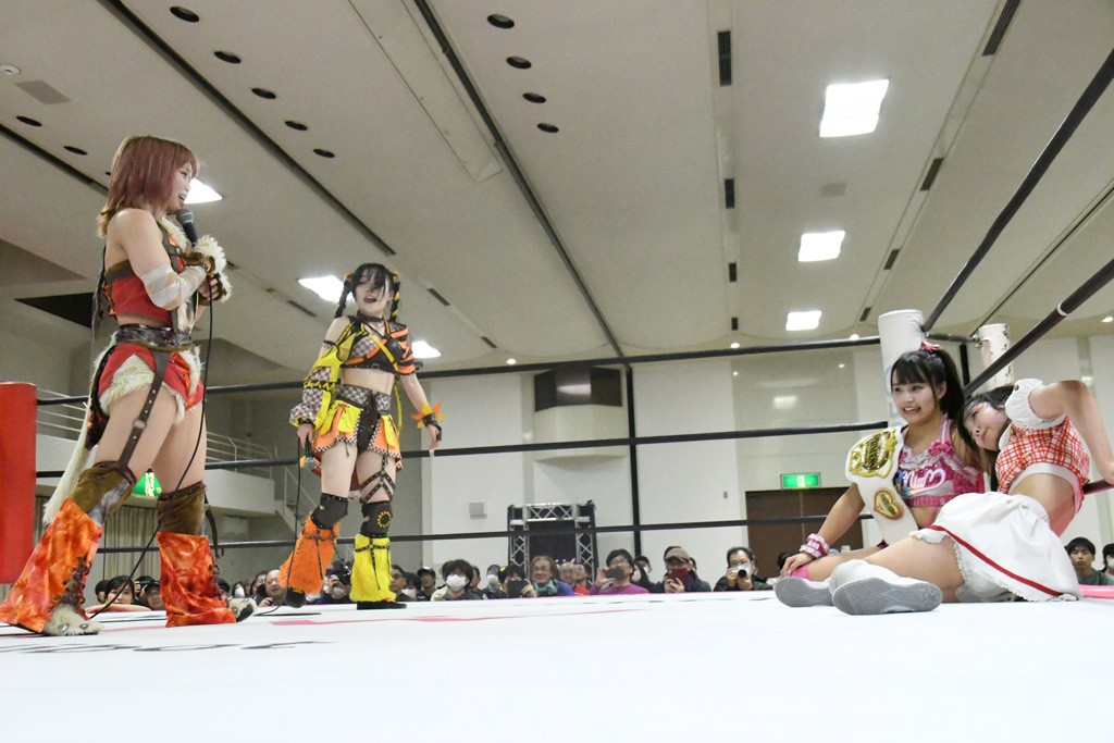 ミサヲのマイク中にリカ、らく、ぽむはなぜかカニに変身。さらにカニに囲まれ、ツメでのサミングで3人がダウン。リカ、らく、ぽむはカニカニエクスプレスを発動し、横移動での踏みつけからカニカニフォールもカウント2。カニのボディーアタックを同士討ちさせた3人。ミサヲがすかさずスプレーを噴霧し逆転。ぽむがじゃんけん勝負を真弥に申し出る。真弥がグーを出すも、ぽむはツメを取って素手であっさりパーを出して勝負あり。動揺する真弥を丸め込むもカウント2。怒りの真弥はボディースラムから「悪いヤツに騙されてしまって大変申し訳ございませんでした!」と謝罪。その後は捕まったぽむだが、鳥喰へのラフォーレ原宿で逆転。らくがぽっぽーチョップ連打。ダイビング・ぽっぽーチョップはカウント2。鳥喰はらくに縦アームドラッグでやり返してミサヲとタッチ。らくがミサヲにフロント・ネックロック。ミサヲがかわしてチキンウイング・フェースロックもらくがロープエスケープ。らくがかがやきでやり返してリカと交替。ミサヲはリカにレインメーカー式ニーを発射。真弥が出てくるとリカがミサイルヒップ。これはミサヲと鳥喰がカット。その2人をらくぽむが連係で排除。リカのドラゴンスリーパーを潰した真弥が河底撈魚。スパインバスター狙いがリカが首絞めで回避。リカをエプロンに出した真弥がニーアタック。ミサヲもエプロンからヒザを繰り出し、鳥喰はセカンドロープ・ローリングセントーンで追撃。真弥はコーナーに登ると「ベルト防衛するぞ!」とダイビング・謝罪ニードロップを投下もかわされて自爆。すかさずリカがホワイトドラゴンスリーパーで絡みついてギブアップ勝ち。これでアイアンマンが再びリカに移動。試合後にらくがアイマスクをつけさせて丸め込んだがカウント2で返されて奪取失敗。リカは脱兎のごとく逃げていった。