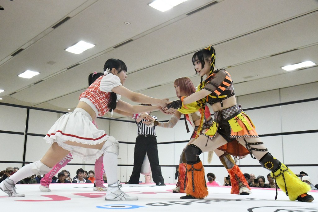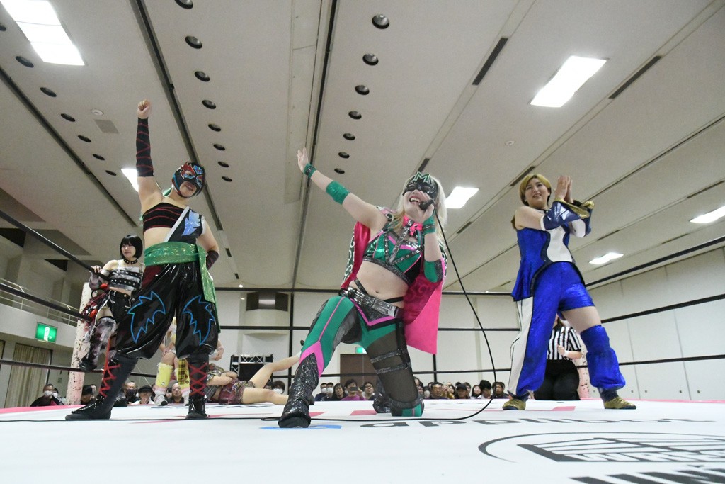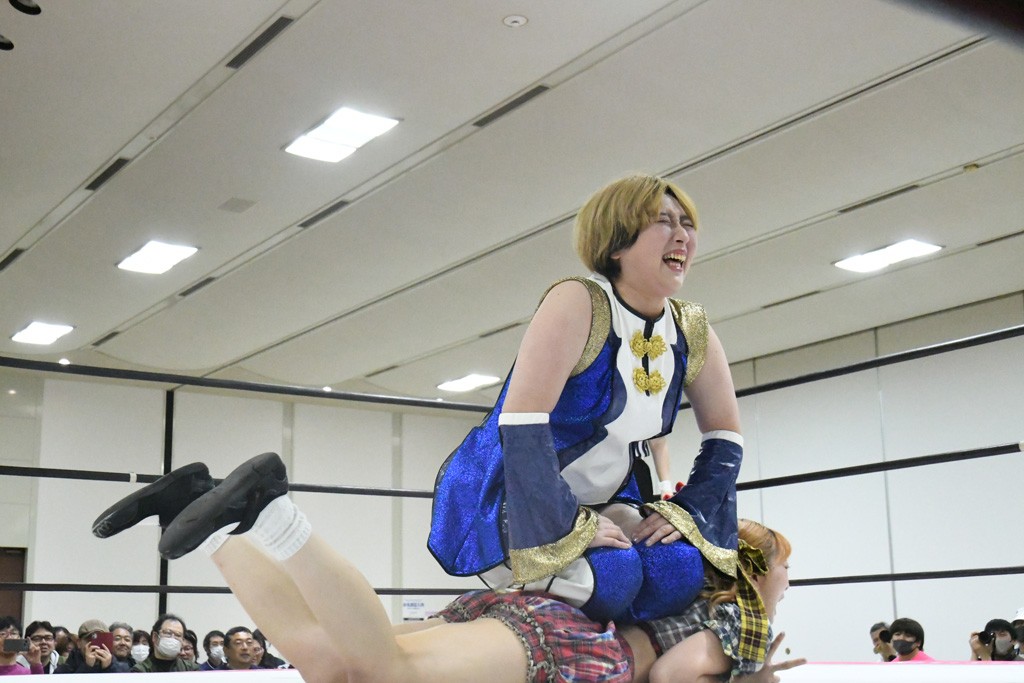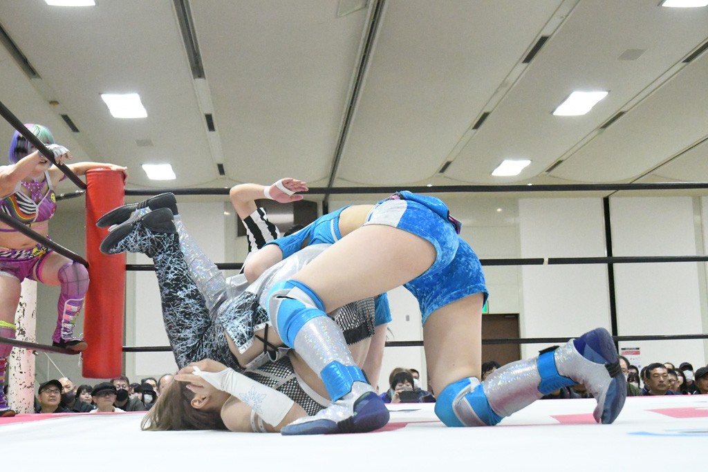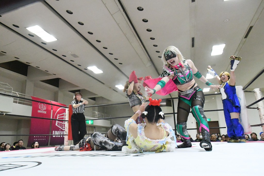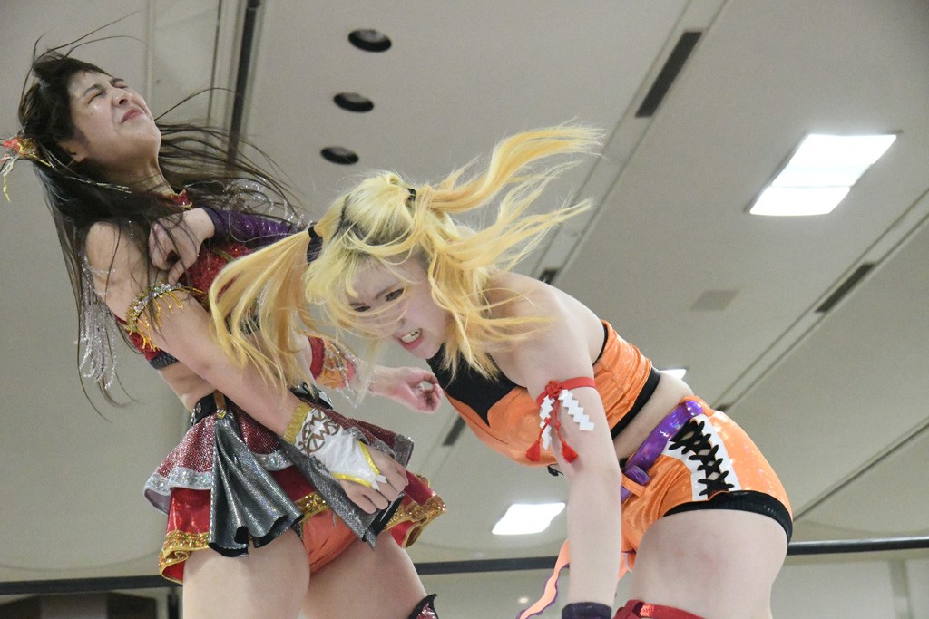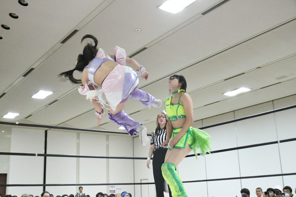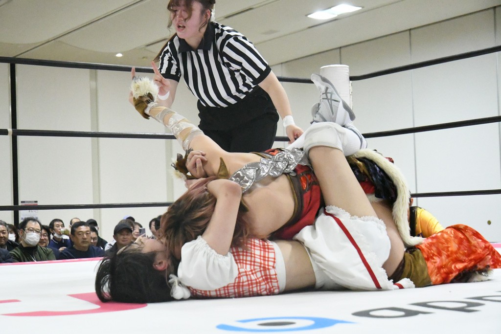 ミサヲのマイク中にリカ、らく、ぽむはなぜかカニに変身。さらにカニに囲まれ、ツメでのサミングで3人がダウン。リカ、らく、ぽむはカニカニエクスプレスを発動し、横移動での踏みつけからカニカニフォールもカウント2。カニのボディーアタックを同士討ちさせた3人。ミサヲがすかさずスプレーを噴霧し逆転。ぽむがじゃんけん勝負を真弥に申し出る。真弥がグーを出すも、ぽむはツメを取って素手であっさりパーを出して勝負あり。動揺する真弥を丸め込むもカウント2。怒りの真弥はボディースラムから「悪いヤツに騙されてしまって大変申し訳ございませんでした!」と謝罪。その後は捕まったぽむだが、鳥喰へのラフォーレ原宿で逆転。らくがぽっぽーチョップ連打。ダイビング・ぽっぽーチョップはカウント2。鳥喰はらくに縦アームドラッグでやり返してミサヲとタッチ。らくがミサヲにフロント・ネックロック。ミサヲがかわしてチキンウイング・フェースロックもらくがロープエスケープ。らくがかがやきでやり返してリカと交替。ミサヲはリカにレインメーカー式ニーを発射。真弥が出てくるとリカがミサイルヒップ。これはミサヲと鳥喰がカット。その2人をらくぽむが連係で排除。リカのドラゴンスリーパーを潰した真弥が河底撈魚。スパインバスター狙いがリカが首絞めで回避。リカをエプロンに出した真弥がニーアタック。ミサヲもエプロンからヒザを繰り出し、鳥喰はセカンドロープ・ローリングセントーンで追撃。真弥はコーナーに登ると「ベルト防衛するぞ!」とダイビング・謝罪ニードロップを投下もかわされて自爆。すかさずリカがホワイトドラゴンスリーパーで絡みついてギブアップ勝ち。これでアイアンマンが再びリカに移動。試合後にらくがアイマスクをつけさせて丸め込んだがカウント2で返されて奪取失敗。リカは脱兎のごとく逃げていった。