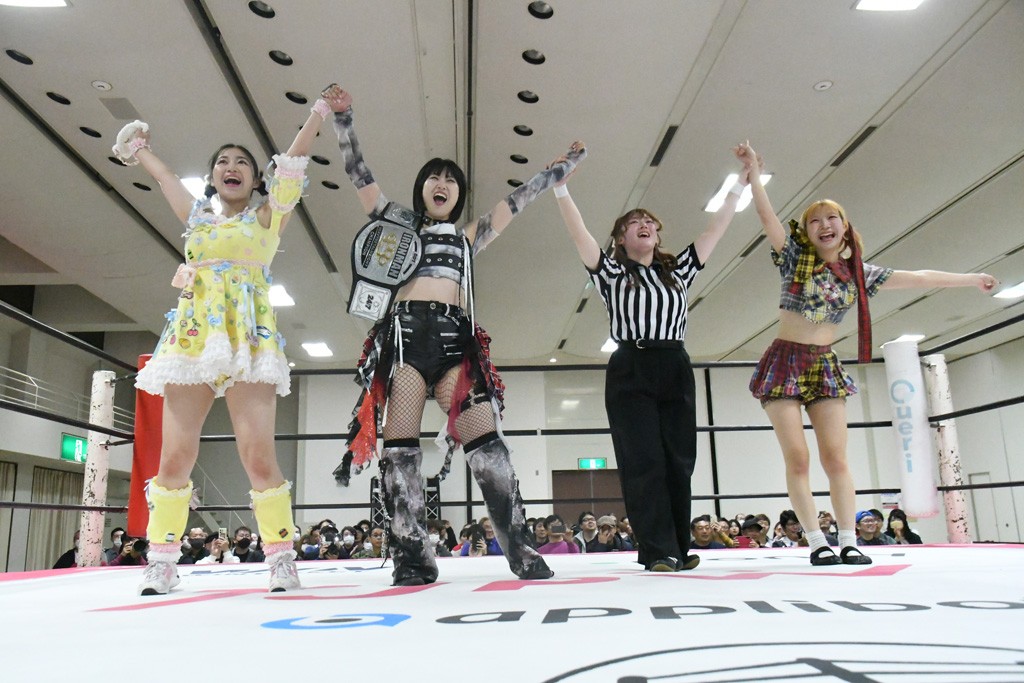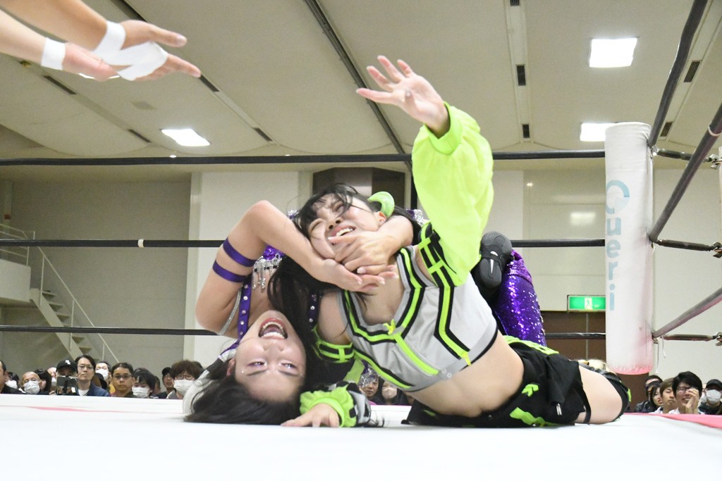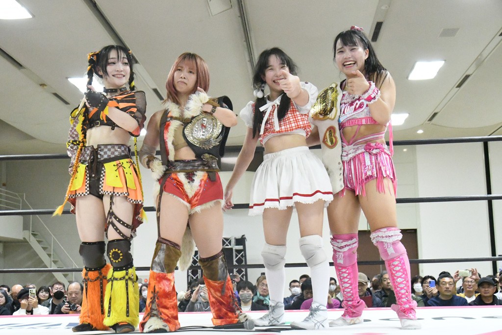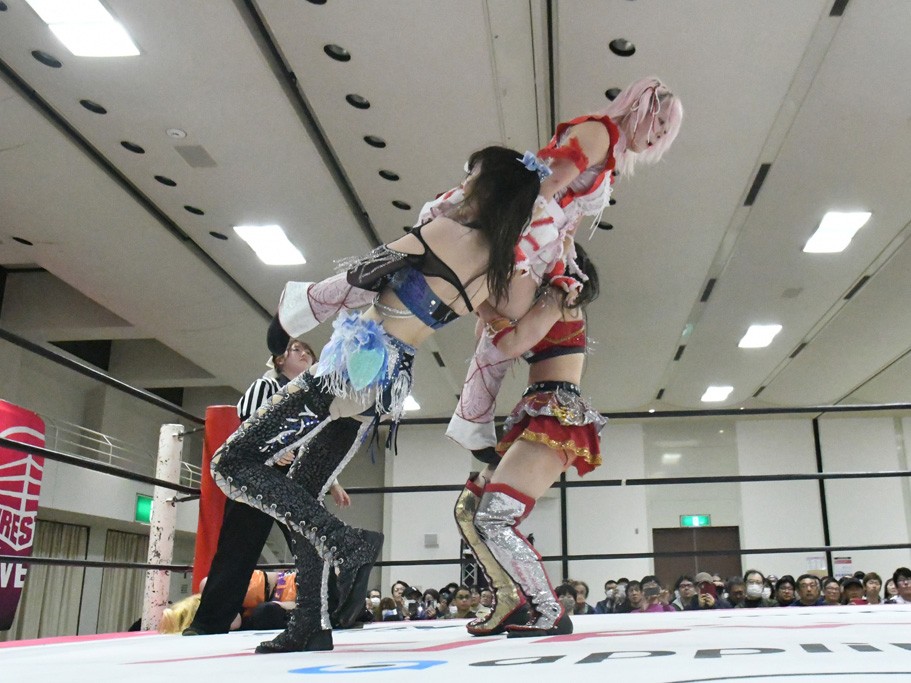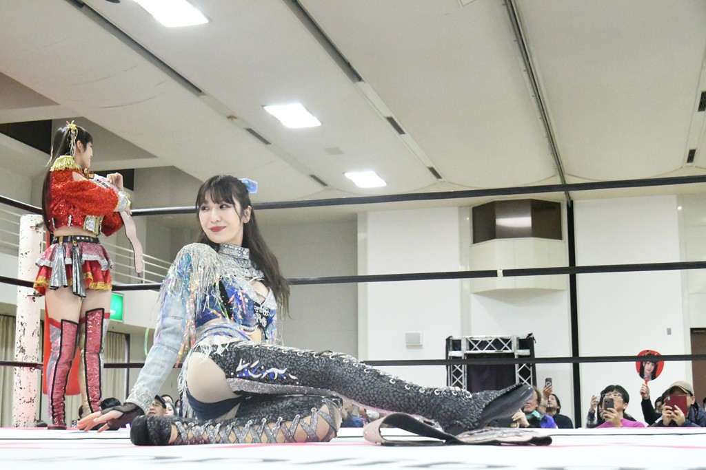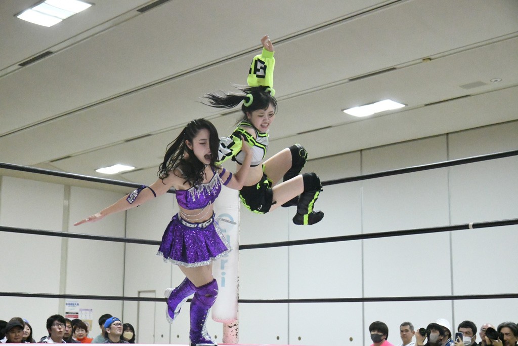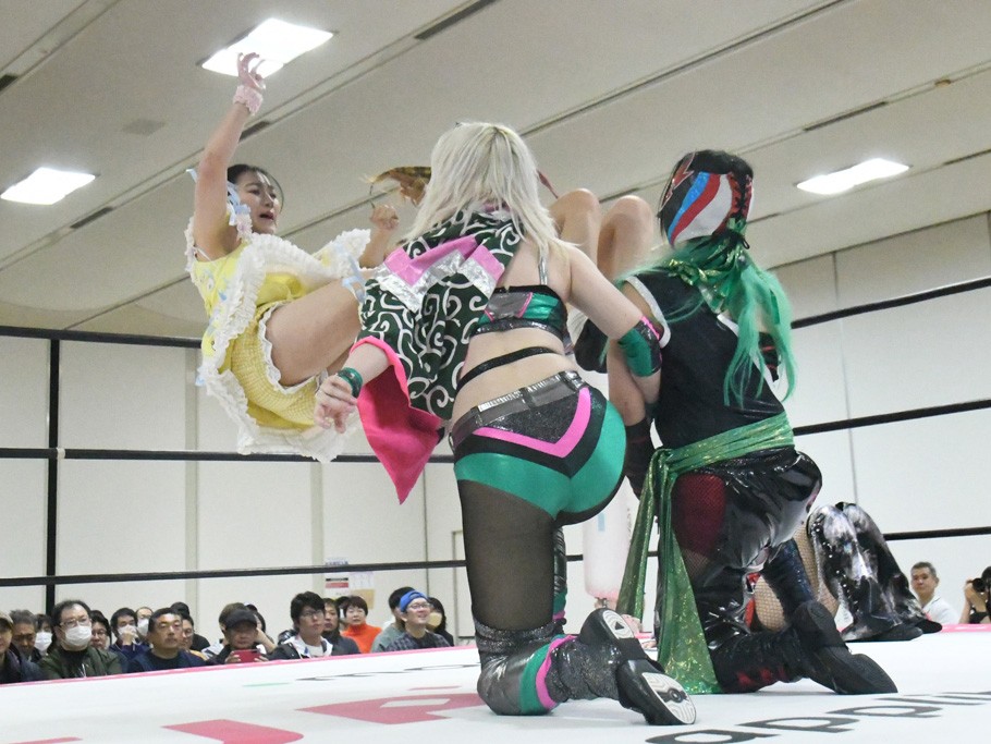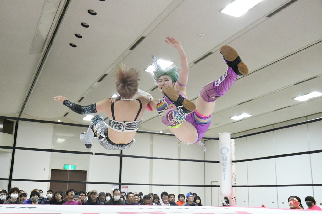 ミサヲのマイク中にリカ、らく、ぽむはなぜかカニに変身。さらにカニに囲まれ、ツメでのサミングで3人がダウン。リカ、らく、ぽむはカニカニエクスプレスを発動し、横移動での踏みつけからカニカニフォールもカウント2。カニのボディーアタックを同士討ちさせた3人。ミサヲがすかさずスプレーを噴霧し逆転。ぽむがじゃんけん勝負を真弥に申し出る。真弥がグーを出すも、ぽむはツメを取って素手であっさりパーを出して勝負あり。動揺する真弥を丸め込むもカウント2。怒りの真弥はボディースラムから「悪いヤツに騙されてしまって大変申し訳ございませんでした!」と謝罪。その後は捕まったぽむだが、鳥喰へのラフォーレ原宿で逆転。らくがぽっぽーチョップ連打。ダイビング・ぽっぽーチョップはカウント2。鳥喰はらくに縦アームドラッグでやり返してミサヲとタッチ。らくがミサヲにフロント・ネックロック。ミサヲがかわしてチキンウイング・フェースロックもらくがロープエスケープ。らくがかがやきでやり返してリカと交替。ミサヲはリカにレインメーカー式ニーを発射。真弥が出てくるとリカがミサイルヒップ。これはミサヲと鳥喰がカット。その2人をらくぽむが連係で排除。リカのドラゴンスリーパーを潰した真弥が河底撈魚。スパインバスター狙いがリカが首絞めで回避。リカをエプロンに出した真弥がニーアタック。ミサヲもエプロンからヒザを繰り出し、鳥喰はセカンドロープ・ローリングセントーンで追撃。真弥はコーナーに登ると「ベルト防衛するぞ!」とダイビング・謝罪ニードロップを投下もかわされて自爆。すかさずリカがホワイトドラゴンスリーパーで絡みついてギブアップ勝ち。これでアイアンマンが再びリカに移動。試合後にらくがアイマスクをつけさせて丸め込んだがカウント2で返されて奪取失敗。リカは脱兎のごとく逃げていった。