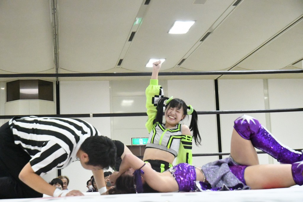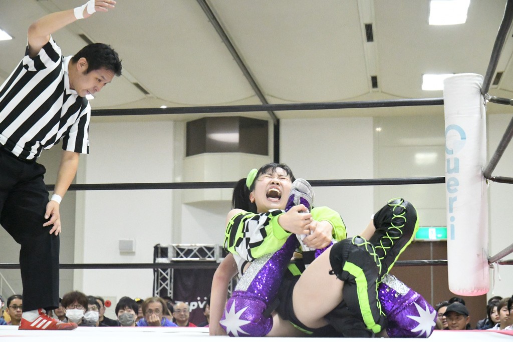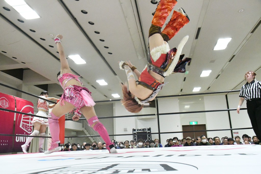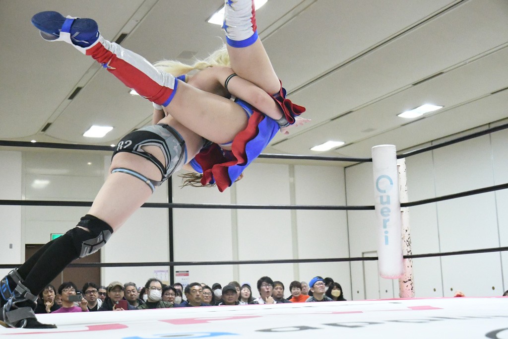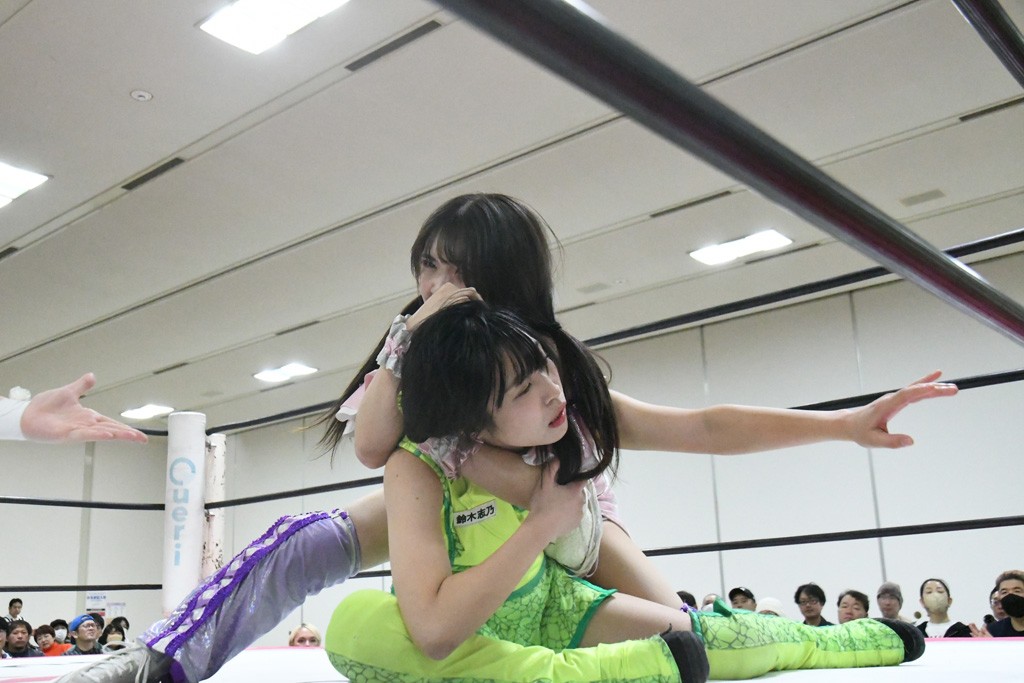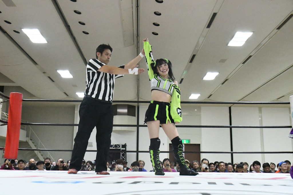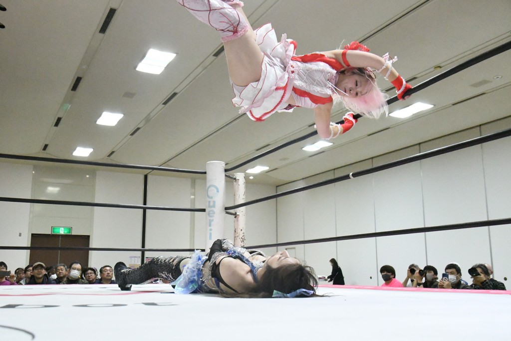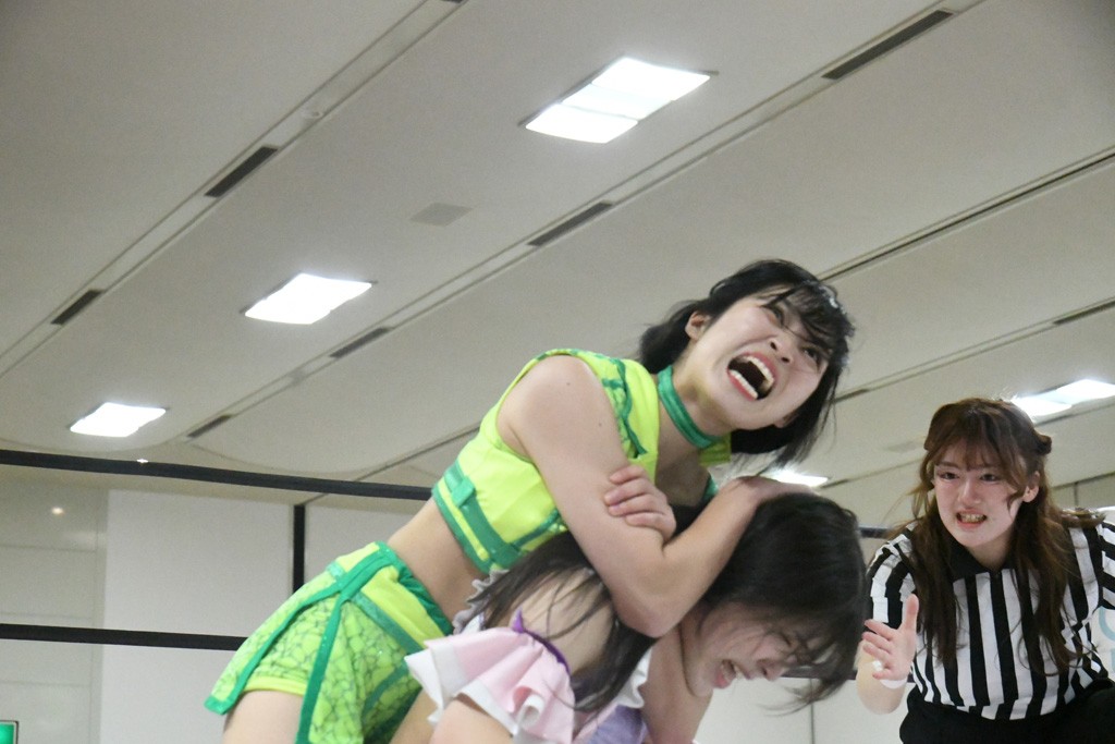 ミサヲのマイク中にリカ、らく、ぽむはなぜかカニに変身。さらにカニに囲まれ、ツメでのサミングで3人がダウン。リカ、らく、ぽむはカニカニエクスプレスを発動し、横移動での踏みつけからカニカニフォールもカウント2。カニのボディーアタックを同士討ちさせた3人。ミサヲがすかさずスプレーを噴霧し逆転。ぽむがじゃんけん勝負を真弥に申し出る。真弥がグーを出すも、ぽむはツメを取って素手であっさりパーを出して勝負あり。動揺する真弥を丸め込むもカウント2。怒りの真弥はボディースラムから「悪いヤツに騙されてしまって大変申し訳ございませんでした!」と謝罪。その後は捕まったぽむだが、鳥喰へのラフォーレ原宿で逆転。らくがぽっぽーチョップ連打。ダイビング・ぽっぽーチョップはカウント2。鳥喰はらくに縦アームドラッグでやり返してミサヲとタッチ。らくがミサヲにフロント・ネックロック。ミサヲがかわしてチキンウイング・フェースロックもらくがロープエスケープ。らくがかがやきでやり返してリカと交替。ミサヲはリカにレインメーカー式ニーを発射。真弥が出てくるとリカがミサイルヒップ。これはミサヲと鳥喰がカット。その2人をらくぽむが連係で排除。リカのドラゴンスリーパーを潰した真弥が河底撈魚。スパインバスター狙いがリカが首絞めで回避。リカをエプロンに出した真弥がニーアタック。ミサヲもエプロンからヒザを繰り出し、鳥喰はセカンドロープ・ローリングセントーンで追撃。真弥はコーナーに登ると「ベルト防衛するぞ!」とダイビング・謝罪ニードロップを投下もかわされて自爆。すかさずリカがホワイトドラゴンスリーパーで絡みついてギブアップ勝ち。これでアイアンマンが再びリカに移動。試合後にらくがアイマスクをつけさせて丸め込んだがカウント2で返されて奪取失敗。リカは脱兎のごとく逃げていった。