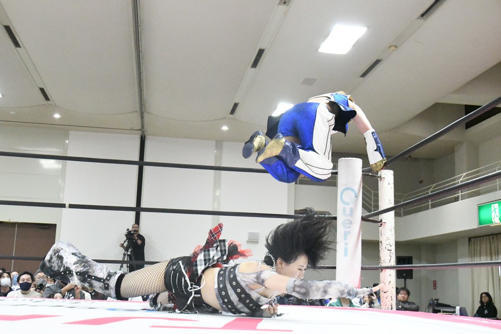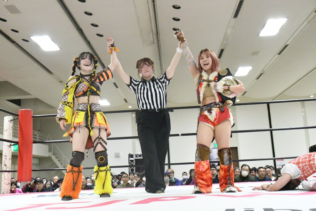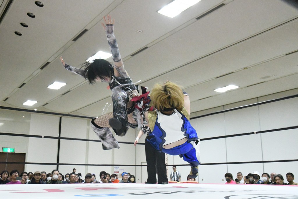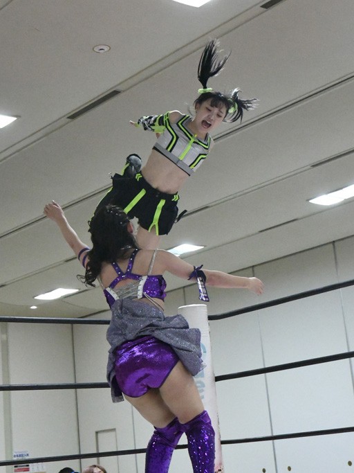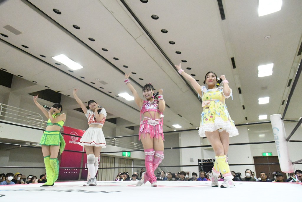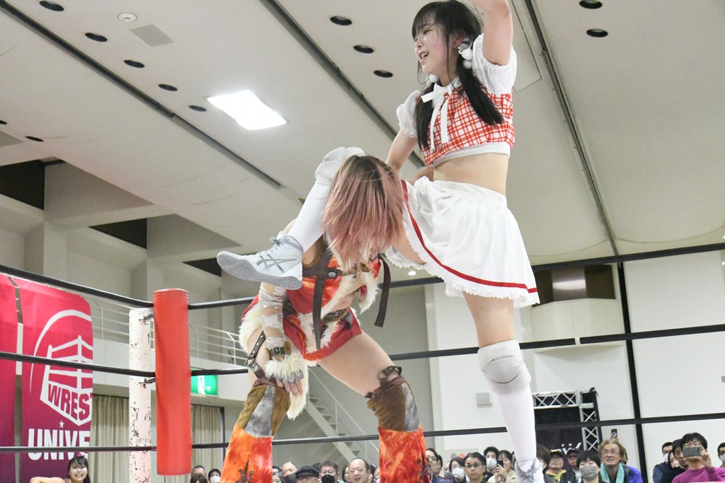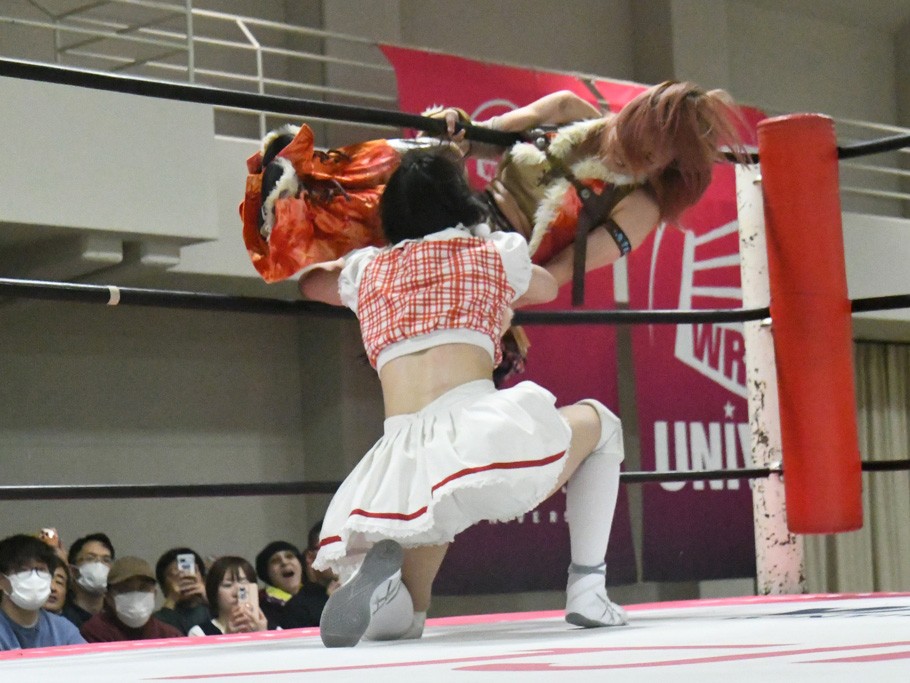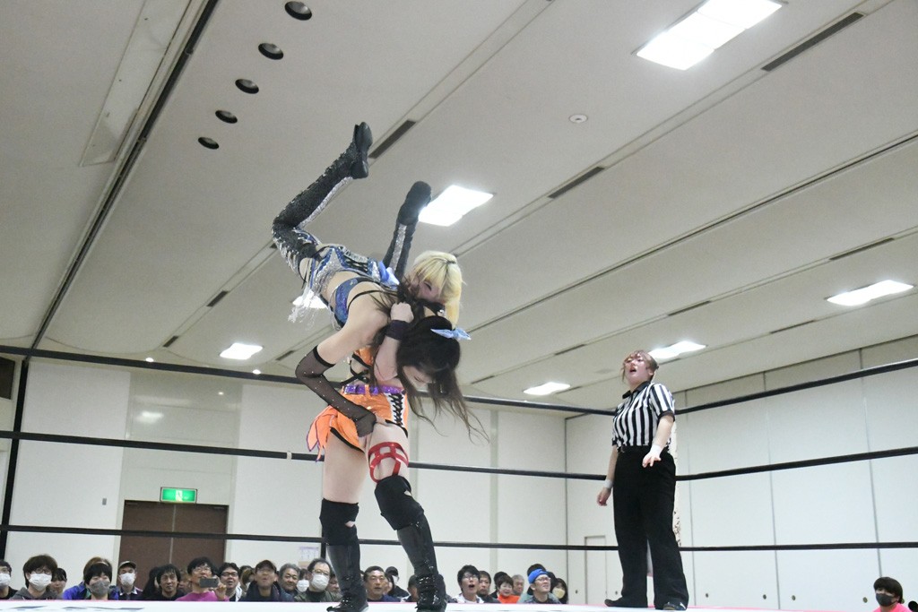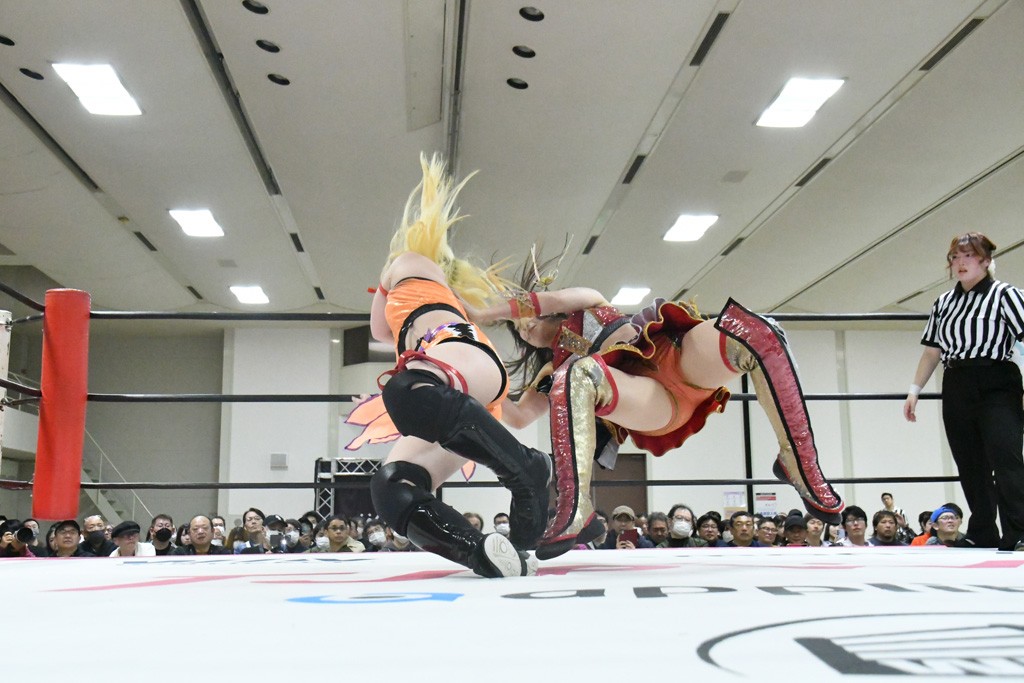 ミサヲのマイク中にリカ、らく、ぽむはなぜかカニに変身。さらにカニに囲まれ、ツメでのサミングで3人がダウン。リカ、らく、ぽむはカニカニエクスプレスを発動し、横移動での踏みつけからカニカニフォールもカウント2。カニのボディーアタックを同士討ちさせた3人。ミサヲがすかさずスプレーを噴霧し逆転。ぽむがじゃんけん勝負を真弥に申し出る。真弥がグーを出すも、ぽむはツメを取って素手であっさりパーを出して勝負あり。動揺する真弥を丸め込むもカウント2。怒りの真弥はボディースラムから「悪いヤツに騙されてしまって大変申し訳ございませんでした!」と謝罪。その後は捕まったぽむだが、鳥喰へのラフォーレ原宿で逆転。らくがぽっぽーチョップ連打。ダイビング・ぽっぽーチョップはカウント2。鳥喰はらくに縦アームドラッグでやり返してミサヲとタッチ。らくがミサヲにフロント・ネックロック。ミサヲがかわしてチキンウイング・フェースロックもらくがロープエスケープ。らくがかがやきでやり返してリカと交替。ミサヲはリカにレインメーカー式ニーを発射。真弥が出てくるとリカがミサイルヒップ。これはミサヲと鳥喰がカット。その2人をらくぽむが連係で排除。リカのドラゴンスリーパーを潰した真弥が河底撈魚。スパインバスター狙いがリカが首絞めで回避。リカをエプロンに出した真弥がニーアタック。ミサヲもエプロンからヒザを繰り出し、鳥喰はセカンドロープ・ローリングセントーンで追撃。真弥はコーナーに登ると「ベルト防衛するぞ!」とダイビング・謝罪ニードロップを投下もかわされて自爆。すかさずリカがホワイトドラゴンスリーパーで絡みついてギブアップ勝ち。これでアイアンマンが再びリカに移動。試合後にらくがアイマスクをつけさせて丸め込んだがカウント2で返されて奪取失敗。リカは脱兎のごとく逃げていった。
