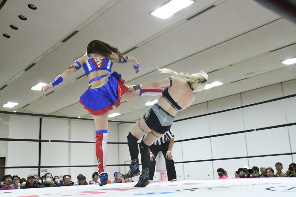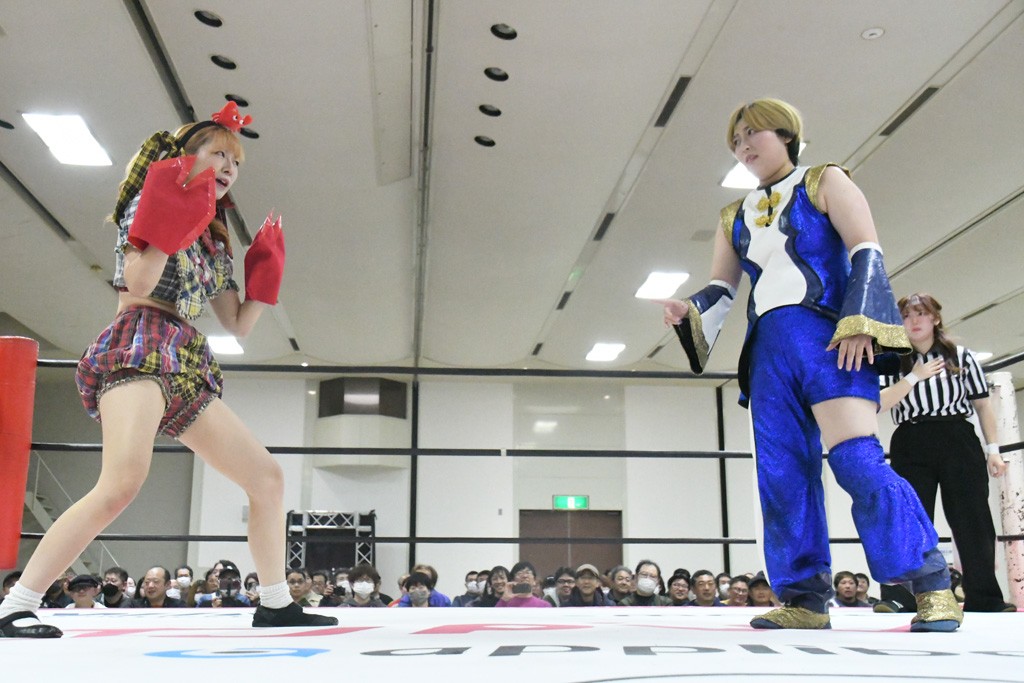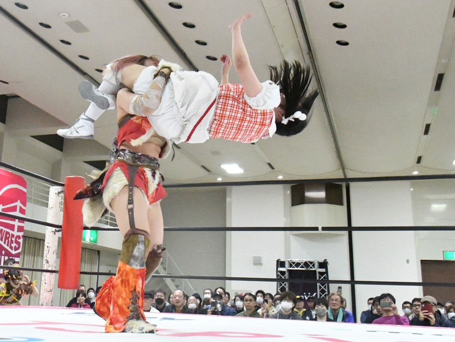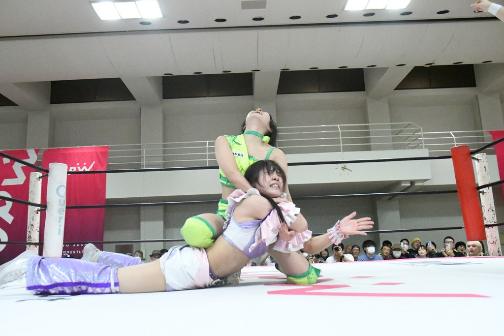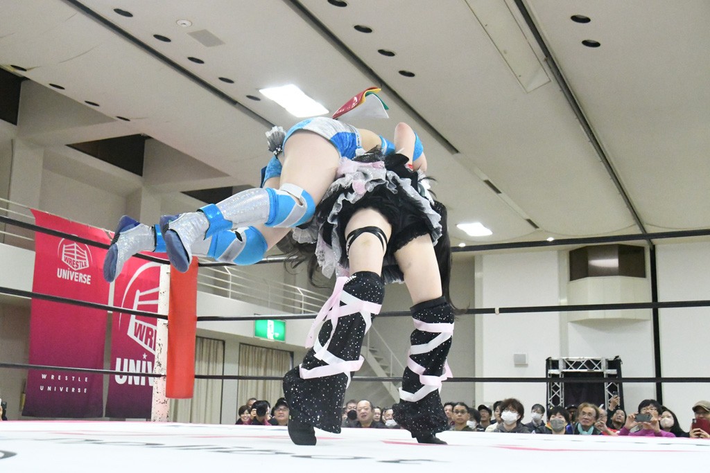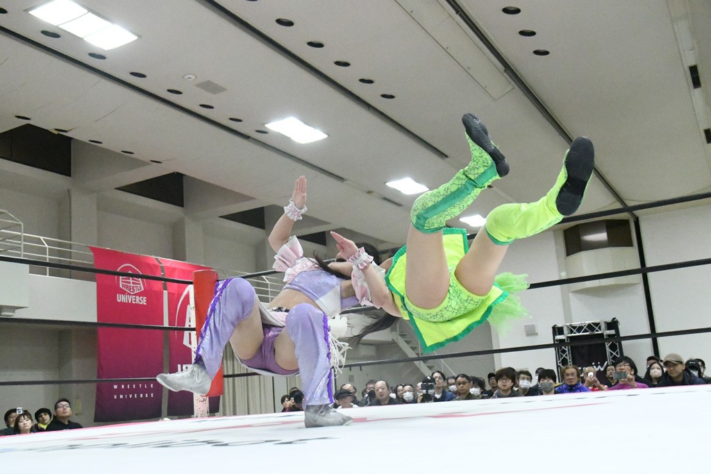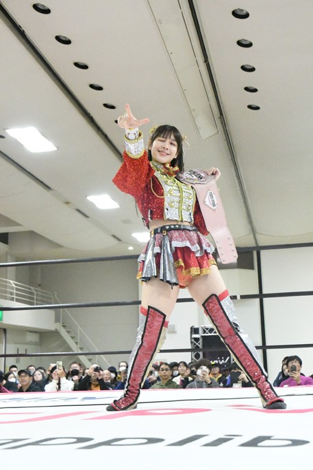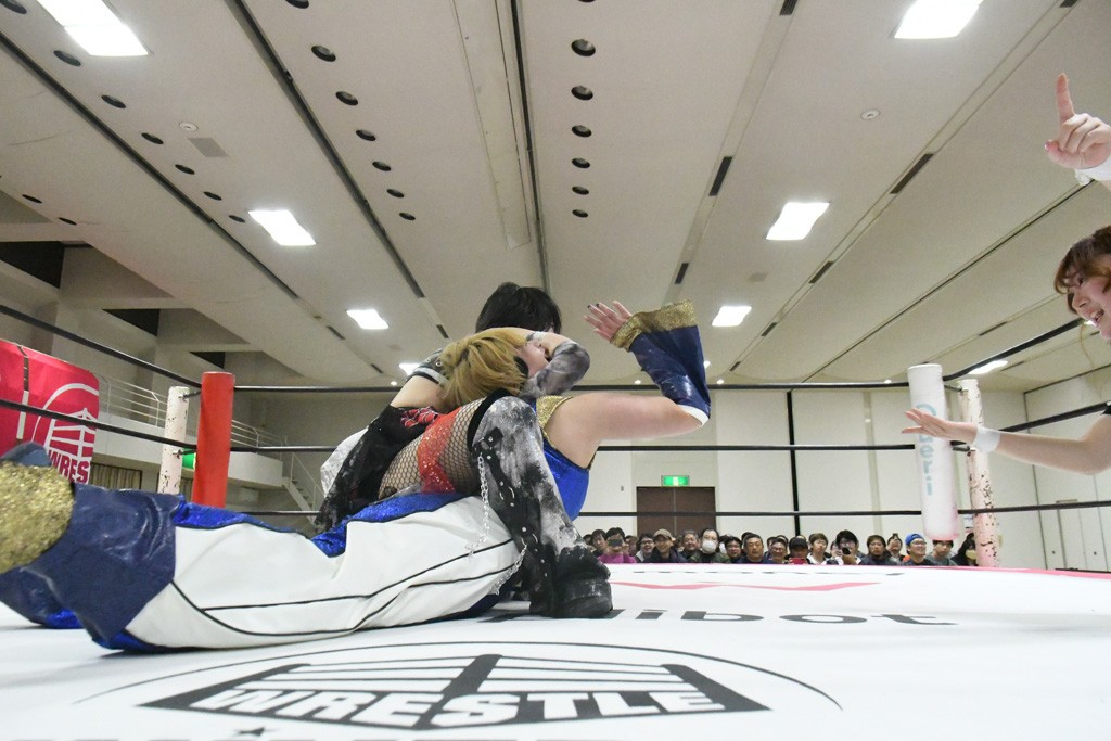 ミサヲのマイク中にリカ、らく、ぽむはなぜかカニに変身。さらにカニに囲まれ、ツメでのサミングで3人がダウン。リカ、らく、ぽむはカニカニエクスプレスを発動し、横移動での踏みつけからカニカニフォールもカウント2。カニのボディーアタックを同士討ちさせた3人。ミサヲがすかさずスプレーを噴霧し逆転。ぽむがじゃんけん勝負を真弥に申し出る。真弥がグーを出すも、ぽむはツメを取って素手であっさりパーを出して勝負あり。動揺する真弥を丸め込むもカウント2。怒りの真弥はボディースラムから「悪いヤツに騙されてしまって大変申し訳ございませんでした!」と謝罪。その後は捕まったぽむだが、鳥喰へのラフォーレ原宿で逆転。らくがぽっぽーチョップ連打。ダイビング・ぽっぽーチョップはカウント2。鳥喰はらくに縦アームドラッグでやり返してミサヲとタッチ。らくがミサヲにフロント・ネックロック。ミサヲがかわしてチキンウイング・フェースロックもらくがロープエスケープ。らくがかがやきでやり返してリカと交替。ミサヲはリカにレインメーカー式ニーを発射。真弥が出てくるとリカがミサイルヒップ。これはミサヲと鳥喰がカット。その2人をらくぽむが連係で排除。リカのドラゴンスリーパーを潰した真弥が河底撈魚。スパインバスター狙いがリカが首絞めで回避。リカをエプロンに出した真弥がニーアタック。ミサヲもエプロンからヒザを繰り出し、鳥喰はセカンドロープ・ローリングセントーンで追撃。真弥はコーナーに登ると「ベルト防衛するぞ!」とダイビング・謝罪ニードロップを投下もかわされて自爆。すかさずリカがホワイトドラゴンスリーパーで絡みついてギブアップ勝ち。これでアイアンマンが再びリカに移動。試合後にらくがアイマスクをつけさせて丸め込んだがカウント2で返されて奪取失敗。リカは脱兎のごとく逃げていった。