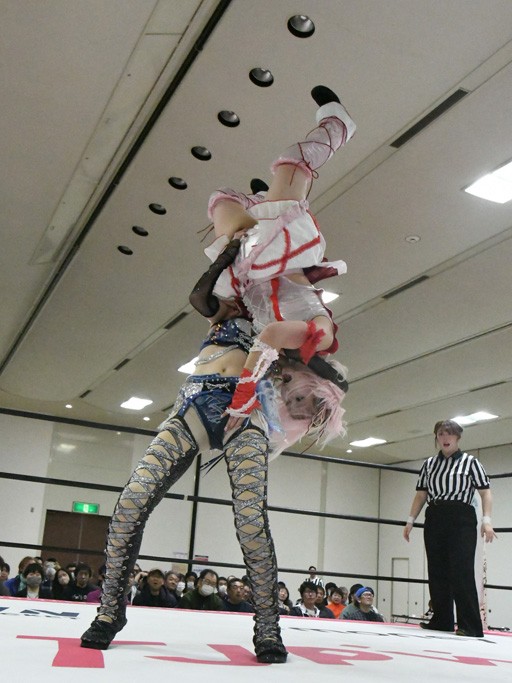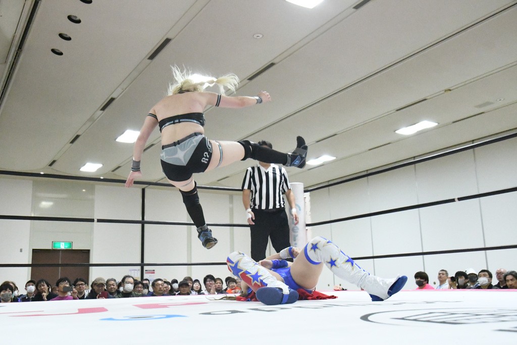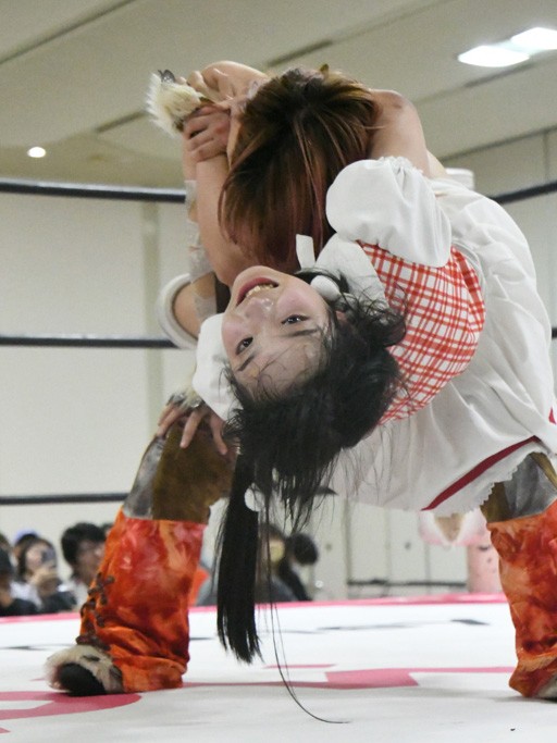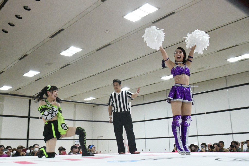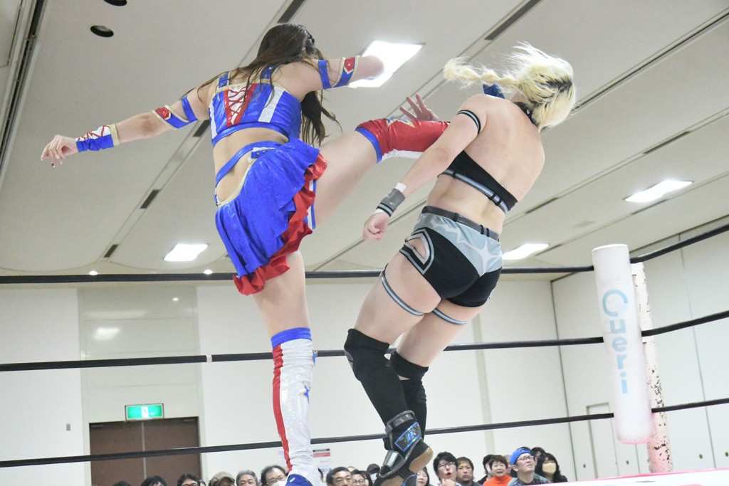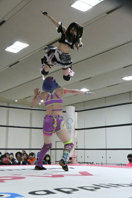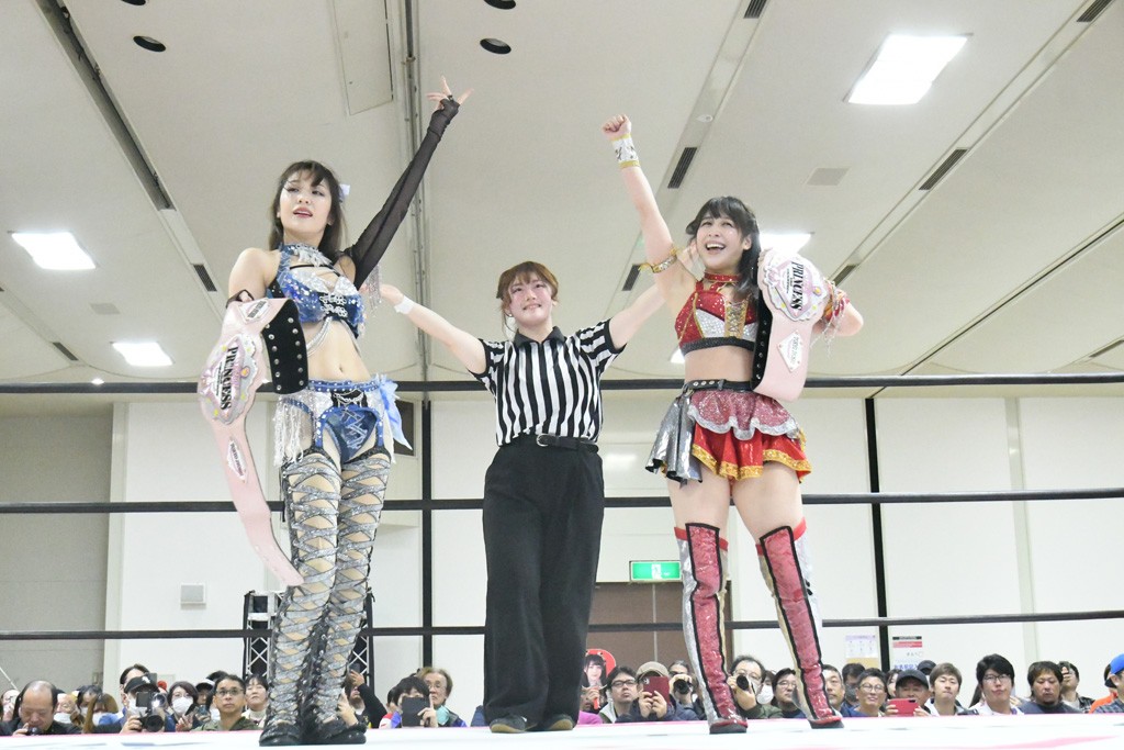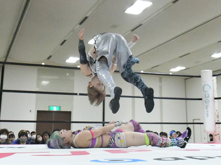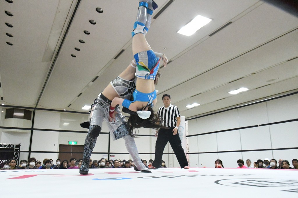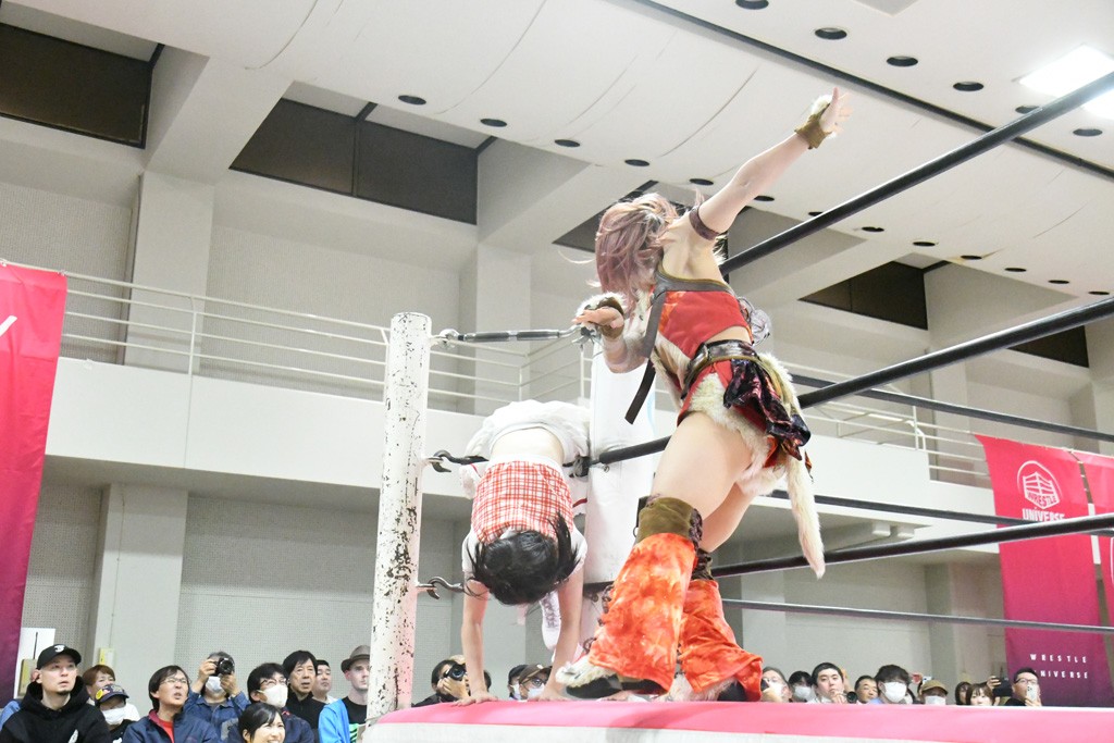 ミサヲのマイク中にリカ、らく、ぽむはなぜかカニに変身。さらにカニに囲まれ、ツメでのサミングで3人がダウン。リカ、らく、ぽむはカニカニエクスプレスを発動し、横移動での踏みつけからカニカニフォールもカウント2。カニのボディーアタックを同士討ちさせた3人。ミサヲがすかさずスプレーを噴霧し逆転。ぽむがじゃんけん勝負を真弥に申し出る。真弥がグーを出すも、ぽむはツメを取って素手であっさりパーを出して勝負あり。動揺する真弥を丸め込むもカウント2。怒りの真弥はボディースラムから「悪いヤツに騙されてしまって大変申し訳ございませんでした!」と謝罪。その後は捕まったぽむだが、鳥喰へのラフォーレ原宿で逆転。らくがぽっぽーチョップ連打。ダイビング・ぽっぽーチョップはカウント2。鳥喰はらくに縦アームドラッグでやり返してミサヲとタッチ。らくがミサヲにフロント・ネックロック。ミサヲがかわしてチキンウイング・フェースロックもらくがロープエスケープ。らくがかがやきでやり返してリカと交替。ミサヲはリカにレインメーカー式ニーを発射。真弥が出てくるとリカがミサイルヒップ。これはミサヲと鳥喰がカット。その2人をらくぽむが連係で排除。リカのドラゴンスリーパーを潰した真弥が河底撈魚。スパインバスター狙いがリカが首絞めで回避。リカをエプロンに出した真弥がニーアタック。ミサヲもエプロンからヒザを繰り出し、鳥喰はセカンドロープ・ローリングセントーンで追撃。真弥はコーナーに登ると「ベルト防衛するぞ!」とダイビング・謝罪ニードロップを投下もかわされて自爆。すかさずリカがホワイトドラゴンスリーパーで絡みついてギブアップ勝ち。これでアイアンマンが再びリカに移動。試合後にらくがアイマスクをつけさせて丸め込んだがカウント2で返されて奪取失敗。リカは脱兎のごとく逃げていった。