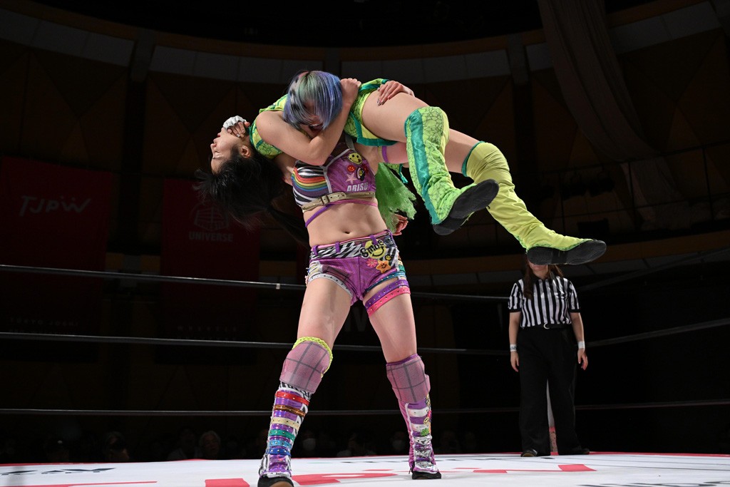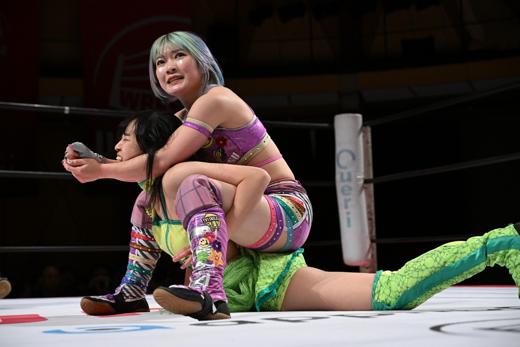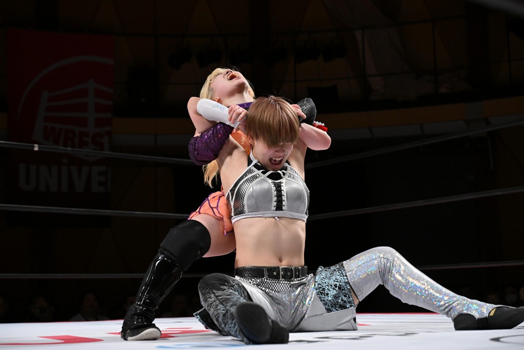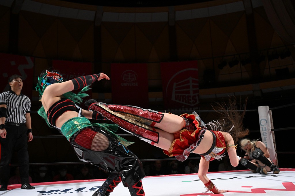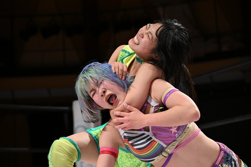 先発は未詩と鈴芽。鈴芽がさっそくフェースクラッシャー。場外に落とすも未詩もすぐさまエプロンに上がってエルボーで返すとリングに戻ってヘッドロック。さらにショルダーアタックで倒して中島とタッチ。鈴芽は中島にドロップキックを決めてHIMAWARIと交替。HIMAWARIがショルダーアタックで続く。逆片エビを狙うも中島が丸め込みで切り返す。香港スピンエルボーから未詩が出てきてエルボーからランサルセ。しばらく捕まったHIMAWARIだが、中島のエルボーをかわしてローリングネックブリーカーを決めてピンチを脱出。鈴芽がドロップキック連発からフェースクラッシャーもカウント2。ミカヅキ流星群は中島が回避して未詩とタッチ。未詩がコーナースプラッシュからショルダーアタック。ジャイアントスイング狙いは鈴芽が足を掴んで回させない。未詩は足元にエルボードロップを放つと改めてジャイアントスイングへ。鈴芽はこれをロープを掴んで阻止するとエプロンに着地。さらに未詩を場外に落としてプランチャで飛んでいった。未詩をリングに戻した鈴芽がミカヅキ流星群もカウント2。駆け上がり式フェースクラッシャーは未詩が拒否してランサルセ。さらにエルボーを見舞うと鈴芽もエルボーで返してラリーに。鈴芽の丸め込み連発は中島がカット。未詩のバッティングハンマーをかわした鈴芽がハチノスエイトノットで勝負に出る。未詩が立ち上がらんとするも鈴芽の絞りが強烈に極まる。未詩がなんとか粘って旋回式のティアドロップで解除も両者ダメージ。戦況は中島vsHIMAWARIに。中島がライダーキックから619を狙うもかわされてしまうと鈴芽がフェースクラッシャーで飛び込み、その鈴芽に未詩がバッティングハンマー。ティアドロップ狙いは鈴芽がかわしてフェースクラッシャー。HIMAWARIが中島にローリング・ネックブリーカー。サン・フラワーテンペストをかわした中島がノーザンライト・スープレックス・ホールドを決めてフォール勝ち。