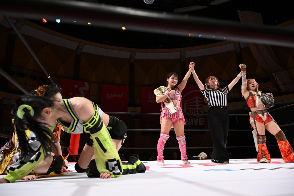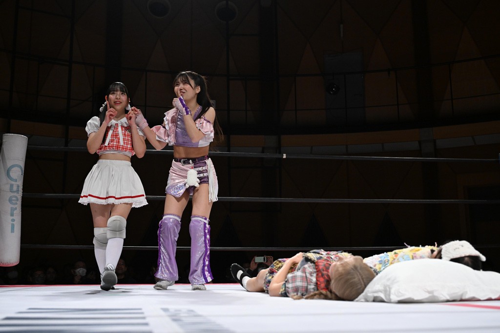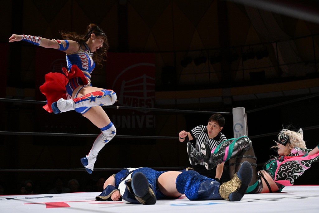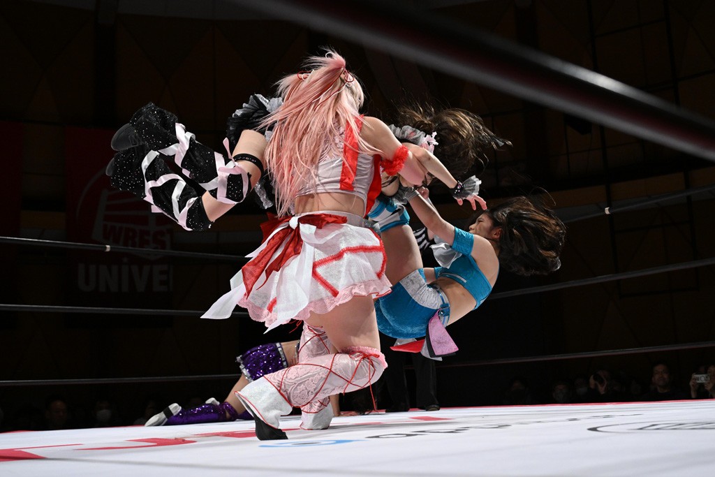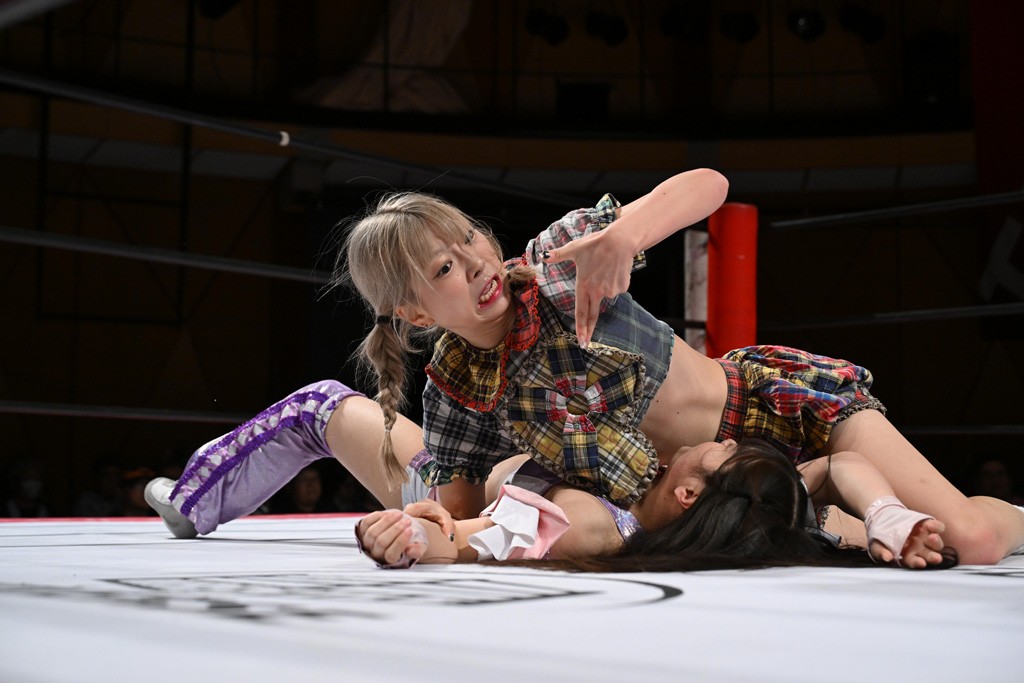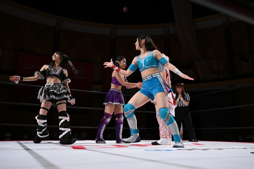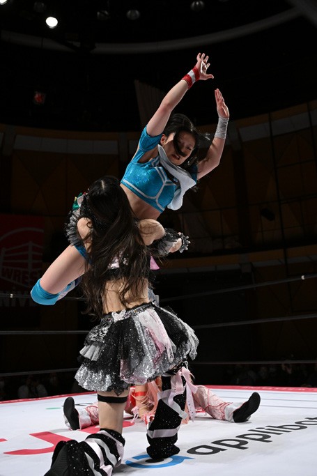 ユキとハルで瑞希への連係を試みるも同士討ちに遭い、さらに瑞希のカバーをカットせんとしたユキの攻撃がかわされてハルに被弾してしまう。瑞希がその上にフットスタンプ。瑞希が2人の髪を掴むと芦田がチアで文りんレフェリーの気を引く始末。その後、ローンバトルを強いられたハルだが、瑞希の腕へのコードブレイカーからバックエルボー、さらにセカンドロープからの反転ミサイルキックでピンチを脱出。替わったユキが一気呵成の攻め。瑞希もフェースロックでやり返し、突き抜け式ドロップキックからコーナーに登る。これはハルが一度止めに入ったために、その後のダイビング・フットスタンプはユキにかわされてしまった。ユキが前方回転エビ固め。そのユキを踏み台にしてハルが瑞希にクロスボディーの連係。瑞希もカサドーラ・フットスタンプでやり返して芦田と交替。ユキは芦田にダイビングショルダーからフルネルソン。芦田が開脚で抜け出して前に投げると瑞希がフットスタンプの連係。芦田が鎌固めでギブアップを迫るもハルがカット。芦田のジャーマン狙いをユキが回避してセントーン。サイドスープレックスからヴィーナスDDTの体勢は瑞希がカット。その瑞希をユキのストマックブロック+ハルのアームクラッシャーの合体技で蹴散らすと孤立した芦田にユキがヴィーナスDDTを決めて勝負あり。