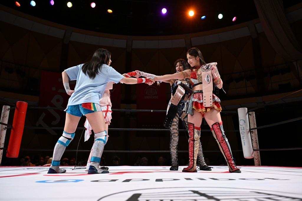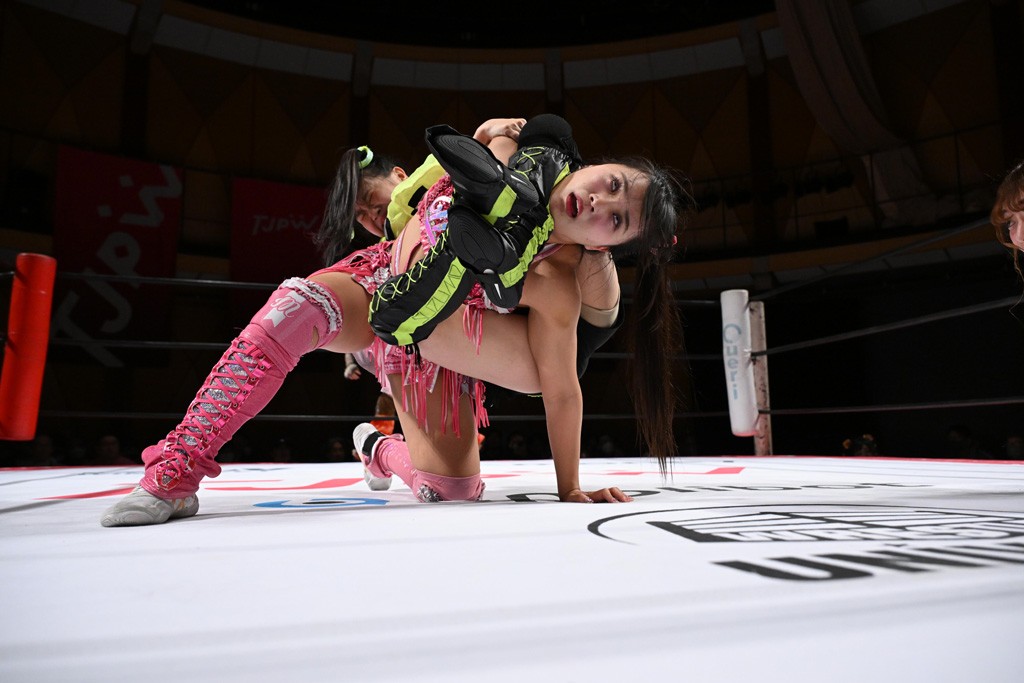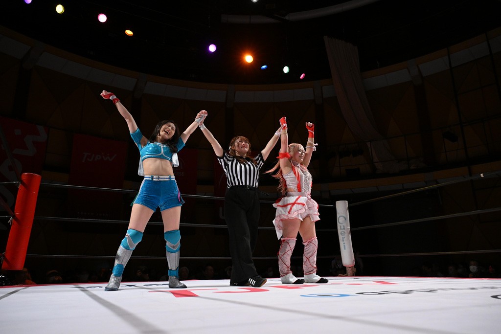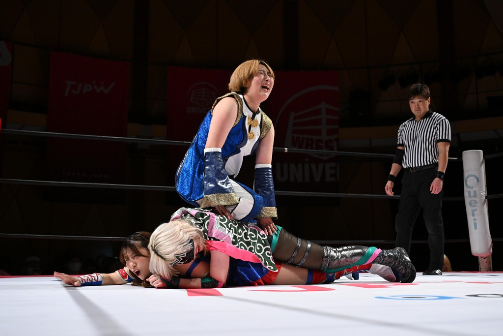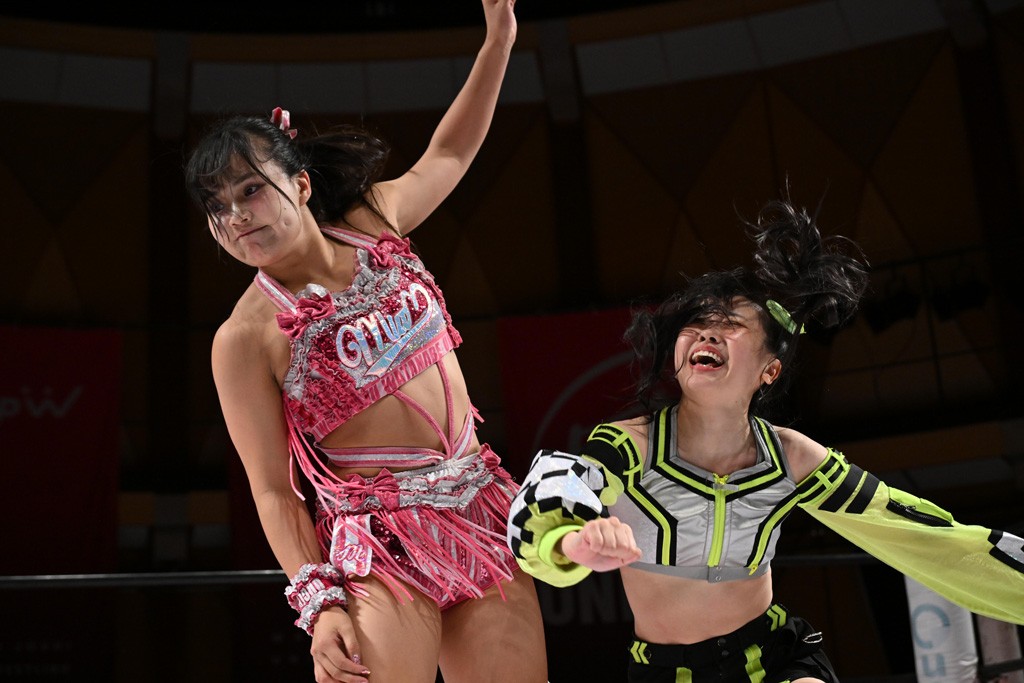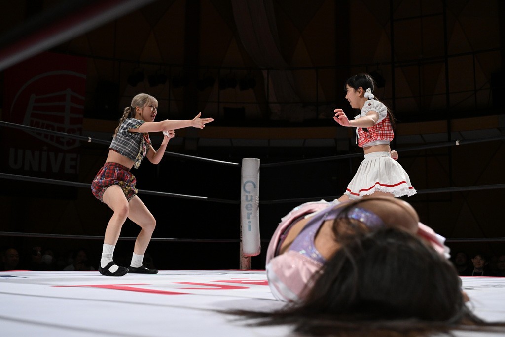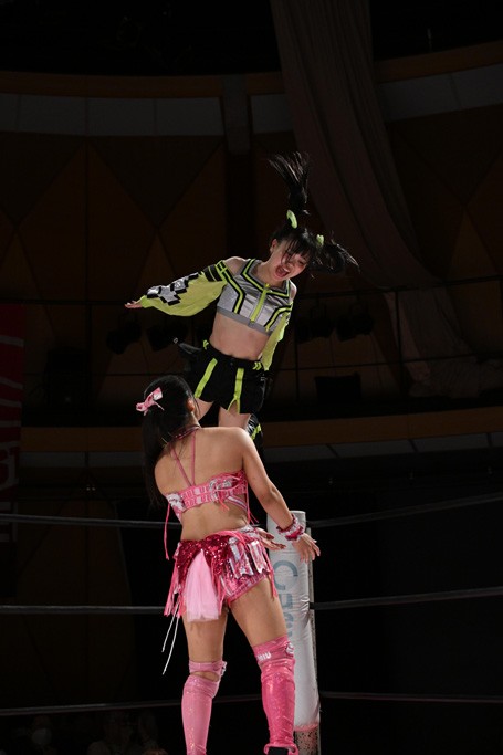 ユキとハルで瑞希への連係を試みるも同士討ちに遭い、さらに瑞希のカバーをカットせんとしたユキの攻撃がかわされてハルに被弾してしまう。瑞希がその上にフットスタンプ。瑞希が2人の髪を掴むと芦田がチアで文りんレフェリーの気を引く始末。その後、ローンバトルを強いられたハルだが、瑞希の腕へのコードブレイカーからバックエルボー、さらにセカンドロープからの反転ミサイルキックでピンチを脱出。替わったユキが一気呵成の攻め。瑞希もフェースロックでやり返し、突き抜け式ドロップキックからコーナーに登る。これはハルが一度止めに入ったために、その後のダイビング・フットスタンプはユキにかわされてしまった。ユキが前方回転エビ固め。そのユキを踏み台にしてハルが瑞希にクロスボディーの連係。瑞希もカサドーラ・フットスタンプでやり返して芦田と交替。ユキは芦田にダイビングショルダーからフルネルソン。芦田が開脚で抜け出して前に投げると瑞希がフットスタンプの連係。芦田が鎌固めでギブアップを迫るもハルがカット。芦田のジャーマン狙いをユキが回避してセントーン。サイドスープレックスからヴィーナスDDTの体勢は瑞希がカット。その瑞希をユキのストマックブロック+ハルのアームクラッシャーの合体技で蹴散らすと孤立した芦田にユキがヴィーナスDDTを決めて勝負あり。