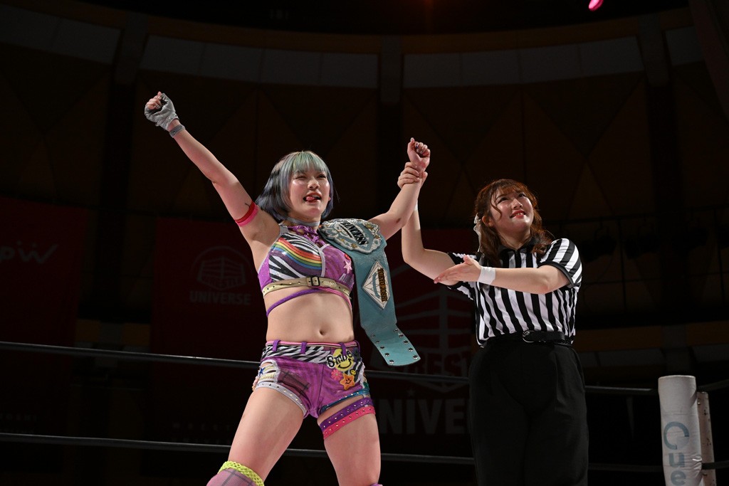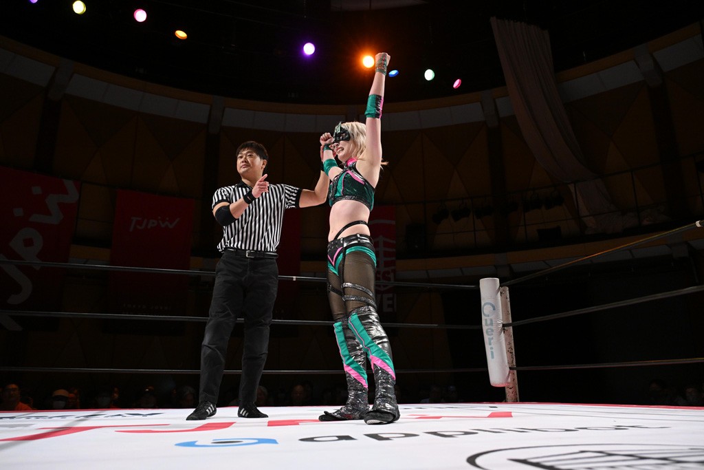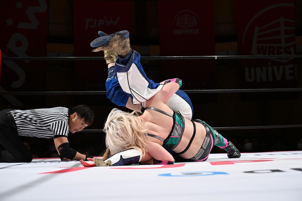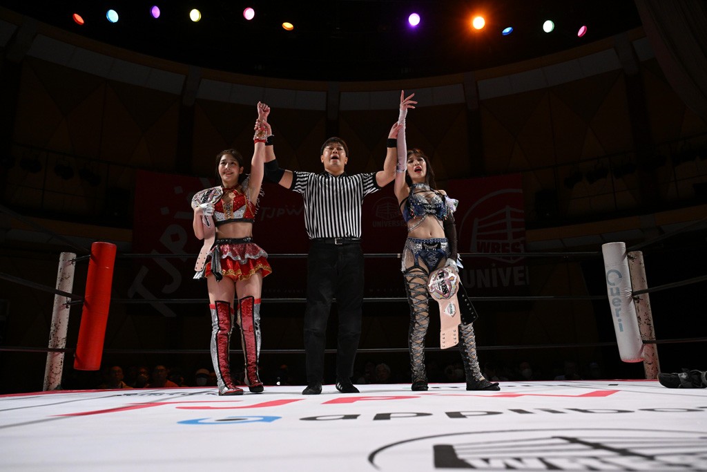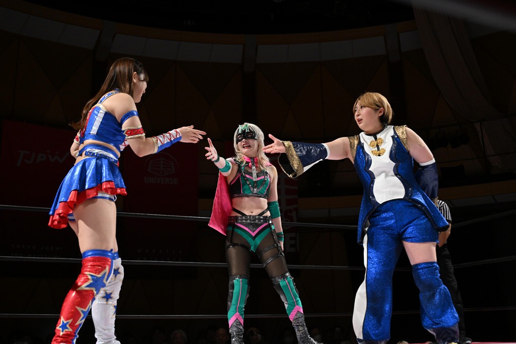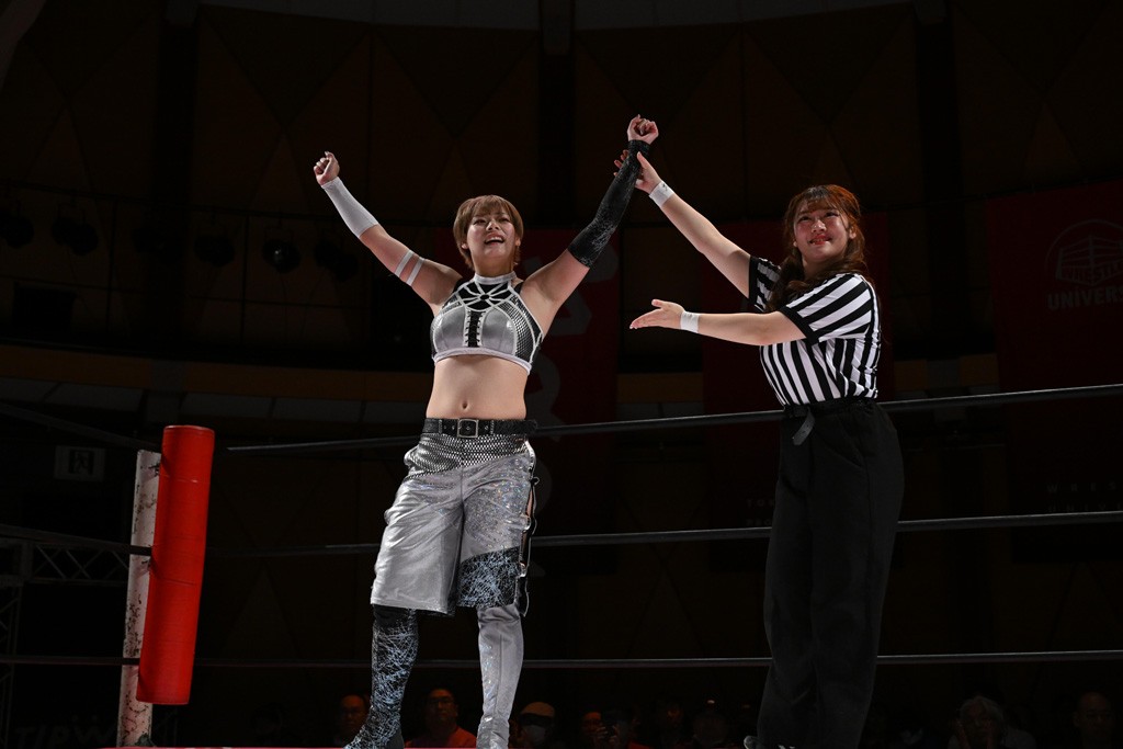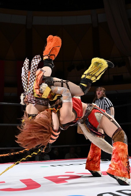 ユキとハルで瑞希への連係を試みるも同士討ちに遭い、さらに瑞希のカバーをカットせんとしたユキの攻撃がかわされてハルに被弾してしまう。瑞希がその上にフットスタンプ。瑞希が2人の髪を掴むと芦田がチアで文りんレフェリーの気を引く始末。その後、ローンバトルを強いられたハルだが、瑞希の腕へのコードブレイカーからバックエルボー、さらにセカンドロープからの反転ミサイルキックでピンチを脱出。替わったユキが一気呵成の攻め。瑞希もフェースロックでやり返し、突き抜け式ドロップキックからコーナーに登る。これはハルが一度止めに入ったために、その後のダイビング・フットスタンプはユキにかわされてしまった。ユキが前方回転エビ固め。そのユキを踏み台にしてハルが瑞希にクロスボディーの連係。瑞希もカサドーラ・フットスタンプでやり返して芦田と交替。ユキは芦田にダイビングショルダーからフルネルソン。芦田が開脚で抜け出して前に投げると瑞希がフットスタンプの連係。芦田が鎌固めでギブアップを迫るもハルがカット。芦田のジャーマン狙いをユキが回避してセントーン。サイドスープレックスからヴィーナスDDTの体勢は瑞希がカット。その瑞希をユキのストマックブロック+ハルのアームクラッシャーの合体技で蹴散らすと孤立した芦田にユキがヴィーナスDDTを決めて勝負あり。