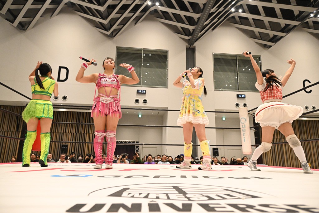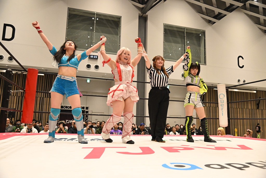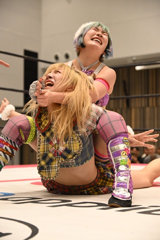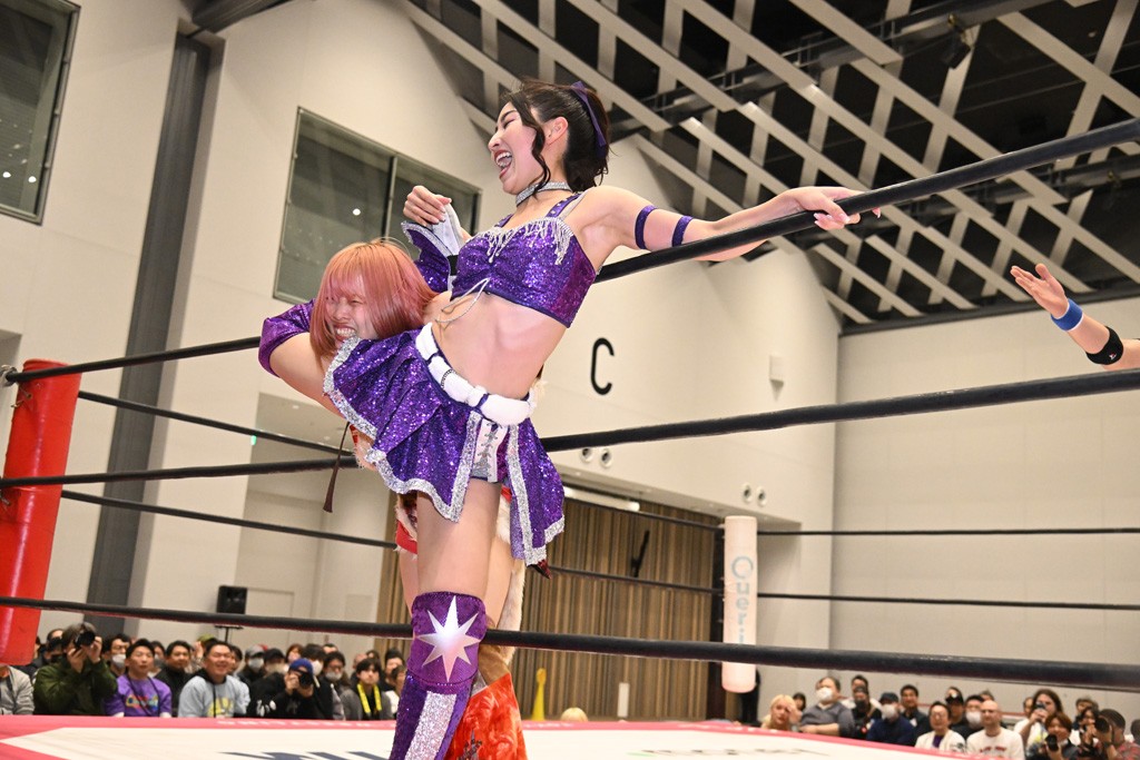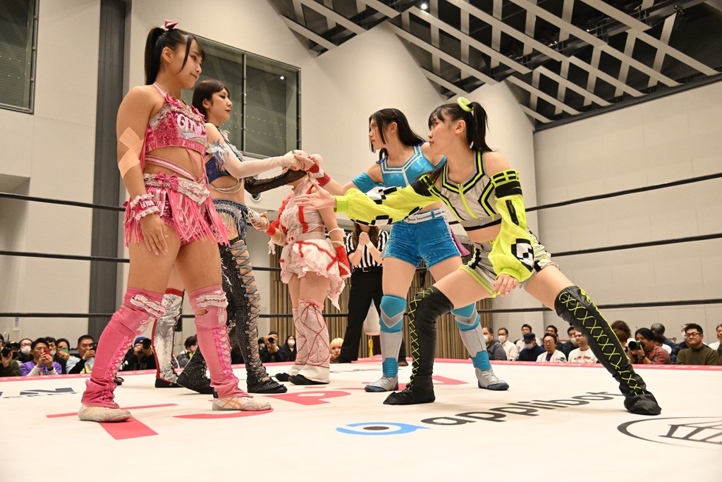 両チームの握手からゴング。先発は未詩と鈴芽。手四つの攻防で未詩が押し込んでカバー。ショルダータックルからヘッドロックに捕えると、鈴芽が脱してブレーク。上原とハルにスイッチ。側転で攻撃をかわした上原に鈴芽がドロップキック。ハルと未詩のマッチアップとなると、腰にエルボーやバックブリーカーで絞り上げていく。カバーはカウント2。上福にかわるとドロップキックやコーナーで顔面を踏みつけていく。串刺しビッグブーツからの踏みつけフォールはカウント2。タッチを受けた上原がヘッドシザース。5分経過。ハルが足でロープエスケープ。スペース・ローリングエルボーからブレーンバスター狙い。これを丸め込んで切り返したハルがドロップキックを放ってユキにタッチ。ショルダータックルからのショルダースルーはカウント2。フルネルソンは脱した上原がブレーンバスター。未詩にかわると、ユキも鈴芽にタッチ。鈴芽がフェースクラッシャー。コーナーを使ったフェースクラッシャーは未詩が投げ捨てて阻止。串刺しボディースプラッシュからショルダータックルを浴びせてカナディアン狙い。これを鈴芽が抵抗してエルボー連打。ボディースラムで投げ捨てコーナーを駆け上がってフェースクラッシャー。続くミカヅキ流星群はカウント2。追撃のリング・ア・ベルはキャッチした未詩がアバランシュホールドでマットに叩きつける。ジャイアントスイングは鈴芽が足を持って必死の抵抗すると、蹴り飛ばしてドロップキック3連発。だが、突進したところで開花式ジャイアントスイングを浴びてしまう。10分経過。両軍は上福とハルにスイッチ。ユキがセントーンでアシストしてハルが低空クロスボディー。カウント2。上福からビッグブーツを食らうも、追撃をかわしてユキにタッチ。ストマックブロックからのセントーン。カウント2となって両軍入り乱れる。上福が1度は落とされるも雪崩式ブレーンバスターでユキを投げ捨てていく。カウント2。フェイマサーをかわされてサイドスープレックスを浴びるが、カウント2でキックアウトした上福は愛と炎のフルネルソンに捕まってしまう。これを上原がカットするやユキにダブルのフラップジャックをさく裂させる。カバーはカットしたハルがフィッシャーマンズで上原を排除。追撃のフェイマサーはユキがかわすと、割って入ったハルがセカンドロープ反転式ドロップキック。エプロンでは鈴芽が未詩にコーナーステップのフェースクラッシャーで動きを止める。リング内ではハルがエルボーからユキがショルダータックル。15分経過。最後はハルがポップアップし、その勢いでユキがヴィーナスDDTを決める合体技で上福から3カウント奪取。
