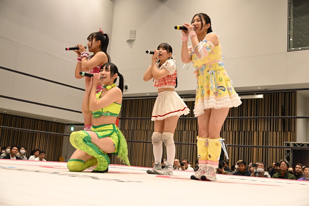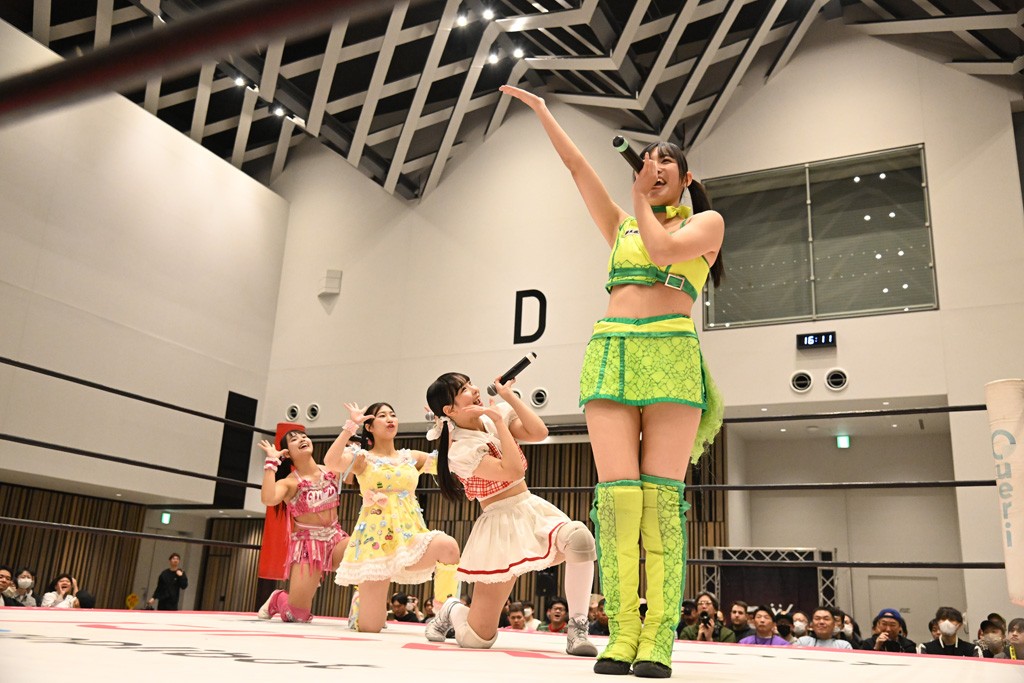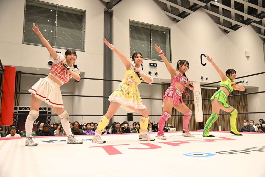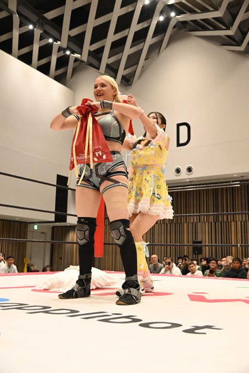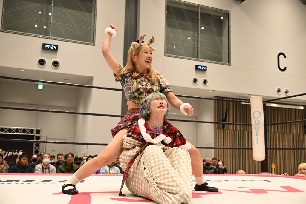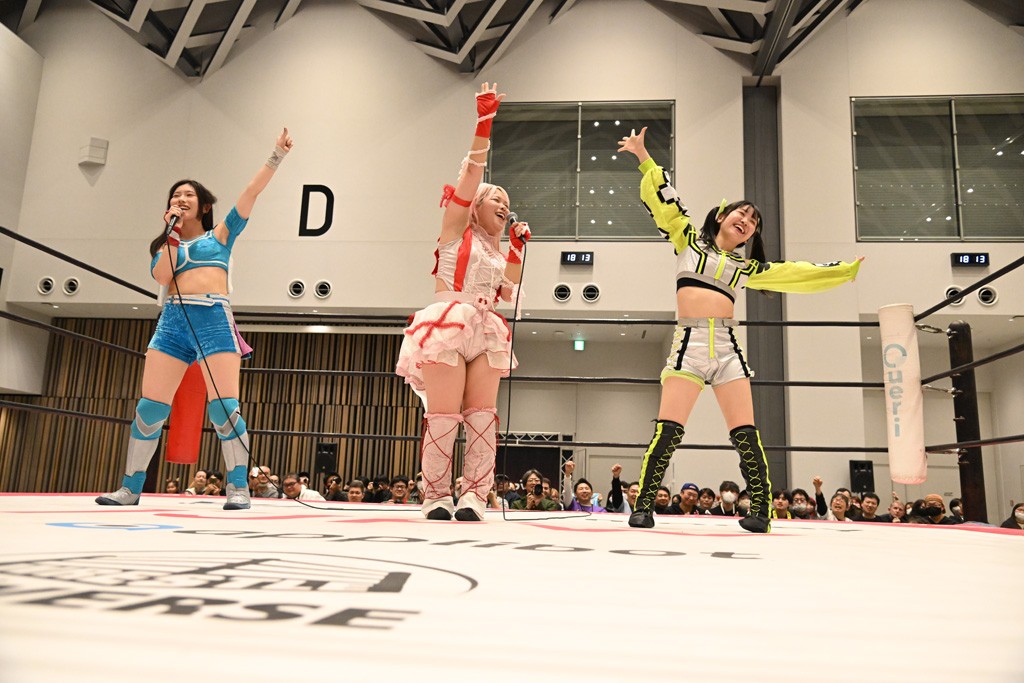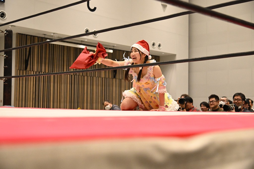 試合後、ユキがマイク。ユキ「挑戦者組、勝ったぞ! 今日これだけ集まってくれてありがとうございます」鈴芽「勝った! 勝った! 挑戦者チームで勝って嬉しい。けど、本当にタッグの力が凄かったと思います。私はまだまだ未詩さんにこの試合だけじゃ勝てる確信まではイケてないけど、今日も未詩さんの知らない私をぶつけられたんじゃないかなと思っていて。挑戦者チーム、チャレンジャーとして私はまだまだここからも挑戦を続けるつもりです。イッテンヨンまで挑戦しつづけて王者になります。ありがとうございます。一緒に戦ってくれてありがとうございました」ハル「タイトル戦がある前哨戦は今日が初めてで。ユキさんは今日で前哨戦は終わりかもしれないけど、私は来週、上原わかなとシングルマッチが控えてるので。ユキさんとはもちろん、私個人もしっかり強く、強くなってイッテンヨン、タイトルマッチに臨みたいと思うので。来週上原わかなに勝ちます」ユキ「ハルなら勝てる! 私と鈴芽は直接、前哨戦はもうないけど、でもあと1試合あるんだよね。あと1回戦うってことはまた私達は強くなるってことだから。イッテンヨンに向けてたくさんパワーを溜めていこう! みんなもパワー…クリスマス興行なのか? クリスマス特別興行ってことでたくさん試合を見てくれてありがとう。来週もありますし、今日が最後の人もいるかもしれないけど、イッテンヨンも健康に。風邪とかインフルとか流行ってるんで、それのないように。その対策してしっかり新年を迎えましょう。とういことで今日は私式で締めたいと思います」最後は3人で「ゆきほー! はるほー! すずほー! ゆきはるすずほー!」で締めくくった。