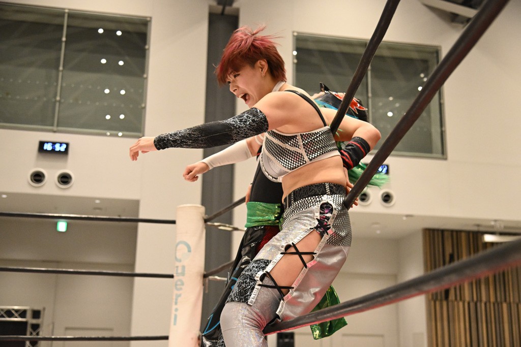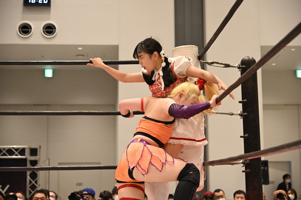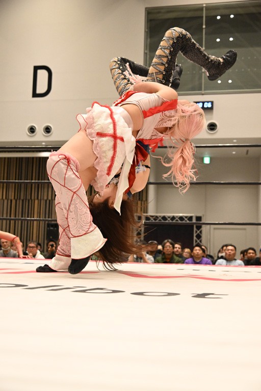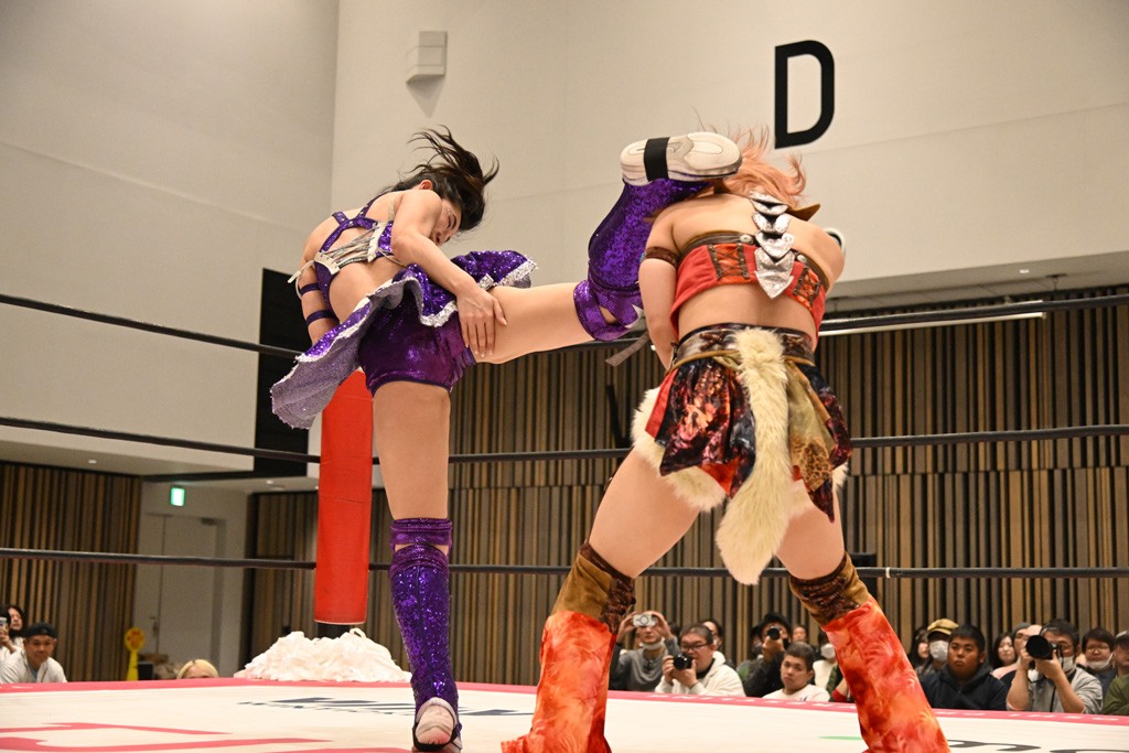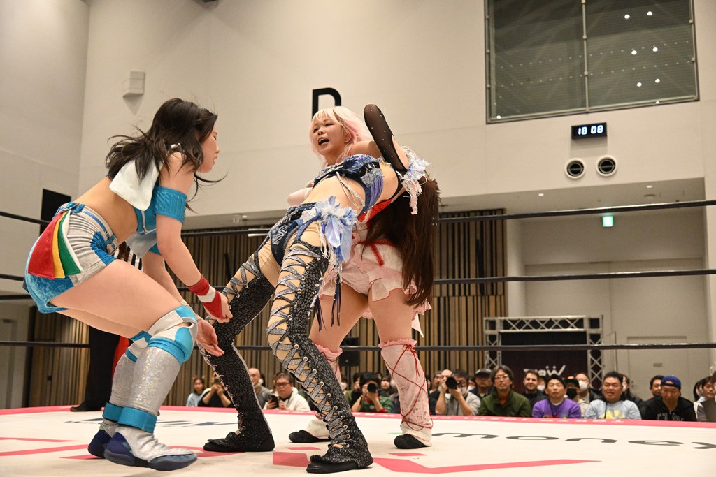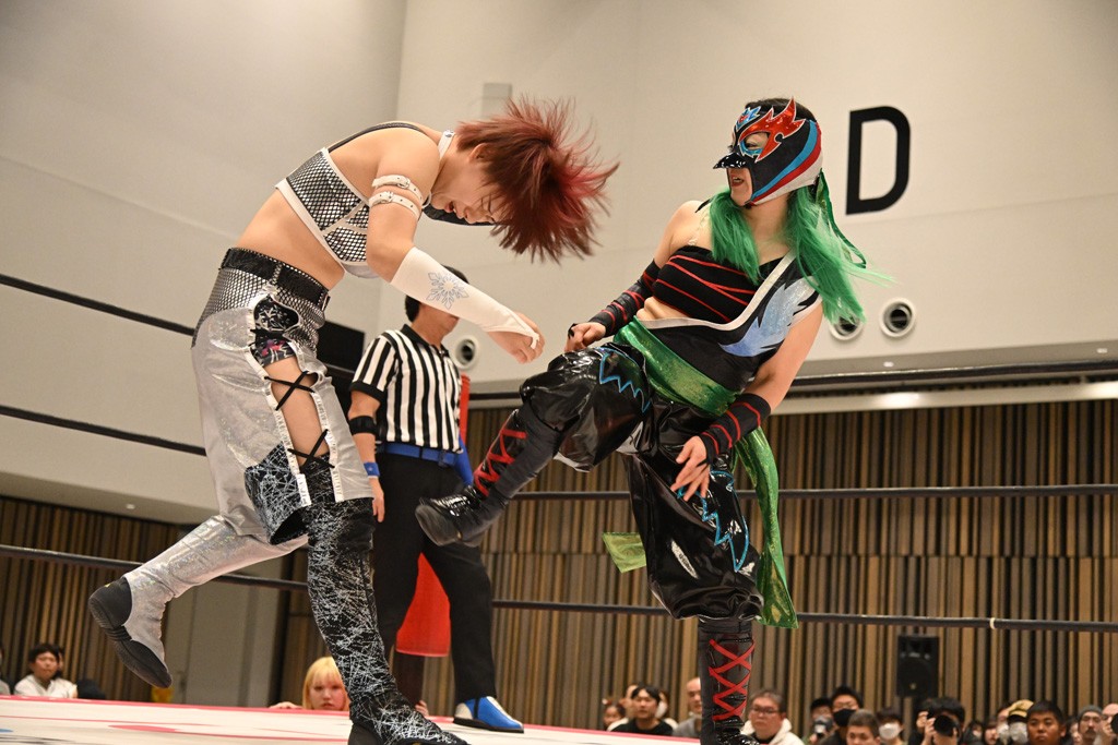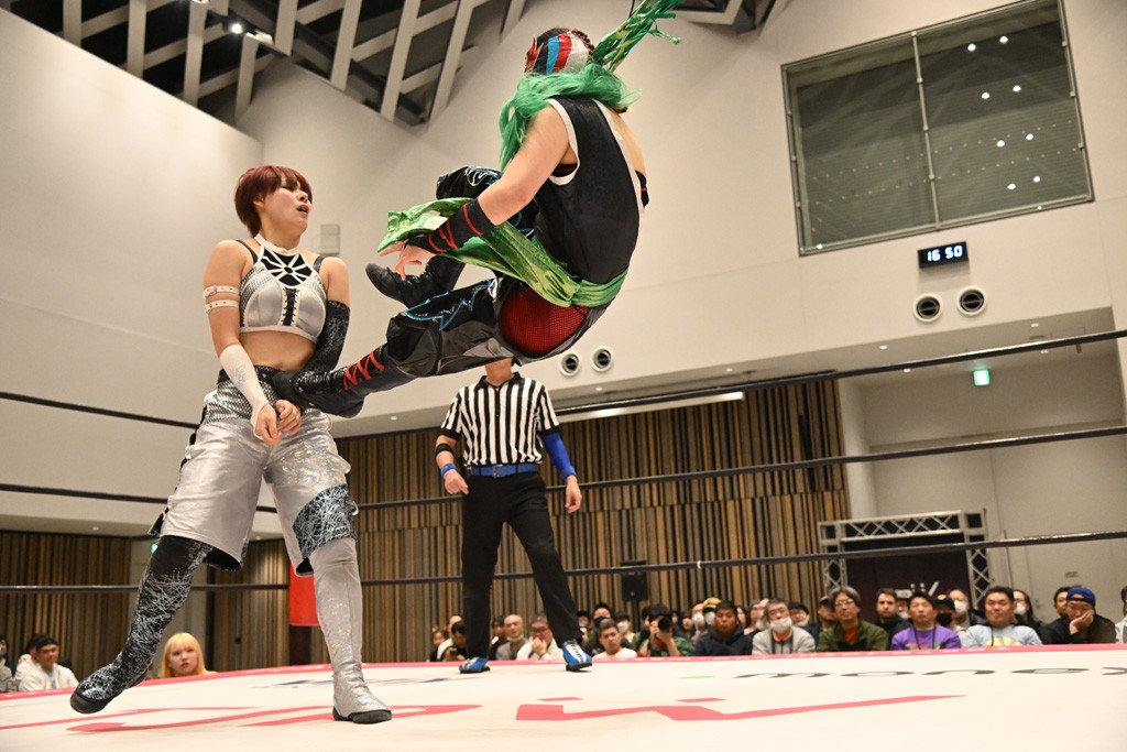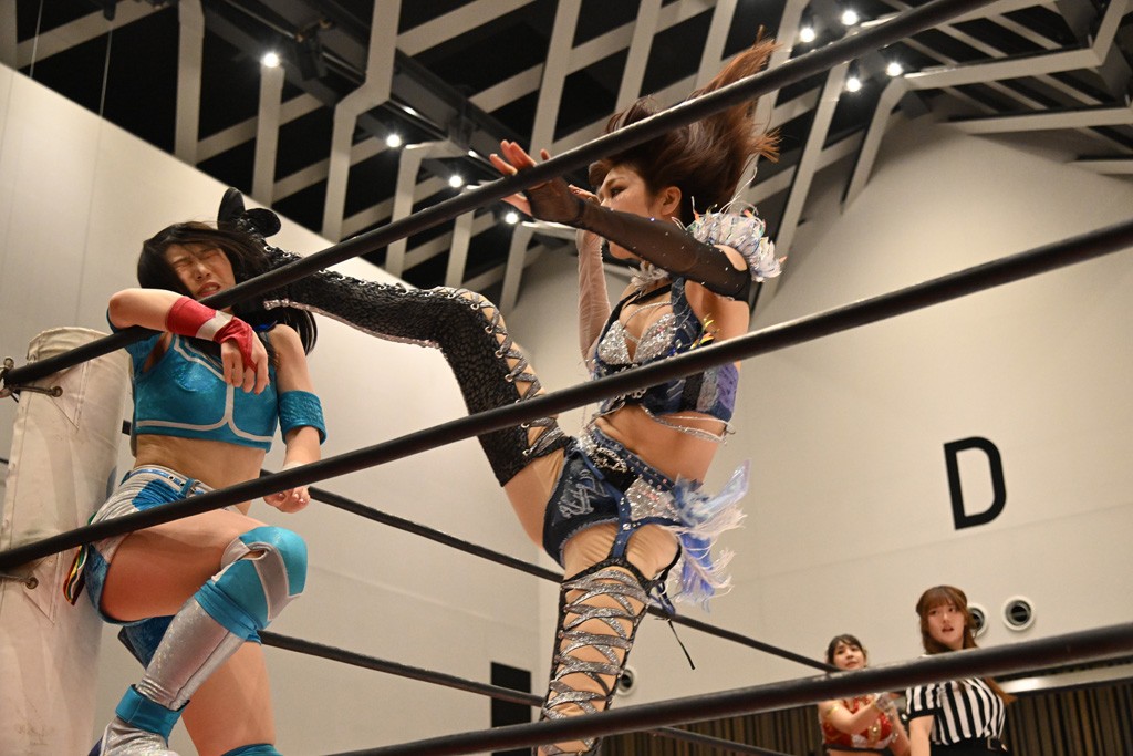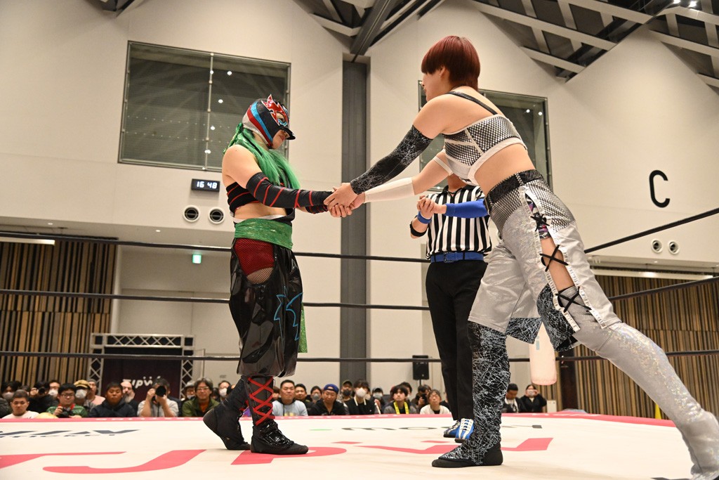 瑞希が両手を広げて握手を求めると、リカも応じる。だが、瑞希はトーキックで奇襲し、ここでゴング。速攻で丸め込んだが、カウント2。再び瑞希が握手を求めて握り返したリカにトーキック。突進をかわしたリカがロープ越しドラゴンスクリュー。さらに鉄柱を使って足を攻撃。ドロップキックは足を狙って決めていく。リングに戻ってよっしゃいくぞエルボーは自爆となるも、低空ドロップキック、ドラゴンスクリュー、足4の字固めとたたみかける。反転しながら瑞希がロープエスケープ。リカが足をロープにくくりつけてドロップキック。残り3分。バックブリーカーからのフォールをブリッジで脱した瑞希がフットスタンプ。ロープすり抜け式ドロップキック、コーナーダイブのフットスタンプはかわされたが、串刺しドロップキックで追い打ち。残り2分。セカンドロープに寝かせてフットスタンプからキューティースペシャル狙い。これをリカが切り返してドラゴンスリーパーへ。続くツイスト・オブ・フェイトからミサイルヒップ。かわされて瑞希のメテオラを浴びるも、カウンターのヒップアタックを決め、スライディングの一発も披露。追撃のツイスト・オブ・フェイトは瑞希が回転エビ固めで切り返すと、両者は丸め込みの応酬。カウント2。残り10秒でリカがドラゴンスリーパーに捕獲するも、タイムアップ。試合後は瑞希が握手を求め、リカが握り返すとトーキックを入れて引き上げていった。