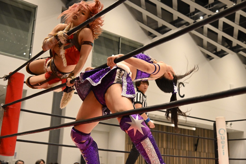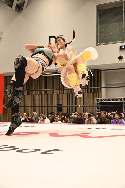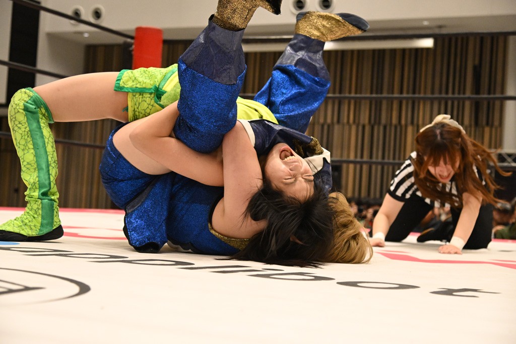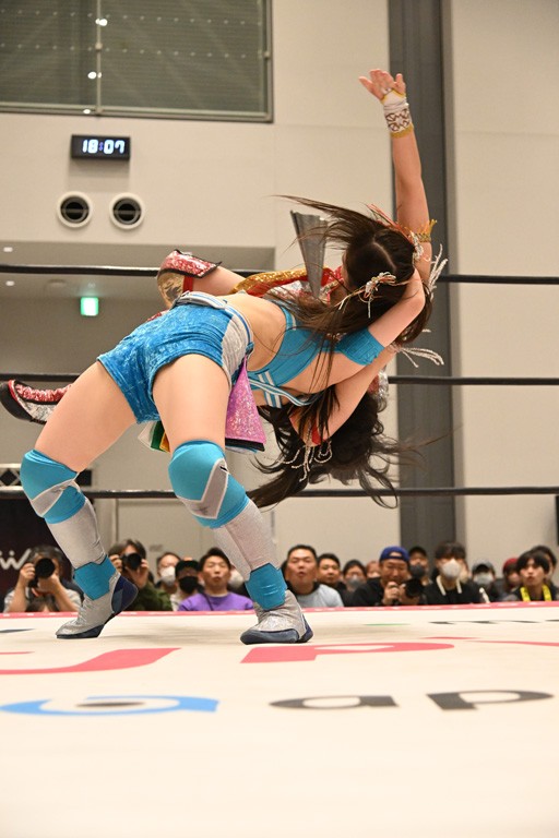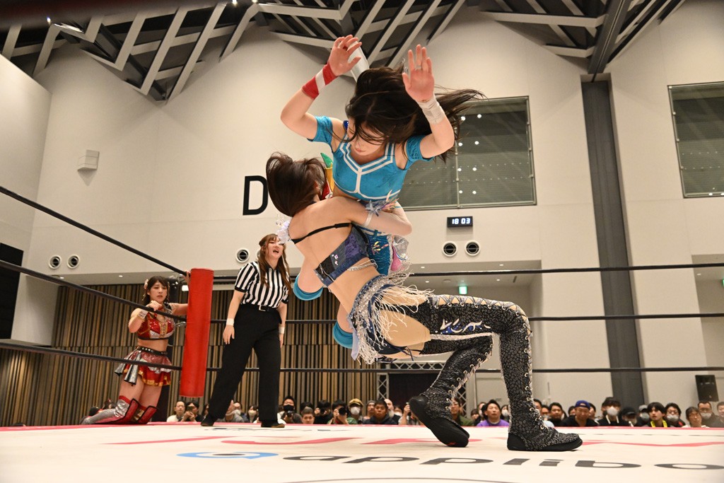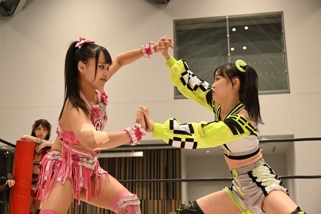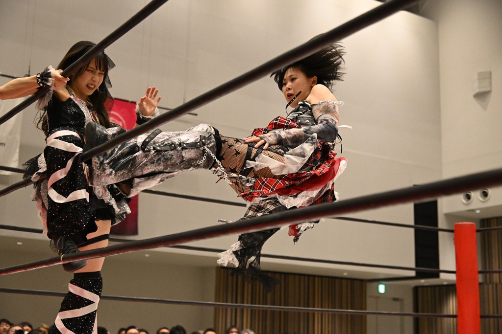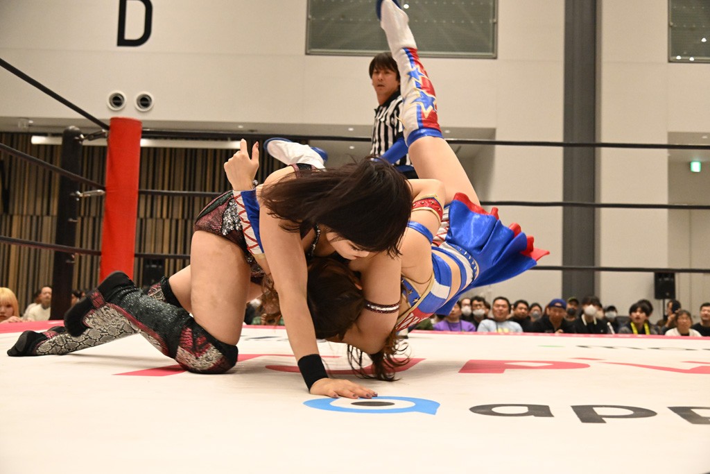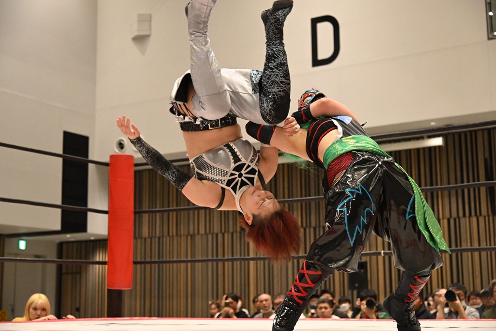 瑞希が両手を広げて握手を求めると、リカも応じる。だが、瑞希はトーキックで奇襲し、ここでゴング。速攻で丸め込んだが、カウント2。再び瑞希が握手を求めて握り返したリカにトーキック。突進をかわしたリカがロープ越しドラゴンスクリュー。さらに鉄柱を使って足を攻撃。ドロップキックは足を狙って決めていく。リングに戻ってよっしゃいくぞエルボーは自爆となるも、低空ドロップキック、ドラゴンスクリュー、足4の字固めとたたみかける。反転しながら瑞希がロープエスケープ。リカが足をロープにくくりつけてドロップキック。残り3分。バックブリーカーからのフォールをブリッジで脱した瑞希がフットスタンプ。ロープすり抜け式ドロップキック、コーナーダイブのフットスタンプはかわされたが、串刺しドロップキックで追い打ち。残り2分。セカンドロープに寝かせてフットスタンプからキューティースペシャル狙い。これをリカが切り返してドラゴンスリーパーへ。続くツイスト・オブ・フェイトからミサイルヒップ。かわされて瑞希のメテオラを浴びるも、カウンターのヒップアタックを決め、スライディングの一発も披露。追撃のツイスト・オブ・フェイトは瑞希が回転エビ固めで切り返すと、両者は丸め込みの応酬。カウント2。残り10秒でリカがドラゴンスリーパーに捕獲するも、タイムアップ。試合後は瑞希が握手を求め、リカが握り返すとトーキックを入れて引き上げていった。