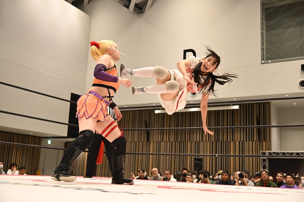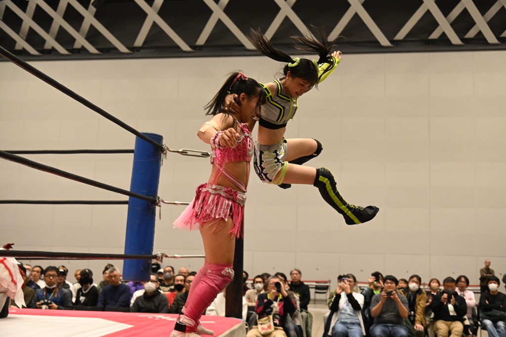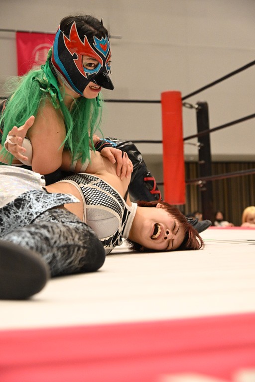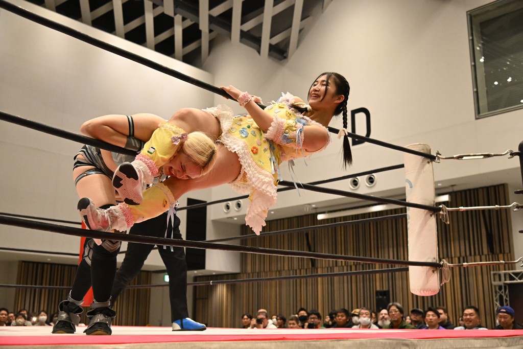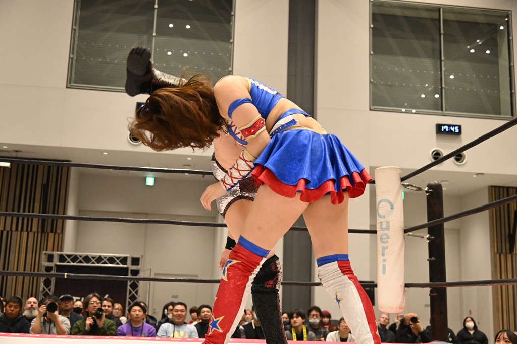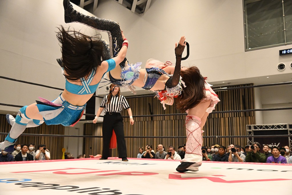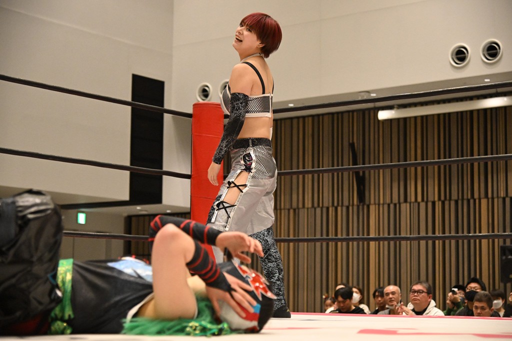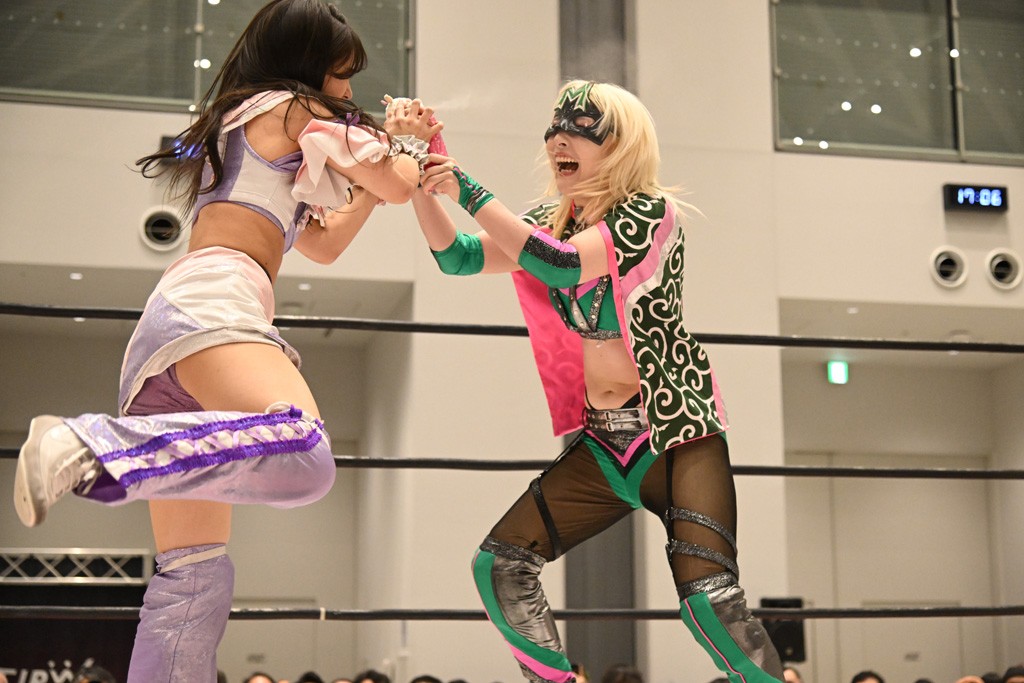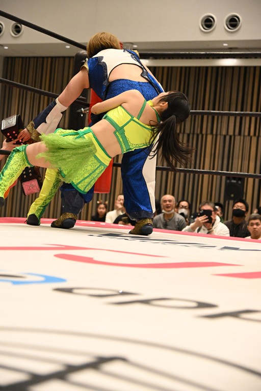 瑞希が両手を広げて握手を求めると、リカも応じる。だが、瑞希はトーキックで奇襲し、ここでゴング。速攻で丸め込んだが、カウント2。再び瑞希が握手を求めて握り返したリカにトーキック。突進をかわしたリカがロープ越しドラゴンスクリュー。さらに鉄柱を使って足を攻撃。ドロップキックは足を狙って決めていく。リングに戻ってよっしゃいくぞエルボーは自爆となるも、低空ドロップキック、ドラゴンスクリュー、足4の字固めとたたみかける。反転しながら瑞希がロープエスケープ。リカが足をロープにくくりつけてドロップキック。残り3分。バックブリーカーからのフォールをブリッジで脱した瑞希がフットスタンプ。ロープすり抜け式ドロップキック、コーナーダイブのフットスタンプはかわされたが、串刺しドロップキックで追い打ち。残り2分。セカンドロープに寝かせてフットスタンプからキューティースペシャル狙い。これをリカが切り返してドラゴンスリーパーへ。続くツイスト・オブ・フェイトからミサイルヒップ。かわされて瑞希のメテオラを浴びるも、カウンターのヒップアタックを決め、スライディングの一発も披露。追撃のツイスト・オブ・フェイトは瑞希が回転エビ固めで切り返すと、両者は丸め込みの応酬。カウント2。残り10秒でリカがドラゴンスリーパーに捕獲するも、タイムアップ。試合後は瑞希が握手を求め、リカが握り返すとトーキックを入れて引き上げていった。