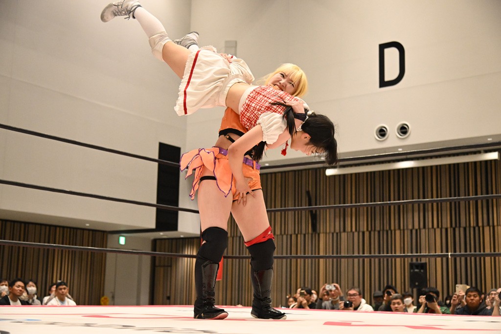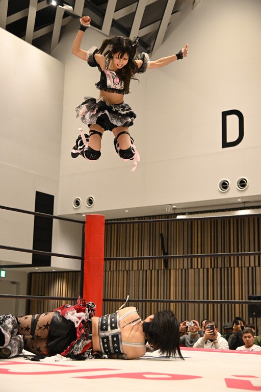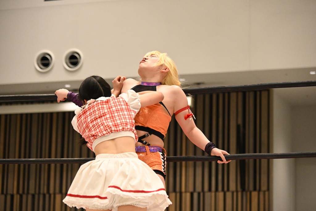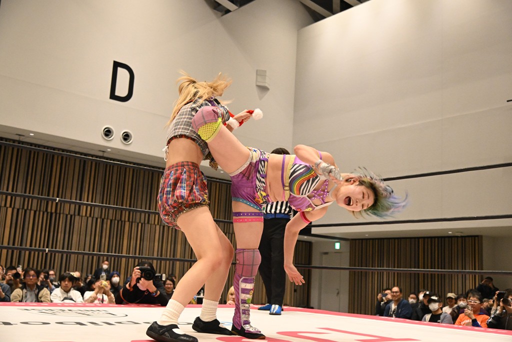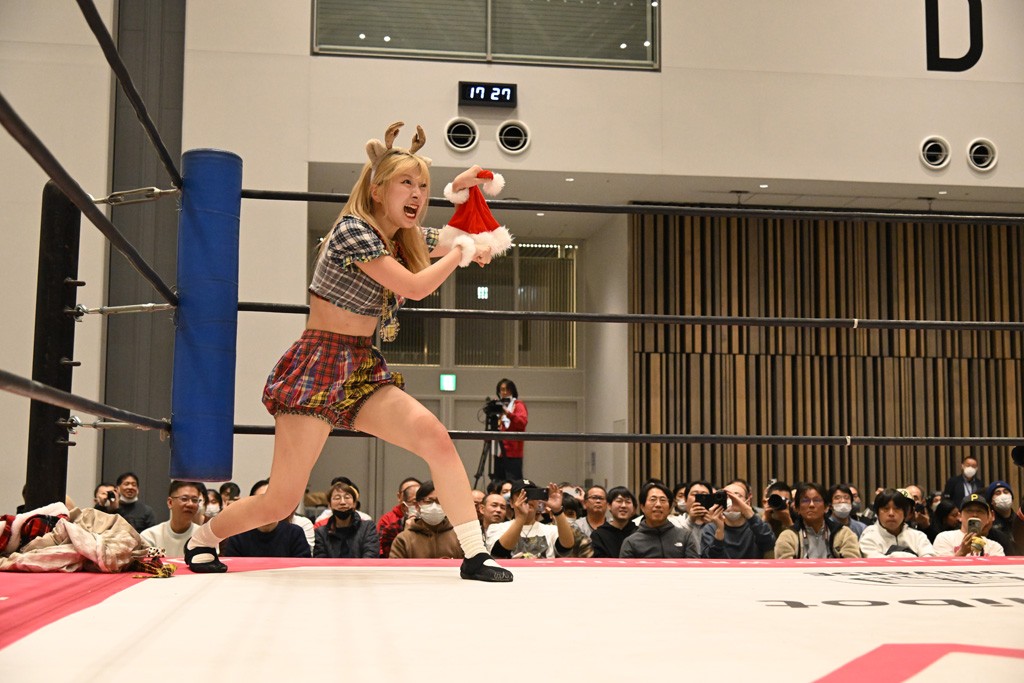 らくは謎のクリスマスプレゼントが入ったと思われる袋と枕持参で入場。サマーはダッシュしてリングイン。らくがサマーにアイマスクをさせて枕を置くとサマーは就寝。さらに枕元にプレゼントを置いて「起きて!」と叫ぶ。サマーが起床してプレゼントに気づいて中身を確認しだす。そこにらくが背後からサンタハットを被せて目隠ししたところでゴング。すかさず丸め込むも、カウント2止まり。ならばとセカンドロープを使ったギロチンチョークからおやすみエクスプレス&おやすみなさいフォールを決めたが、カウント2。突進を迎撃したサマーが反撃して、串刺しラリアット。サーフボードストレッチで締め上げるが、らくが同じ技で切り返す。ぽっぽーチョップ!!はかわされるも、フェースクラッシャーを浴びせていく。カウント2。エルボーとチョップのラリーかららくが両手でチョップを放っていくが、サマーが追走してボディーアタック。続けてバックドロップ。残り3分。アバランシュプレスはカウント2。追撃で担ぎ上げるも、脱したらくがかがやき。最後はドクターイエローで勝負あり。