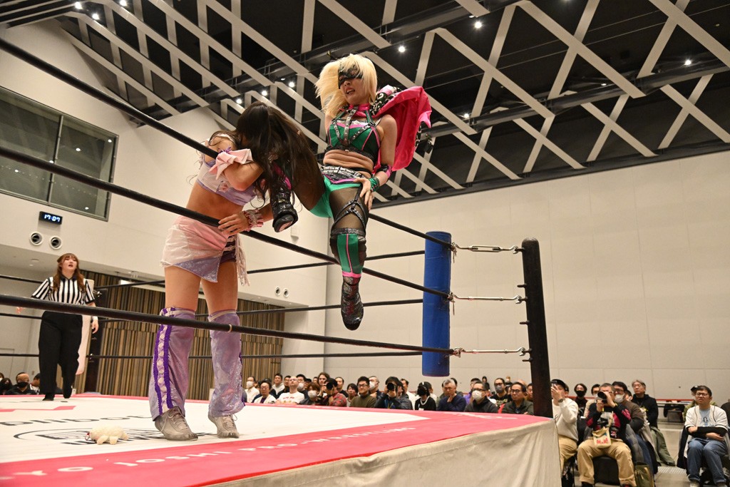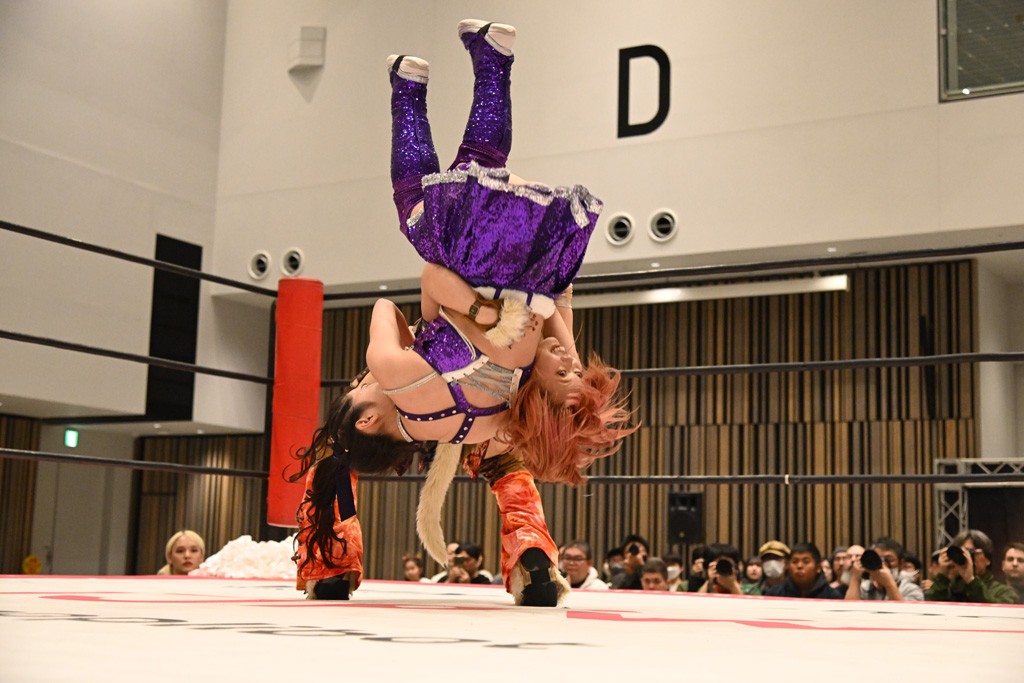 第1試合からセミまでは谷真理佳さん抽選で決定した7分1本勝負のシングルマッチ。まずは『ねくじぇねトーナメント’25』最終戦の記憶が新しい汐珠vs千花。千花がショルダーアタックで倒して先制。汐珠も回転エビ固めからドロップキックを見舞ってやり返す。汐珠が串刺しドロップキックからカバーもカウント2。アームロックは千花がエスケープして、向かってきた汐珠をボディースラムで叩きつける。串刺しのジョン・ウーからランニングエルボーはカウント2。残り3分、稲荷鳥居は汐珠がかわして丸め込むもカウント2。振りかぶりエルボーを汐珠がかわして反転式ミサイルキック。汐珠がエルボー連打から丸め込むもカウント2。コアラクラッチを決めたとおろで残り2分。千花が振り解いてのエルボーから稲荷鳥居・改を狙う。汐珠がかわしてコアラクラッチ。しかしロープに逃げられる。反転式ミサイルキックは千花が足を掴んで阻止。残り1分、汐珠が振り子式ドロップキックもカウント2。コアラクラッチを千花がかわしてエルボードロップ。残り10秒のところでなんとか稲荷鳥居・改に持ち込んで勝利した。