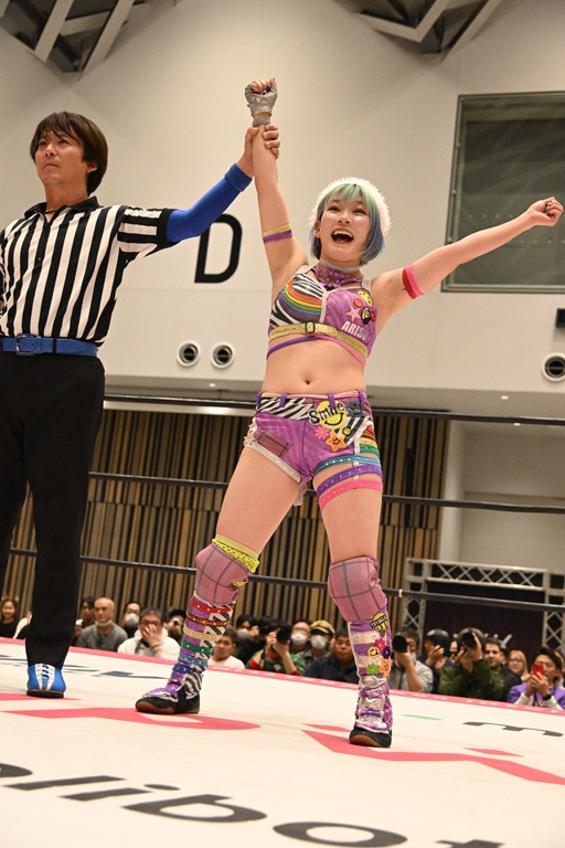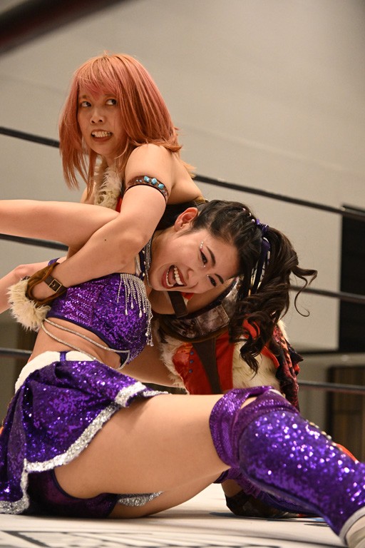 場内にはこの試合がアイアンマンヘビーメタル選手権試合としておこなわれることがアナウンスされ、両者が入場してゴング。いきなり志乃が丸め込み連発。カウント2となって観光案内しながら真弥を攻めていく。ドロップキックはカウント2となると、志乃がレフェリーに詰め寄ってアイアンマンのルールを確認。全力あっちむいてホイで決着をつけることを提案し、じゃんけんで勝利したものの、あっちむいてホイで勝てず。その隙をついて真弥がサイドバスター、ショルダータックルとたたみかけ、「志乃の得意なあっちむいてホイを潰して申し訳ございません」と謝罪。ドロップキックで反撃した志乃がネックブリーカードロップ。追撃は許さず、真弥が後頭部にエルボー。志乃の後方回転エビ固めを潰してスリーパーで捕えるが、志乃が被さってフォール。残り3分。カウント2でキックアウトした真弥がスパインバスターで3カウント奪取。