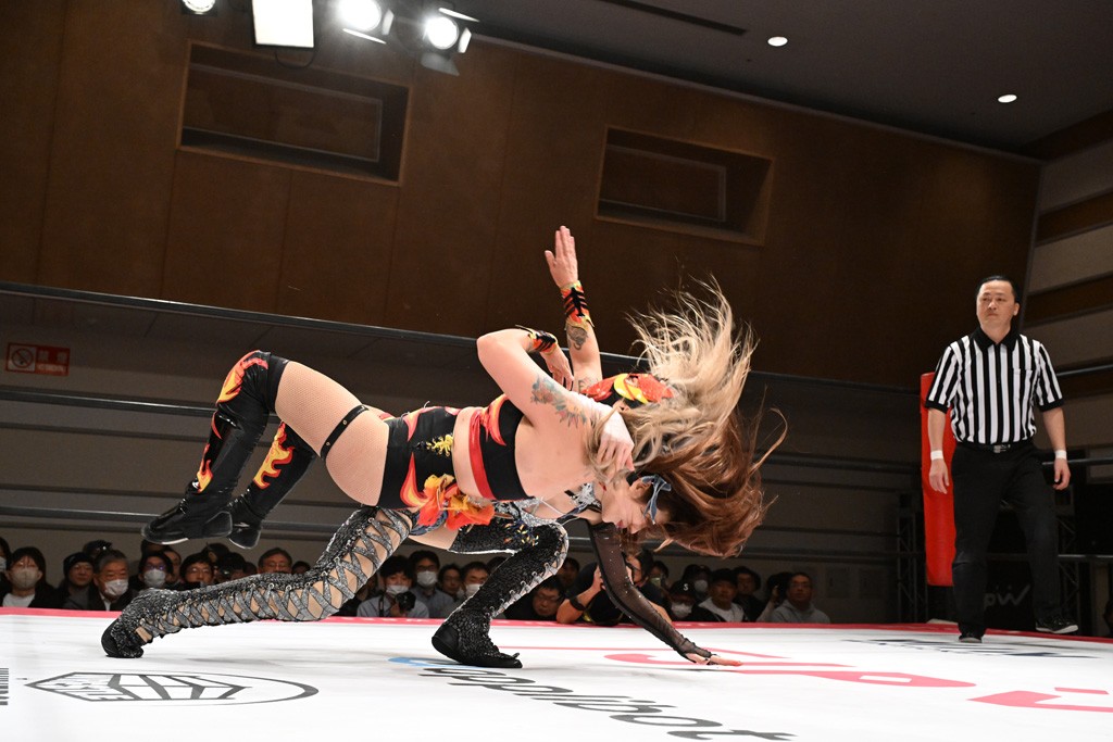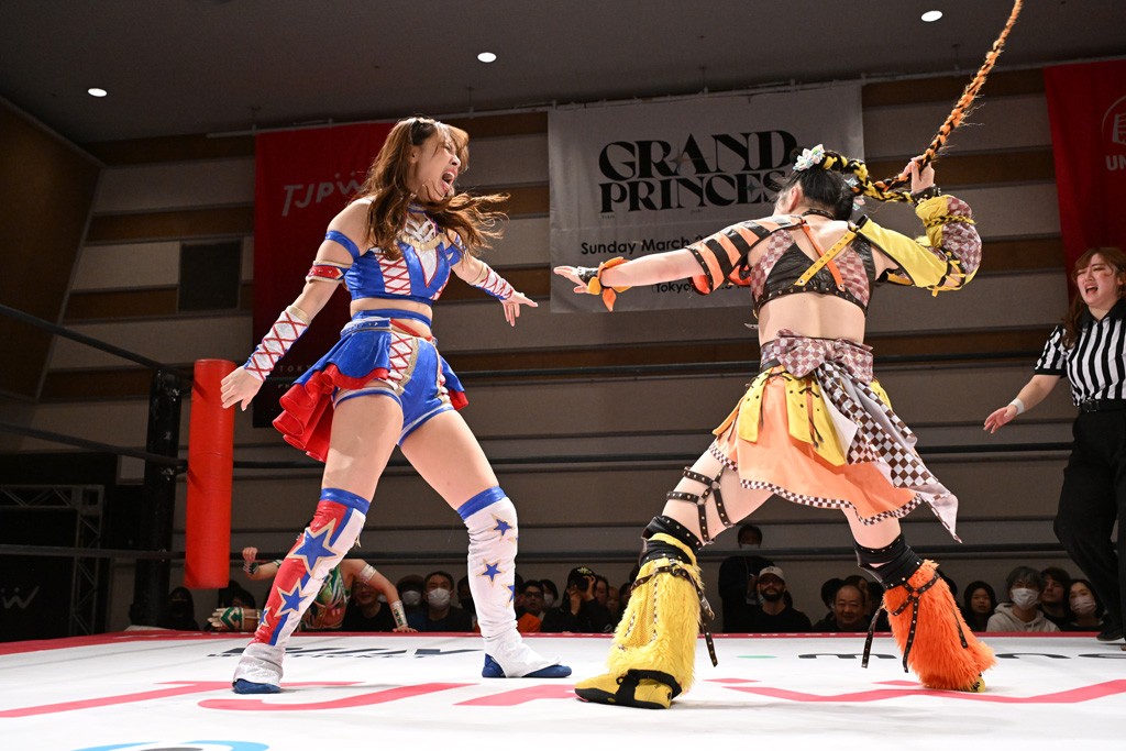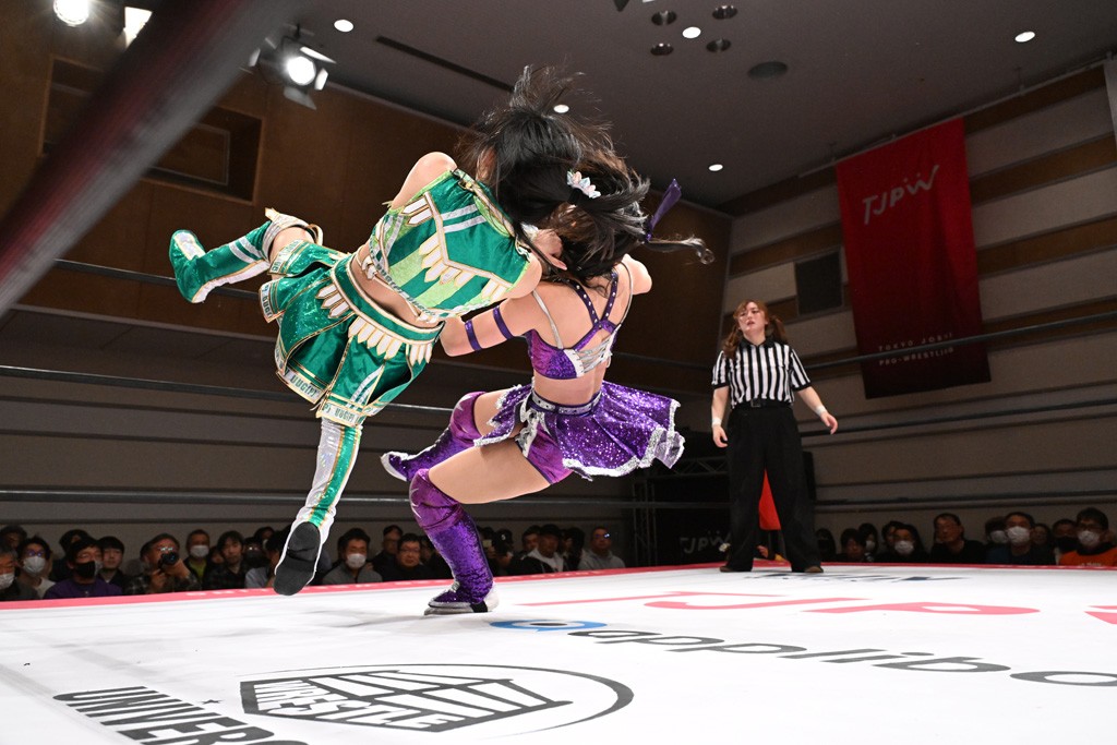 握手から試合開始。先発はHIMAWARIと芦田。手四つの攻防と見せかけてHIMAWARIが長い髪の毛で攻撃。志乃が「小橋建太さんとの写真をポストしてフォロワーが500人増えた」と観光案内。続けて志乃が荒井の観光案内をしようとするも、荒井がポンポンを投げ入れて阻止。2人はチア式のリープフロッグの連係をみせ、芦田がY字ギロチンを放って荒井にスイッチ。ビッグブーツを放っていくが、突進をドロップキックで志乃が迎撃。かわったHIMAWARIがショルダータックルや髪の毛攻撃、ネックブリーカードロップでたたみかける。お姫様落としとフルネルソンバスターはお互いに不発となるや、荒井がビッグブーツ。5分経過。荒井のサソリ固めは志乃がカット。荒井組がダブルのビッグブーツの連係からサンドイッチ攻撃狙い。これをよけたHIMAWARIがドロップキックを放って阻止。志乃にかわると荒井が串刺しビッグブーツ。芦田が串刺しスピンキックからビッグブーツもカウント2。ジャーマンは志乃が阻止してドロップキック。スイング・ネックブリーカードロップからベリー・トゥ・ベリー狙い。抵抗した芦田がハイキック。芦田の突進はHIMAWARIが割って入ってお姫様落としで投げ捨てる。荒井にはダブルのネックブリーカードロップの合体技で排除。志乃が芦田にベリー・トゥ・ベリーを放ってスリーパーで捕えると芦田は蹴って脱出。10分経過。続けて芦田がハイキックからXファクター。カットに入ったHIMAWARIを荒井がフルネルソンバスターで場外に追放。リング内では芦田が志乃にバックキックからジャーマンで3カウント奪取。勝利した荒井組は上福ゆき&上原わかな組と2回戦で激突する。