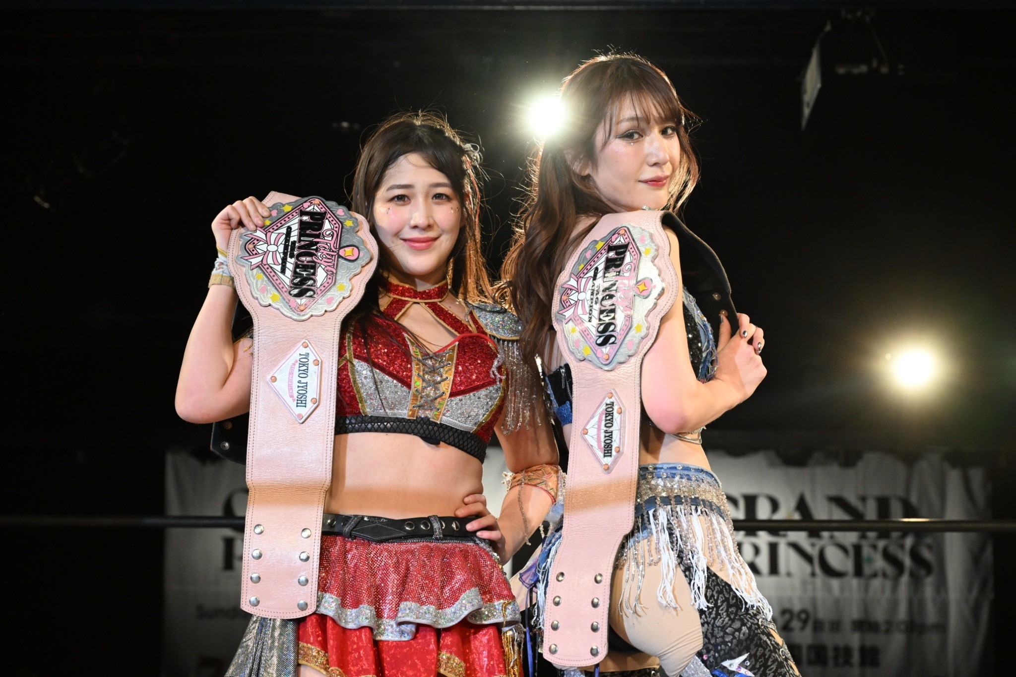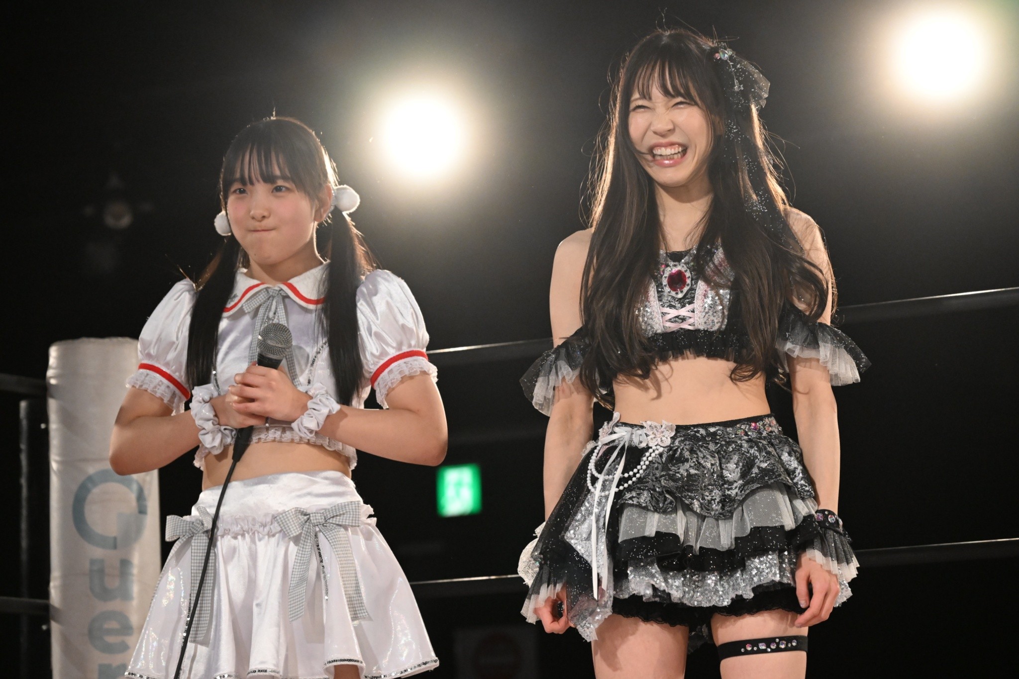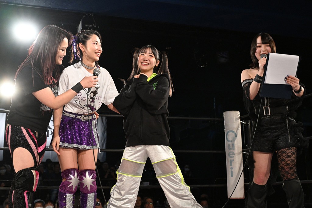決勝戦で瑞希&汐珠組との対戦が決定すると、瑞希組がリングイン。上福「はあ。瑞希さん。やっぱりさすが瑞希さん。ここまで当たり前のようにケロっといますね。ガキは意外だったわ。瑞希さん。私、デビュー戦の相手瑞希さんだったんですけど、後楽園でここまで強くなりました。だから久しぶりに瑞希さんと戦えるの嬉しいし、後楽園で全力出します。ガキはおまけで来い」上原「私たちは今こんなにボロボロなのに、 2人はもうすごい涼しい顔してて悔しいから、タッグトーナメント私たちが 絶対に勝ちます!」汐珠「正直、自分でもタッグトーナメントが決まった時にここまで来るって想像してなかったんですけど、今ここまで頑張ってこれたから。今の汐珠は私たちが優勝する未来が見えています」瑞希「私も汐珠とここまで上がってこれるって正直思ってなかったけど、思ってなかったけどなんか奇跡が起きたんじゃなくて、二人で起こしてここまで上がってきたって思ってるから。せっかくなら汐珠と優勝したいし、優勝したらそのベルトをかっさらっていく。よろしくお願いします」瑞希がサミングポーズ、上福がうさぎポーズをしながら記念撮影後、瑞希組は退場。上原「はい。去年は私たちまだタッグ名もなくて、このトーナメント準決勝で、この会場で同じマックスさん、ぽむさんに敗退してしまったんですけど。今はこうやってベルトを持って上福さんと決勝に進むことができます!」上福「普段は自分の感情を出さない私ですけども。ハングリーではない感じでやってますけども。人の感情は365日、ぐるぐる変わるものだし。私たちは人間なので、Ober EatsがチャットGPTだったり、AIだったり。そんなところにはないとても感情的で感動的な試合をお届けいたします。じゃあ後楽園で会いましょう! ありがとうございました!」
