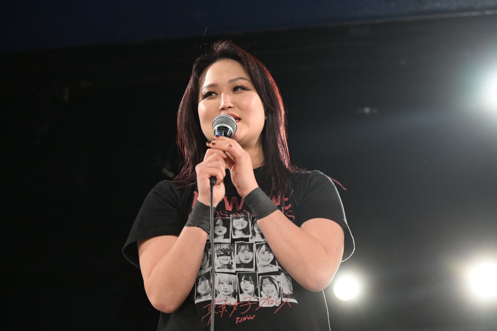 MIRAI 勝手に言っちゃったんですけど、東京女子の方、人生社長、ごめんなさい。勝手に言っちゃったんですけど。自分は両国でタイトルマッチしたいです。このベルトに挑戦する時に会見でやりたい相手いるっていうのも言ってますし、自分のその心の中で思ってるのを一個一個実現していけたらいいなと思うので、まずは2月14日勝たないとそこに進めないと思うので、しっかり勝って守りたいと思います。