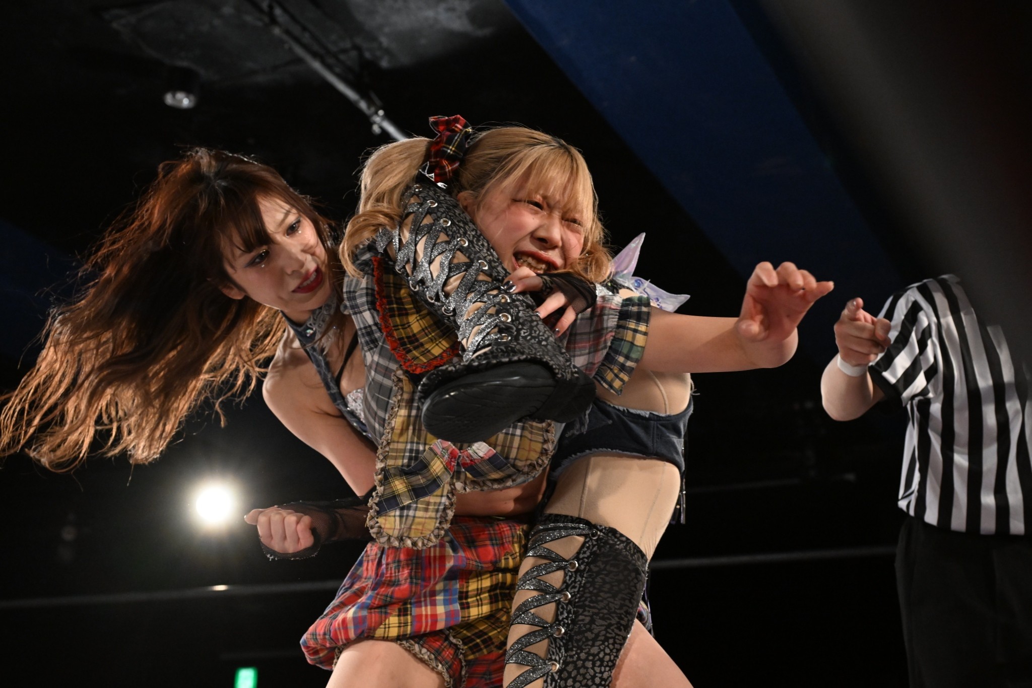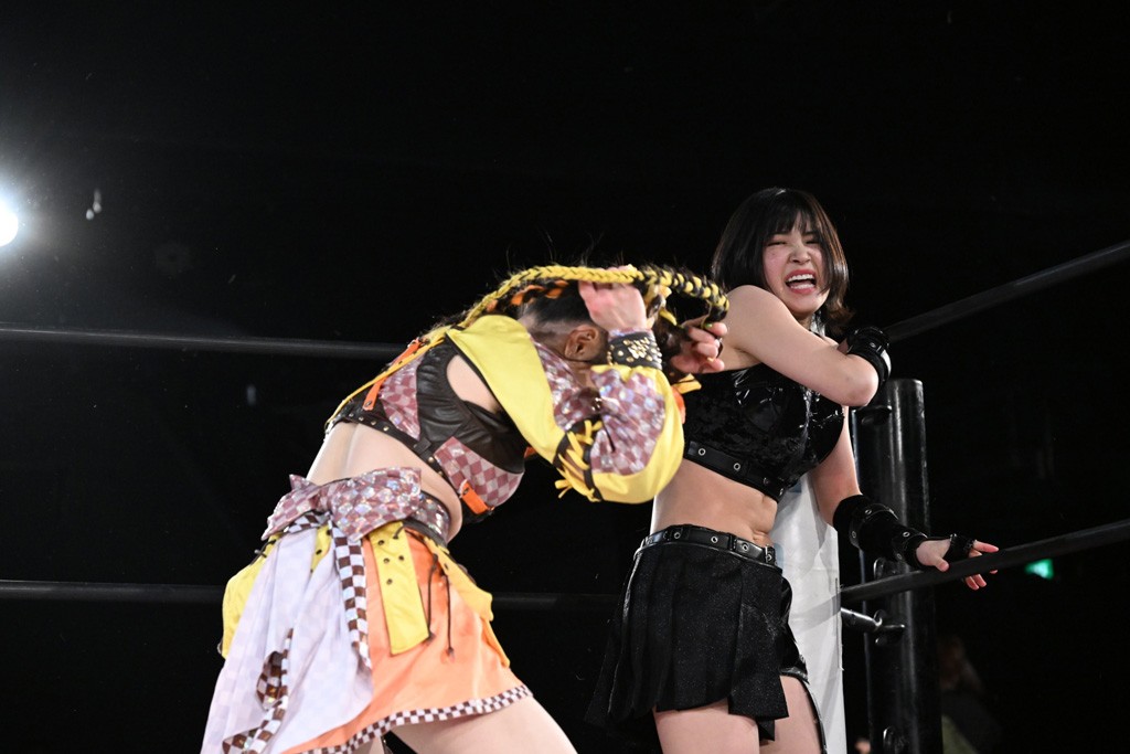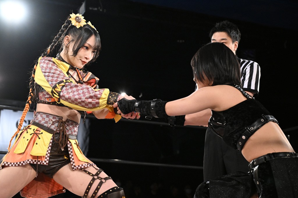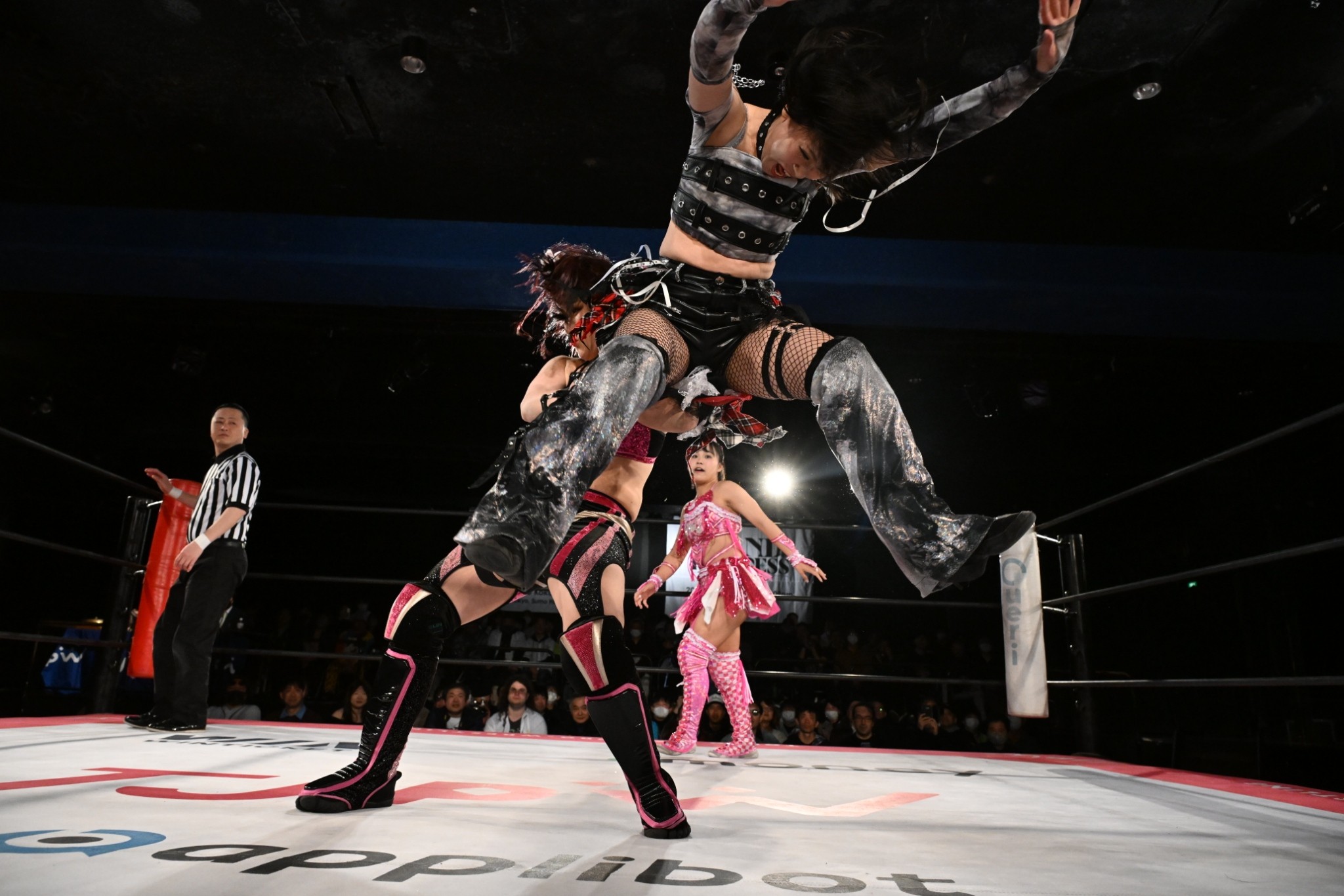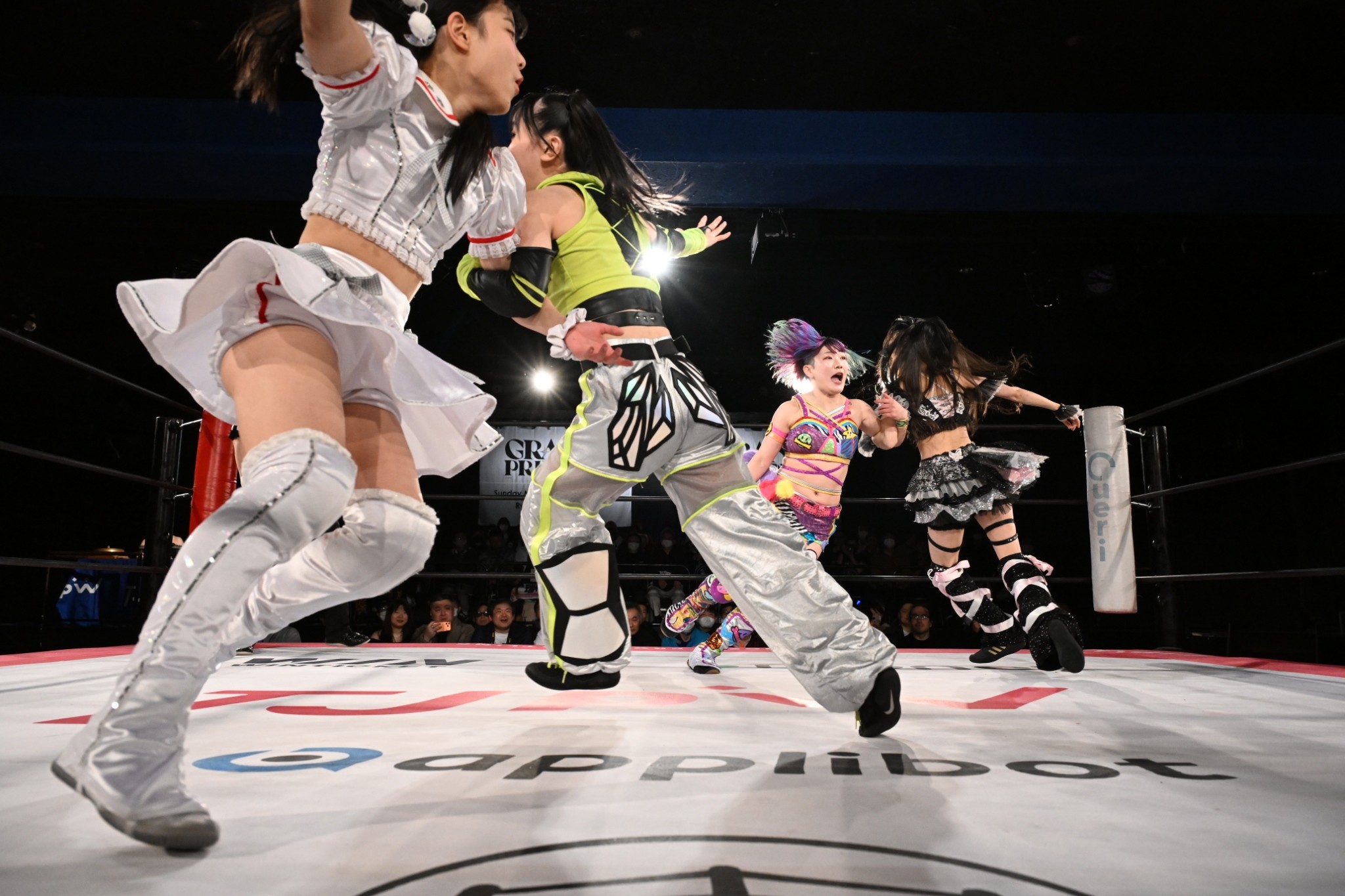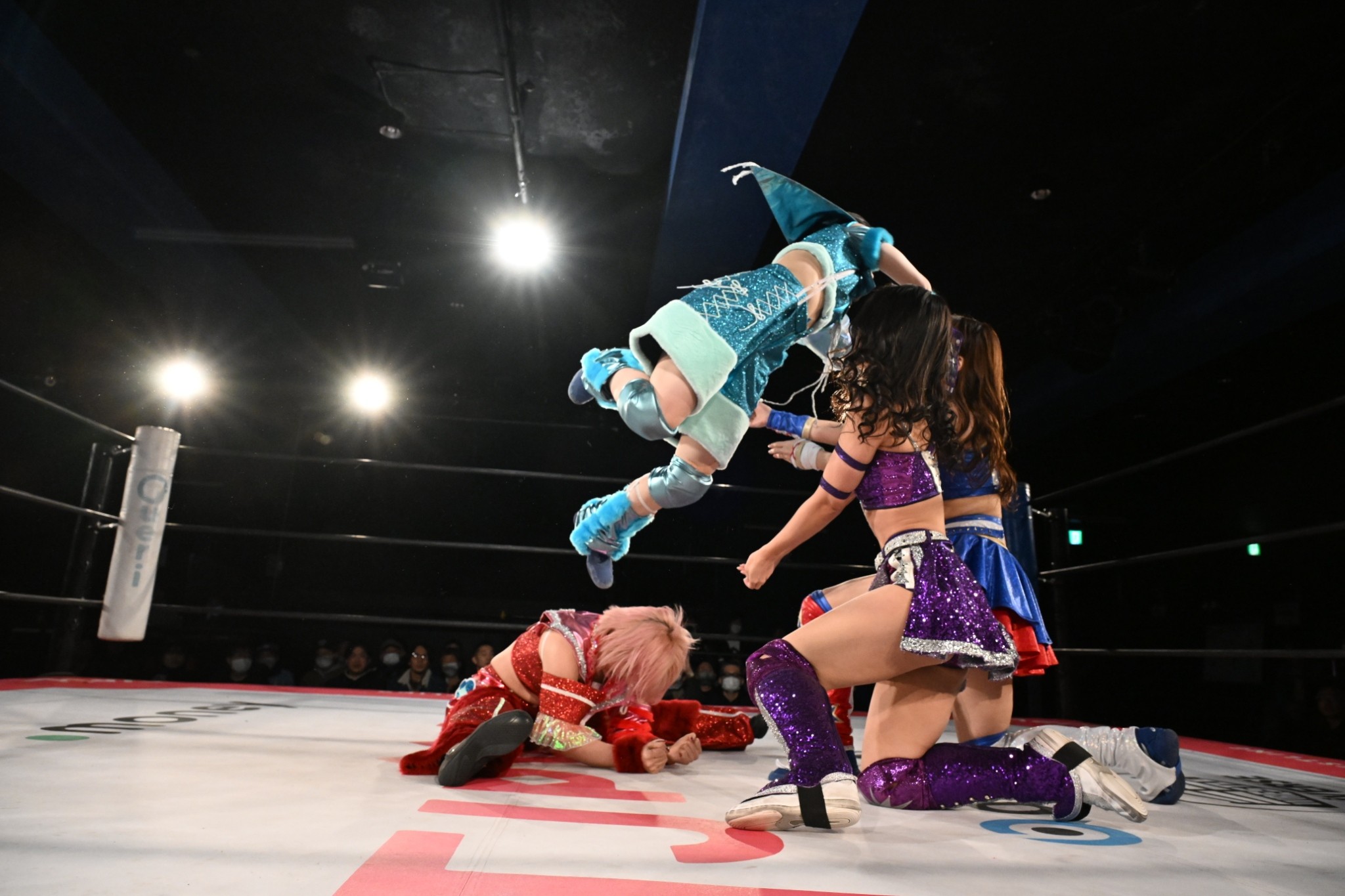 瑞希組が「お願いします!」と手を差し出すとまともに握手が成立。さらにでじもんが奇襲を制止してゴングが鳴ると、瑞希組が連係。汐珠をハンマースルーで投げつけるが、瑞希のエルボーは誤爆。でじもんがスピードで撹乱すると、場外エスケープした瑞希が「来いよ」と挑発。追いかけたでじもんだったが、入れ替わるように瑞希組がリングイン。「来いよ」との挑発にでじもんがダブルのドロップキックで共演。ローンバトルから逃れた汐珠が瑞希とスイッチ。セカンドロープすり抜け式ドロップキック、コーナーからクロスボディーを決めていくが、カウント2。5分経過。有栖が鶴ヶ城で反撃して鈴芽にかわると、エプロンで鈴芽が捕獲して有栖がドロップキックの連係を披露。瑞希から汐珠にかわるとコーナー反転式ミサイルキックに、鈴芽はグラウンドでのハチノス・エイトノットで応戦。エスケープした汐珠へのミカヅキ流星群は自爆になるが、コーナー反転式ミサイルキックを追走してフェースクラッシャーを浴びせていく。リング・ア・ベルは鈴芽が抵抗して瑞希にスイッチ。セカンドロープすり抜け式ドロップキックを鈴芽が避けると有栖がエプロンから鶴ヶ城。鈴芽がミカヅキ流星群で追撃。有栖にスイッチすると、フライング・ボディープレスもカウント2。キャメルクラッチは抜けた瑞希がクロスフェース。10分経過。什の掟はクロスフェースで切り返されるも、回転してフォールして脱した有栖はネックブリーカードロップを放つ。瑞希のキューティースペシャルは割って入った鈴芽がセカンドロープ反転式ドロップキックでカットし、でじもんが水車落としと熨斗紙で共演。続く連係をかわした瑞希が鈴芽をフットスタンプで排除すると、有栖のスーパーキックを捕獲して汐珠を呼び込む。汐珠のコルバタに瑞希が投げっぱなしキューティースペシャルで続き、最後は正調の一発を放って勝利した。試合後の瑞希組は2人でハイタッチ。