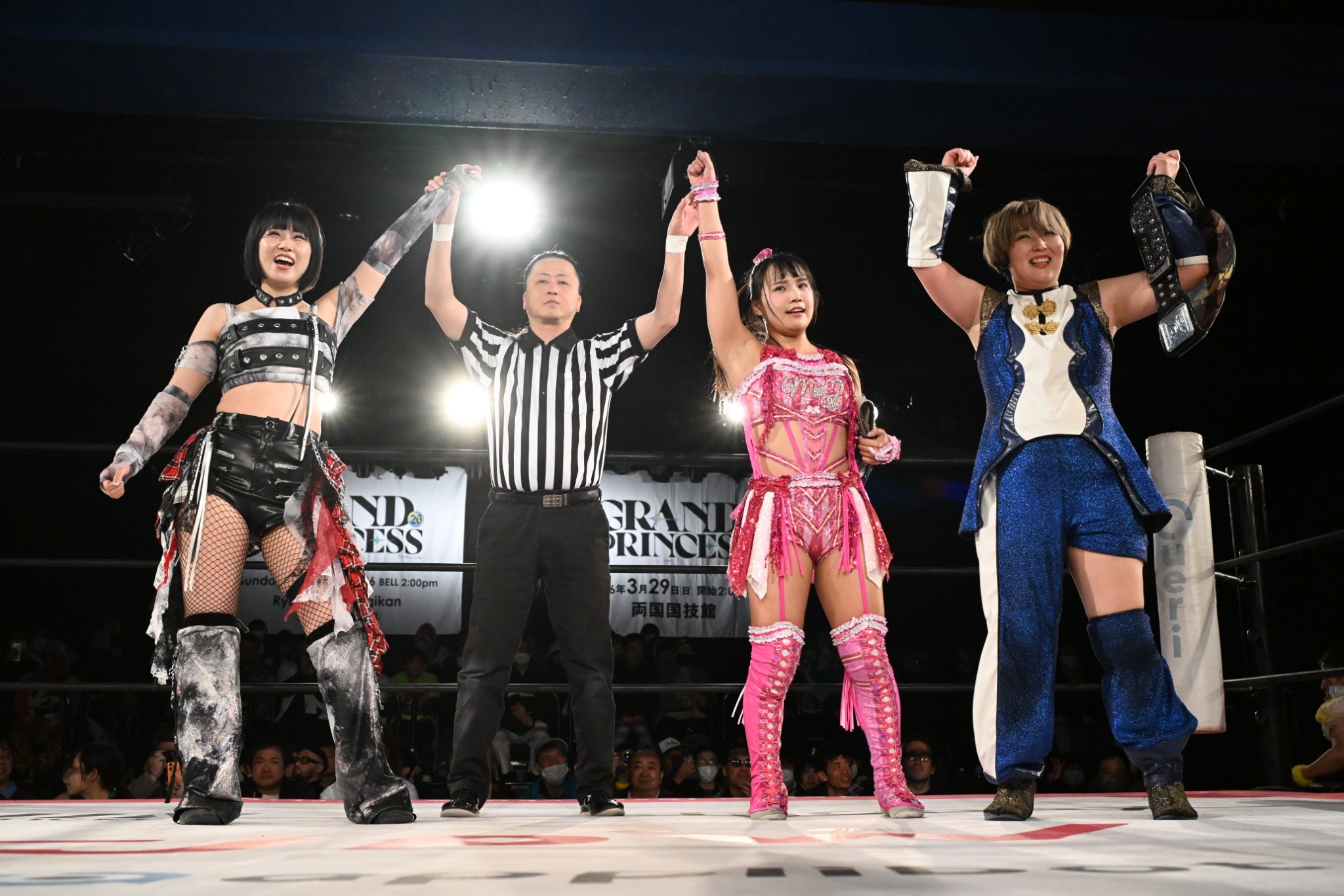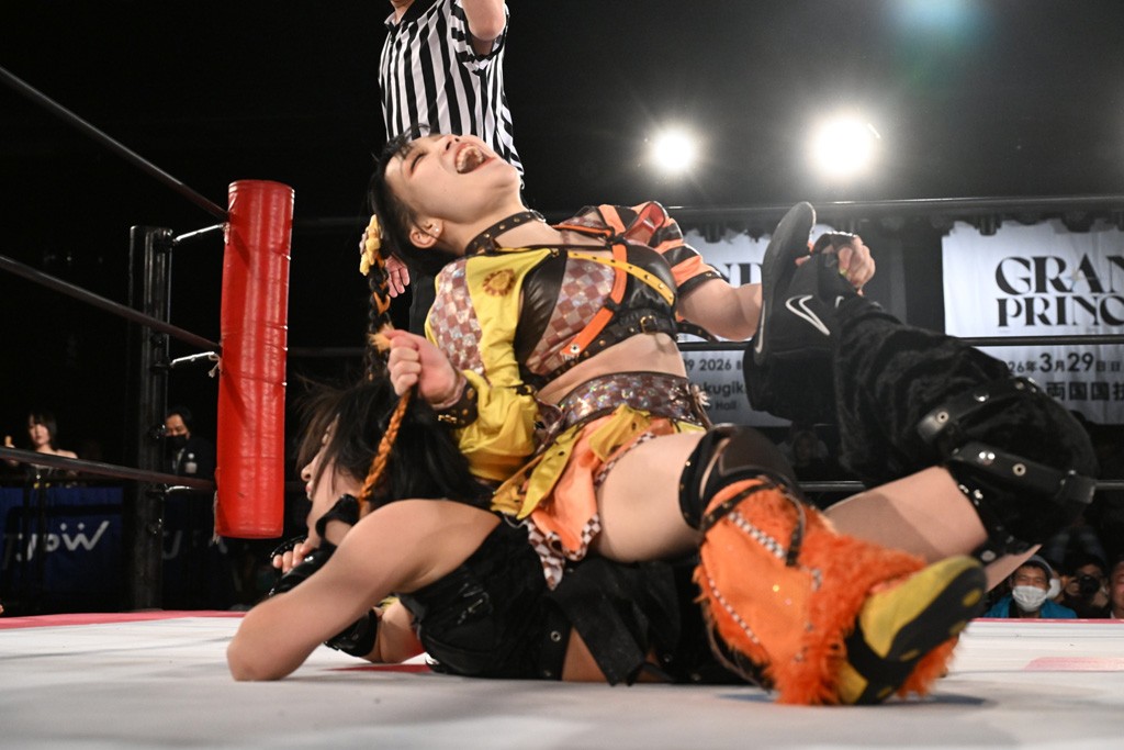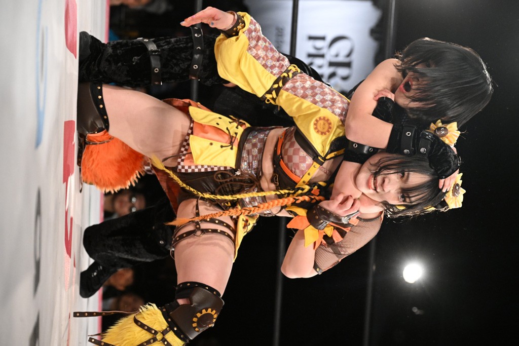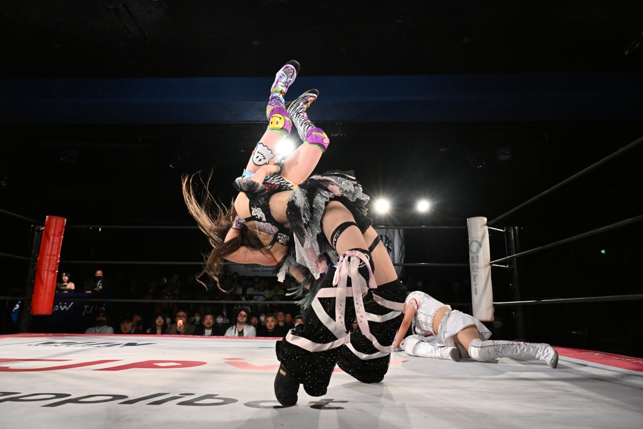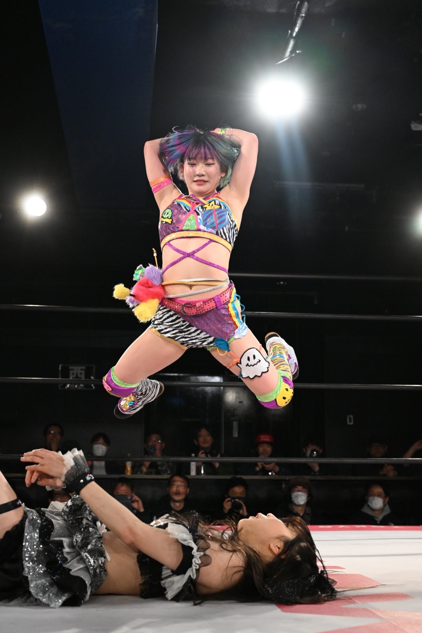 瑞希組が「お願いします!」と手を差し出すとまともに握手が成立。さらにでじもんが奇襲を制止してゴングが鳴ると、瑞希組が連係。汐珠をハンマースルーで投げつけるが、瑞希のエルボーは誤爆。でじもんがスピードで撹乱すると、場外エスケープした瑞希が「来いよ」と挑発。追いかけたでじもんだったが、入れ替わるように瑞希組がリングイン。「来いよ」との挑発にでじもんがダブルのドロップキックで共演。ローンバトルから逃れた汐珠が瑞希とスイッチ。セカンドロープすり抜け式ドロップキック、コーナーからクロスボディーを決めていくが、カウント2。5分経過。有栖が鶴ヶ城で反撃して鈴芽にかわると、エプロンで鈴芽が捕獲して有栖がドロップキックの連係を披露。瑞希から汐珠にかわるとコーナー反転式ミサイルキックに、鈴芽はグラウンドでのハチノス・エイトノットで応戦。エスケープした汐珠へのミカヅキ流星群は自爆になるが、コーナー反転式ミサイルキックを追走してフェースクラッシャーを浴びせていく。リング・ア・ベルは鈴芽が抵抗して瑞希にスイッチ。セカンドロープすり抜け式ドロップキックを鈴芽が避けると有栖がエプロンから鶴ヶ城。鈴芽がミカヅキ流星群で追撃。有栖にスイッチすると、フライング・ボディープレスもカウント2。キャメルクラッチは抜けた瑞希がクロスフェース。10分経過。什の掟はクロスフェースで切り返されるも、回転してフォールして脱した有栖はネックブリーカードロップを放つ。瑞希のキューティースペシャルは割って入った鈴芽がセカンドロープ反転式ドロップキックでカットし、でじもんが水車落としと熨斗紙で共演。続く連係をかわした瑞希が鈴芽をフットスタンプで排除すると、有栖のスーパーキックを捕獲して汐珠を呼び込む。汐珠のコルバタに瑞希が投げっぱなしキューティースペシャルで続き、最後は正調の一発を放って勝利した。試合後の瑞希組は2人でハイタッチ。