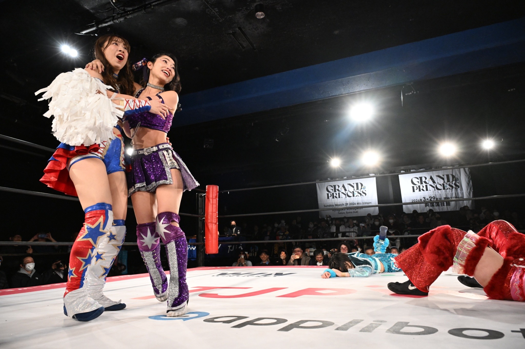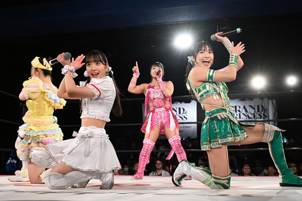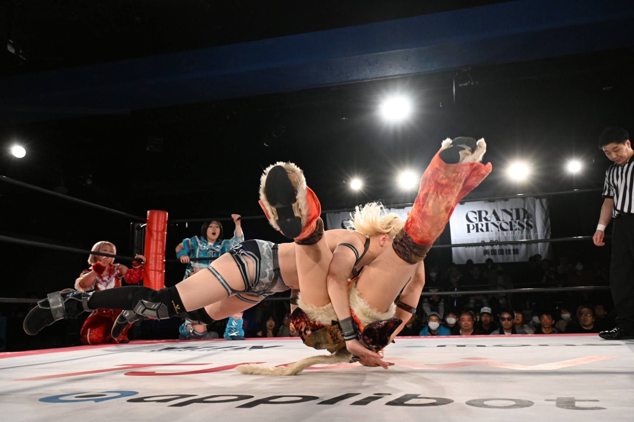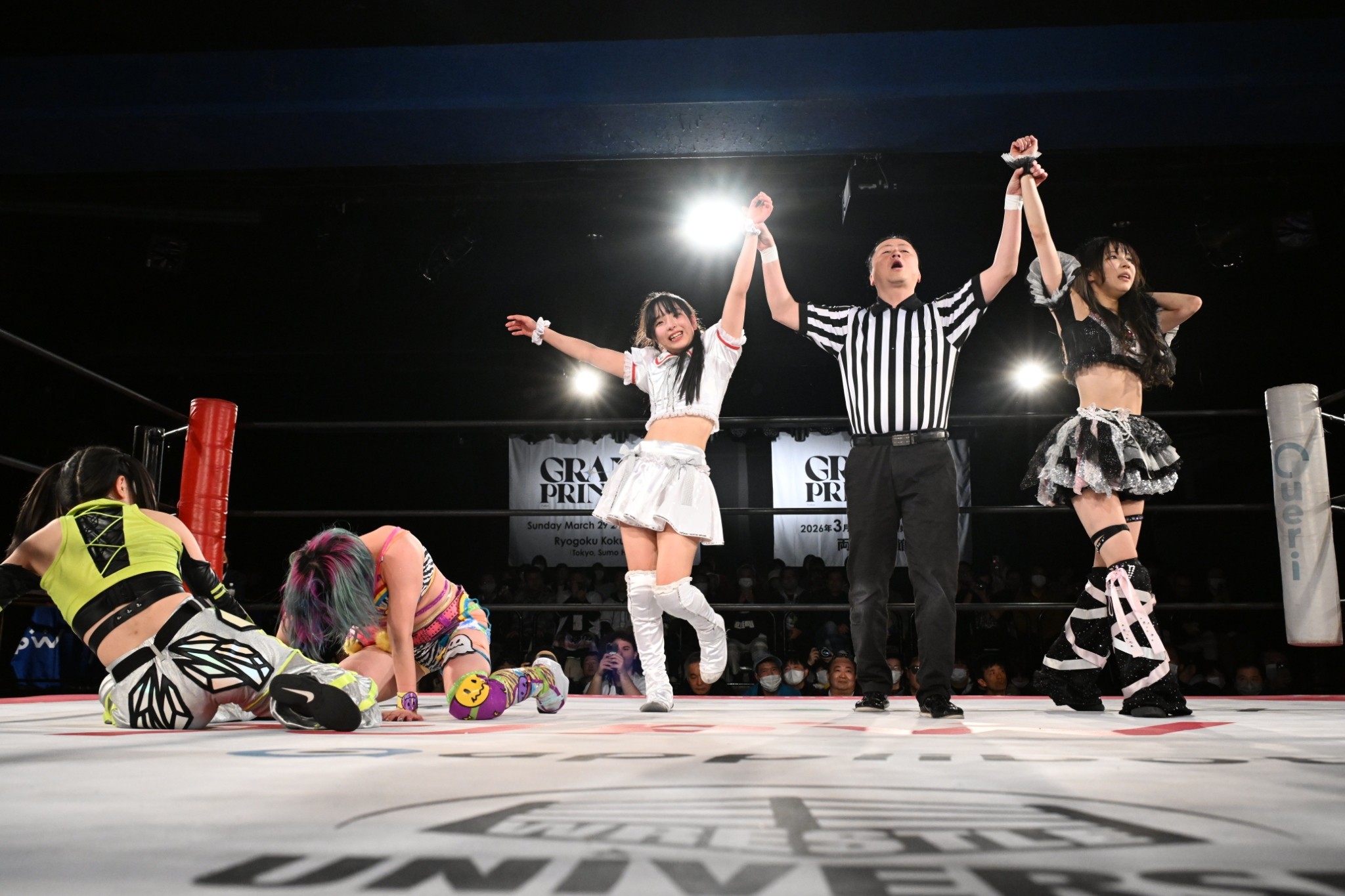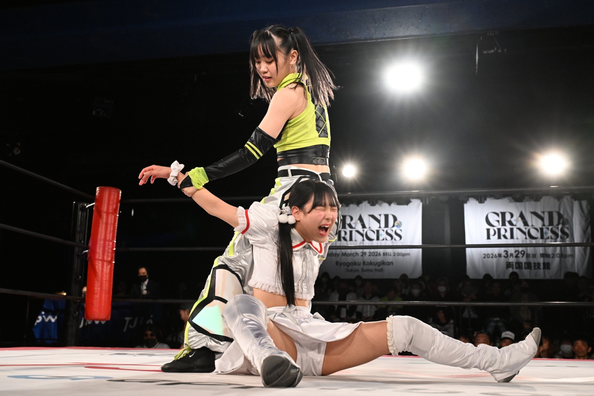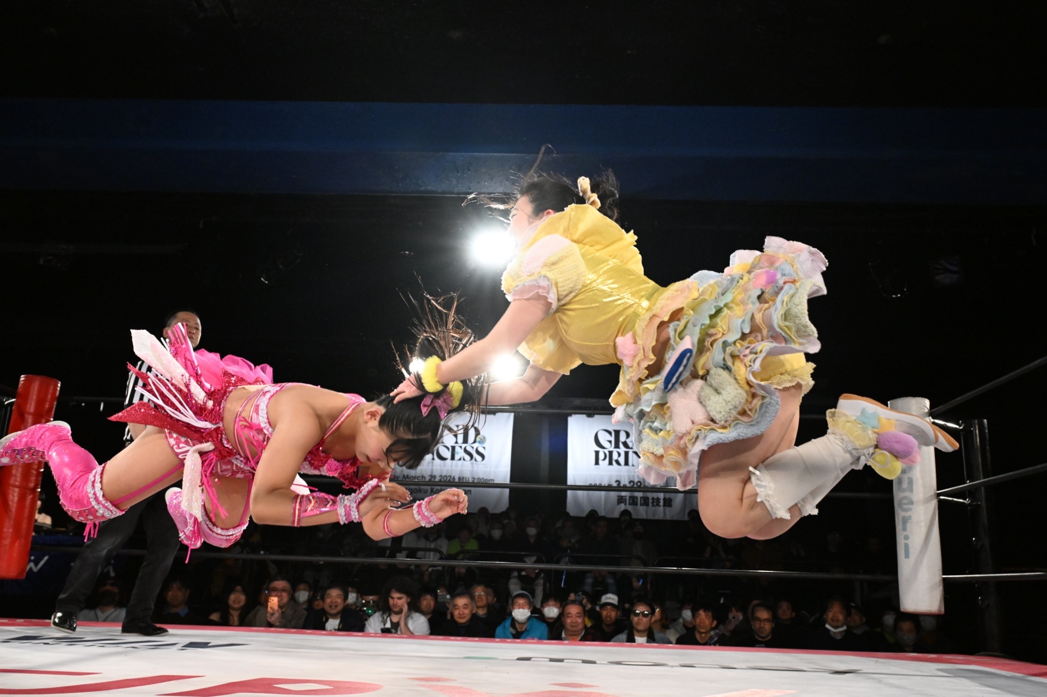 瑞希組が「お願いします!」と手を差し出すとまともに握手が成立。さらにでじもんが奇襲を制止してゴングが鳴ると、瑞希組が連係。汐珠をハンマースルーで投げつけるが、瑞希のエルボーは誤爆。でじもんがスピードで撹乱すると、場外エスケープした瑞希が「来いよ」と挑発。追いかけたでじもんだったが、入れ替わるように瑞希組がリングイン。「来いよ」との挑発にでじもんがダブルのドロップキックで共演。ローンバトルから逃れた汐珠が瑞希とスイッチ。セカンドロープすり抜け式ドロップキック、コーナーからクロスボディーを決めていくが、カウント2。5分経過。有栖が鶴ヶ城で反撃して鈴芽にかわると、エプロンで鈴芽が捕獲して有栖がドロップキックの連係を披露。瑞希から汐珠にかわるとコーナー反転式ミサイルキックに、鈴芽はグラウンドでのハチノス・エイトノットで応戦。エスケープした汐珠へのミカヅキ流星群は自爆になるが、コーナー反転式ミサイルキックを追走してフェースクラッシャーを浴びせていく。リング・ア・ベルは鈴芽が抵抗して瑞希にスイッチ。セカンドロープすり抜け式ドロップキックを鈴芽が避けると有栖がエプロンから鶴ヶ城。鈴芽がミカヅキ流星群で追撃。有栖にスイッチすると、フライング・ボディープレスもカウント2。キャメルクラッチは抜けた瑞希がクロスフェース。10分経過。什の掟はクロスフェースで切り返されるも、回転してフォールして脱した有栖はネックブリーカードロップを放つ。瑞希のキューティースペシャルは割って入った鈴芽がセカンドロープ反転式ドロップキックでカットし、でじもんが水車落としと熨斗紙で共演。続く連係をかわした瑞希が鈴芽をフットスタンプで排除すると、有栖のスーパーキックを捕獲して汐珠を呼び込む。汐珠のコルバタに瑞希が投げっぱなしキューティースペシャルで続き、最後は正調の一発を放って勝利した。試合後の瑞希組は2人でハイタッチ。