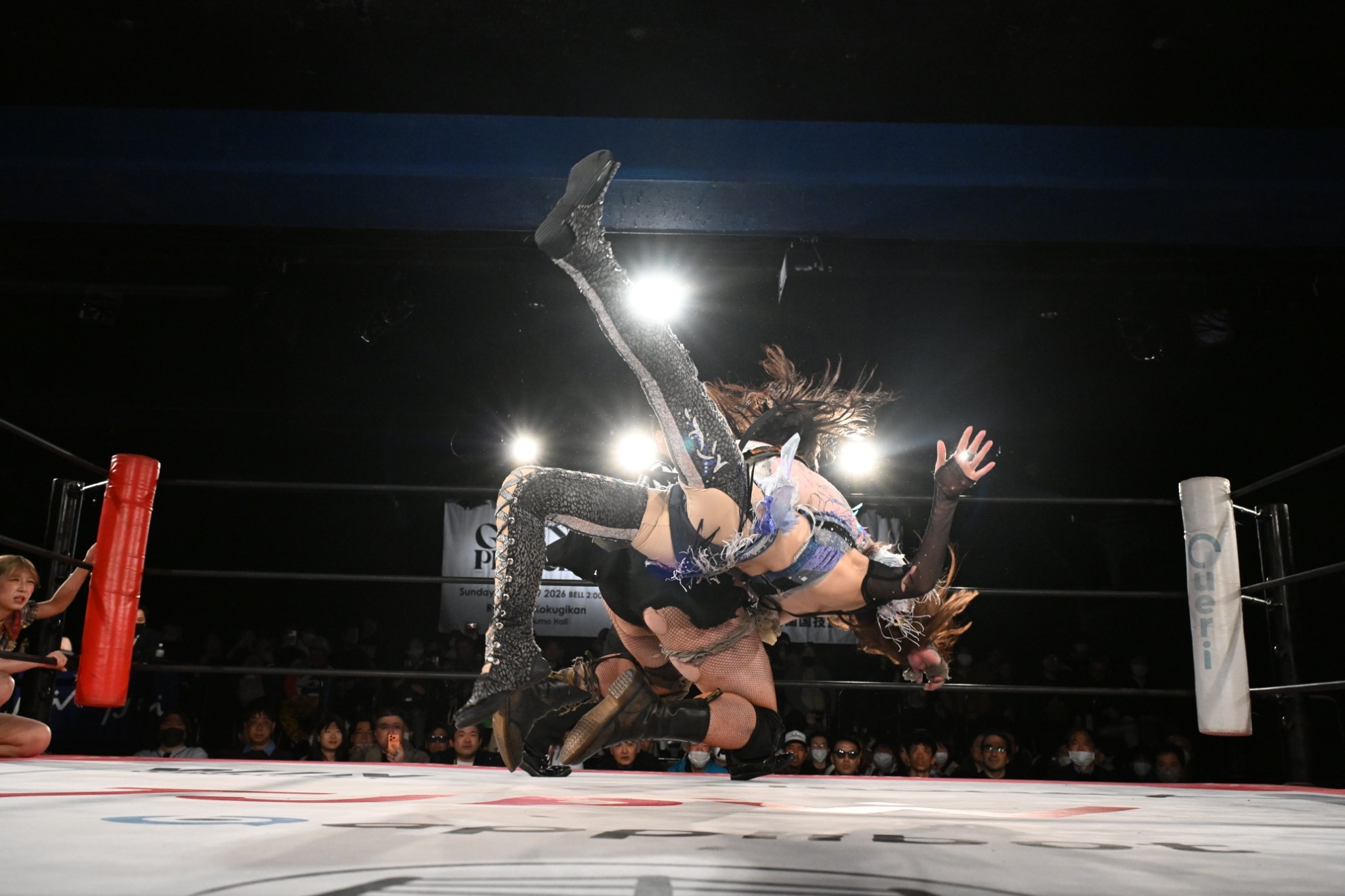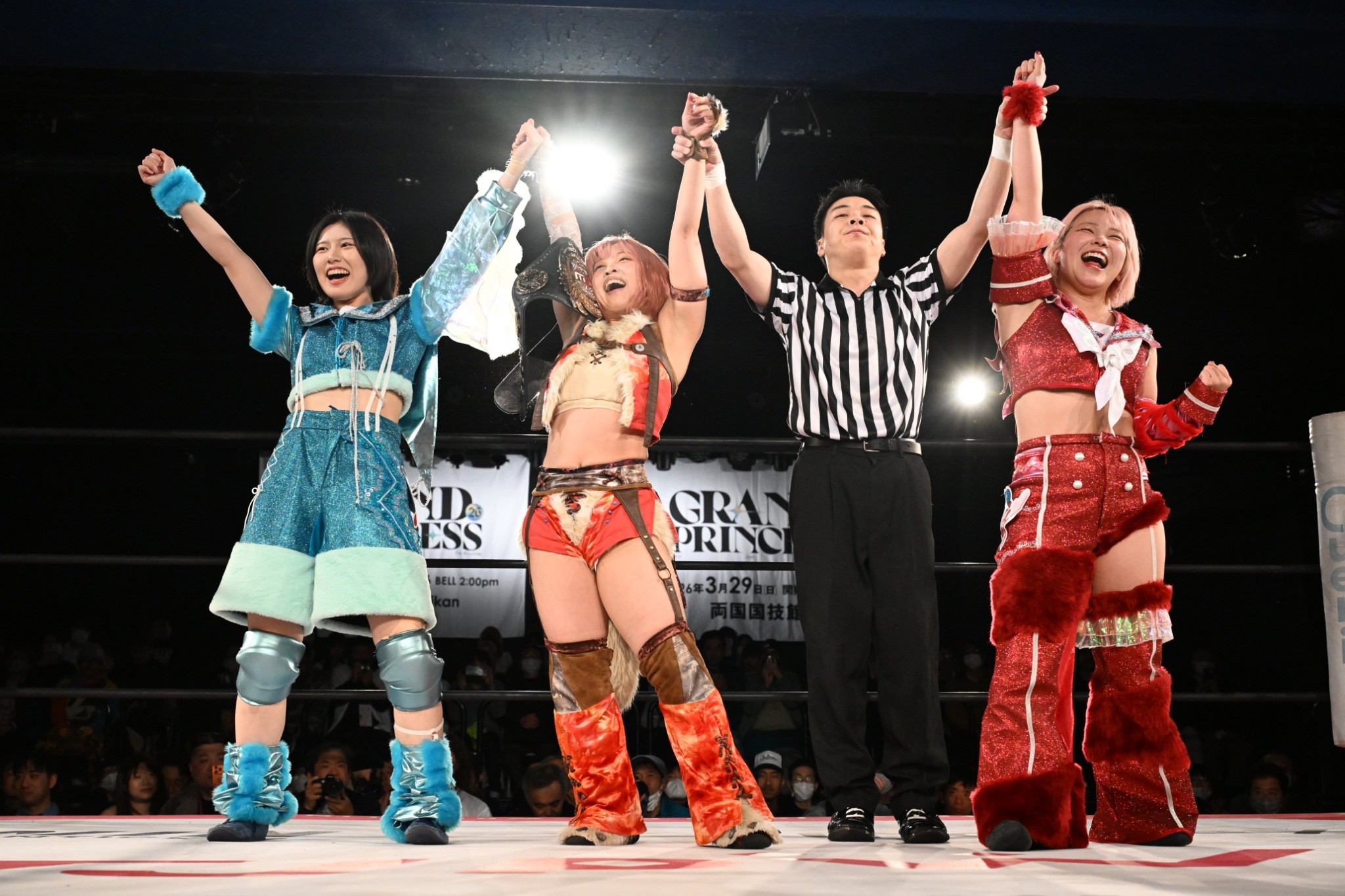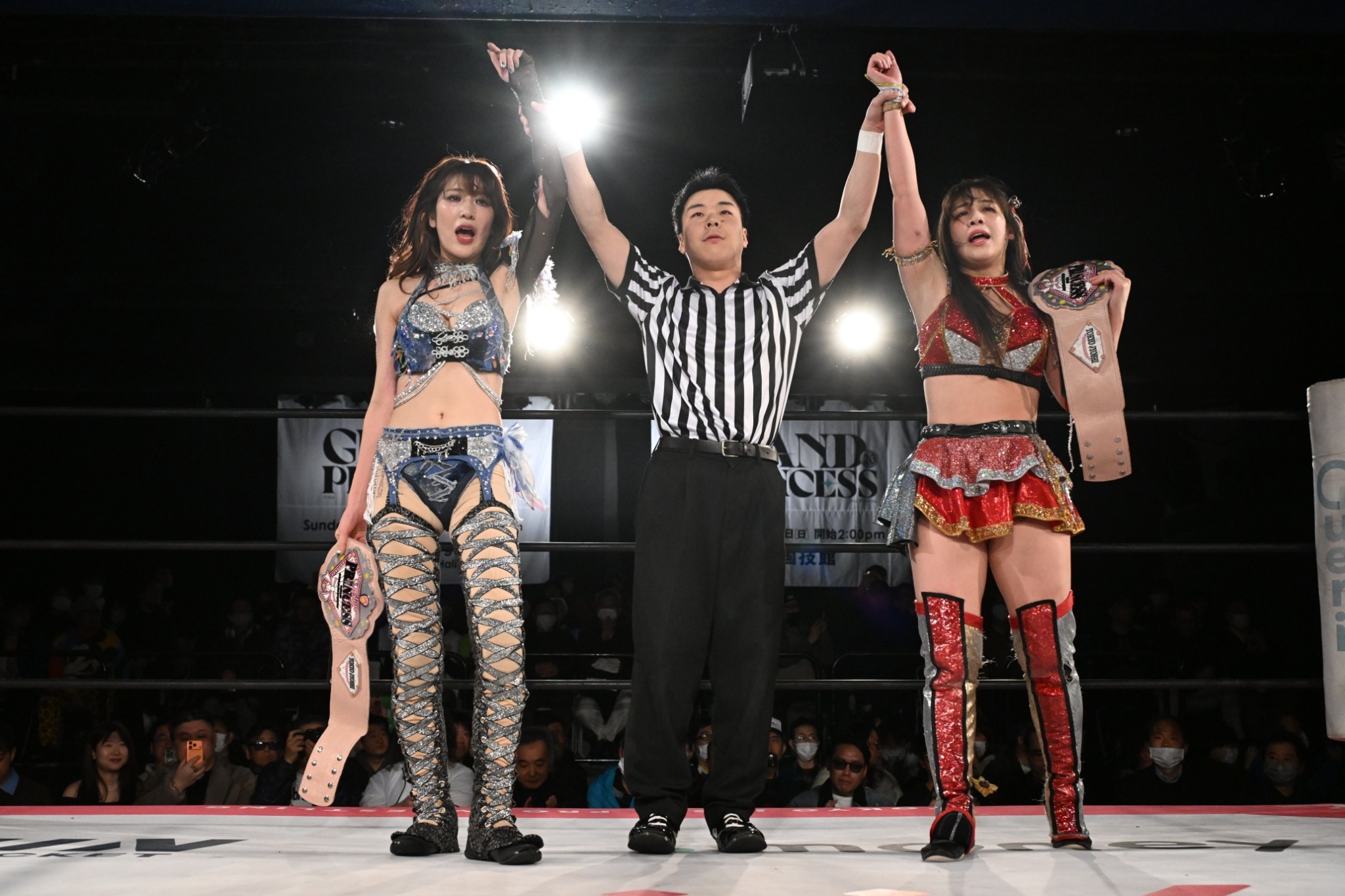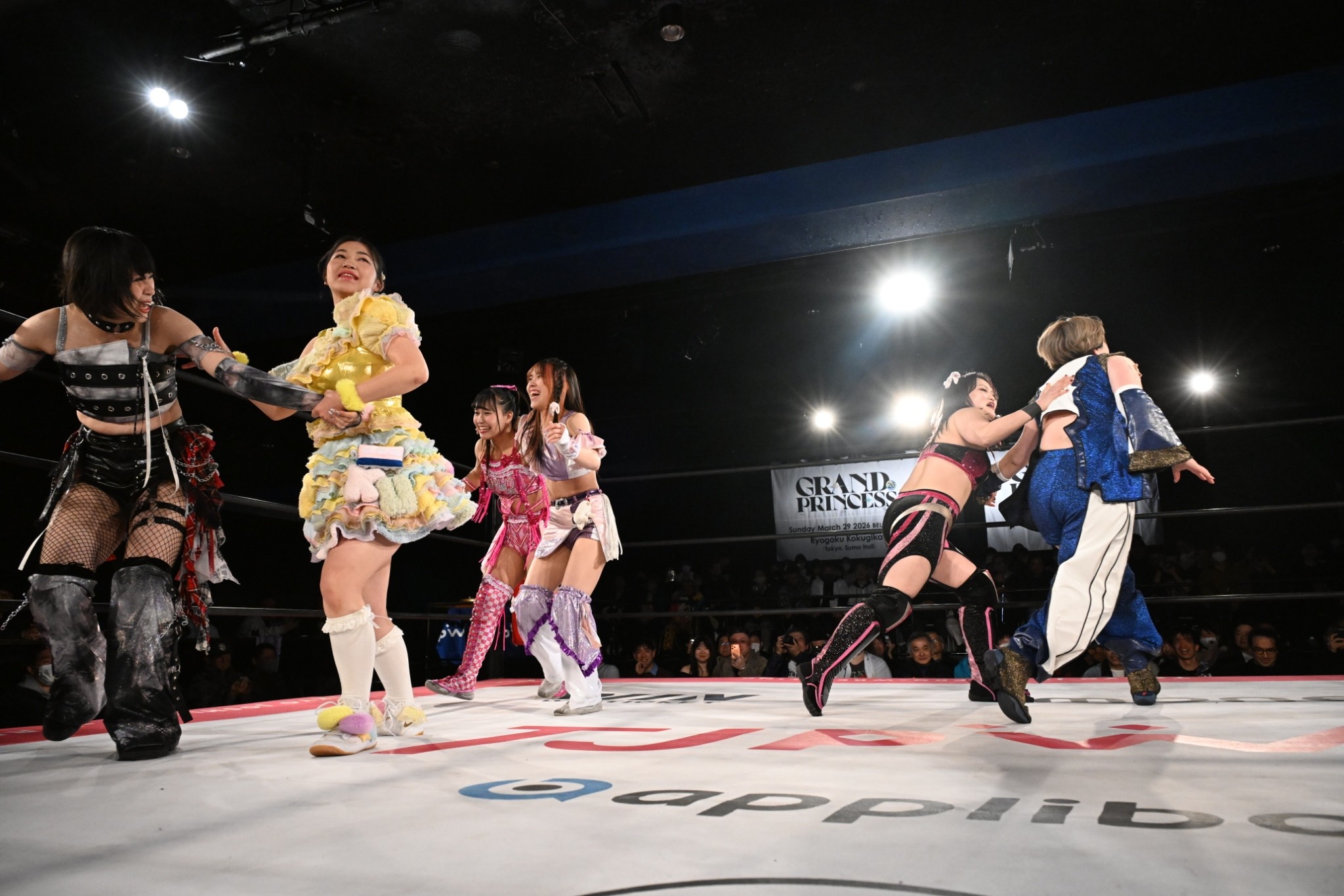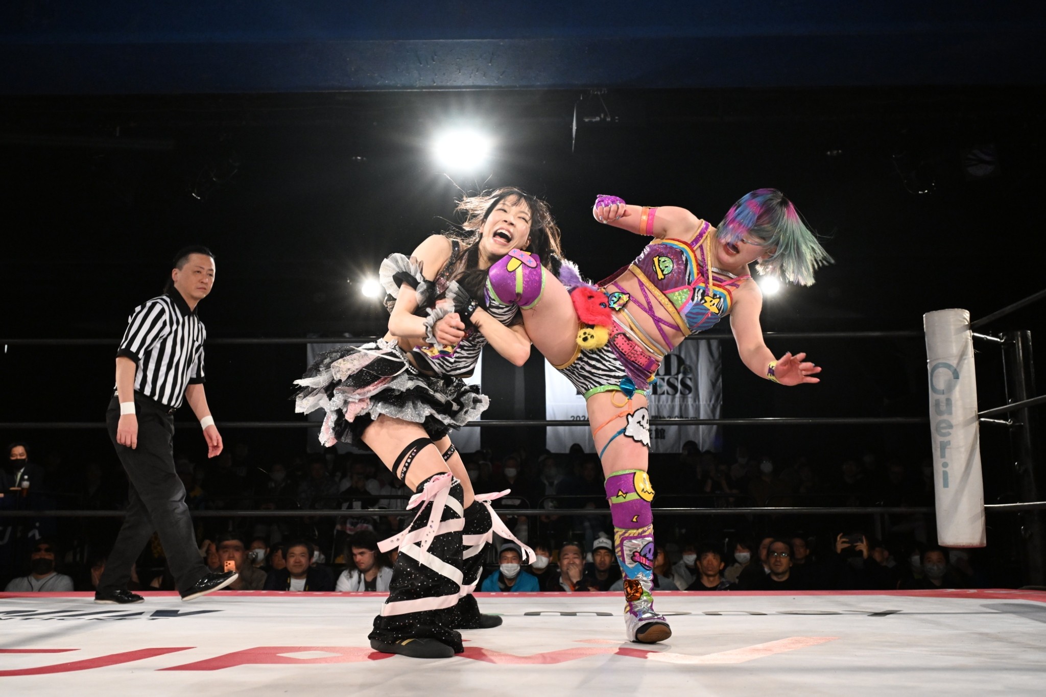 瑞希組が「お願いします!」と手を差し出すとまともに握手が成立。さらにでじもんが奇襲を制止してゴングが鳴ると、瑞希組が連係。汐珠をハンマースルーで投げつけるが、瑞希のエルボーは誤爆。でじもんがスピードで撹乱すると、場外エスケープした瑞希が「来いよ」と挑発。追いかけたでじもんだったが、入れ替わるように瑞希組がリングイン。「来いよ」との挑発にでじもんがダブルのドロップキックで共演。ローンバトルから逃れた汐珠が瑞希とスイッチ。セカンドロープすり抜け式ドロップキック、コーナーからクロスボディーを決めていくが、カウント2。5分経過。有栖が鶴ヶ城で反撃して鈴芽にかわると、エプロンで鈴芽が捕獲して有栖がドロップキックの連係を披露。瑞希から汐珠にかわるとコーナー反転式ミサイルキックに、鈴芽はグラウンドでのハチノス・エイトノットで応戦。エスケープした汐珠へのミカヅキ流星群は自爆になるが、コーナー反転式ミサイルキックを追走してフェースクラッシャーを浴びせていく。リング・ア・ベルは鈴芽が抵抗して瑞希にスイッチ。セカンドロープすり抜け式ドロップキックを鈴芽が避けると有栖がエプロンから鶴ヶ城。鈴芽がミカヅキ流星群で追撃。有栖にスイッチすると、フライング・ボディープレスもカウント2。キャメルクラッチは抜けた瑞希がクロスフェース。10分経過。什の掟はクロスフェースで切り返されるも、回転してフォールして脱した有栖はネックブリーカードロップを放つ。瑞希のキューティースペシャルは割って入った鈴芽がセカンドロープ反転式ドロップキックでカットし、でじもんが水車落としと熨斗紙で共演。続く連係をかわした瑞希が鈴芽をフットスタンプで排除すると、有栖のスーパーキックを捕獲して汐珠を呼び込む。汐珠のコルバタに瑞希が投げっぱなしキューティースペシャルで続き、最後は正調の一発を放って勝利した。試合後の瑞希組は2人でハイタッチ。
