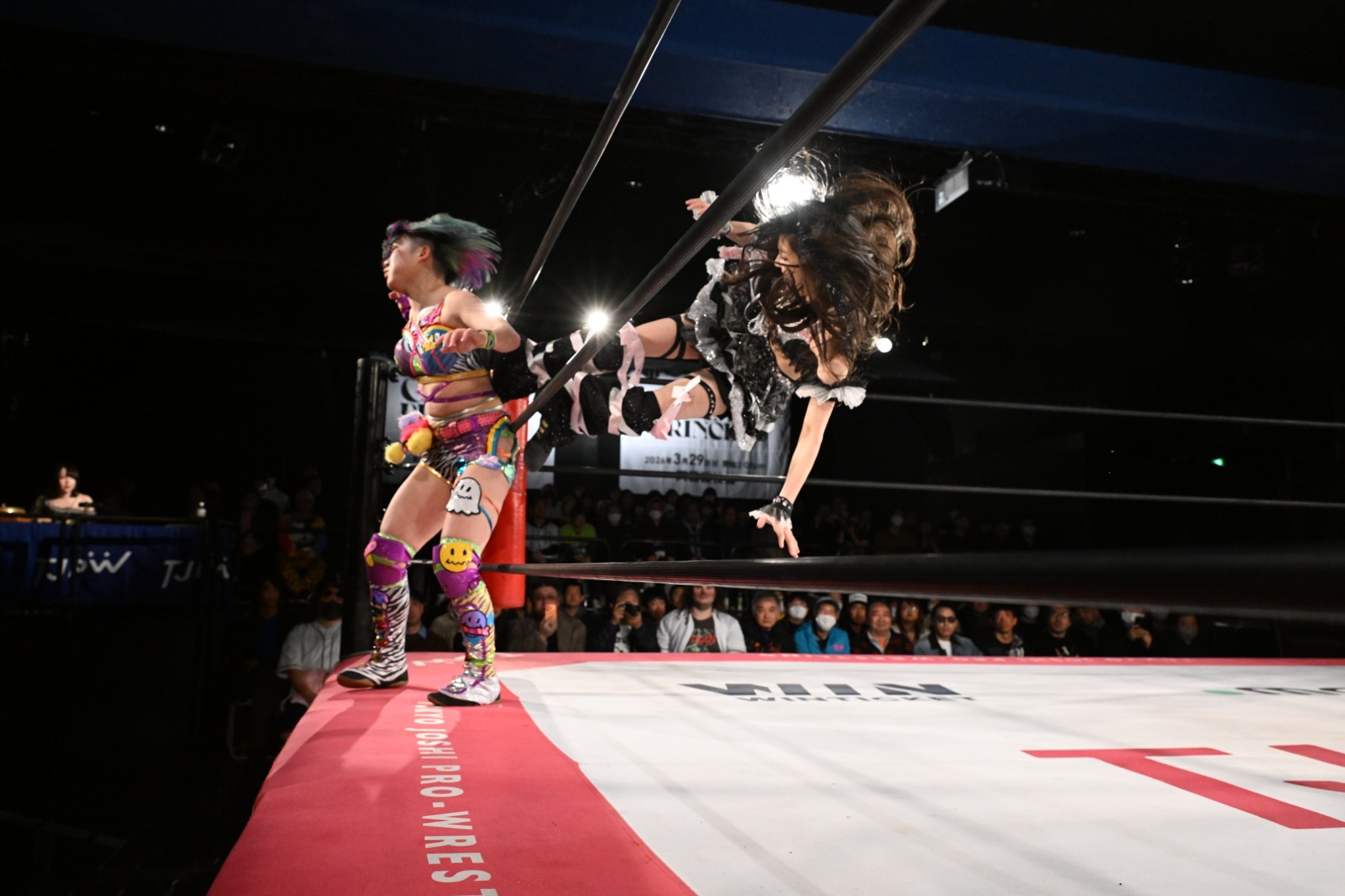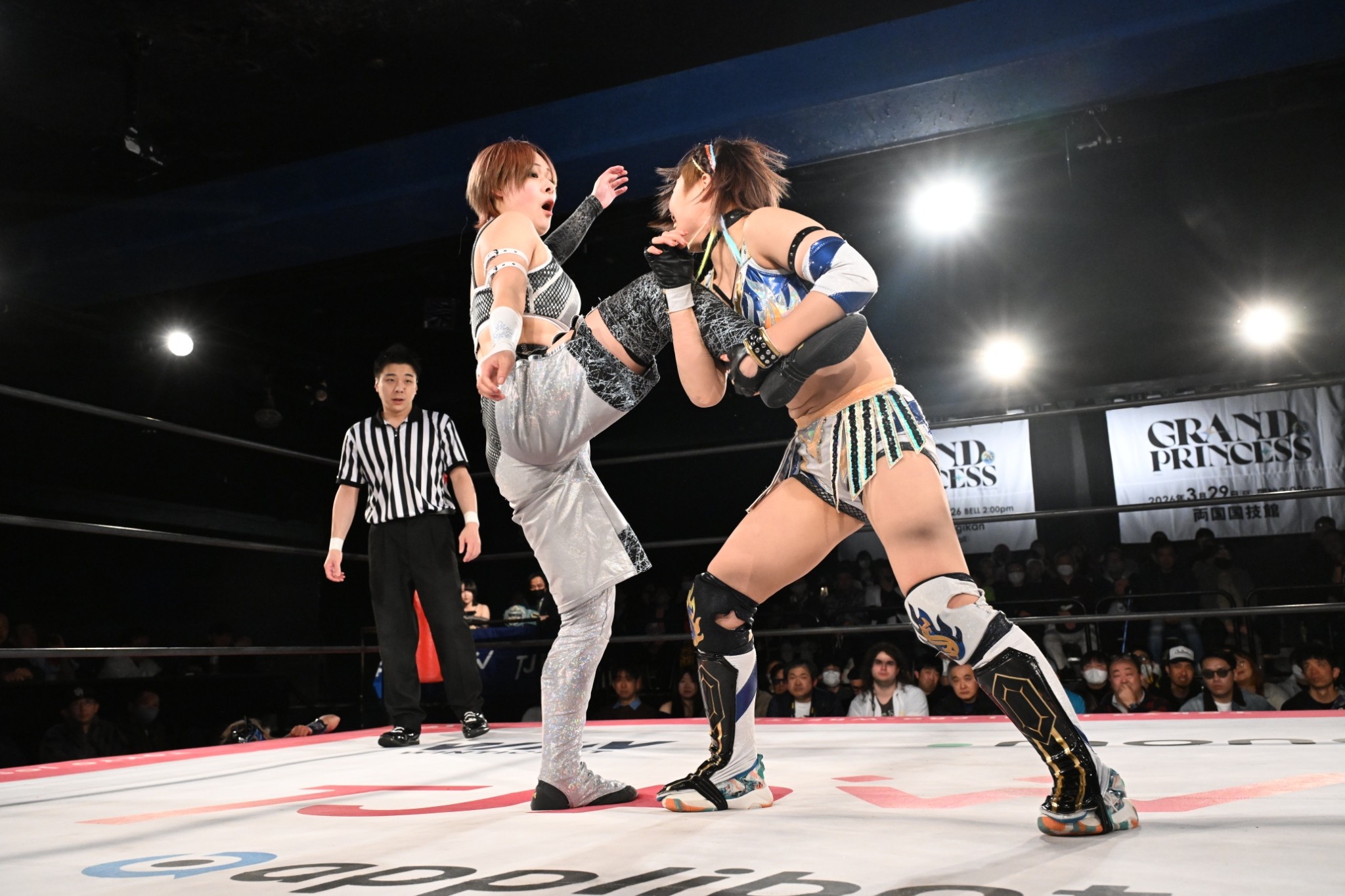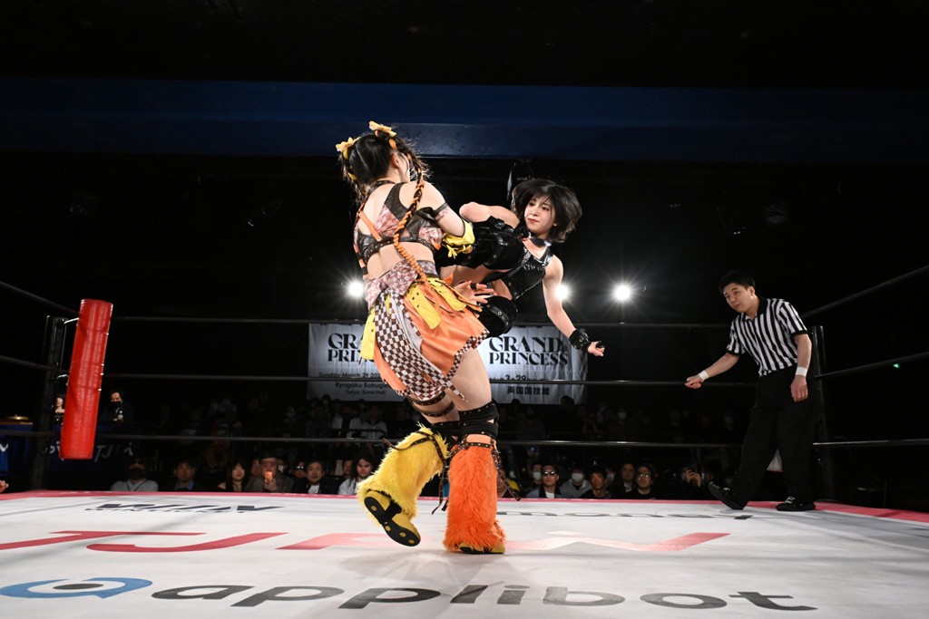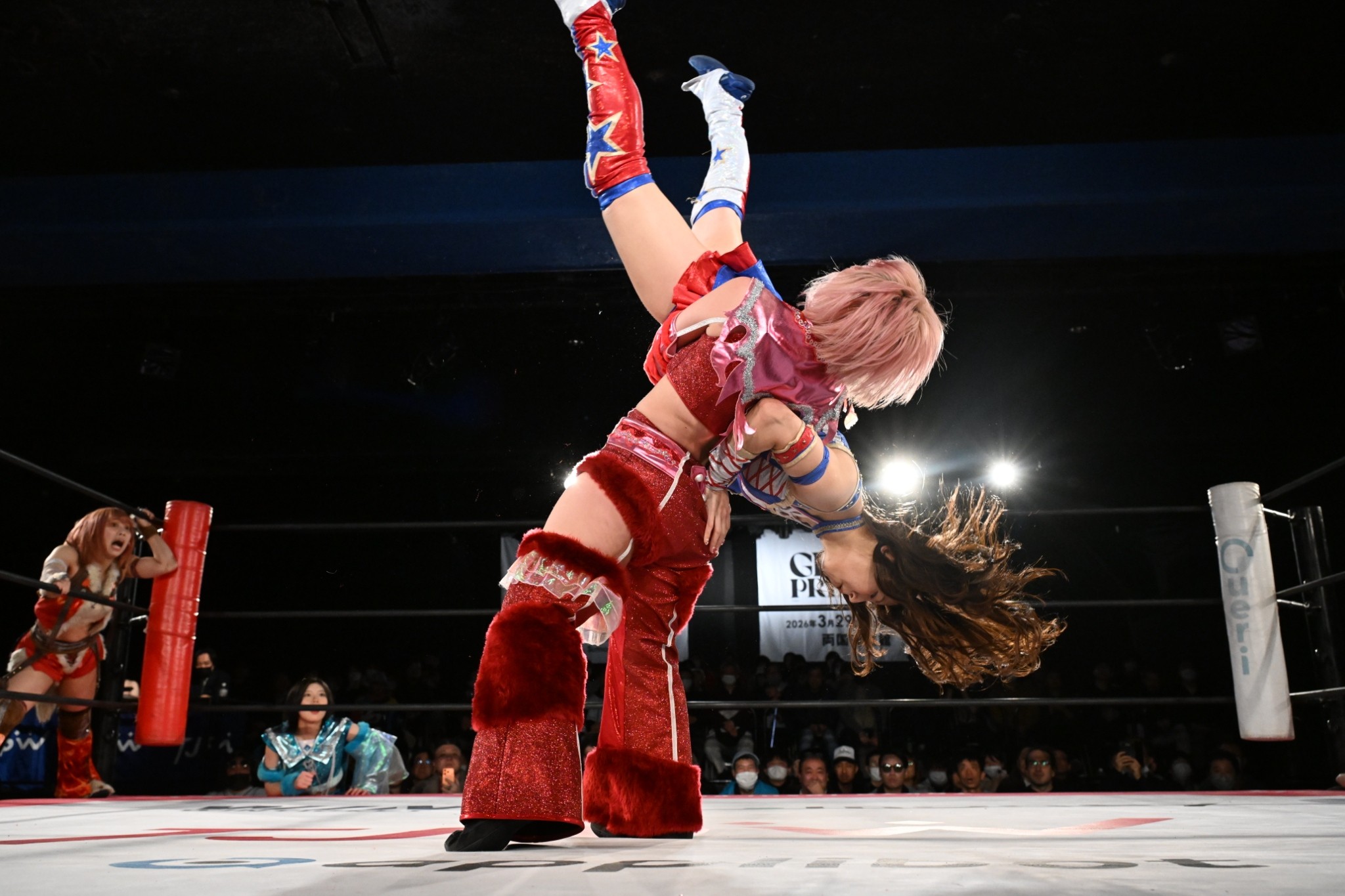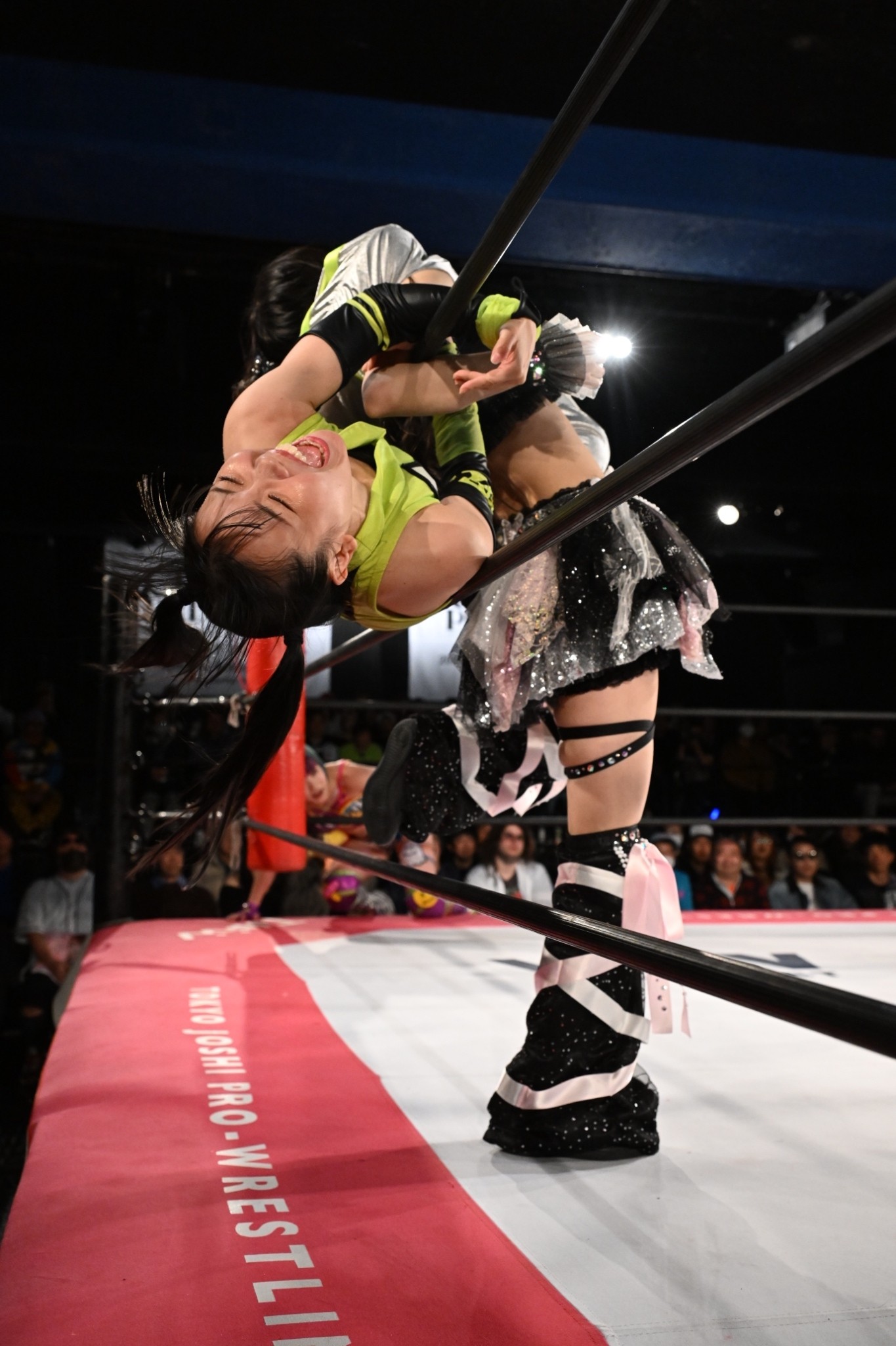 瑞希組が「お願いします!」と手を差し出すとまともに握手が成立。さらにでじもんが奇襲を制止してゴングが鳴ると、瑞希組が連係。汐珠をハンマースルーで投げつけるが、瑞希のエルボーは誤爆。でじもんがスピードで撹乱すると、場外エスケープした瑞希が「来いよ」と挑発。追いかけたでじもんだったが、入れ替わるように瑞希組がリングイン。「来いよ」との挑発にでじもんがダブルのドロップキックで共演。ローンバトルから逃れた汐珠が瑞希とスイッチ。セカンドロープすり抜け式ドロップキック、コーナーからクロスボディーを決めていくが、カウント2。5分経過。有栖が鶴ヶ城で反撃して鈴芽にかわると、エプロンで鈴芽が捕獲して有栖がドロップキックの連係を披露。瑞希から汐珠にかわるとコーナー反転式ミサイルキックに、鈴芽はグラウンドでのハチノス・エイトノットで応戦。エスケープした汐珠へのミカヅキ流星群は自爆になるが、コーナー反転式ミサイルキックを追走してフェースクラッシャーを浴びせていく。リング・ア・ベルは鈴芽が抵抗して瑞希にスイッチ。セカンドロープすり抜け式ドロップキックを鈴芽が避けると有栖がエプロンから鶴ヶ城。鈴芽がミカヅキ流星群で追撃。有栖にスイッチすると、フライング・ボディープレスもカウント2。キャメルクラッチは抜けた瑞希がクロスフェース。10分経過。什の掟はクロスフェースで切り返されるも、回転してフォールして脱した有栖はネックブリーカードロップを放つ。瑞希のキューティースペシャルは割って入った鈴芽がセカンドロープ反転式ドロップキックでカットし、でじもんが水車落としと熨斗紙で共演。続く連係をかわした瑞希が鈴芽をフットスタンプで排除すると、有栖のスーパーキックを捕獲して汐珠を呼び込む。汐珠のコルバタに瑞希が投げっぱなしキューティースペシャルで続き、最後は正調の一発を放って勝利した。試合後の瑞希組は2人でハイタッチ。