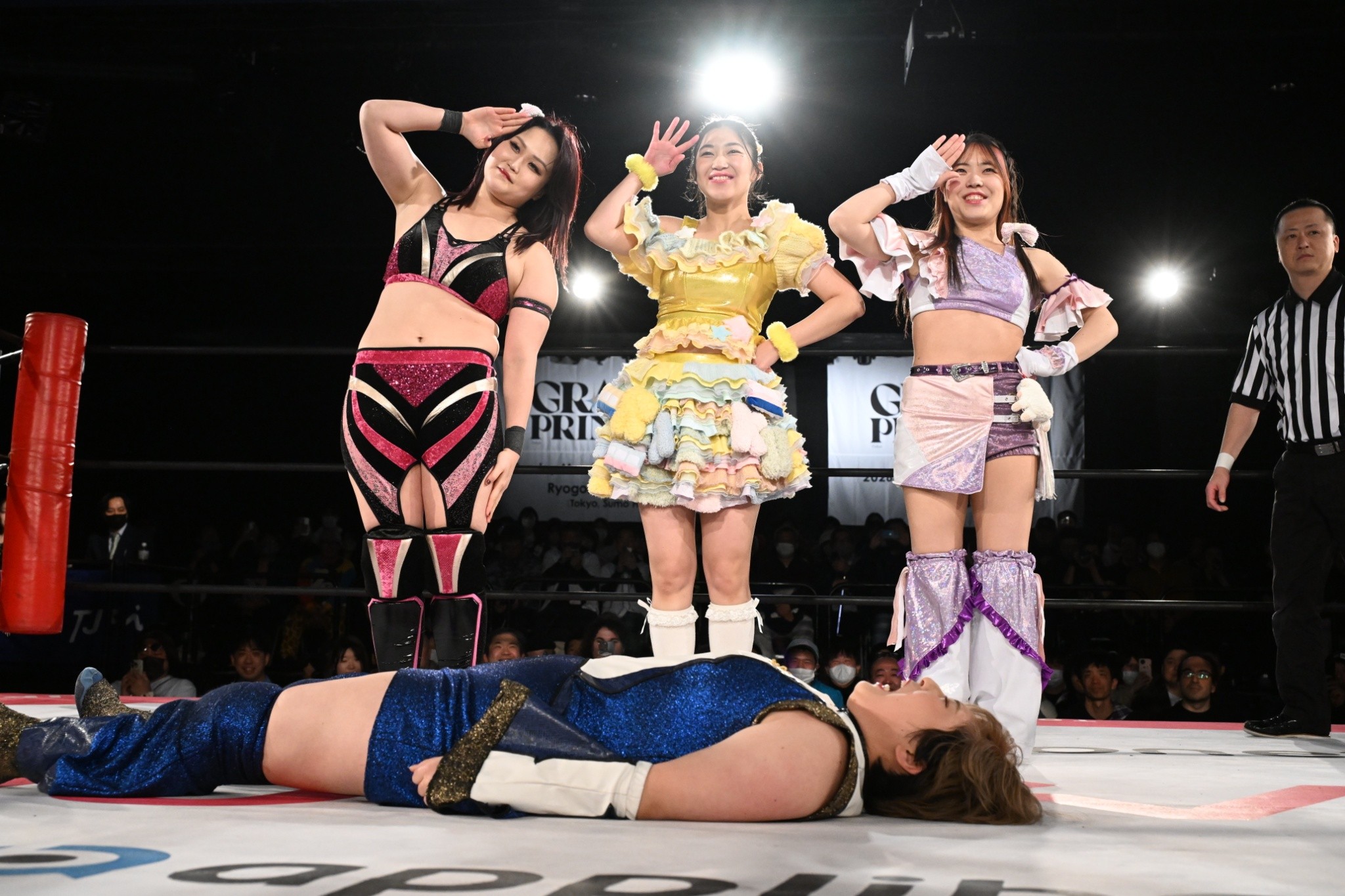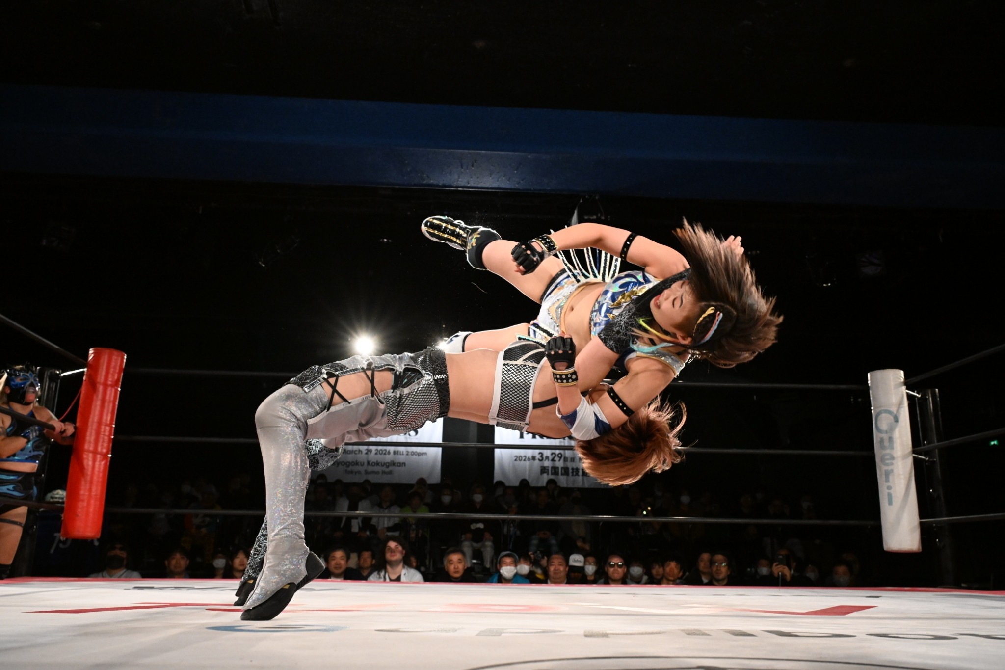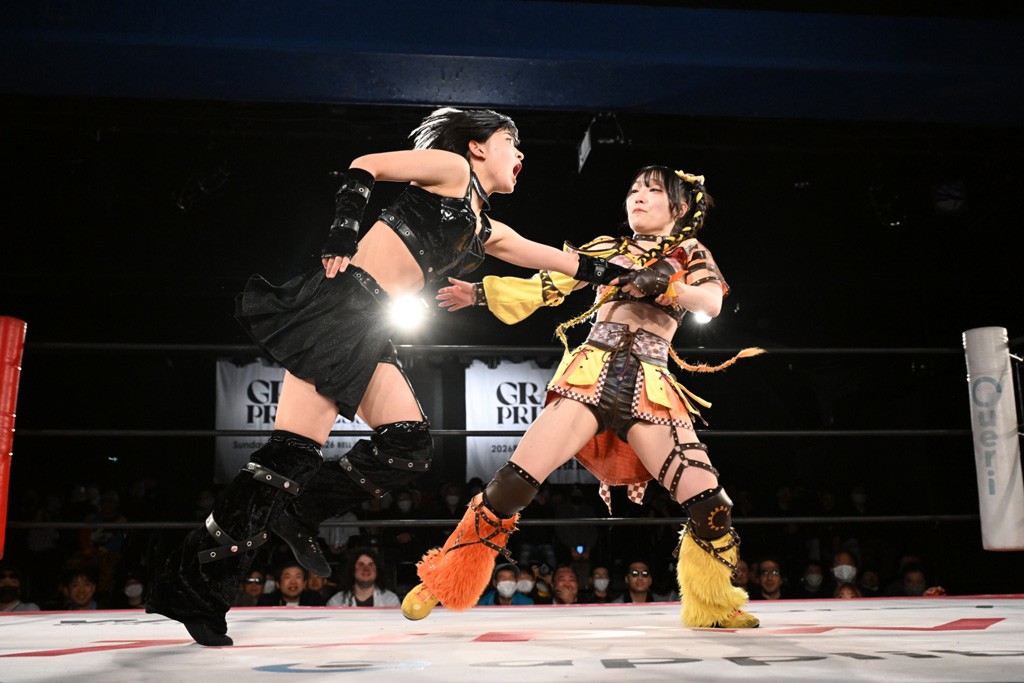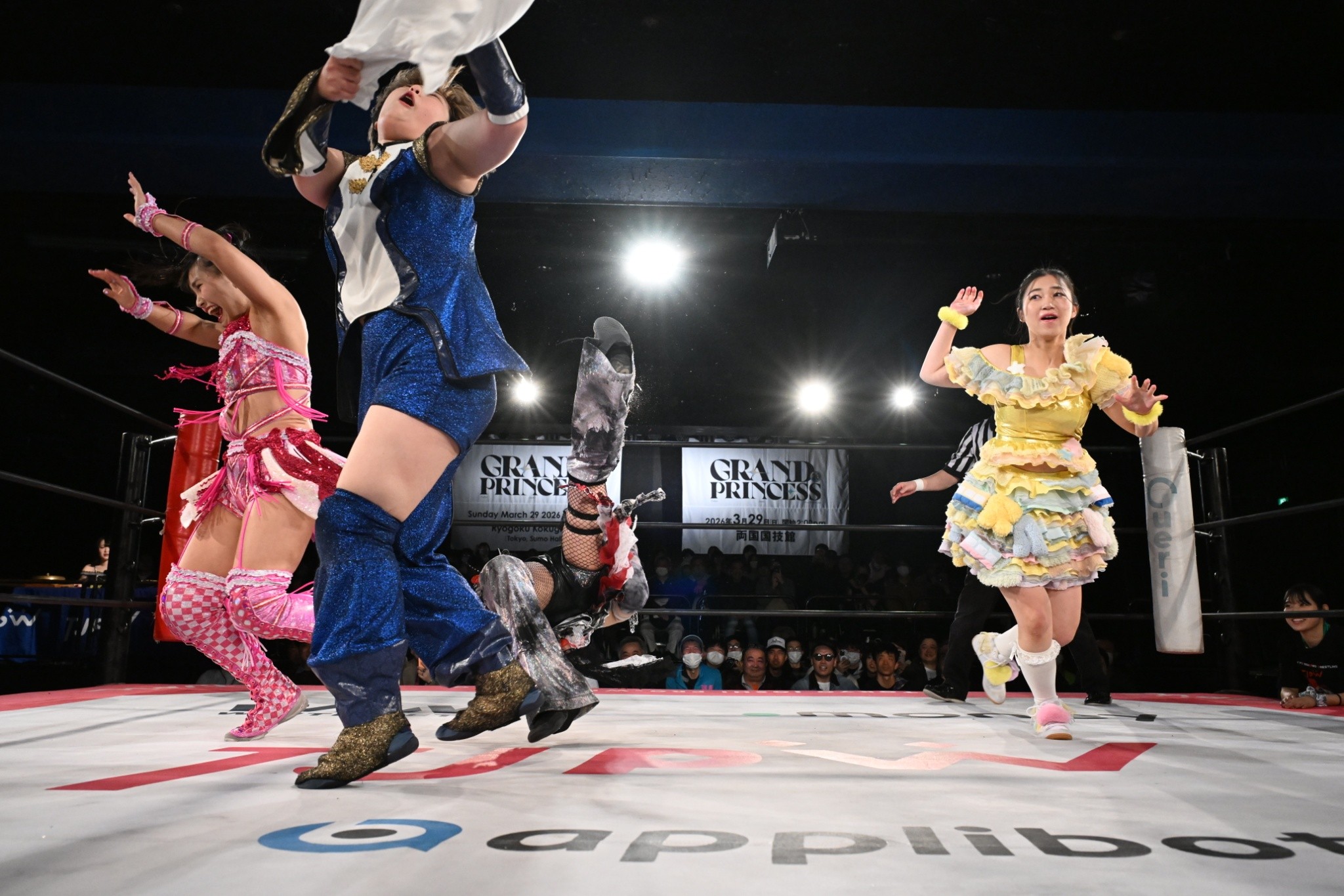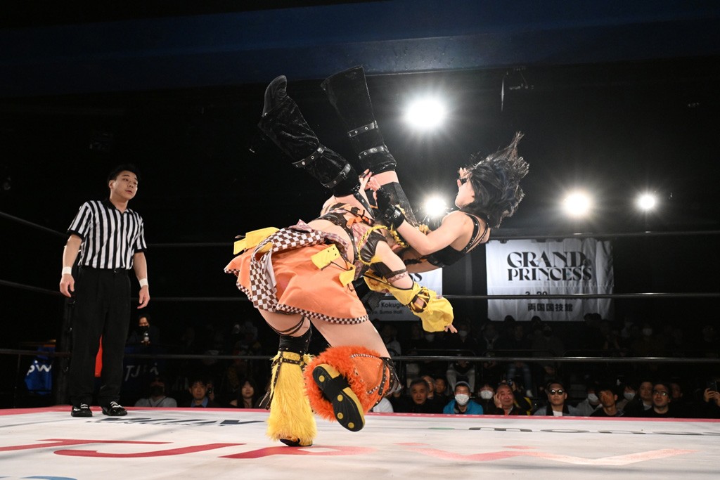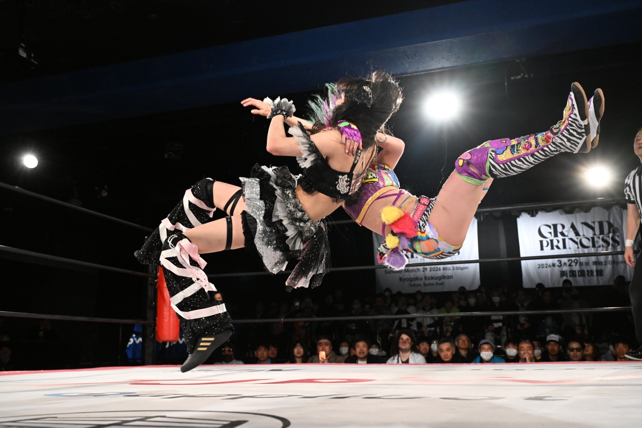 瑞希組が「お願いします!」と手を差し出すとまともに握手が成立。さらにでじもんが奇襲を制止してゴングが鳴ると、瑞希組が連係。汐珠をハンマースルーで投げつけるが、瑞希のエルボーは誤爆。でじもんがスピードで撹乱すると、場外エスケープした瑞希が「来いよ」と挑発。追いかけたでじもんだったが、入れ替わるように瑞希組がリングイン。「来いよ」との挑発にでじもんがダブルのドロップキックで共演。ローンバトルから逃れた汐珠が瑞希とスイッチ。セカンドロープすり抜け式ドロップキック、コーナーからクロスボディーを決めていくが、カウント2。5分経過。有栖が鶴ヶ城で反撃して鈴芽にかわると、エプロンで鈴芽が捕獲して有栖がドロップキックの連係を披露。瑞希から汐珠にかわるとコーナー反転式ミサイルキックに、鈴芽はグラウンドでのハチノス・エイトノットで応戦。エスケープした汐珠へのミカヅキ流星群は自爆になるが、コーナー反転式ミサイルキックを追走してフェースクラッシャーを浴びせていく。リング・ア・ベルは鈴芽が抵抗して瑞希にスイッチ。セカンドロープすり抜け式ドロップキックを鈴芽が避けると有栖がエプロンから鶴ヶ城。鈴芽がミカヅキ流星群で追撃。有栖にスイッチすると、フライング・ボディープレスもカウント2。キャメルクラッチは抜けた瑞希がクロスフェース。10分経過。什の掟はクロスフェースで切り返されるも、回転してフォールして脱した有栖はネックブリーカードロップを放つ。瑞希のキューティースペシャルは割って入った鈴芽がセカンドロープ反転式ドロップキックでカットし、でじもんが水車落としと熨斗紙で共演。続く連係をかわした瑞希が鈴芽をフットスタンプで排除すると、有栖のスーパーキックを捕獲して汐珠を呼び込む。汐珠のコルバタに瑞希が投げっぱなしキューティースペシャルで続き、最後は正調の一発を放って勝利した。試合後の瑞希組は2人でハイタッチ。