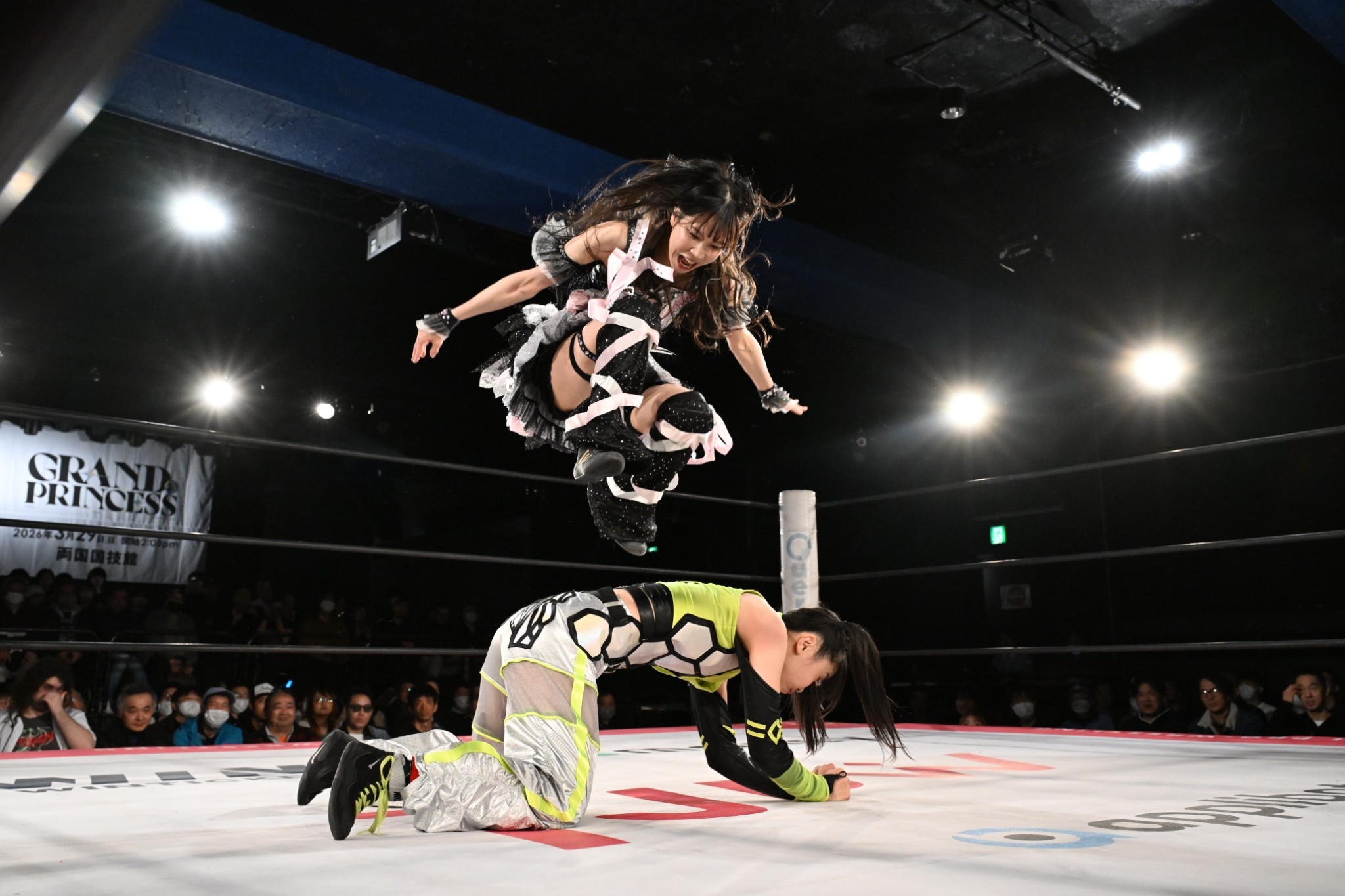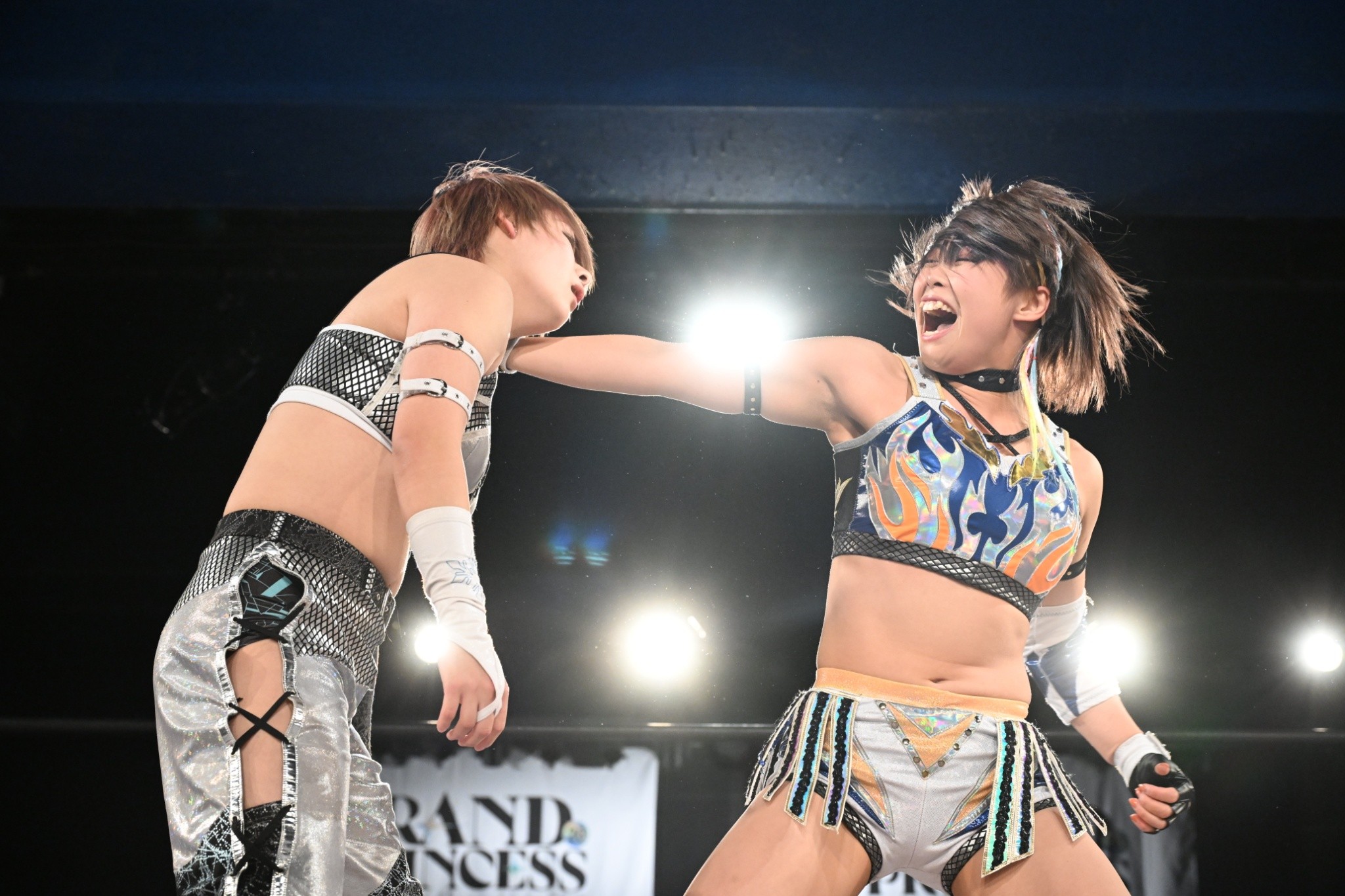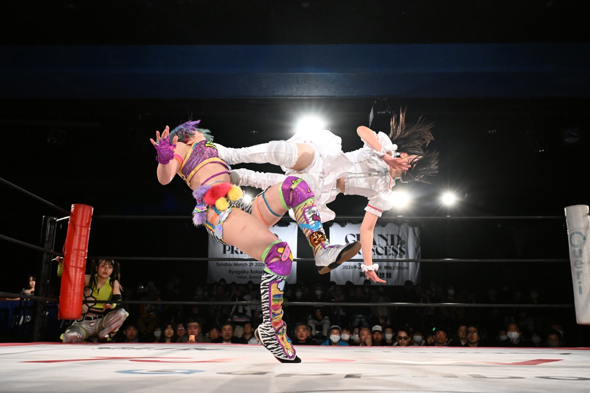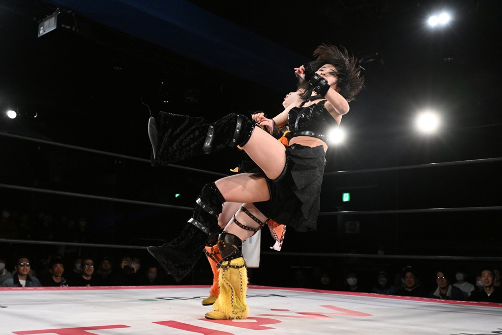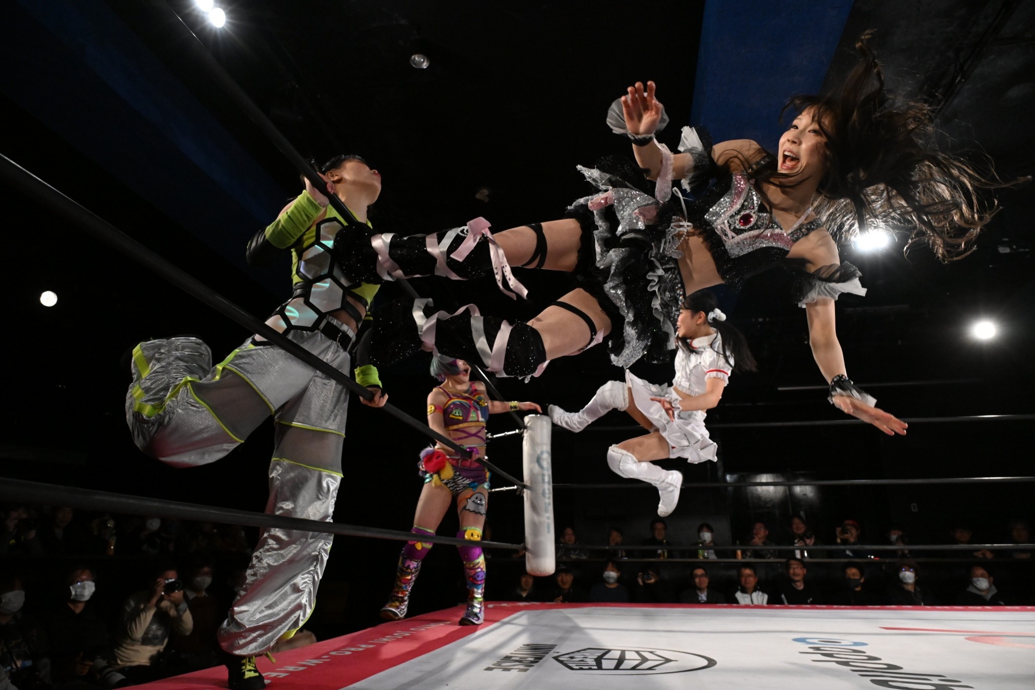 瑞希組が「お願いします!」と手を差し出すとまともに握手が成立。さらにでじもんが奇襲を制止してゴングが鳴ると、瑞希組が連係。汐珠をハンマースルーで投げつけるが、瑞希のエルボーは誤爆。でじもんがスピードで撹乱すると、場外エスケープした瑞希が「来いよ」と挑発。追いかけたでじもんだったが、入れ替わるように瑞希組がリングイン。「来いよ」との挑発にでじもんがダブルのドロップキックで共演。ローンバトルから逃れた汐珠が瑞希とスイッチ。セカンドロープすり抜け式ドロップキック、コーナーからクロスボディーを決めていくが、カウント2。5分経過。有栖が鶴ヶ城で反撃して鈴芽にかわると、エプロンで鈴芽が捕獲して有栖がドロップキックの連係を披露。瑞希から汐珠にかわるとコーナー反転式ミサイルキックに、鈴芽はグラウンドでのハチノス・エイトノットで応戦。エスケープした汐珠へのミカヅキ流星群は自爆になるが、コーナー反転式ミサイルキックを追走してフェースクラッシャーを浴びせていく。リング・ア・ベルは鈴芽が抵抗して瑞希にスイッチ。セカンドロープすり抜け式ドロップキックを鈴芽が避けると有栖がエプロンから鶴ヶ城。鈴芽がミカヅキ流星群で追撃。有栖にスイッチすると、フライング・ボディープレスもカウント2。キャメルクラッチは抜けた瑞希がクロスフェース。10分経過。什の掟はクロスフェースで切り返されるも、回転してフォールして脱した有栖はネックブリーカードロップを放つ。瑞希のキューティースペシャルは割って入った鈴芽がセカンドロープ反転式ドロップキックでカットし、でじもんが水車落としと熨斗紙で共演。続く連係をかわした瑞希が鈴芽をフットスタンプで排除すると、有栖のスーパーキックを捕獲して汐珠を呼び込む。汐珠のコルバタに瑞希が投げっぱなしキューティースペシャルで続き、最後は正調の一発を放って勝利した。試合後の瑞希組は2人でハイタッチ。