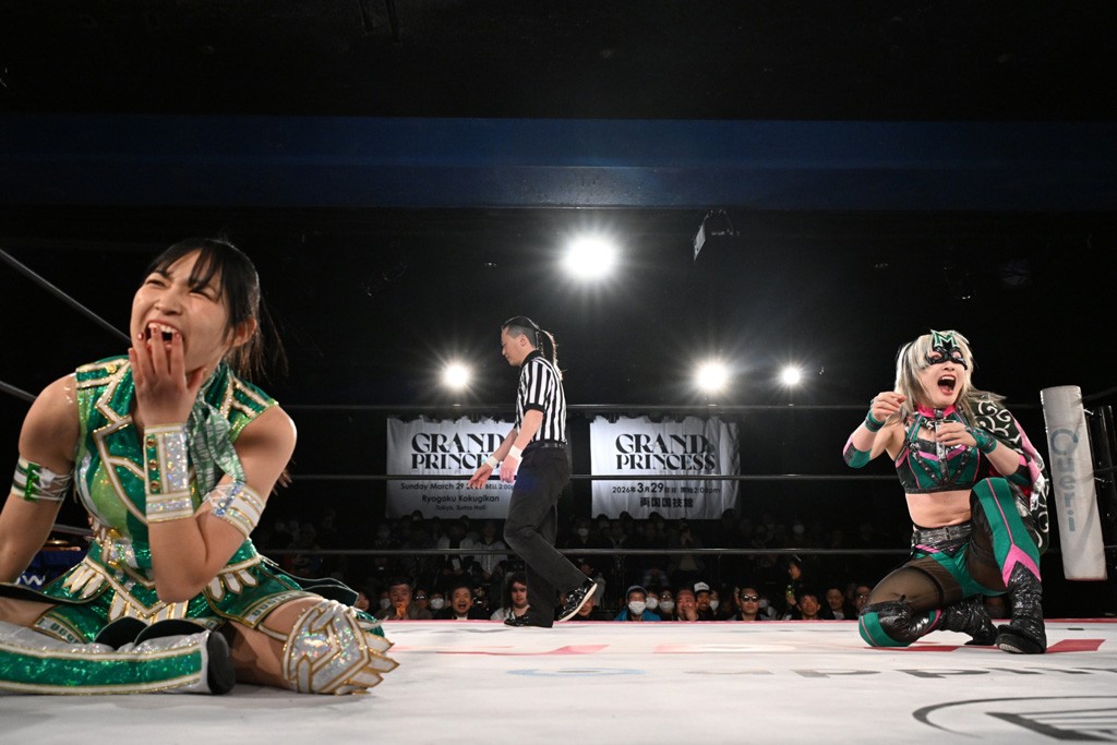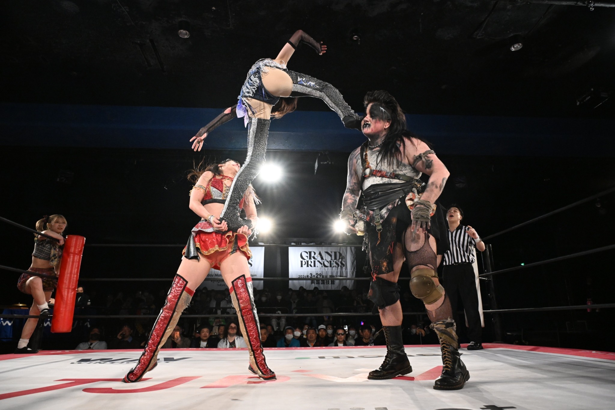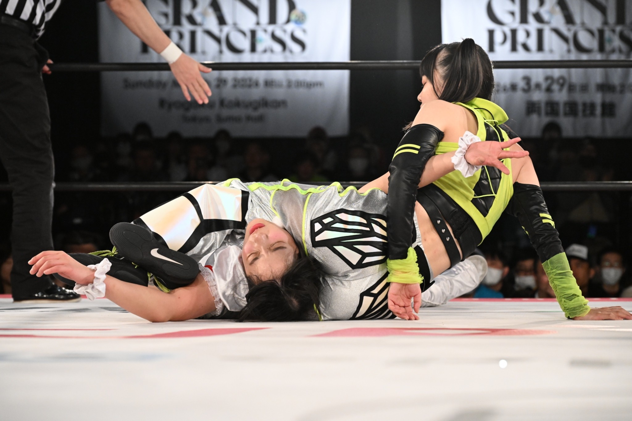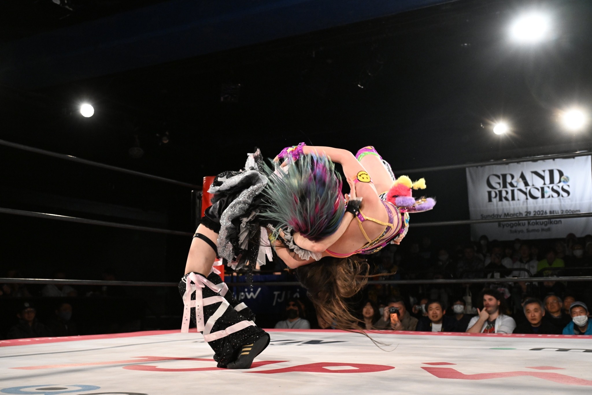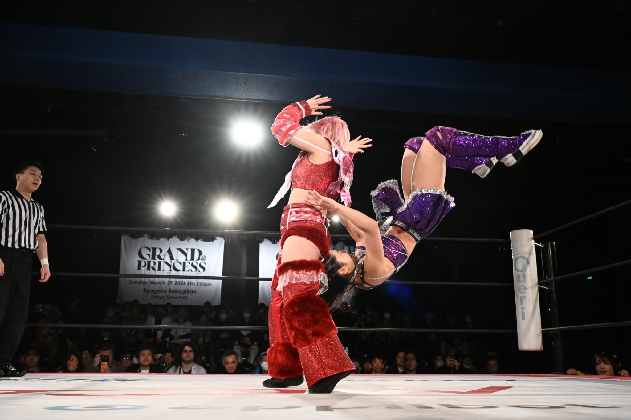 瑞希組が「お願いします!」と手を差し出すとまともに握手が成立。さらにでじもんが奇襲を制止してゴングが鳴ると、瑞希組が連係。汐珠をハンマースルーで投げつけるが、瑞希のエルボーは誤爆。でじもんがスピードで撹乱すると、場外エスケープした瑞希が「来いよ」と挑発。追いかけたでじもんだったが、入れ替わるように瑞希組がリングイン。「来いよ」との挑発にでじもんがダブルのドロップキックで共演。ローンバトルから逃れた汐珠が瑞希とスイッチ。セカンドロープすり抜け式ドロップキック、コーナーからクロスボディーを決めていくが、カウント2。5分経過。有栖が鶴ヶ城で反撃して鈴芽にかわると、エプロンで鈴芽が捕獲して有栖がドロップキックの連係を披露。瑞希から汐珠にかわるとコーナー反転式ミサイルキックに、鈴芽はグラウンドでのハチノス・エイトノットで応戦。エスケープした汐珠へのミカヅキ流星群は自爆になるが、コーナー反転式ミサイルキックを追走してフェースクラッシャーを浴びせていく。リング・ア・ベルは鈴芽が抵抗して瑞希にスイッチ。セカンドロープすり抜け式ドロップキックを鈴芽が避けると有栖がエプロンから鶴ヶ城。鈴芽がミカヅキ流星群で追撃。有栖にスイッチすると、フライング・ボディープレスもカウント2。キャメルクラッチは抜けた瑞希がクロスフェース。10分経過。什の掟はクロスフェースで切り返されるも、回転してフォールして脱した有栖はネックブリーカードロップを放つ。瑞希のキューティースペシャルは割って入った鈴芽がセカンドロープ反転式ドロップキックでカットし、でじもんが水車落としと熨斗紙で共演。続く連係をかわした瑞希が鈴芽をフットスタンプで排除すると、有栖のスーパーキックを捕獲して汐珠を呼び込む。汐珠のコルバタに瑞希が投げっぱなしキューティースペシャルで続き、最後は正調の一発を放って勝利した。試合後の瑞希組は2人でハイタッチ。