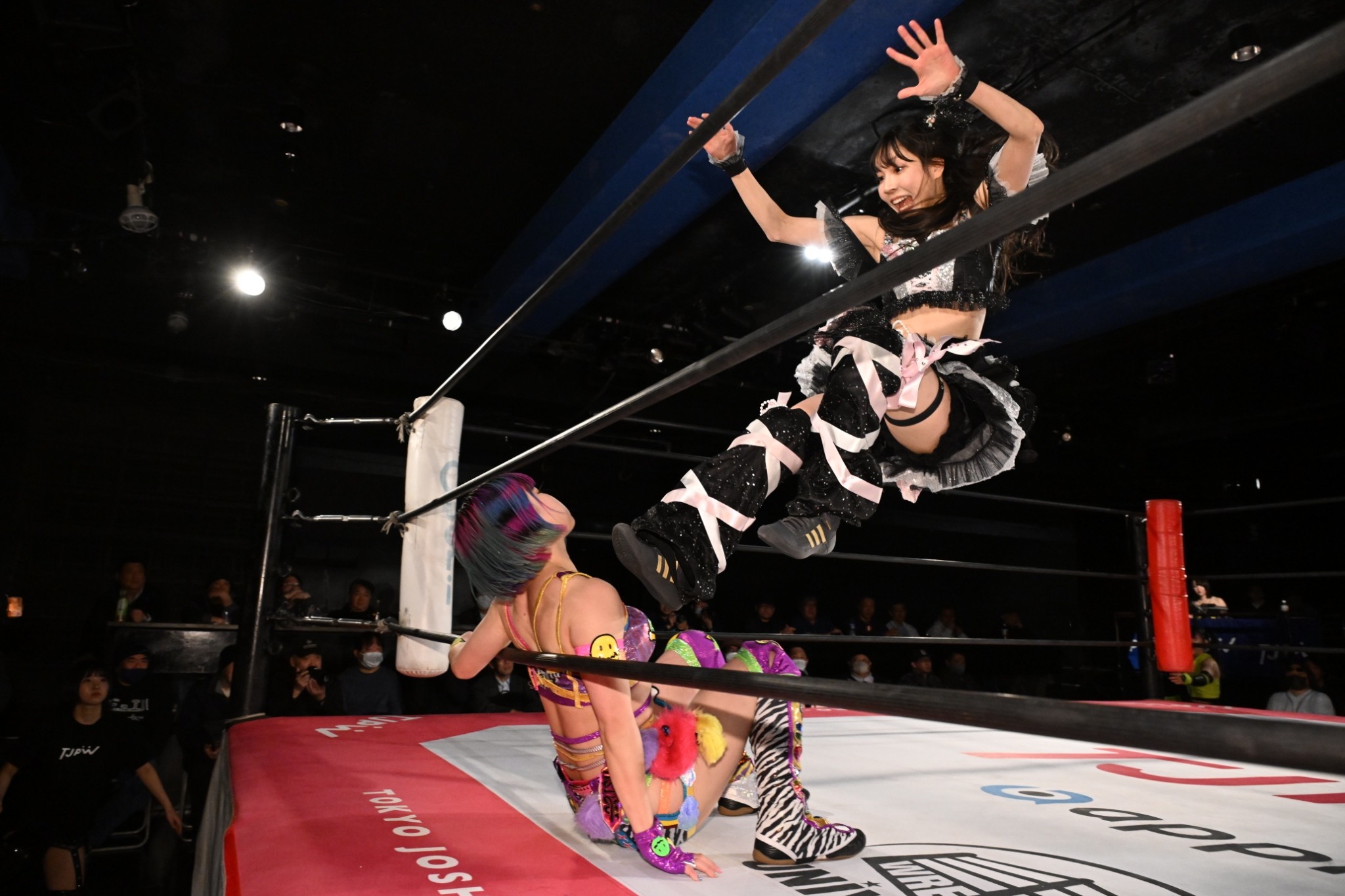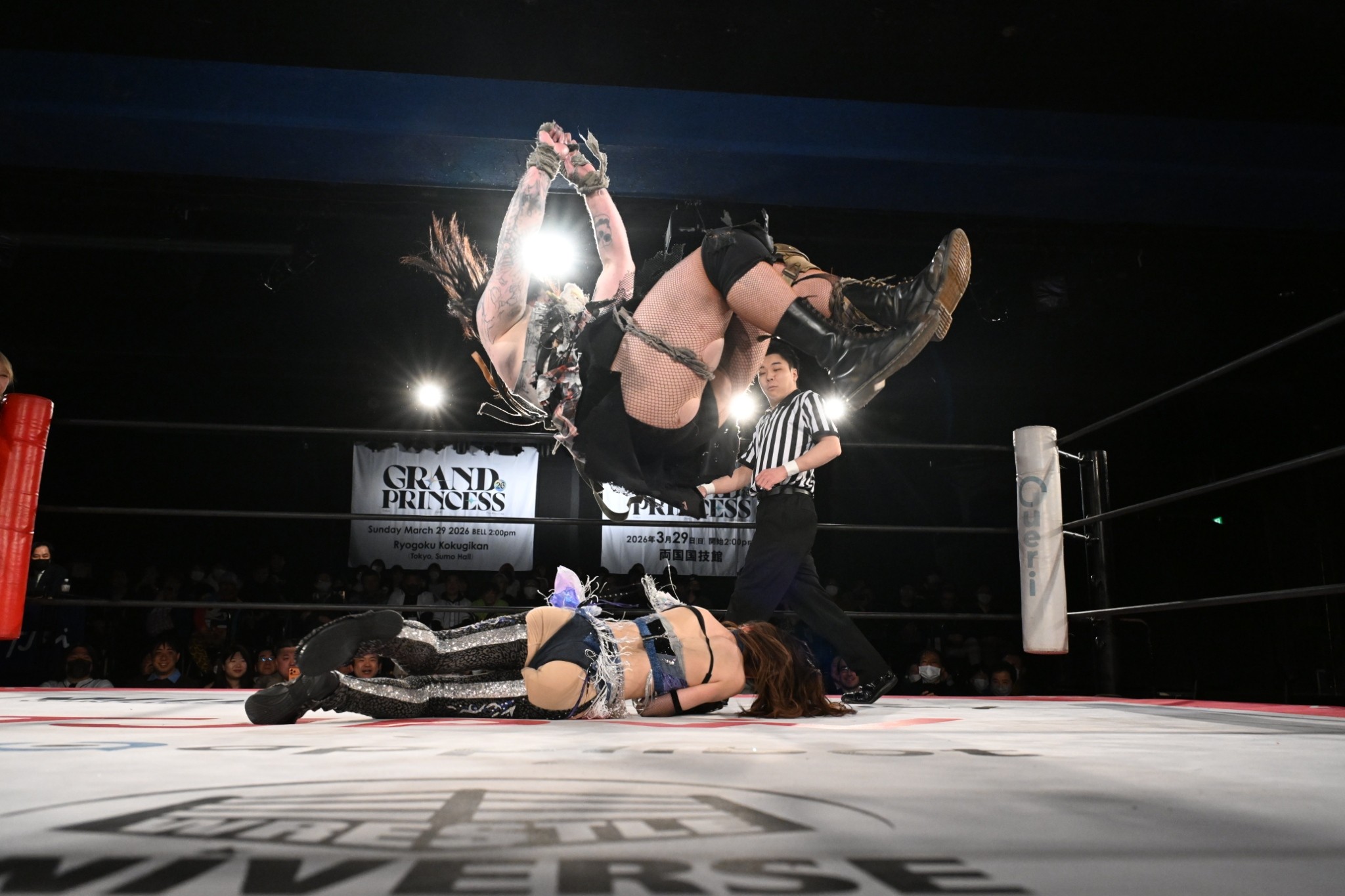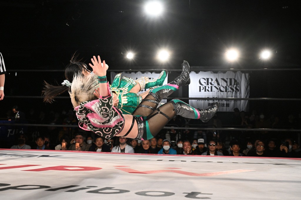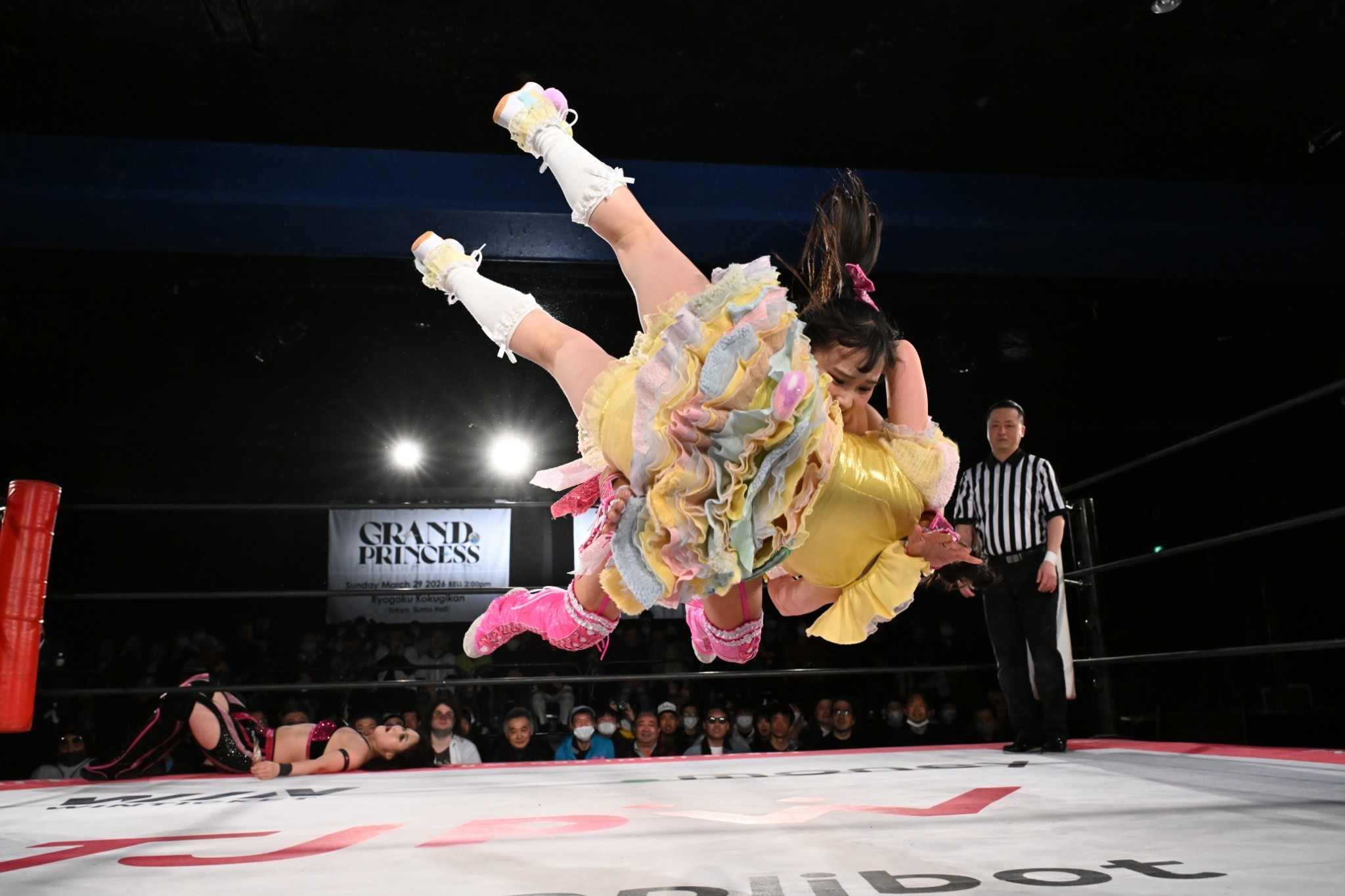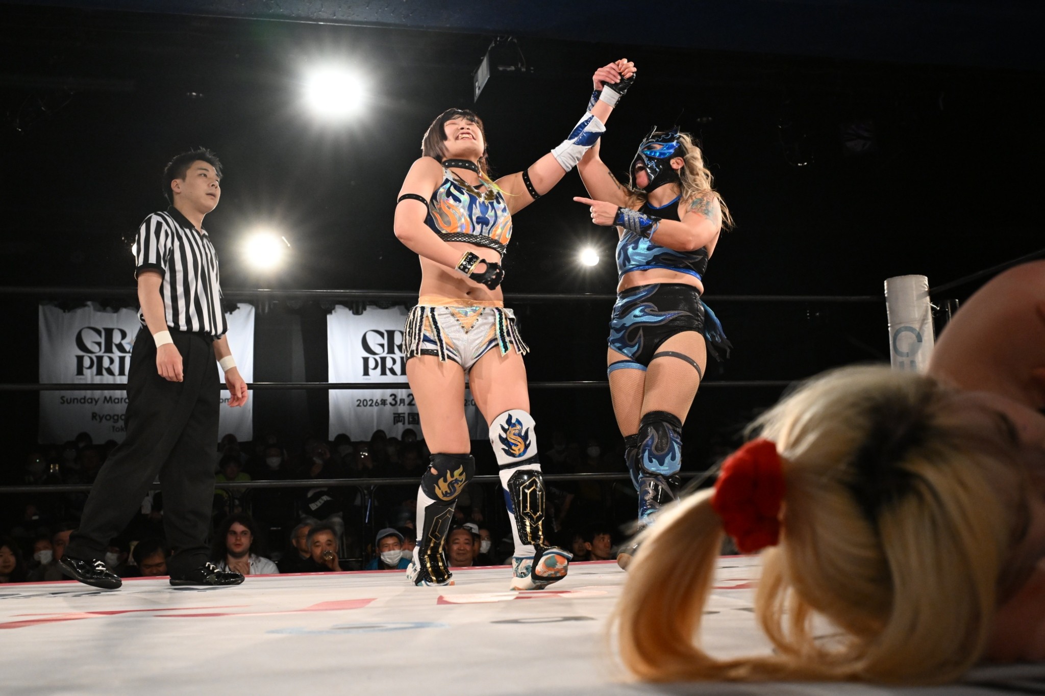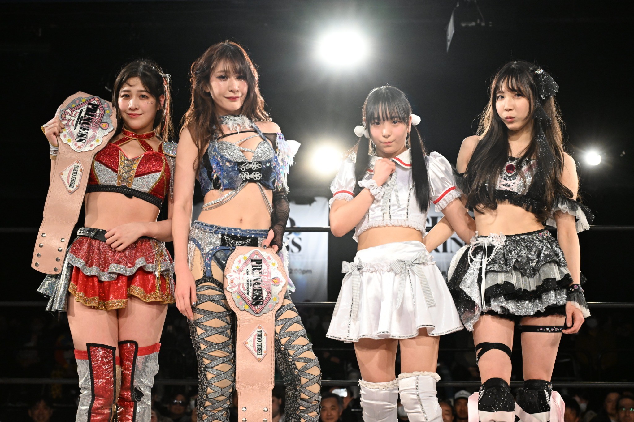 瑞希組が「お願いします!」と手を差し出すとまともに握手が成立。さらにでじもんが奇襲を制止してゴングが鳴ると、瑞希組が連係。汐珠をハンマースルーで投げつけるが、瑞希のエルボーは誤爆。でじもんがスピードで撹乱すると、場外エスケープした瑞希が「来いよ」と挑発。追いかけたでじもんだったが、入れ替わるように瑞希組がリングイン。「来いよ」との挑発にでじもんがダブルのドロップキックで共演。ローンバトルから逃れた汐珠が瑞希とスイッチ。セカンドロープすり抜け式ドロップキック、コーナーからクロスボディーを決めていくが、カウント2。5分経過。有栖が鶴ヶ城で反撃して鈴芽にかわると、エプロンで鈴芽が捕獲して有栖がドロップキックの連係を披露。瑞希から汐珠にかわるとコーナー反転式ミサイルキックに、鈴芽はグラウンドでのハチノス・エイトノットで応戦。エスケープした汐珠へのミカヅキ流星群は自爆になるが、コーナー反転式ミサイルキックを追走してフェースクラッシャーを浴びせていく。リング・ア・ベルは鈴芽が抵抗して瑞希にスイッチ。セカンドロープすり抜け式ドロップキックを鈴芽が避けると有栖がエプロンから鶴ヶ城。鈴芽がミカヅキ流星群で追撃。有栖にスイッチすると、フライング・ボディープレスもカウント2。キャメルクラッチは抜けた瑞希がクロスフェース。10分経過。什の掟はクロスフェースで切り返されるも、回転してフォールして脱した有栖はネックブリーカードロップを放つ。瑞希のキューティースペシャルは割って入った鈴芽がセカンドロープ反転式ドロップキックでカットし、でじもんが水車落としと熨斗紙で共演。続く連係をかわした瑞希が鈴芽をフットスタンプで排除すると、有栖のスーパーキックを捕獲して汐珠を呼び込む。汐珠のコルバタに瑞希が投げっぱなしキューティースペシャルで続き、最後は正調の一発を放って勝利した。試合後の瑞希組は2人でハイタッチ。