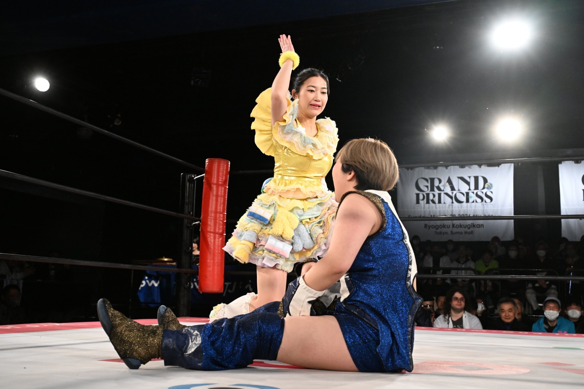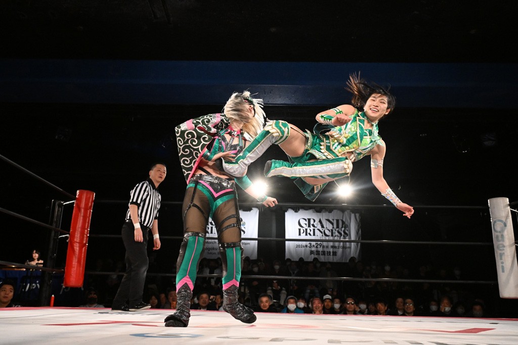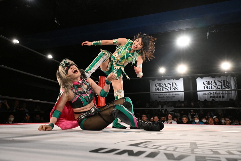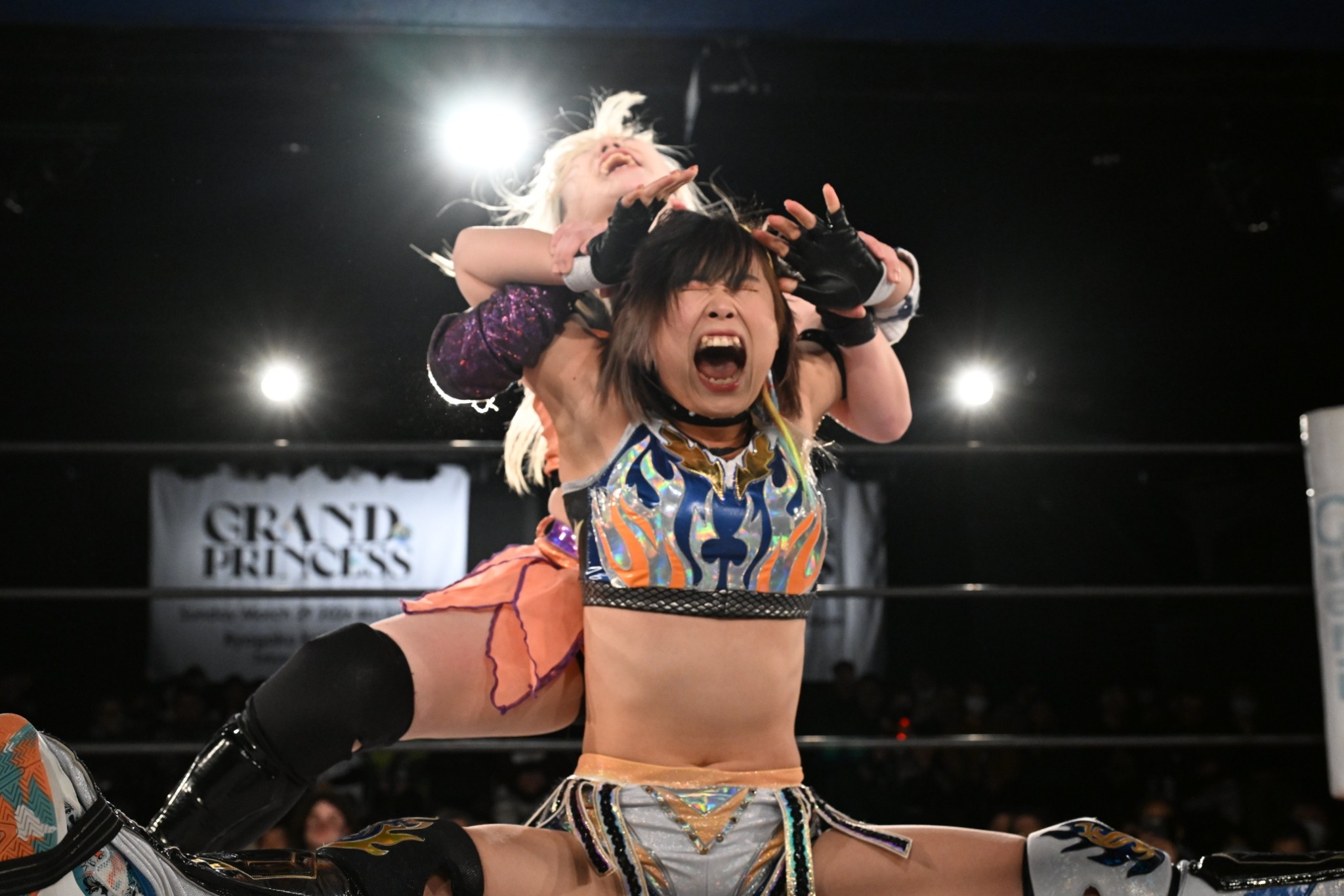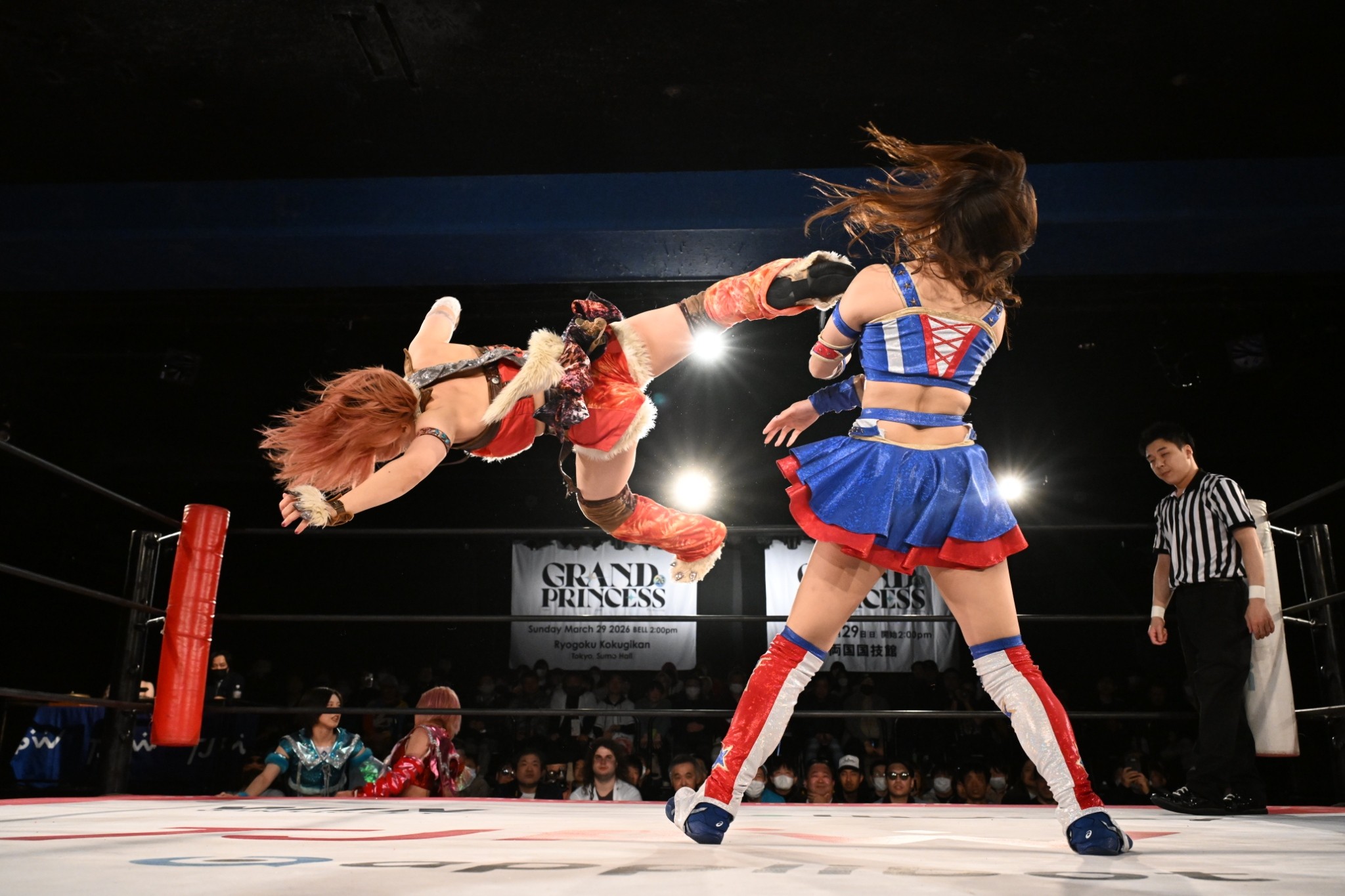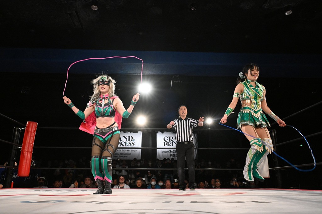 瑞希組が「お願いします!」と手を差し出すとまともに握手が成立。さらにでじもんが奇襲を制止してゴングが鳴ると、瑞希組が連係。汐珠をハンマースルーで投げつけるが、瑞希のエルボーは誤爆。でじもんがスピードで撹乱すると、場外エスケープした瑞希が「来いよ」と挑発。追いかけたでじもんだったが、入れ替わるように瑞希組がリングイン。「来いよ」との挑発にでじもんがダブルのドロップキックで共演。ローンバトルから逃れた汐珠が瑞希とスイッチ。セカンドロープすり抜け式ドロップキック、コーナーからクロスボディーを決めていくが、カウント2。5分経過。有栖が鶴ヶ城で反撃して鈴芽にかわると、エプロンで鈴芽が捕獲して有栖がドロップキックの連係を披露。瑞希から汐珠にかわるとコーナー反転式ミサイルキックに、鈴芽はグラウンドでのハチノス・エイトノットで応戦。エスケープした汐珠へのミカヅキ流星群は自爆になるが、コーナー反転式ミサイルキックを追走してフェースクラッシャーを浴びせていく。リング・ア・ベルは鈴芽が抵抗して瑞希にスイッチ。セカンドロープすり抜け式ドロップキックを鈴芽が避けると有栖がエプロンから鶴ヶ城。鈴芽がミカヅキ流星群で追撃。有栖にスイッチすると、フライング・ボディープレスもカウント2。キャメルクラッチは抜けた瑞希がクロスフェース。10分経過。什の掟はクロスフェースで切り返されるも、回転してフォールして脱した有栖はネックブリーカードロップを放つ。瑞希のキューティースペシャルは割って入った鈴芽がセカンドロープ反転式ドロップキックでカットし、でじもんが水車落としと熨斗紙で共演。続く連係をかわした瑞希が鈴芽をフットスタンプで排除すると、有栖のスーパーキックを捕獲して汐珠を呼び込む。汐珠のコルバタに瑞希が投げっぱなしキューティースペシャルで続き、最後は正調の一発を放って勝利した。試合後の瑞希組は2人でハイタッチ。