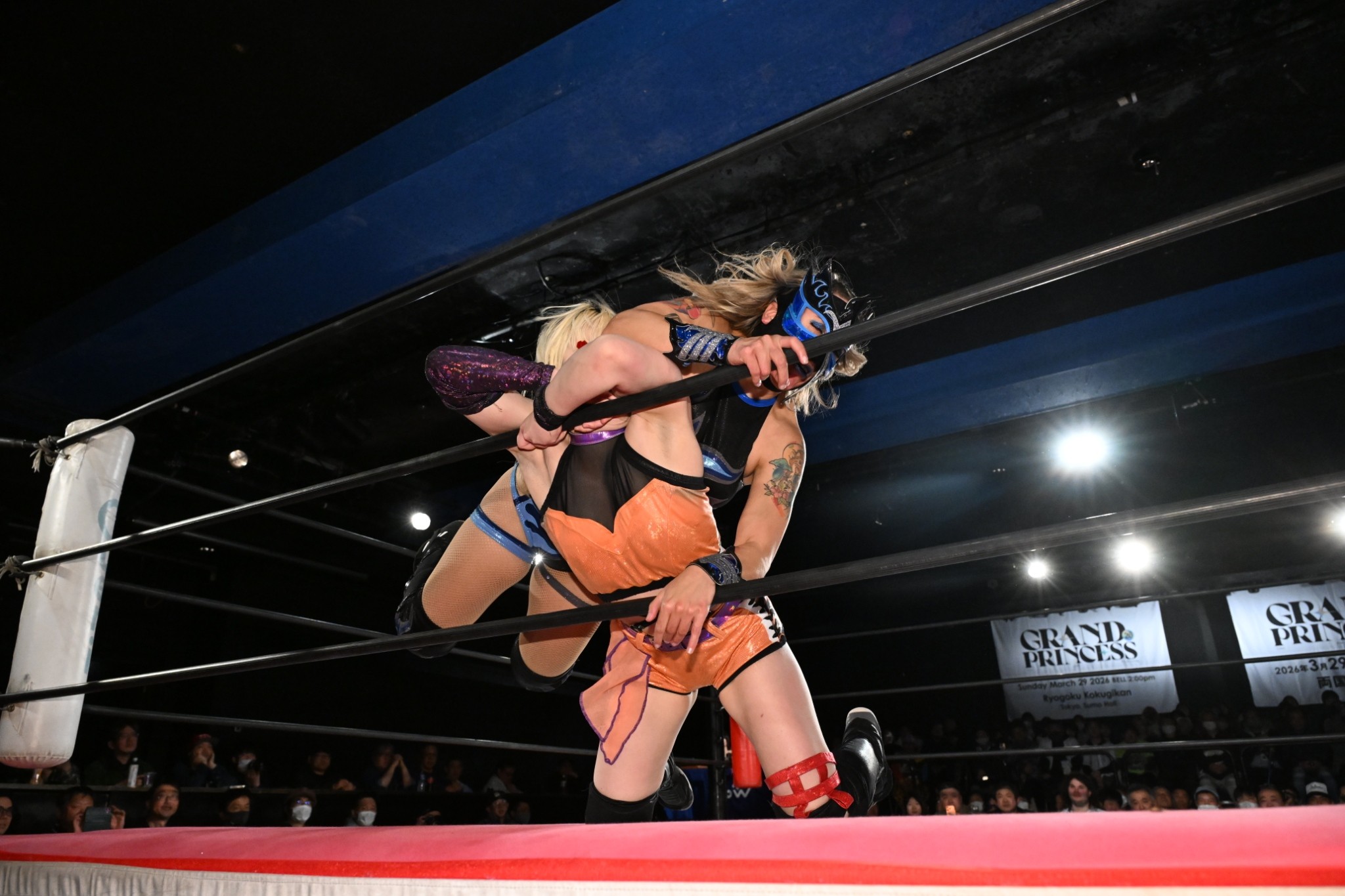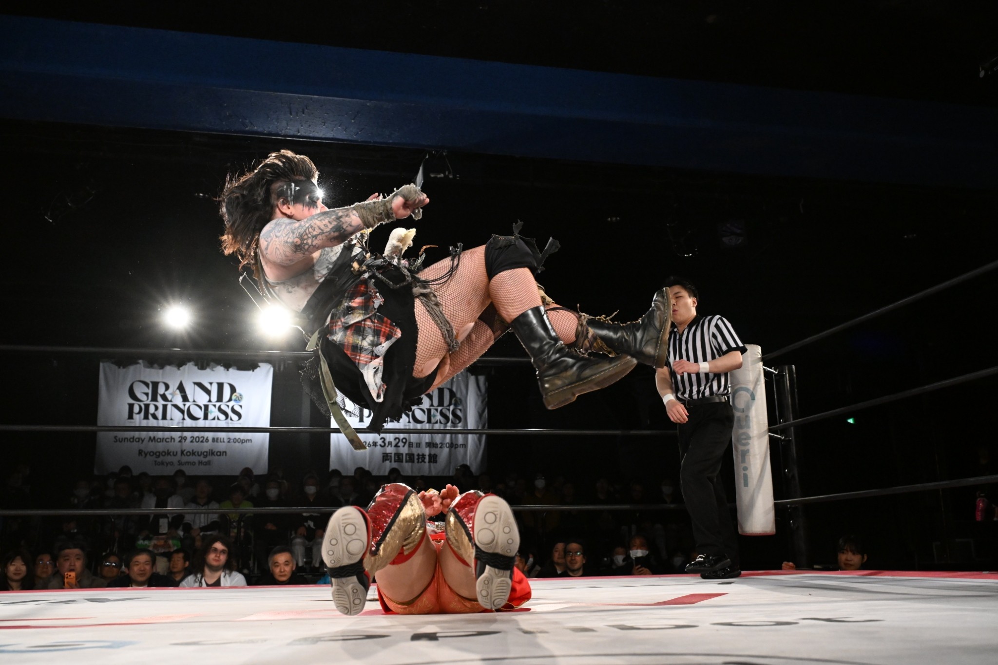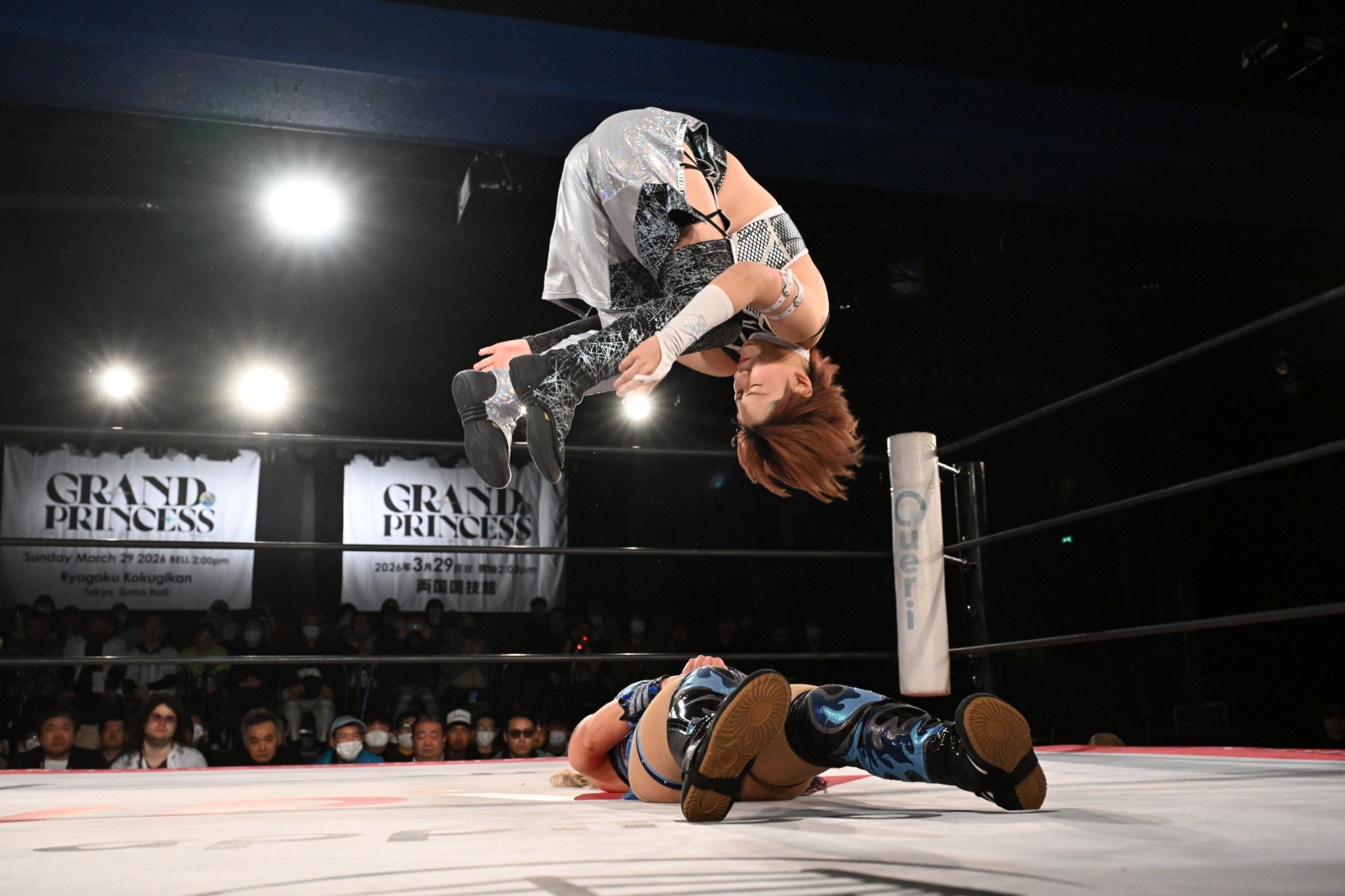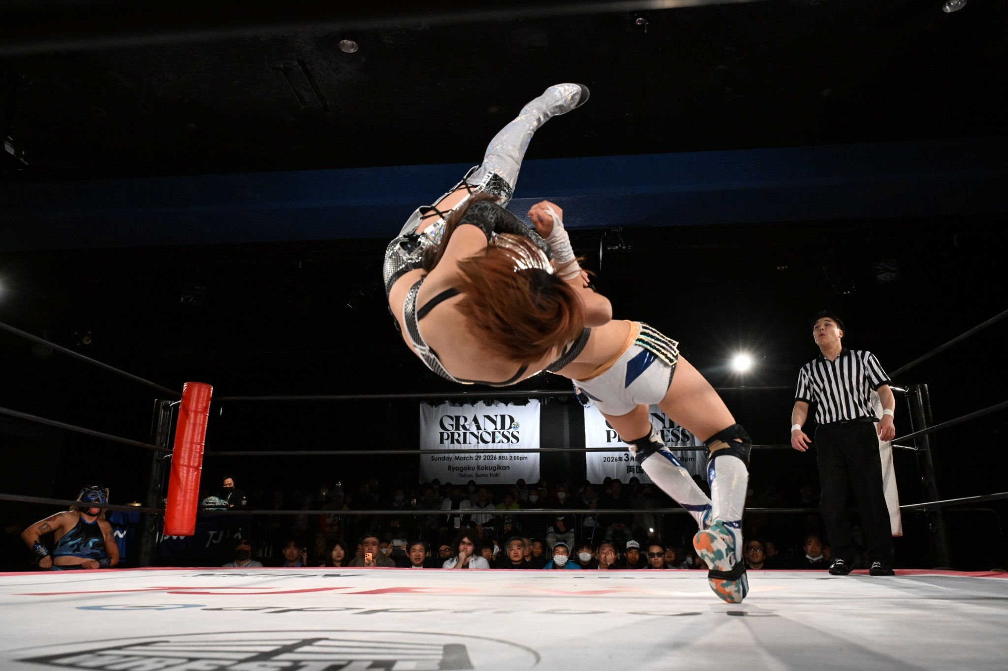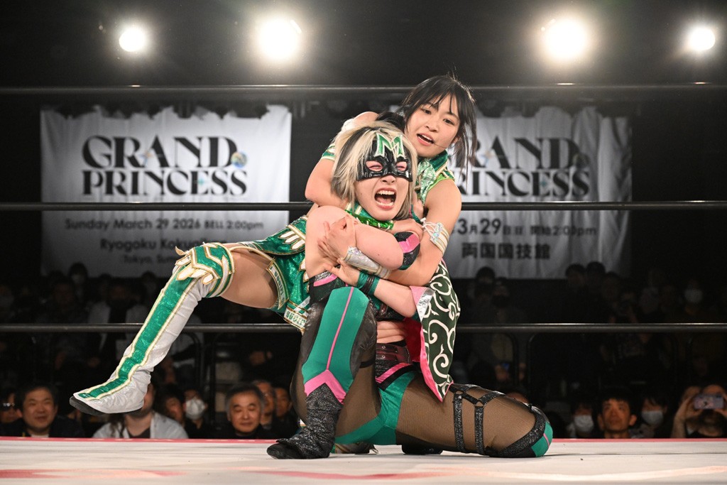 瑞希組が「お願いします!」と手を差し出すとまともに握手が成立。さらにでじもんが奇襲を制止してゴングが鳴ると、瑞希組が連係。汐珠をハンマースルーで投げつけるが、瑞希のエルボーは誤爆。でじもんがスピードで撹乱すると、場外エスケープした瑞希が「来いよ」と挑発。追いかけたでじもんだったが、入れ替わるように瑞希組がリングイン。「来いよ」との挑発にでじもんがダブルのドロップキックで共演。ローンバトルから逃れた汐珠が瑞希とスイッチ。セカンドロープすり抜け式ドロップキック、コーナーからクロスボディーを決めていくが、カウント2。5分経過。有栖が鶴ヶ城で反撃して鈴芽にかわると、エプロンで鈴芽が捕獲して有栖がドロップキックの連係を披露。瑞希から汐珠にかわるとコーナー反転式ミサイルキックに、鈴芽はグラウンドでのハチノス・エイトノットで応戦。エスケープした汐珠へのミカヅキ流星群は自爆になるが、コーナー反転式ミサイルキックを追走してフェースクラッシャーを浴びせていく。リング・ア・ベルは鈴芽が抵抗して瑞希にスイッチ。セカンドロープすり抜け式ドロップキックを鈴芽が避けると有栖がエプロンから鶴ヶ城。鈴芽がミカヅキ流星群で追撃。有栖にスイッチすると、フライング・ボディープレスもカウント2。キャメルクラッチは抜けた瑞希がクロスフェース。10分経過。什の掟はクロスフェースで切り返されるも、回転してフォールして脱した有栖はネックブリーカードロップを放つ。瑞希のキューティースペシャルは割って入った鈴芽がセカンドロープ反転式ドロップキックでカットし、でじもんが水車落としと熨斗紙で共演。続く連係をかわした瑞希が鈴芽をフットスタンプで排除すると、有栖のスーパーキックを捕獲して汐珠を呼び込む。汐珠のコルバタに瑞希が投げっぱなしキューティースペシャルで続き、最後は正調の一発を放って勝利した。試合後の瑞希組は2人でハイタッチ。