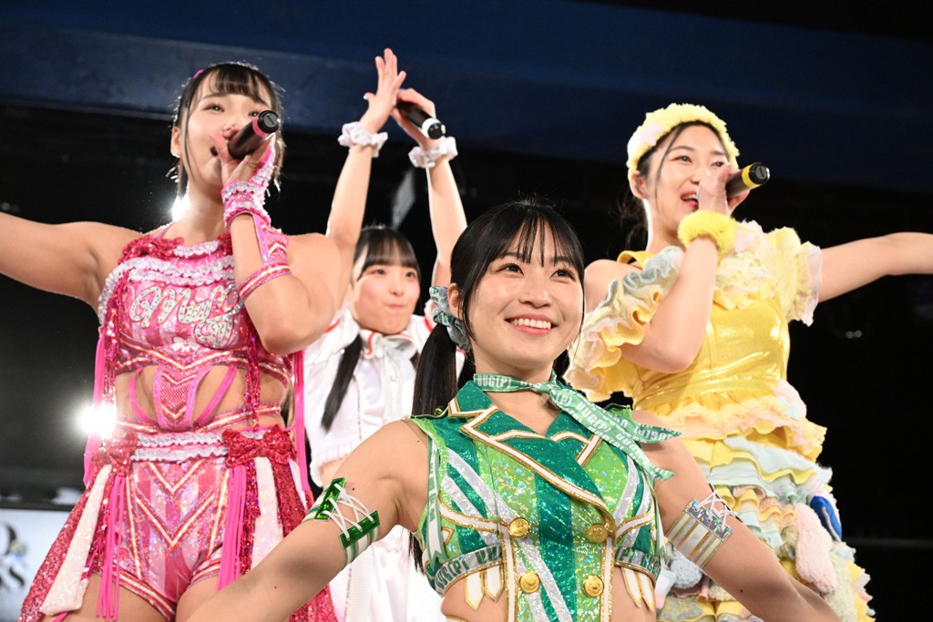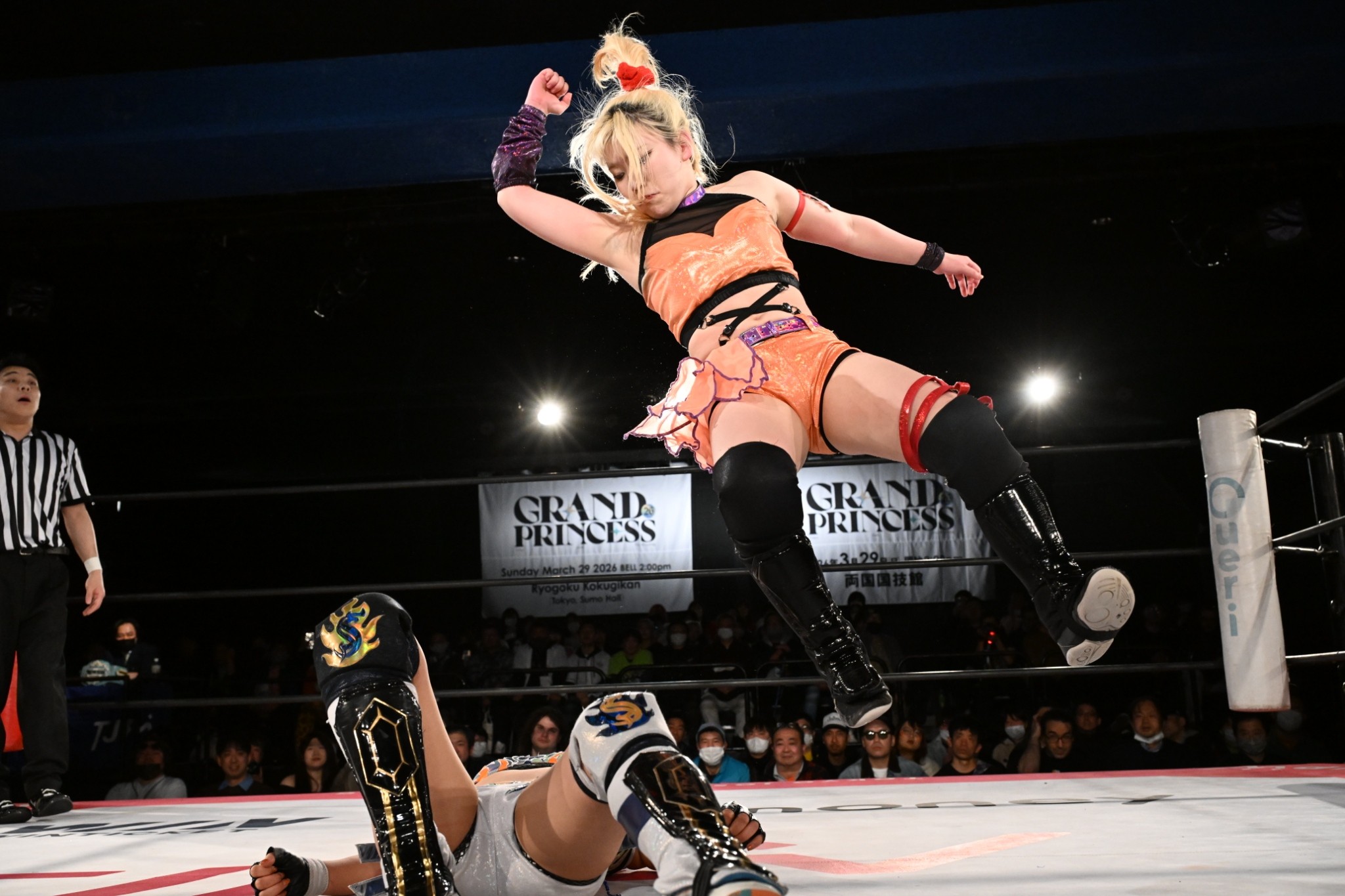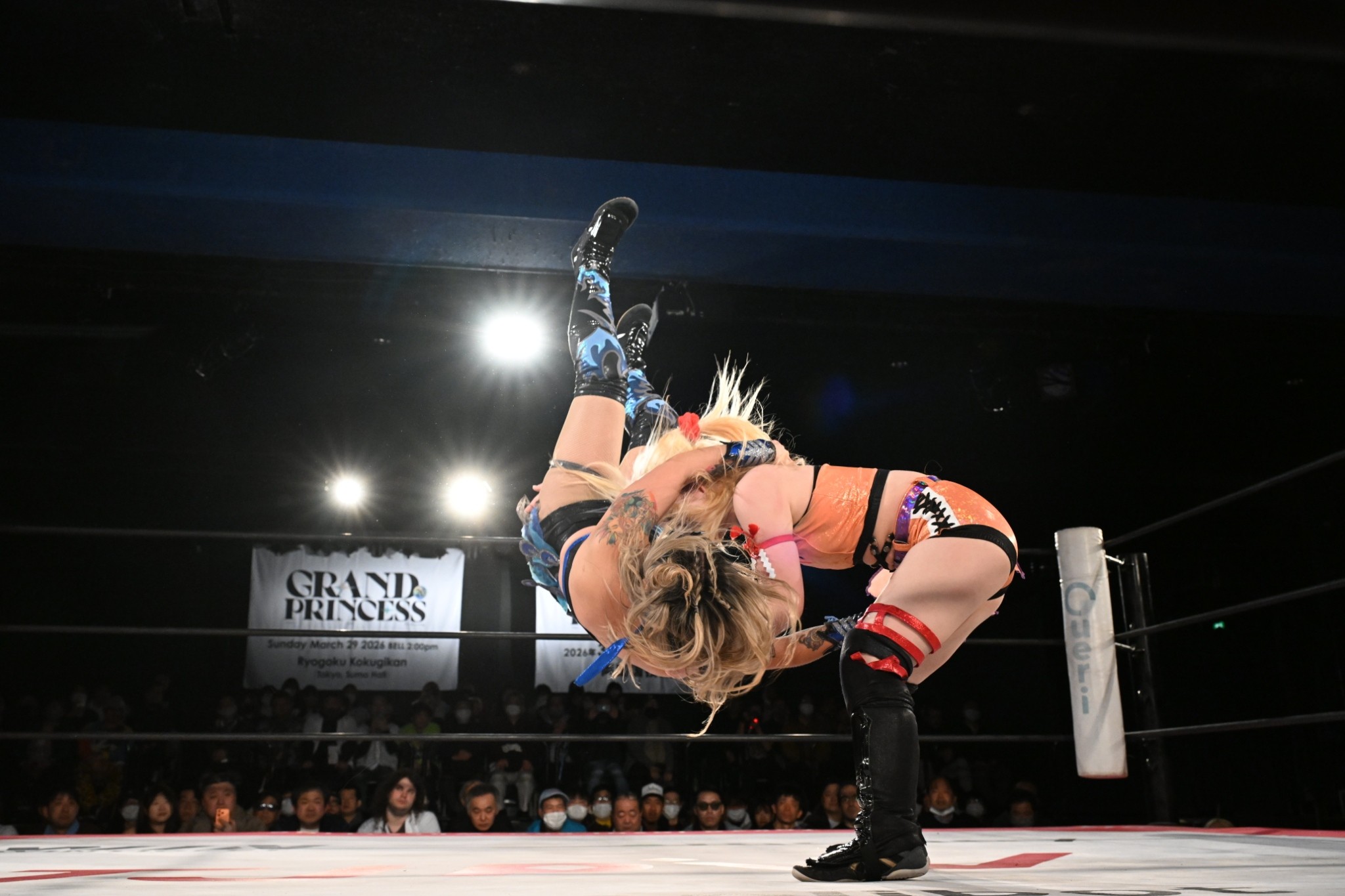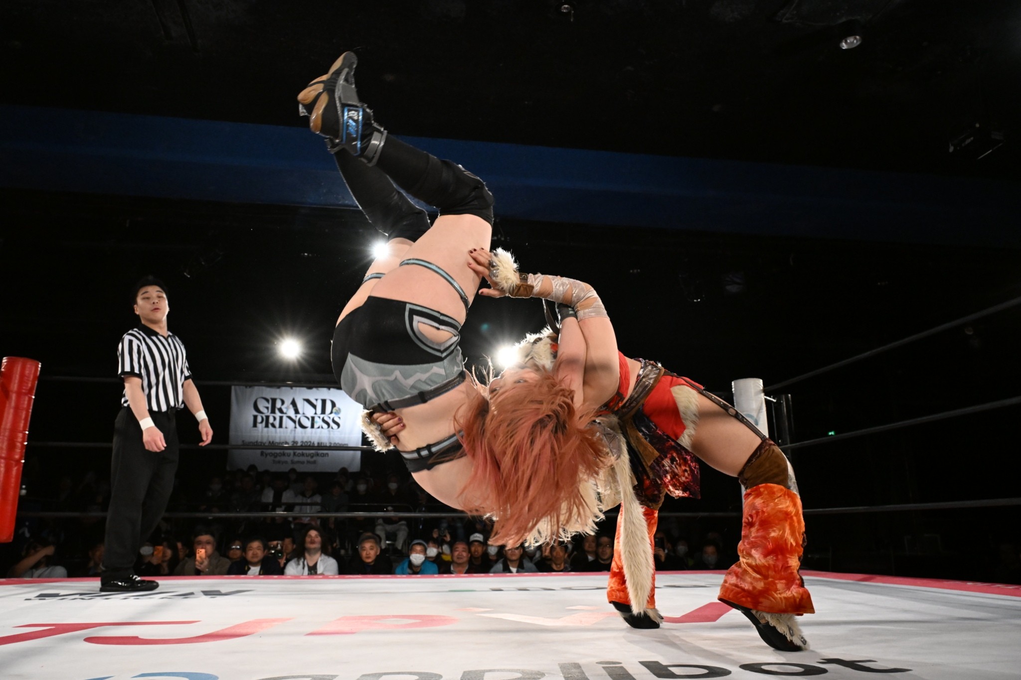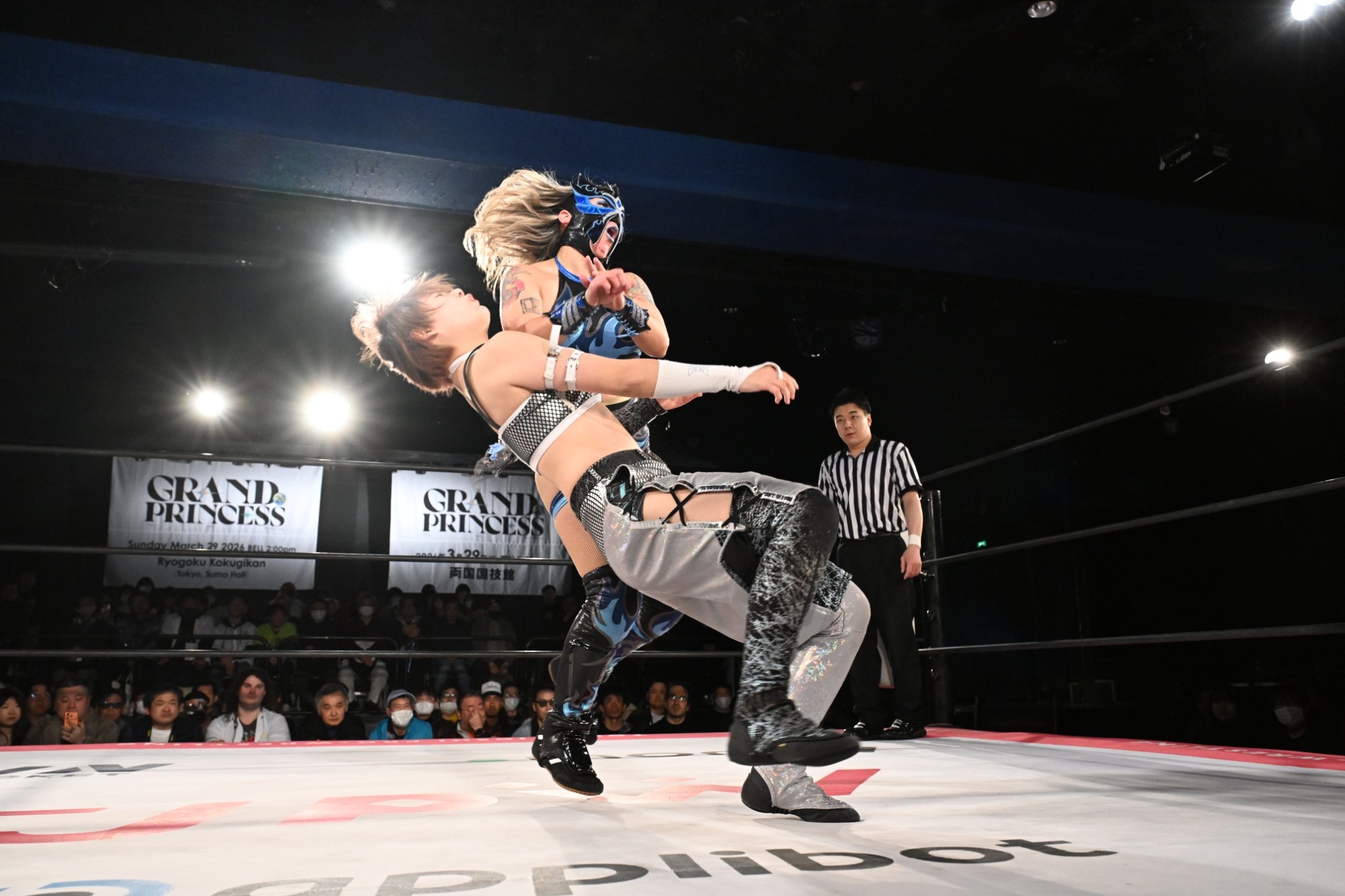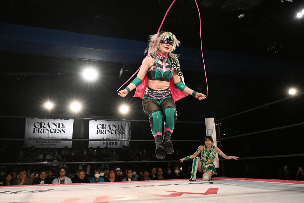 瑞希組が「お願いします!」と手を差し出すとまともに握手が成立。さらにでじもんが奇襲を制止してゴングが鳴ると、瑞希組が連係。汐珠をハンマースルーで投げつけるが、瑞希のエルボーは誤爆。でじもんがスピードで撹乱すると、場外エスケープした瑞希が「来いよ」と挑発。追いかけたでじもんだったが、入れ替わるように瑞希組がリングイン。「来いよ」との挑発にでじもんがダブルのドロップキックで共演。ローンバトルから逃れた汐珠が瑞希とスイッチ。セカンドロープすり抜け式ドロップキック、コーナーからクロスボディーを決めていくが、カウント2。5分経過。有栖が鶴ヶ城で反撃して鈴芽にかわると、エプロンで鈴芽が捕獲して有栖がドロップキックの連係を披露。瑞希から汐珠にかわるとコーナー反転式ミサイルキックに、鈴芽はグラウンドでのハチノス・エイトノットで応戦。エスケープした汐珠へのミカヅキ流星群は自爆になるが、コーナー反転式ミサイルキックを追走してフェースクラッシャーを浴びせていく。リング・ア・ベルは鈴芽が抵抗して瑞希にスイッチ。セカンドロープすり抜け式ドロップキックを鈴芽が避けると有栖がエプロンから鶴ヶ城。鈴芽がミカヅキ流星群で追撃。有栖にスイッチすると、フライング・ボディープレスもカウント2。キャメルクラッチは抜けた瑞希がクロスフェース。10分経過。什の掟はクロスフェースで切り返されるも、回転してフォールして脱した有栖はネックブリーカードロップを放つ。瑞希のキューティースペシャルは割って入った鈴芽がセカンドロープ反転式ドロップキックでカットし、でじもんが水車落としと熨斗紙で共演。続く連係をかわした瑞希が鈴芽をフットスタンプで排除すると、有栖のスーパーキックを捕獲して汐珠を呼び込む。汐珠のコルバタに瑞希が投げっぱなしキューティースペシャルで続き、最後は正調の一発を放って勝利した。試合後の瑞希組は2人でハイタッチ。