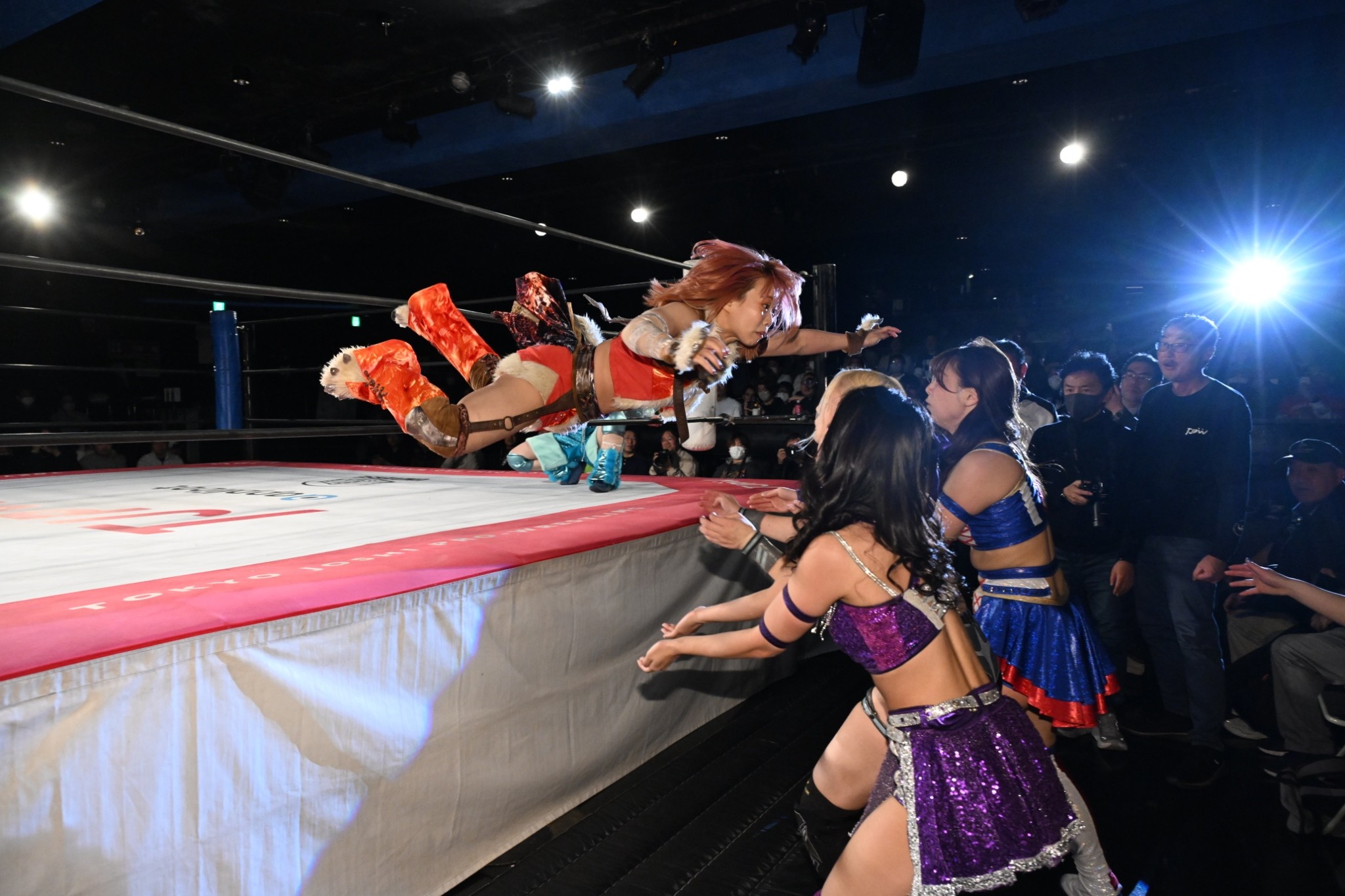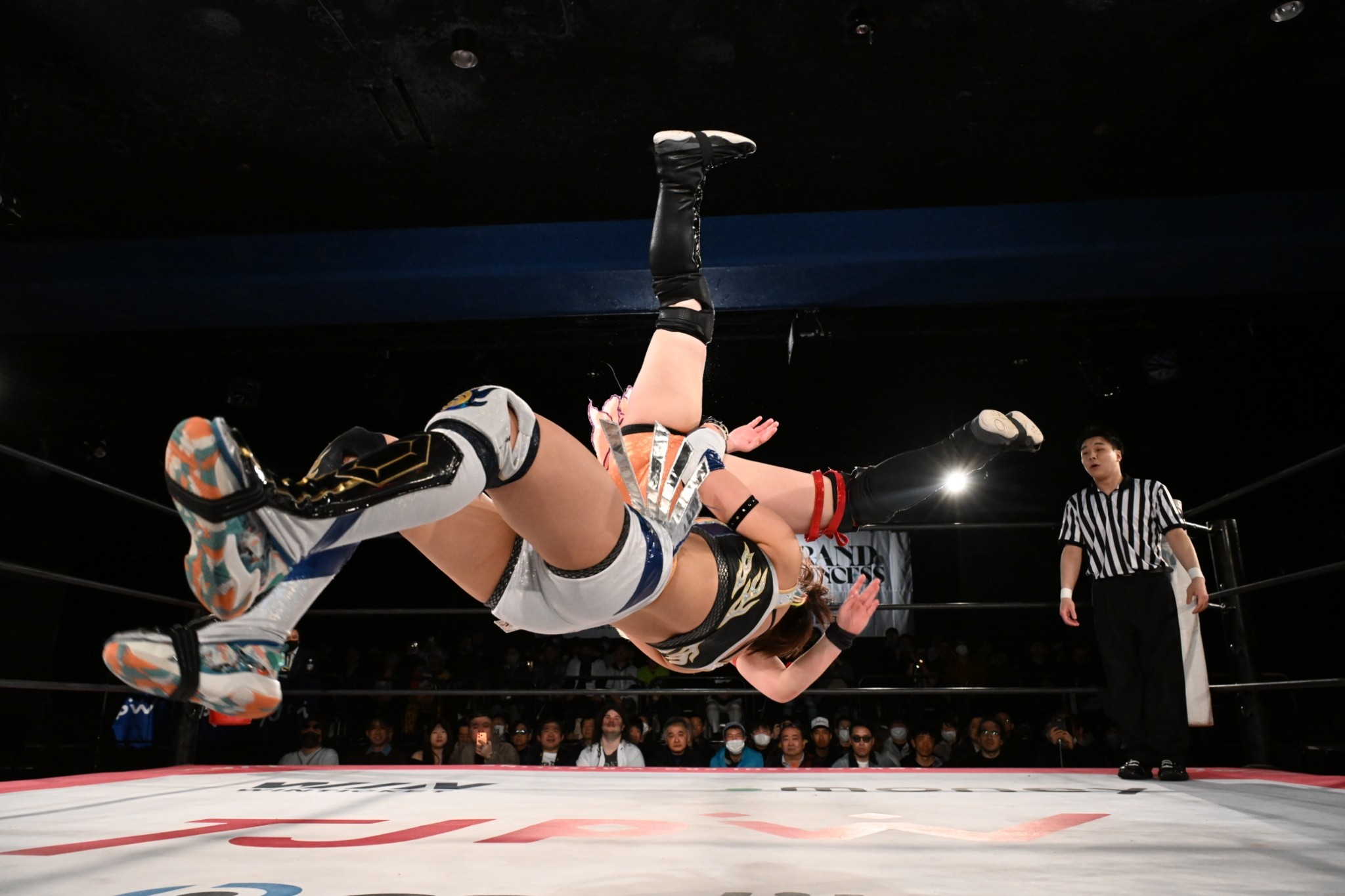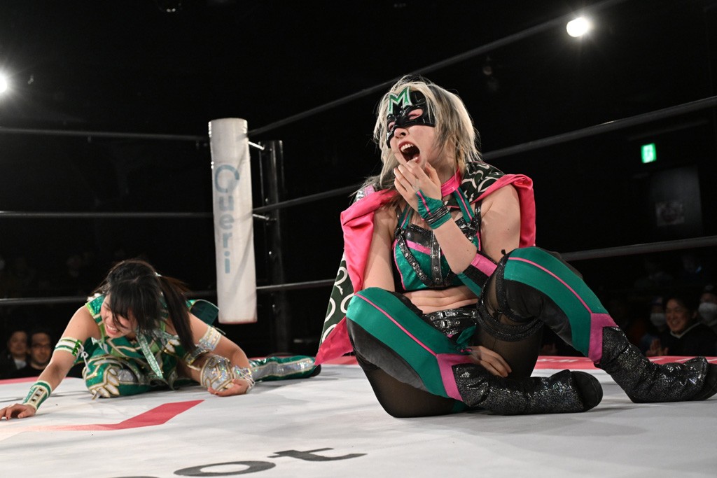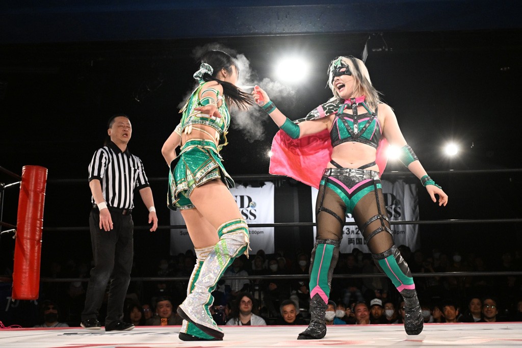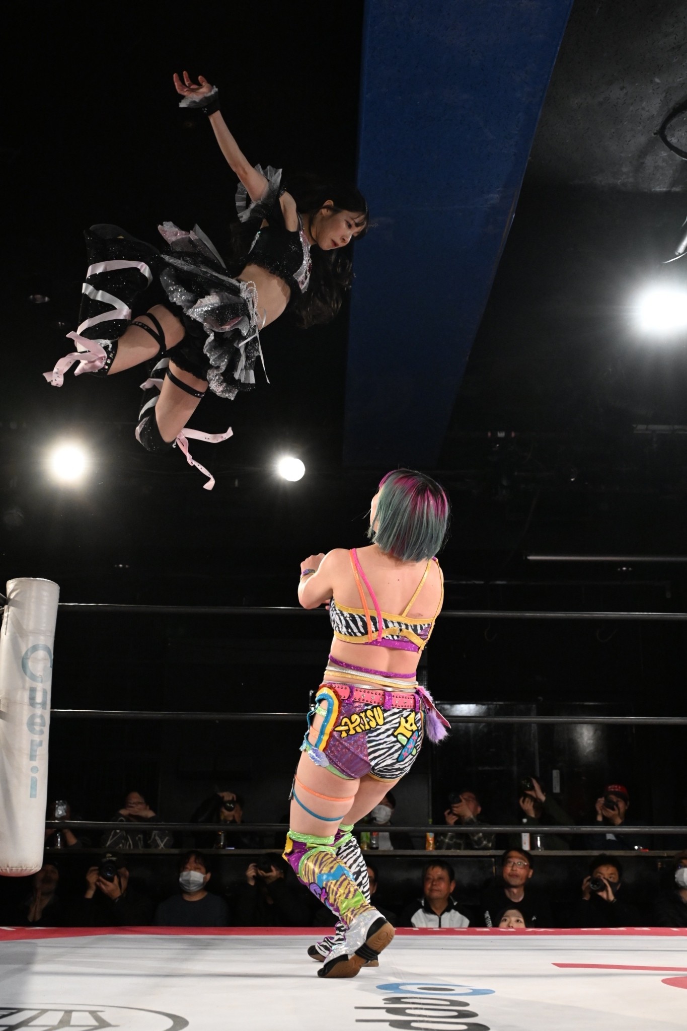 凍雅が握手を求めるとMIRAIが握り返してゴング。先発はMIRAIと凍雅。ロックアップからグラウンドを経てブレーク。腕を取り合ってグラウンドの攻防からMIRAIが自コーナーに押し込んでフェニックスとスイッチ。コーナーへのキャノンボールを決めるなど、千花を手玉に取る。ボディースラムを放って千花から凍雅にかわると、サラにローリング・サンダー。スリーパーは脱したサラがスプリングボードのエルボーを放ってMIRAIにスイッチ。顔面へのドロップキックはカウント2。ミラマーレ・ショックは決まらないとみるやバックフリップで叩きつける。10分経過。両者がエルボー合戦からMIRAIがロープに走るとカウンターで凍雅がエルボー。さらにフォールアウェイスラムで叩きつける。千花にかわると串刺しドロップキックからランニング・エルボー。カウント2。稲荷鳥居はMIRAIが立ち上がって振りほどくと、腕をきめながらボディースラム。サラを呼び込んで連係。続くMIRAIのバックドロップは凍雅がカット。「出てきてんじゃねえ」と凍雅を場外追放するも、すぐに戻ってきた凍雅はミラマーレ・ショックをエルボーでカットし、千花が稲荷鳥居・改の体勢。これを切り返したMIRAIがすてきMIRAI☆ロックでギブアップを奪った。試合後、ベルトを掲げたMIRAIを睨みつけてから凍雅は退場。