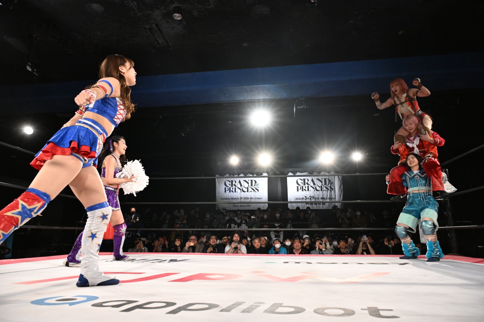白井李世リングアナリングアナが注意事項を読み上げたあと、リングに芦田美歩、山下実優、鈴芽が登場。芦田の4・4福知山三段池公園での凱旋大会、山下の4・5アクロス福岡での凱旋大会、鈴芽の5・6つくば国際会議場多目的ホールでの凱旋大会が発表され、それぞれがコメント。芦田「念願の福知山凱旋興行が決定しました! プロレスラーデビューをして、叶えたい目標のひとつだったので、ほんとにほんとに嬉しいです。京都よりは少し奥地になりますが、皆さん遊びに来て下さい」山下「その翌日に何度目かになります福岡大会。皆さん来たことあります? 福岡。あるね、ありがとう! 来てことない方たち、来て下さいよ~そろそろ。でも福岡、京都もそうだけど美味しいご飯がありますから。京都からの福岡、お願いしますね。からの筑波ね。お願いします。皆さんよろしくお願いします」鈴芽「初めての筑波大会が決定してしまいした! やった! すごくドキドキしてましたが、皆さんが一緒に来てくれたらすごく心強いなと思っているので、一緒に筑波に行きましょう。アクセスもたぶん割としやすいと思いますので、ぜひ全員来て下さい! 全員来て下さい! お願いします!」その後、アップアップガールズ(プロレス)が『ツヨカワチャレンジャー』を熱唱して大会の幕が上がった。