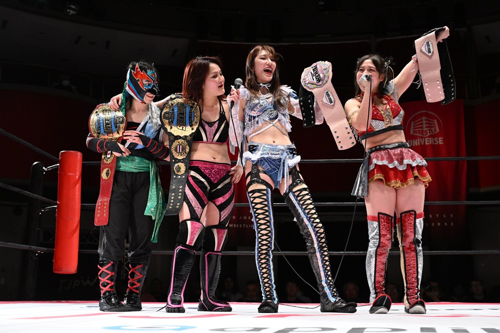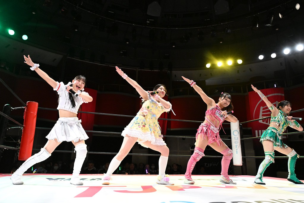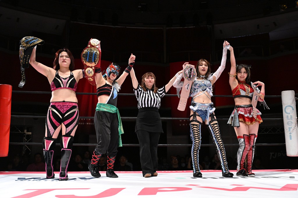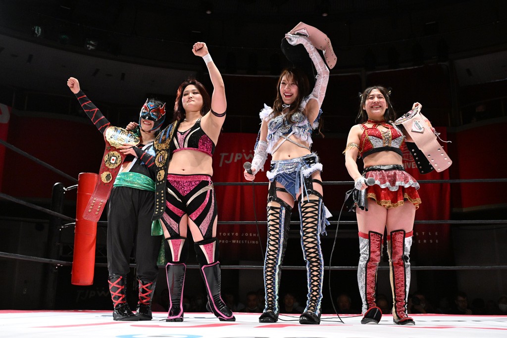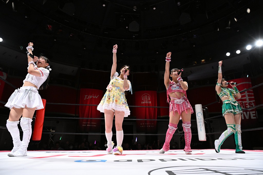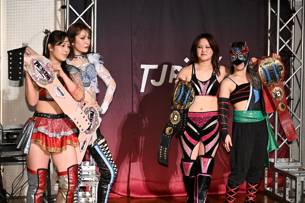 試合後は山下が上福に握手を求めて王者4人が記念撮影。上福「今日はいろいろありましたけど、なんかね。なんか山下カッコいいよね。カッコいいよねー」山下「絶対怒ってたよね?」上福「いやいや、うっすうっす」山下「いや~ちょっとホントごめん。間違えて蹴った」上福「絶対わかってましたよね?」山下「わかってないですよ。止めようとしただけだから。ちょっと今日、この形初めてじゃない? 組んでやるの」上福「はい」山下「強いね。やっぱね、カッコいいなと思ったよ、私達は。心強かったし最後も決めてくれたんで。ちょっと悔しい部分もあるけど、私達負けてるからね。率直に今日、一緒にやってカッコいいと思ったよ。一緒に組めてよかったです」上福「ありがとうございます」上原「パン食べてすいませんでした」鳥喰「見えなかったけど、なんで喧嘩をしてるんでしょうか? なんで責めてるんでしょうか?」山下「いろいろあったんよ」上福「まぁそんなこんなで。昨日から2連戦続きまして。お客さんたちも朝からね。お疲れの中、ありがとうございます。貴重なお休みだったのに来ていただいて。昨日でカードが決まったり、私達は3月29日の両国国技館大会に向けてまだまだ走ってます。それだけじゃないしね。どんどんやっていかないといけないから。山下さんがリーダーだから。山下さんが中心に山下さんが引っ張っていく団体なので。今日もありがとうございます。山下さん。はい。お願いします。じゃあ締めようか、わかな」上原「えーっ。……じゃあ両国国技館までTJPWみんなで、最高の試合をお届けしまーす!」
