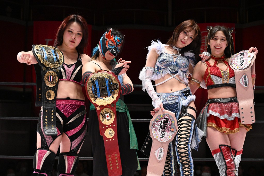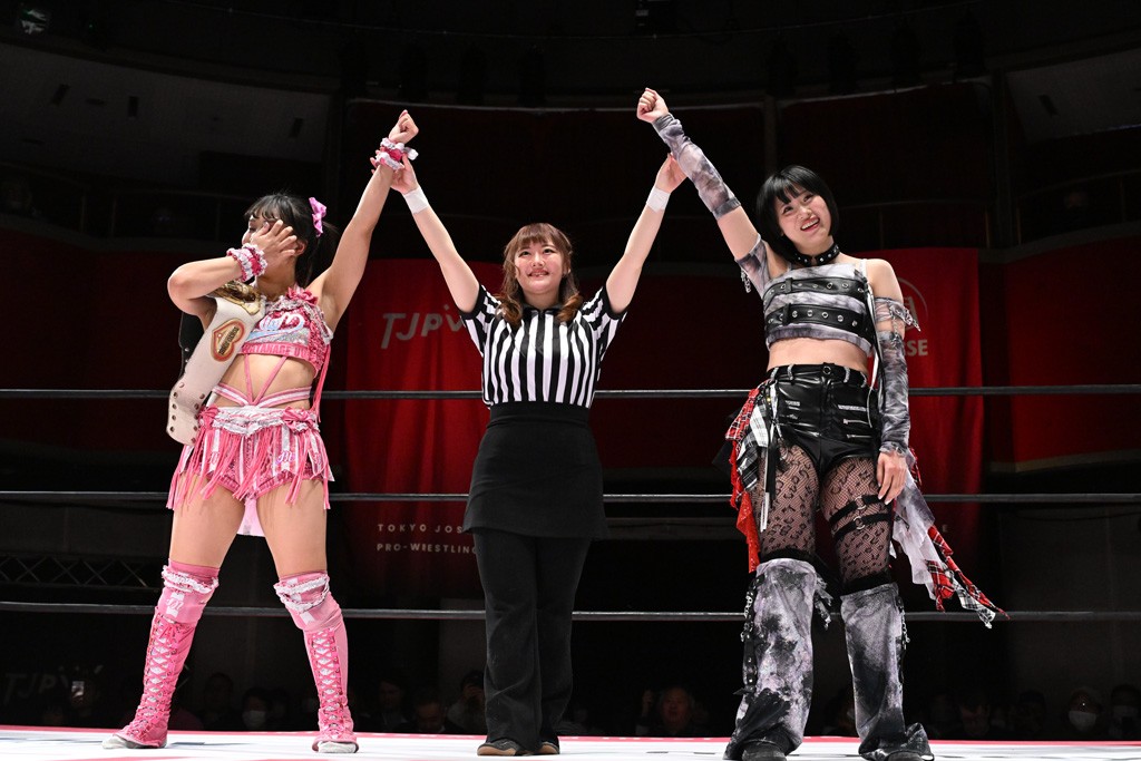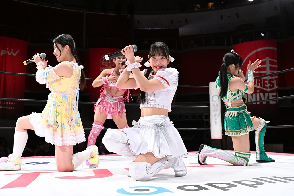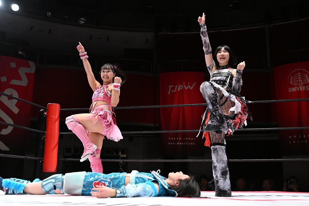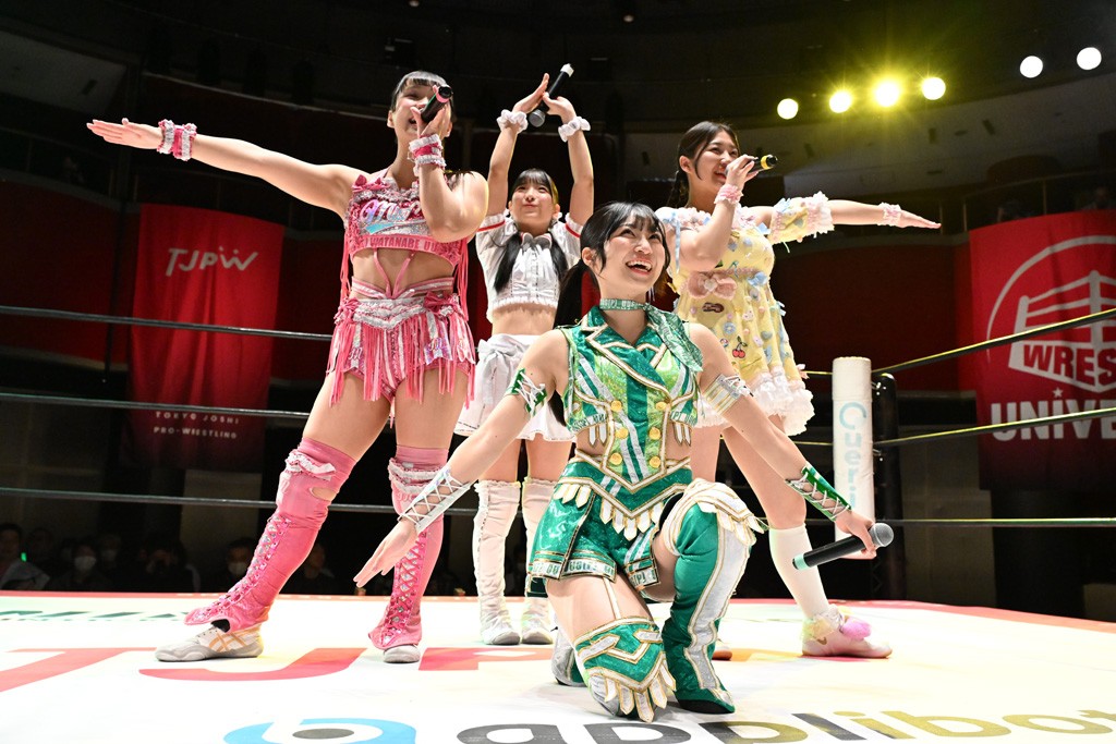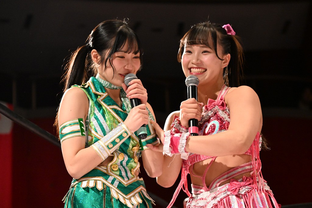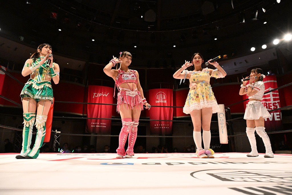 試合後は山下が上福に握手を求めて王者4人が記念撮影。上福「今日はいろいろありましたけど、なんかね。なんか山下カッコいいよね。カッコいいよねー」山下「絶対怒ってたよね?」上福「いやいや、うっすうっす」山下「いや~ちょっとホントごめん。間違えて蹴った」上福「絶対わかってましたよね?」山下「わかってないですよ。止めようとしただけだから。ちょっと今日、この形初めてじゃない? 組んでやるの」上福「はい」山下「強いね。やっぱね、カッコいいなと思ったよ、私達は。心強かったし最後も決めてくれたんで。ちょっと悔しい部分もあるけど、私達負けてるからね。率直に今日、一緒にやってカッコいいと思ったよ。一緒に組めてよかったです」上福「ありがとうございます」上原「パン食べてすいませんでした」鳥喰「見えなかったけど、なんで喧嘩をしてるんでしょうか? なんで責めてるんでしょうか?」山下「いろいろあったんよ」上福「まぁそんなこんなで。昨日から2連戦続きまして。お客さんたちも朝からね。お疲れの中、ありがとうございます。貴重なお休みだったのに来ていただいて。昨日でカードが決まったり、私達は3月29日の両国国技館大会に向けてまだまだ走ってます。それだけじゃないしね。どんどんやっていかないといけないから。山下さんがリーダーだから。山下さんが中心に山下さんが引っ張っていく団体なので。今日もありがとうございます。山下さん。はい。お願いします。じゃあ締めようか、わかな」上原「えーっ。……じゃあ両国国技館までTJPWみんなで、最高の試合をお届けしまーす!」