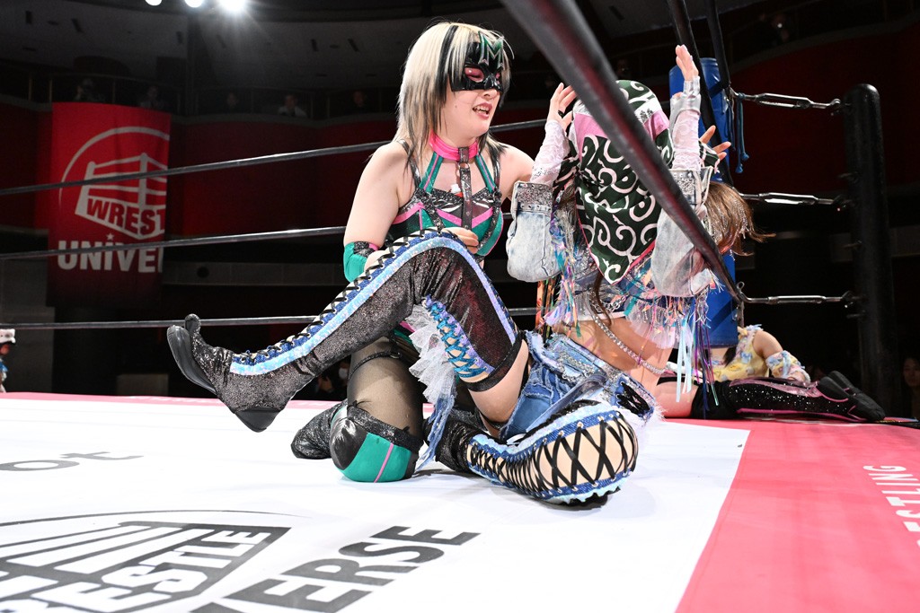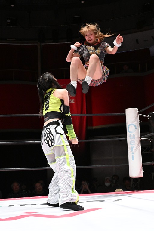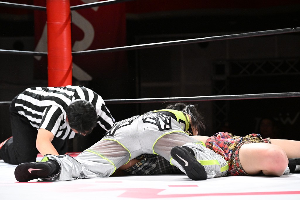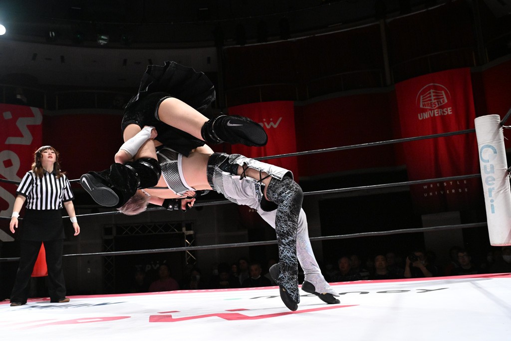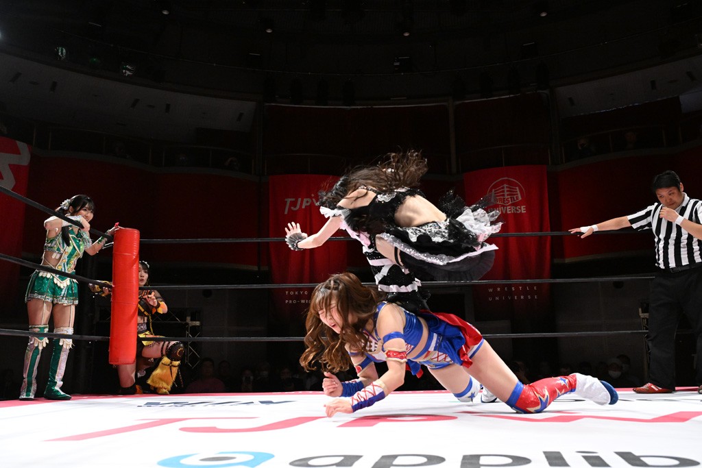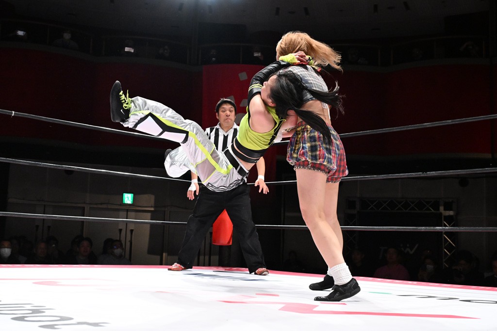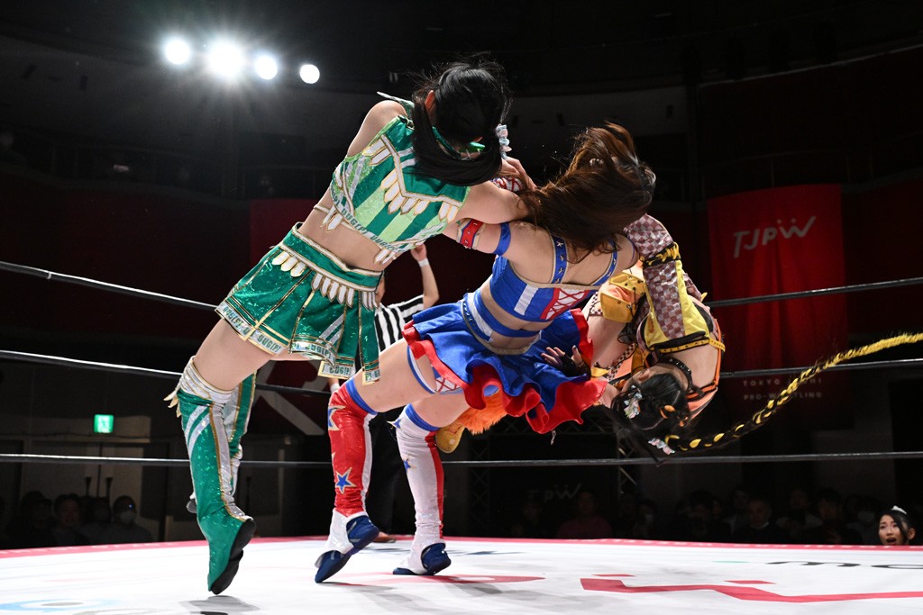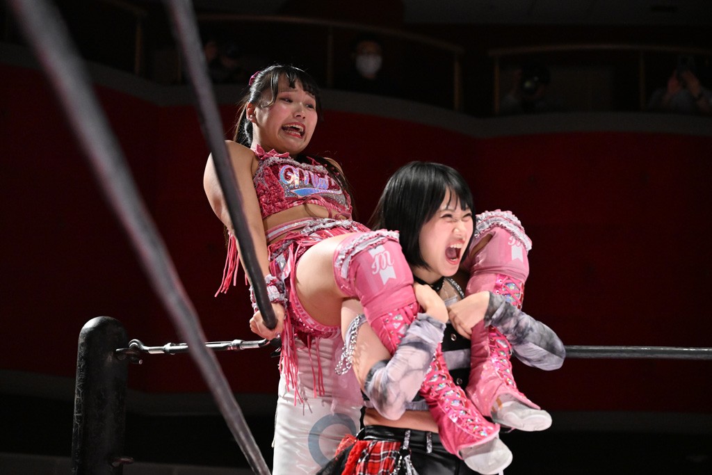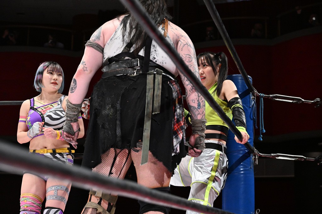 タッグトーナメントで実現しなかったぽむペイラーvsでじもん。ぽむが「お願いしま~す」と大声で口撃してコーナーの上で待機。インペイラーはでじもんを威嚇してからゴング。先発の鈴芽のエルボーに微動だにしない。スクールボーイも倒れず。インペイラーはボディーアタックを食らわせ、ヘアーホイップから踏みつけていく。ぽむがタッチを要求してかわると、でんでん太鼓。カウント2。コーナーに駆け上がってアームドラッグからドロップキックで追撃。すね蹴りをかわした鈴芽がドロップキック。有栖にスイッチしてドロップキック、ロープギロチン、フライング・ボディープレスとたたみかける。キャメルクラッチは大声で叫んで脱すると、インペイラーにスイッチ。セントーンはカウント2。串刺しボディーアタックや串刺しショルダー。続いて担ぎ上げたが、脱した有栖がドロップキックからエルボー連打。突進をかわして自コーナーに押し込むと、かわった鈴芽がハチノス・エイトノット。強引に振りほどかれるも、エプロンで捕獲して有栖がドロップキックで追い打ち。5分経過。連係狙いはインペイラーが阻止して2人まとめてバックドロップで投げ捨てる。ぽむにタッチしてぽむ投げでプレス。コーナーに登ると追ってきた鈴芽を大声で落下させてミサイルキック投下。反撃した鈴芽が丸め込んでからグラウンドのハチノス・エイトノット。これをインペイラーがぽむの足を引いてエスケープさせる。でじもんが連係はインペイラーが救出してぽむ投げで2人まとめて圧殺。鈴芽へコーナーからのスーパーぽむ投げ。カットに来た有栖を場外追放してインペイラーがリバース・スプラッシュを放つが自爆。勝機とみたでじもんはインペイラーへダブルのドロップキック。有栖がスーパーキック、鈴芽がフェースクラッシャーでダメージを与えて、有栖がインペイラーに鶴ヶ城、鈴芽がぽむにフェースクラッシャーで分断すると、鈴芽がリング・ア・ベルで3カウントを奪った。