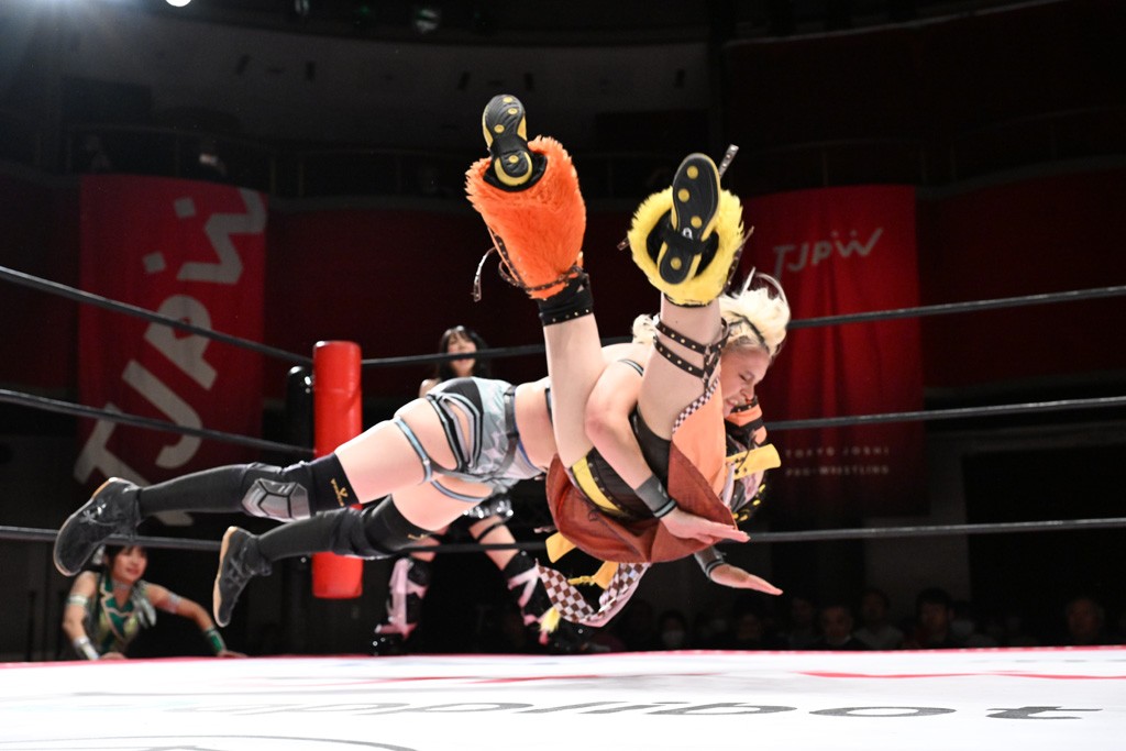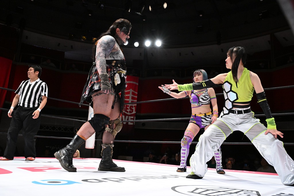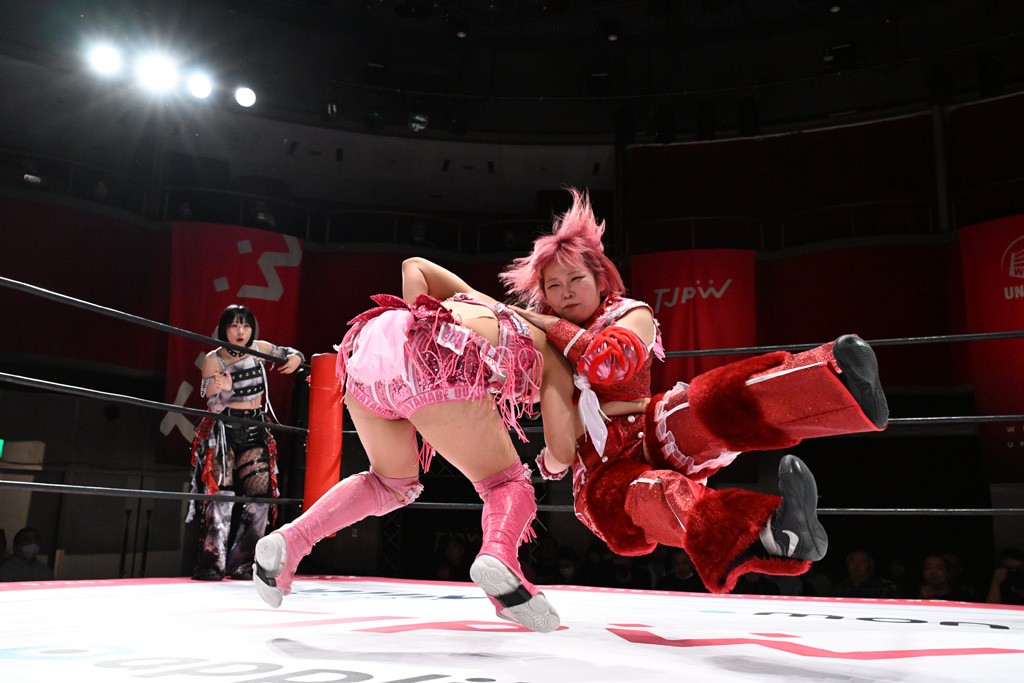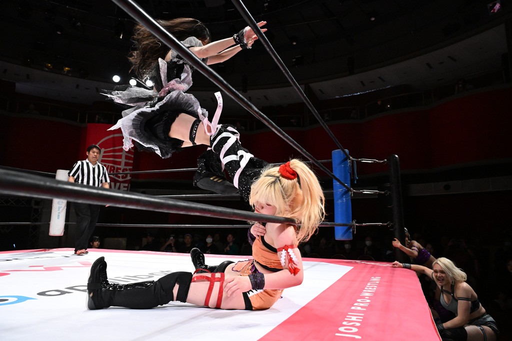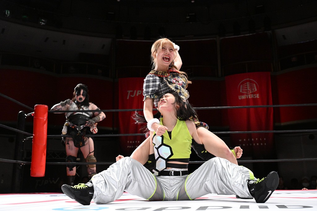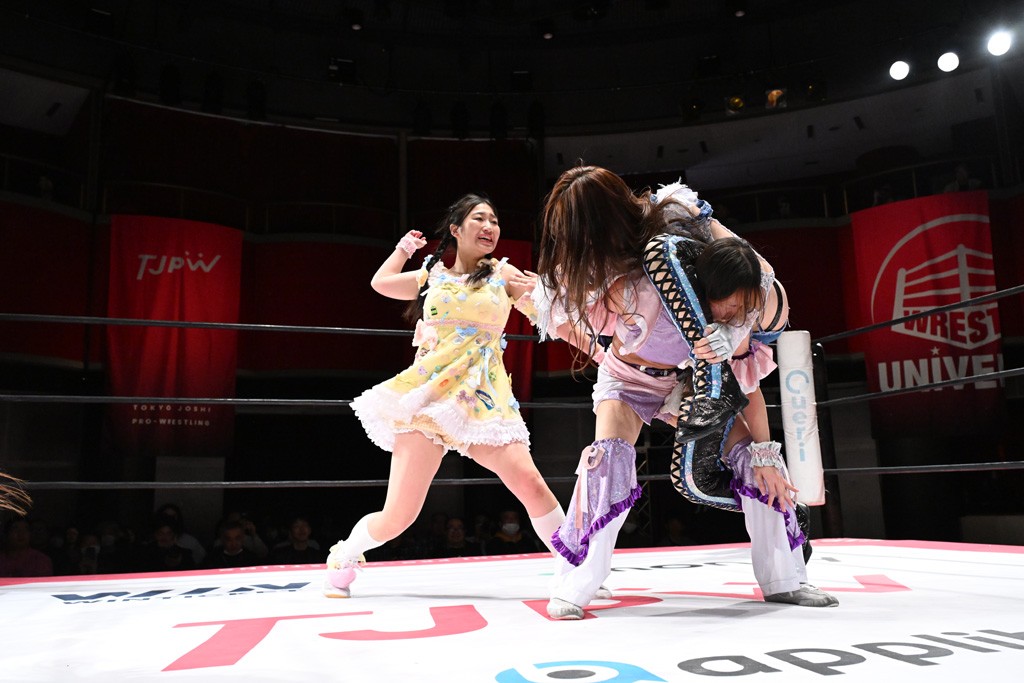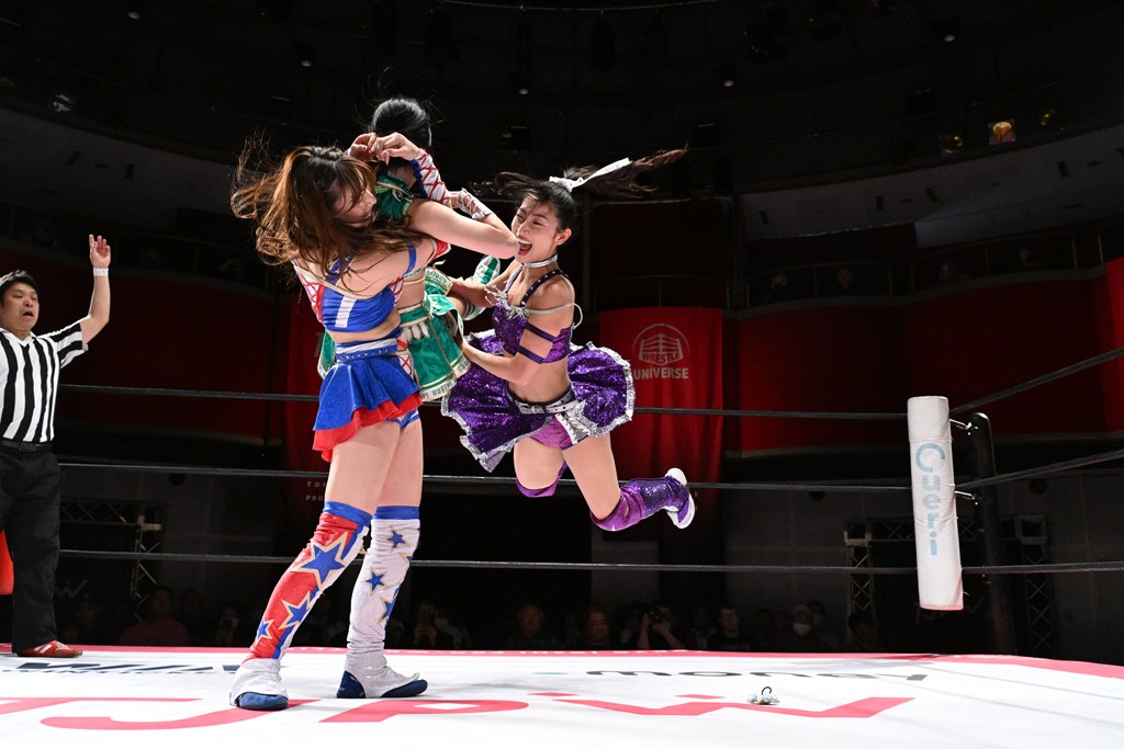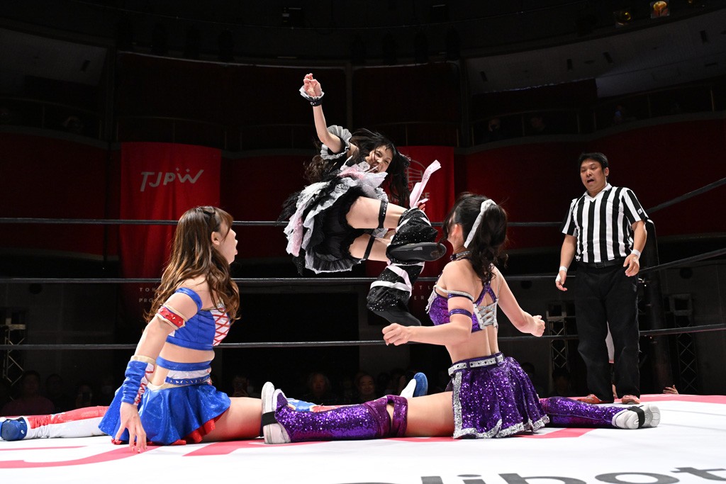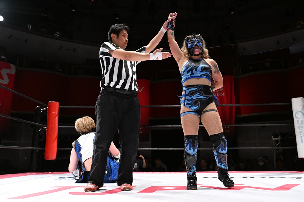 タッグトーナメントで実現しなかったぽむペイラーvsでじもん。ぽむが「お願いしま~す」と大声で口撃してコーナーの上で待機。インペイラーはでじもんを威嚇してからゴング。先発の鈴芽のエルボーに微動だにしない。スクールボーイも倒れず。インペイラーはボディーアタックを食らわせ、ヘアーホイップから踏みつけていく。ぽむがタッチを要求してかわると、でんでん太鼓。カウント2。コーナーに駆け上がってアームドラッグからドロップキックで追撃。すね蹴りをかわした鈴芽がドロップキック。有栖にスイッチしてドロップキック、ロープギロチン、フライング・ボディープレスとたたみかける。キャメルクラッチは大声で叫んで脱すると、インペイラーにスイッチ。セントーンはカウント2。串刺しボディーアタックや串刺しショルダー。続いて担ぎ上げたが、脱した有栖がドロップキックからエルボー連打。突進をかわして自コーナーに押し込むと、かわった鈴芽がハチノス・エイトノット。強引に振りほどかれるも、エプロンで捕獲して有栖がドロップキックで追い打ち。5分経過。連係狙いはインペイラーが阻止して2人まとめてバックドロップで投げ捨てる。ぽむにタッチしてぽむ投げでプレス。コーナーに登ると追ってきた鈴芽を大声で落下させてミサイルキック投下。反撃した鈴芽が丸め込んでからグラウンドのハチノス・エイトノット。これをインペイラーがぽむの足を引いてエスケープさせる。でじもんが連係はインペイラーが救出してぽむ投げで2人まとめて圧殺。鈴芽へコーナーからのスーパーぽむ投げ。カットに来た有栖を場外追放してインペイラーがリバース・スプラッシュを放つが自爆。勝機とみたでじもんはインペイラーへダブルのドロップキック。有栖がスーパーキック、鈴芽がフェースクラッシャーでダメージを与えて、有栖がインペイラーに鶴ヶ城、鈴芽がぽむにフェースクラッシャーで分断すると、鈴芽がリング・ア・ベルで3カウントを奪った。