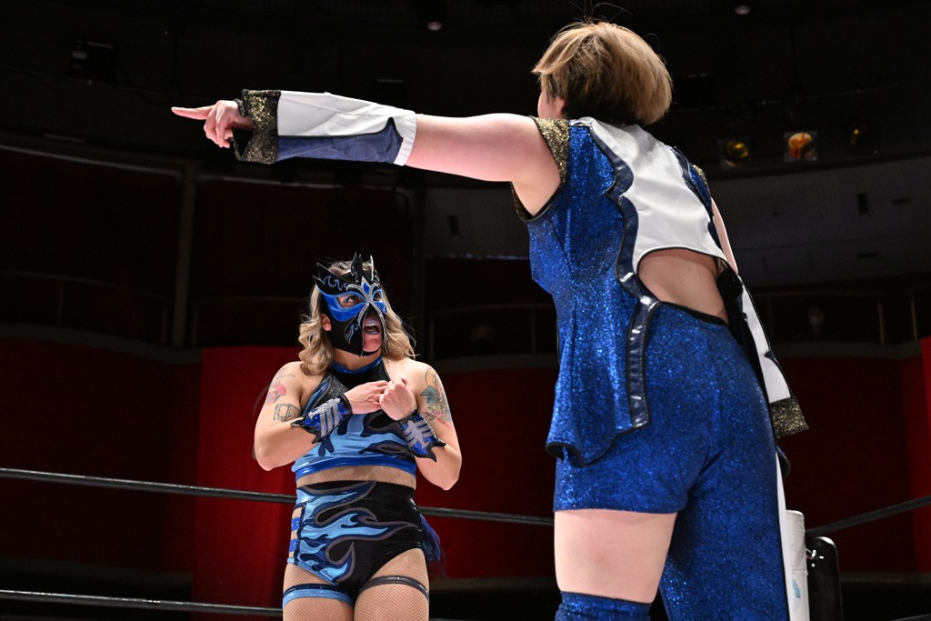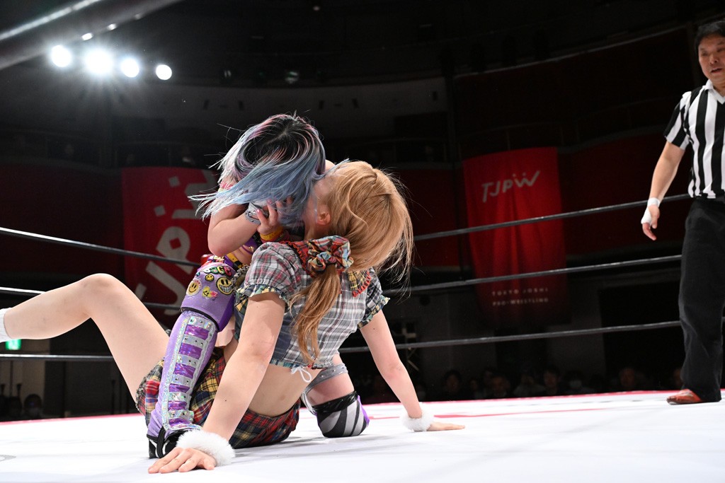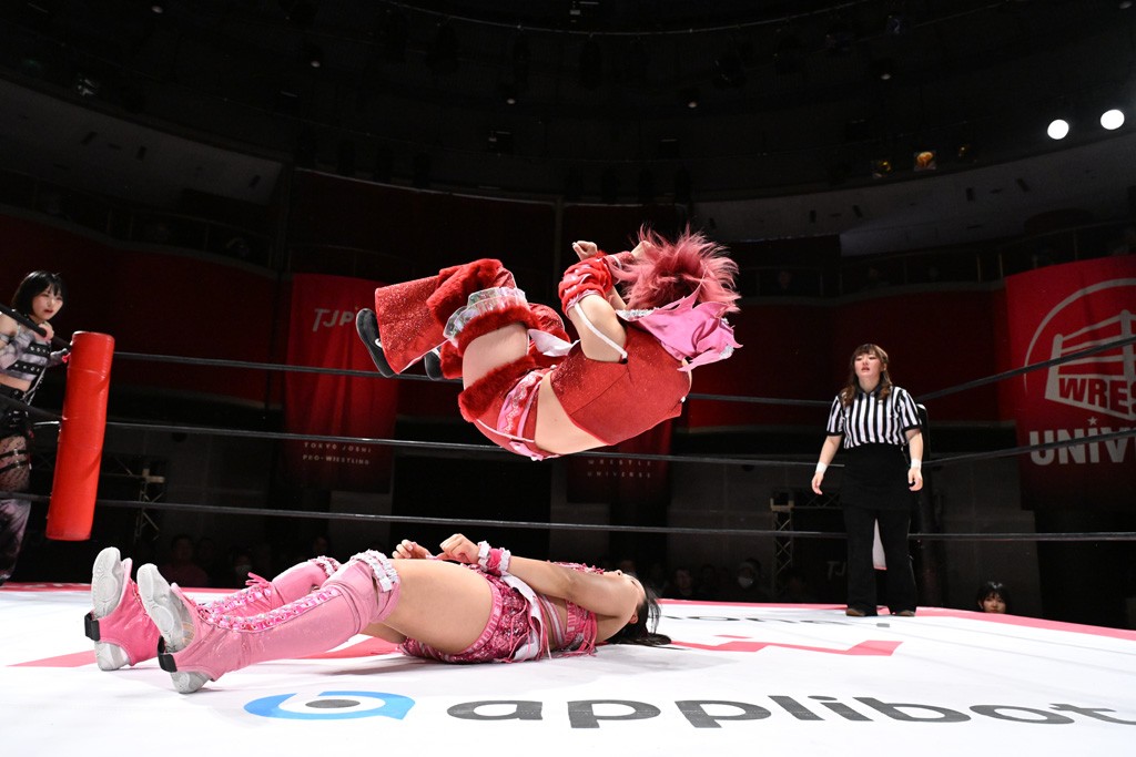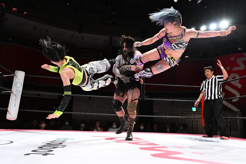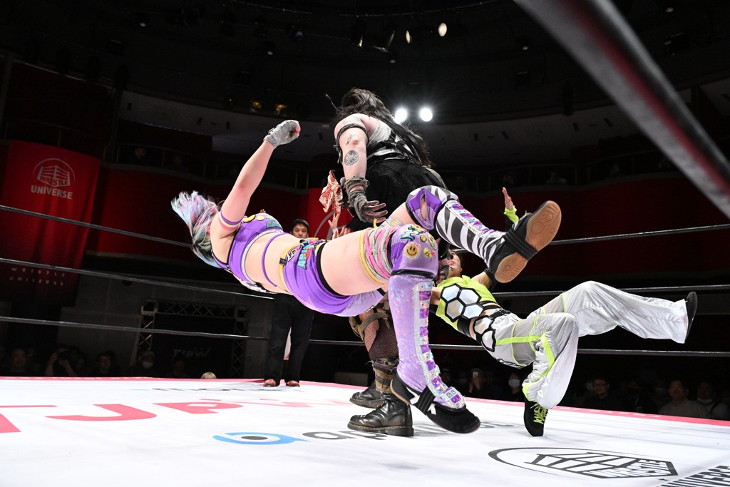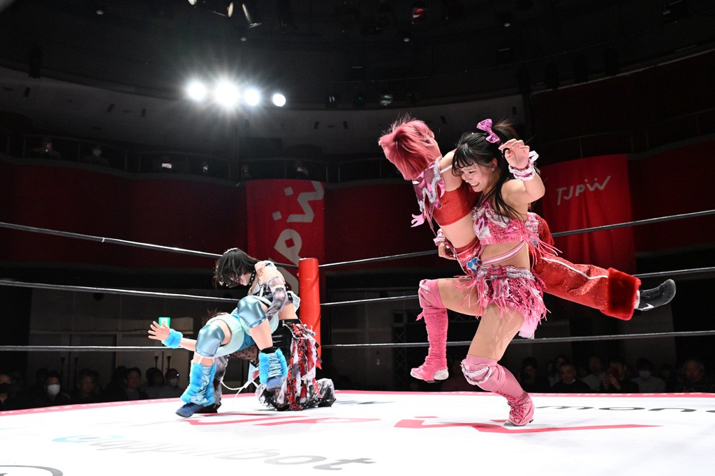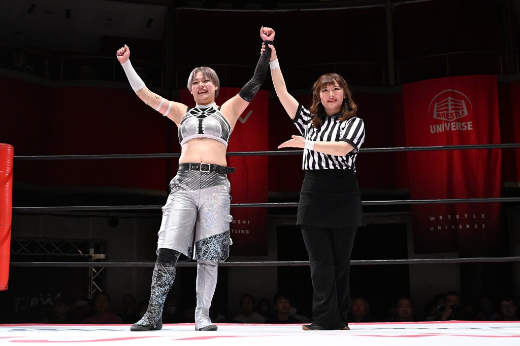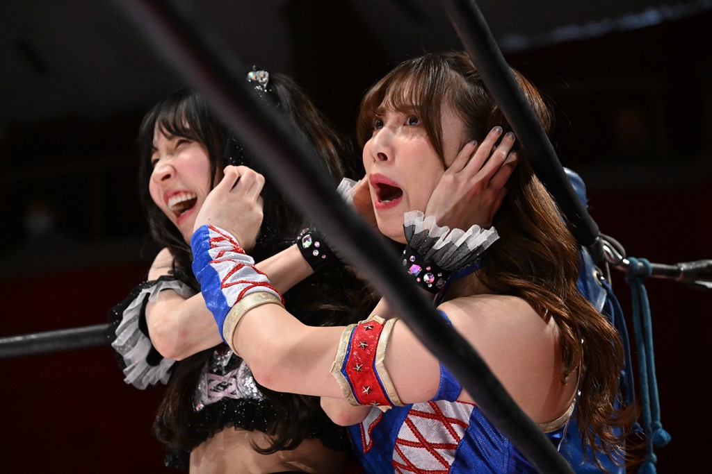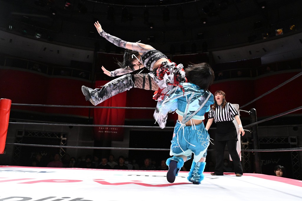 タッグトーナメントで実現しなかったぽむペイラーvsでじもん。ぽむが「お願いしま~す」と大声で口撃してコーナーの上で待機。インペイラーはでじもんを威嚇してからゴング。先発の鈴芽のエルボーに微動だにしない。スクールボーイも倒れず。インペイラーはボディーアタックを食らわせ、ヘアーホイップから踏みつけていく。ぽむがタッチを要求してかわると、でんでん太鼓。カウント2。コーナーに駆け上がってアームドラッグからドロップキックで追撃。すね蹴りをかわした鈴芽がドロップキック。有栖にスイッチしてドロップキック、ロープギロチン、フライング・ボディープレスとたたみかける。キャメルクラッチは大声で叫んで脱すると、インペイラーにスイッチ。セントーンはカウント2。串刺しボディーアタックや串刺しショルダー。続いて担ぎ上げたが、脱した有栖がドロップキックからエルボー連打。突進をかわして自コーナーに押し込むと、かわった鈴芽がハチノス・エイトノット。強引に振りほどかれるも、エプロンで捕獲して有栖がドロップキックで追い打ち。5分経過。連係狙いはインペイラーが阻止して2人まとめてバックドロップで投げ捨てる。ぽむにタッチしてぽむ投げでプレス。コーナーに登ると追ってきた鈴芽を大声で落下させてミサイルキック投下。反撃した鈴芽が丸め込んでからグラウンドのハチノス・エイトノット。これをインペイラーがぽむの足を引いてエスケープさせる。でじもんが連係はインペイラーが救出してぽむ投げで2人まとめて圧殺。鈴芽へコーナーからのスーパーぽむ投げ。カットに来た有栖を場外追放してインペイラーがリバース・スプラッシュを放つが自爆。勝機とみたでじもんはインペイラーへダブルのドロップキック。有栖がスーパーキック、鈴芽がフェースクラッシャーでダメージを与えて、有栖がインペイラーに鶴ヶ城、鈴芽がぽむにフェースクラッシャーで分断すると、鈴芽がリング・ア・ベルで3カウントを奪った。