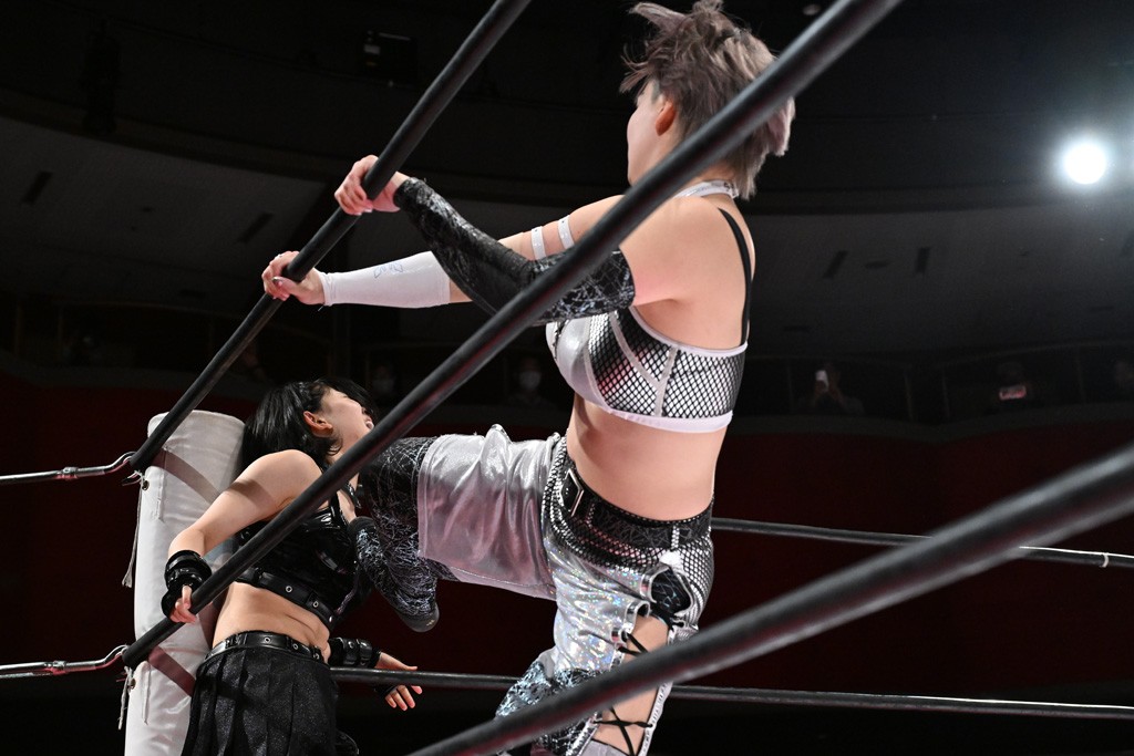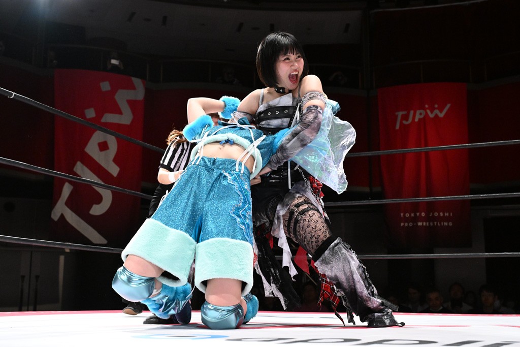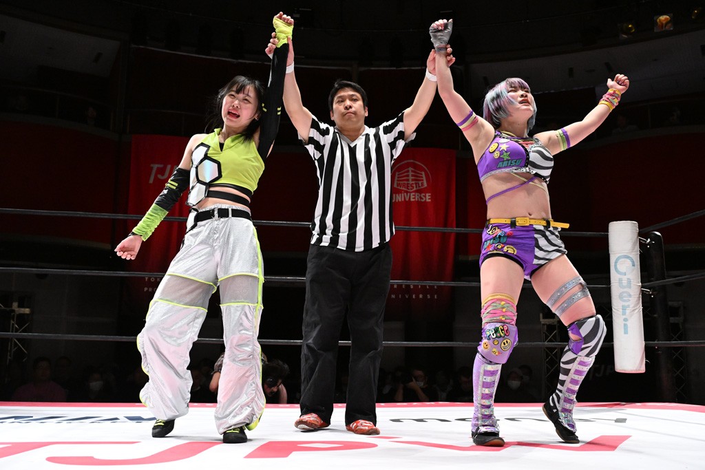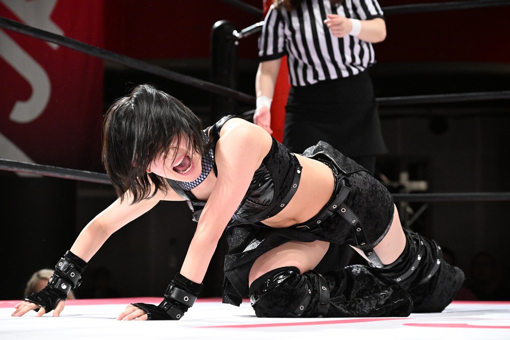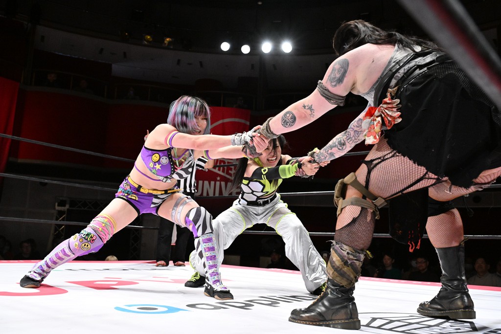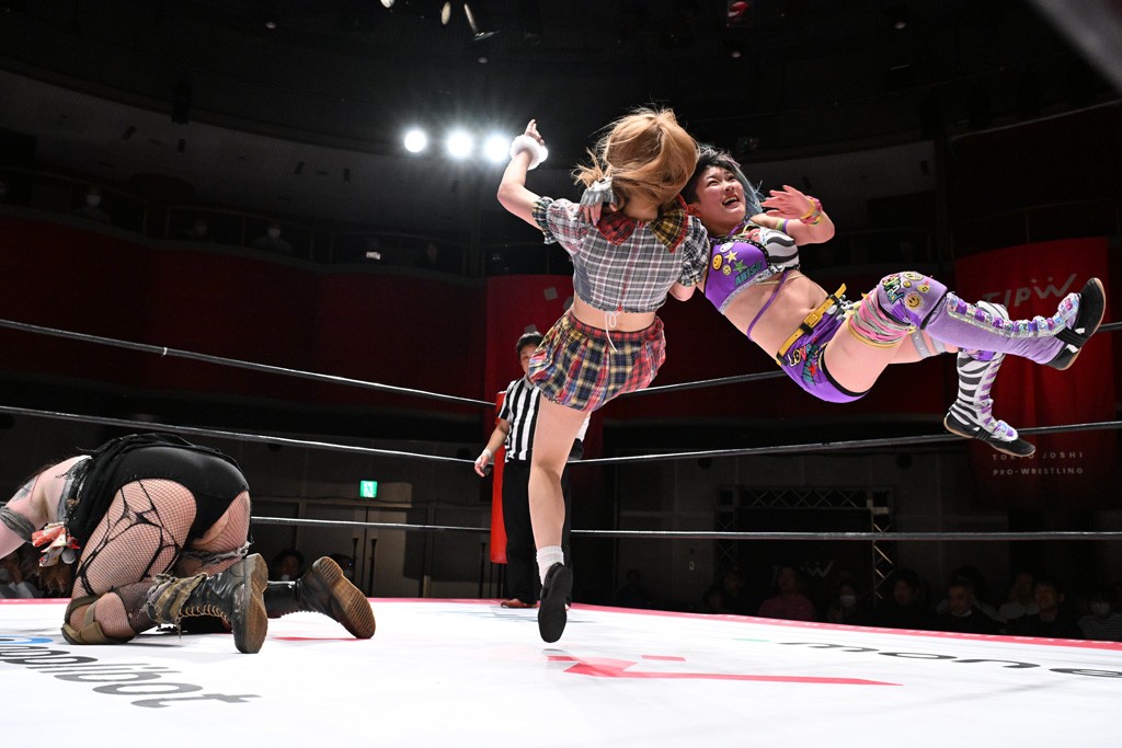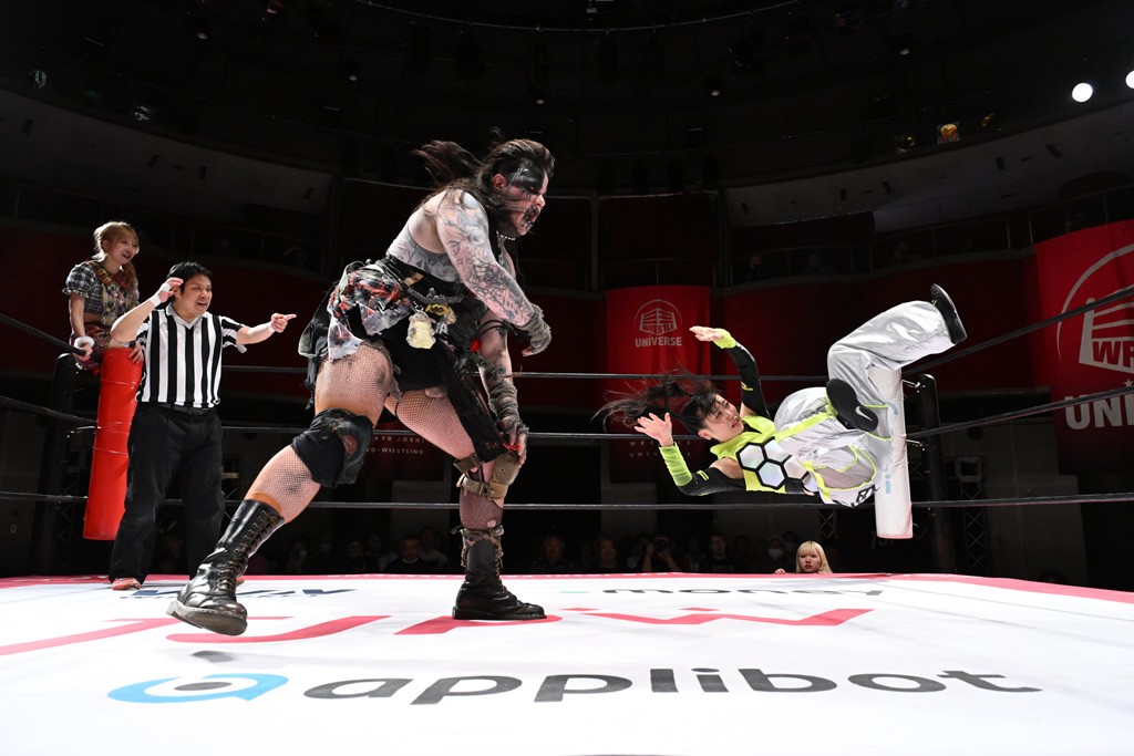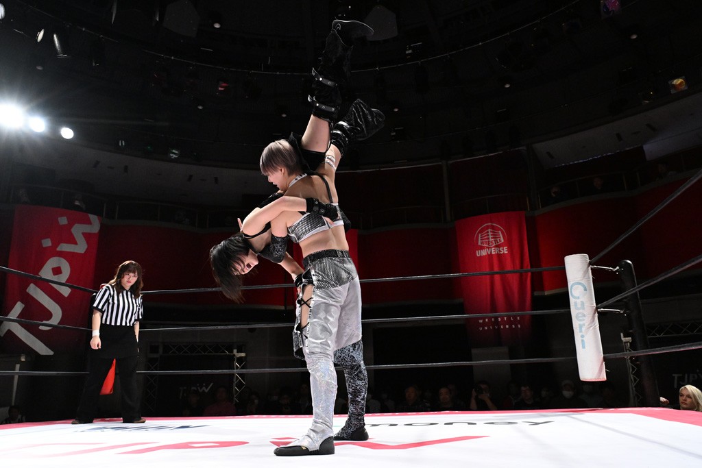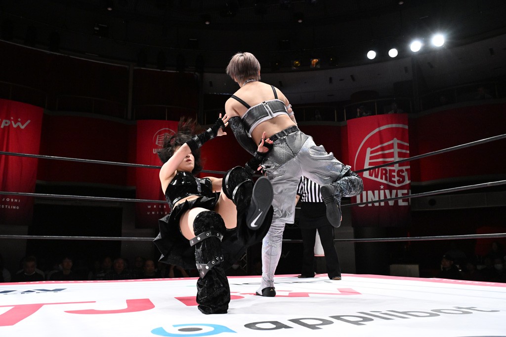 タッグトーナメントで実現しなかったぽむペイラーvsでじもん。ぽむが「お願いしま~す」と大声で口撃してコーナーの上で待機。インペイラーはでじもんを威嚇してからゴング。先発の鈴芽のエルボーに微動だにしない。スクールボーイも倒れず。インペイラーはボディーアタックを食らわせ、ヘアーホイップから踏みつけていく。ぽむがタッチを要求してかわると、でんでん太鼓。カウント2。コーナーに駆け上がってアームドラッグからドロップキックで追撃。すね蹴りをかわした鈴芽がドロップキック。有栖にスイッチしてドロップキック、ロープギロチン、フライング・ボディープレスとたたみかける。キャメルクラッチは大声で叫んで脱すると、インペイラーにスイッチ。セントーンはカウント2。串刺しボディーアタックや串刺しショルダー。続いて担ぎ上げたが、脱した有栖がドロップキックからエルボー連打。突進をかわして自コーナーに押し込むと、かわった鈴芽がハチノス・エイトノット。強引に振りほどかれるも、エプロンで捕獲して有栖がドロップキックで追い打ち。5分経過。連係狙いはインペイラーが阻止して2人まとめてバックドロップで投げ捨てる。ぽむにタッチしてぽむ投げでプレス。コーナーに登ると追ってきた鈴芽を大声で落下させてミサイルキック投下。反撃した鈴芽が丸め込んでからグラウンドのハチノス・エイトノット。これをインペイラーがぽむの足を引いてエスケープさせる。でじもんが連係はインペイラーが救出してぽむ投げで2人まとめて圧殺。鈴芽へコーナーからのスーパーぽむ投げ。カットに来た有栖を場外追放してインペイラーがリバース・スプラッシュを放つが自爆。勝機とみたでじもんはインペイラーへダブルのドロップキック。有栖がスーパーキック、鈴芽がフェースクラッシャーでダメージを与えて、有栖がインペイラーに鶴ヶ城、鈴芽がぽむにフェースクラッシャーで分断すると、鈴芽がリング・ア・ベルで3カウントを奪った。