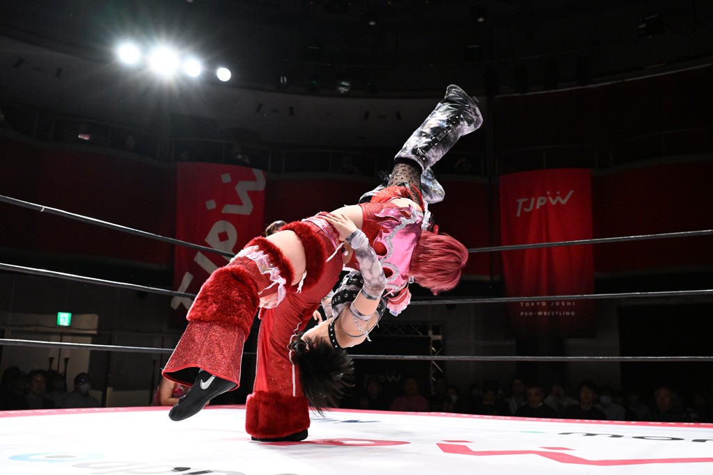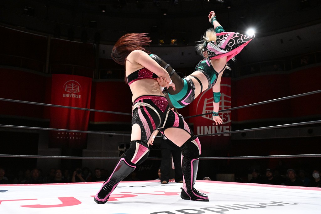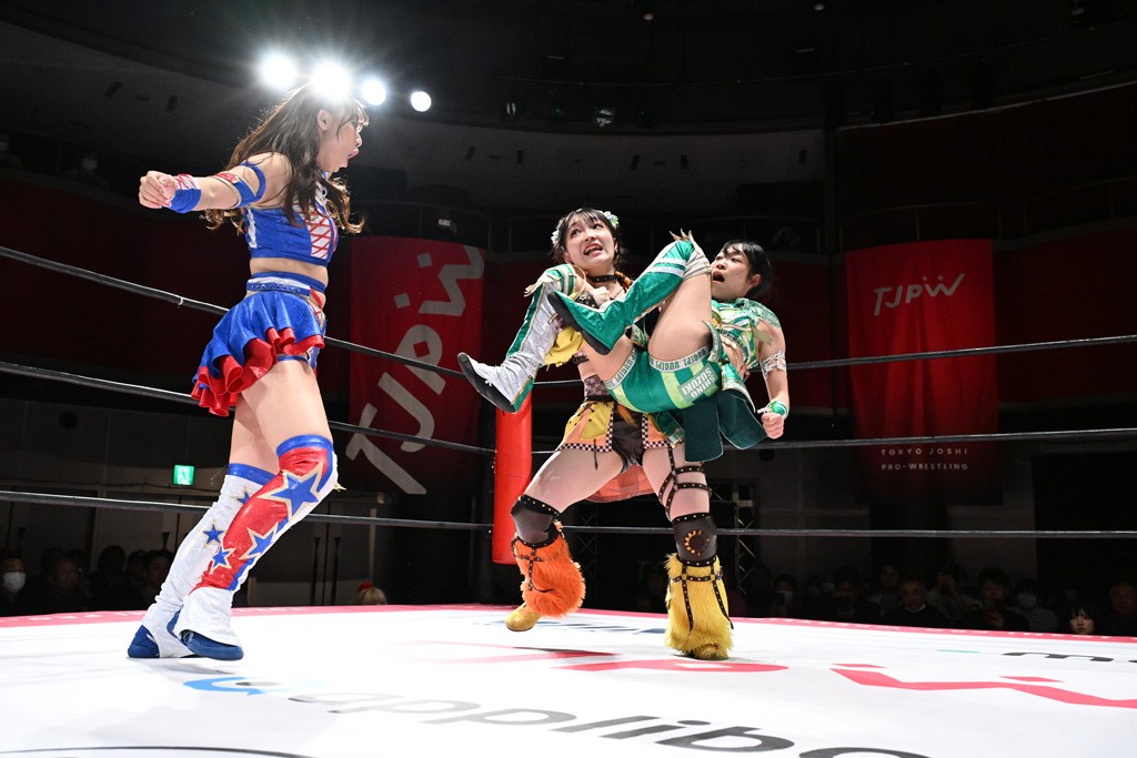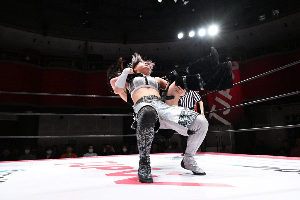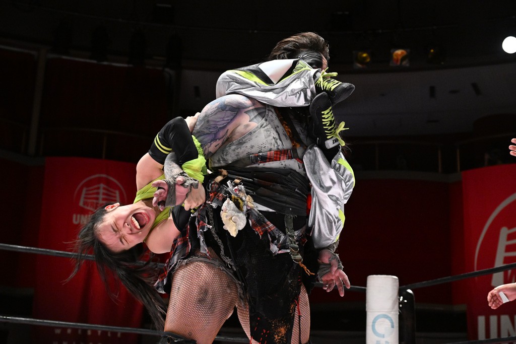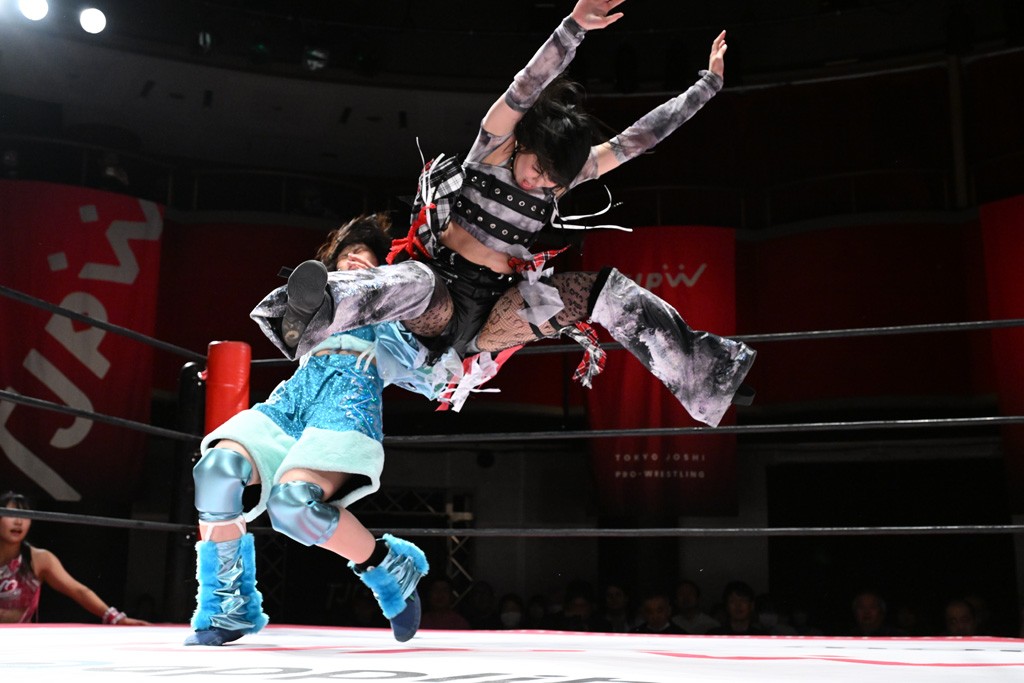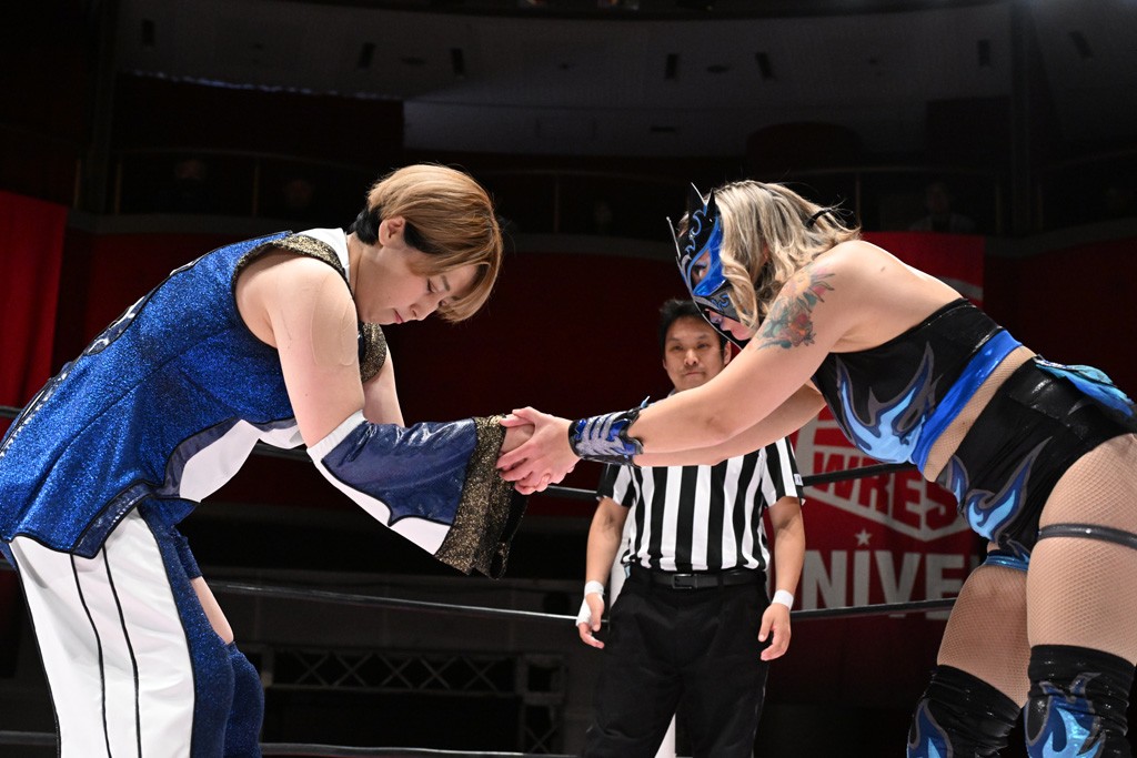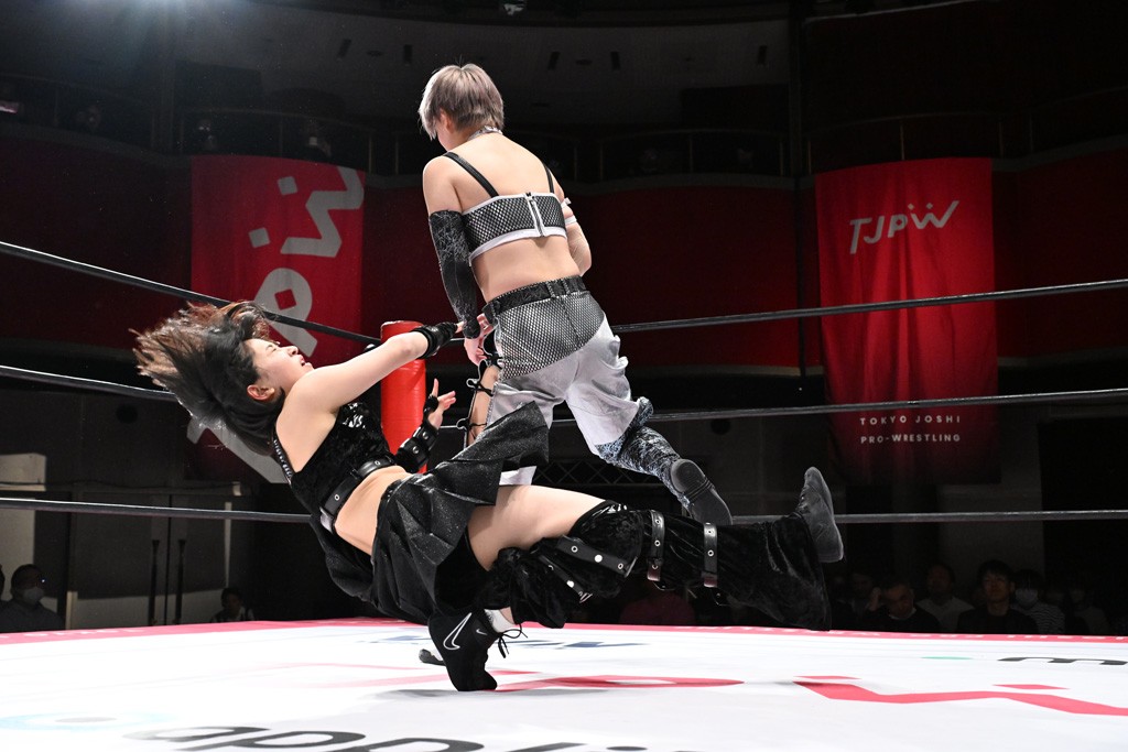 タッグトーナメントで実現しなかったぽむペイラーvsでじもん。ぽむが「お願いしま~す」と大声で口撃してコーナーの上で待機。インペイラーはでじもんを威嚇してからゴング。先発の鈴芽のエルボーに微動だにしない。スクールボーイも倒れず。インペイラーはボディーアタックを食らわせ、ヘアーホイップから踏みつけていく。ぽむがタッチを要求してかわると、でんでん太鼓。カウント2。コーナーに駆け上がってアームドラッグからドロップキックで追撃。すね蹴りをかわした鈴芽がドロップキック。有栖にスイッチしてドロップキック、ロープギロチン、フライング・ボディープレスとたたみかける。キャメルクラッチは大声で叫んで脱すると、インペイラーにスイッチ。セントーンはカウント2。串刺しボディーアタックや串刺しショルダー。続いて担ぎ上げたが、脱した有栖がドロップキックからエルボー連打。突進をかわして自コーナーに押し込むと、かわった鈴芽がハチノス・エイトノット。強引に振りほどかれるも、エプロンで捕獲して有栖がドロップキックで追い打ち。5分経過。連係狙いはインペイラーが阻止して2人まとめてバックドロップで投げ捨てる。ぽむにタッチしてぽむ投げでプレス。コーナーに登ると追ってきた鈴芽を大声で落下させてミサイルキック投下。反撃した鈴芽が丸め込んでからグラウンドのハチノス・エイトノット。これをインペイラーがぽむの足を引いてエスケープさせる。でじもんが連係はインペイラーが救出してぽむ投げで2人まとめて圧殺。鈴芽へコーナーからのスーパーぽむ投げ。カットに来た有栖を場外追放してインペイラーがリバース・スプラッシュを放つが自爆。勝機とみたでじもんはインペイラーへダブルのドロップキック。有栖がスーパーキック、鈴芽がフェースクラッシャーでダメージを与えて、有栖がインペイラーに鶴ヶ城、鈴芽がぽむにフェースクラッシャーで分断すると、鈴芽がリング・ア・ベルで3カウントを奪った。