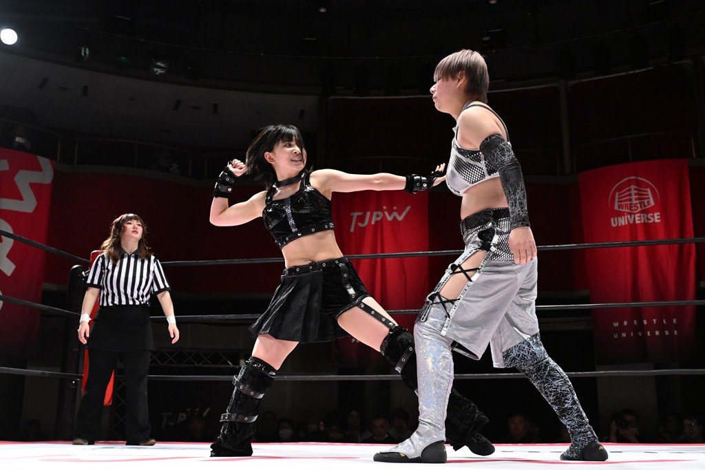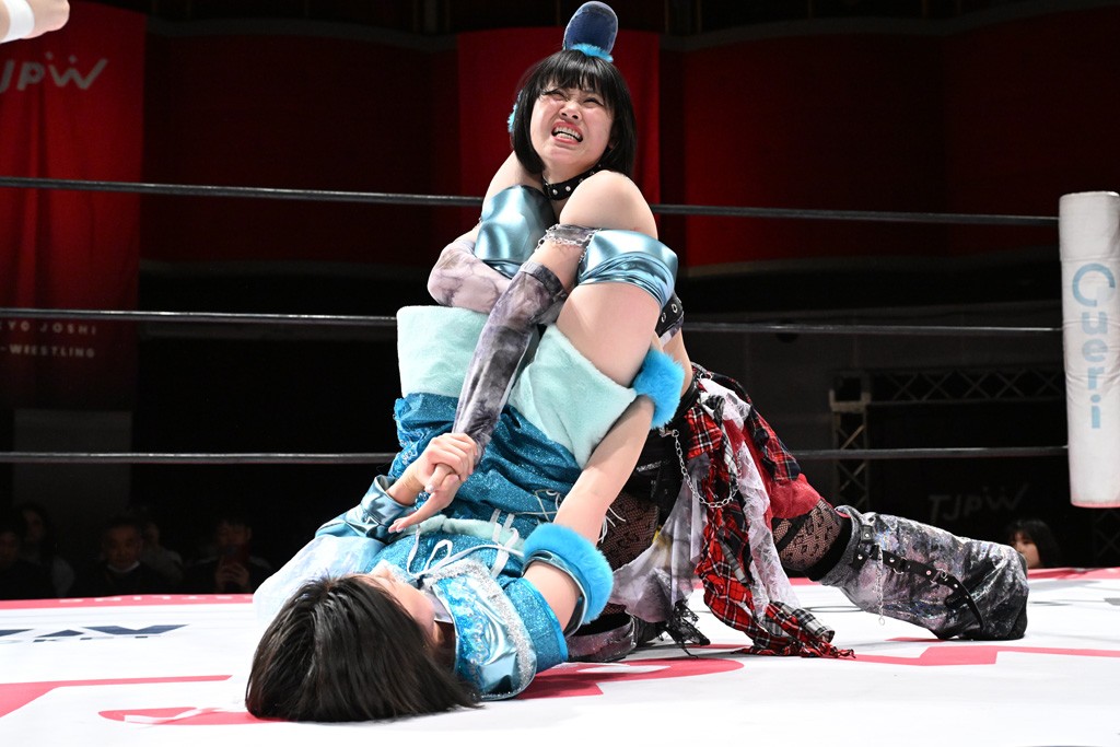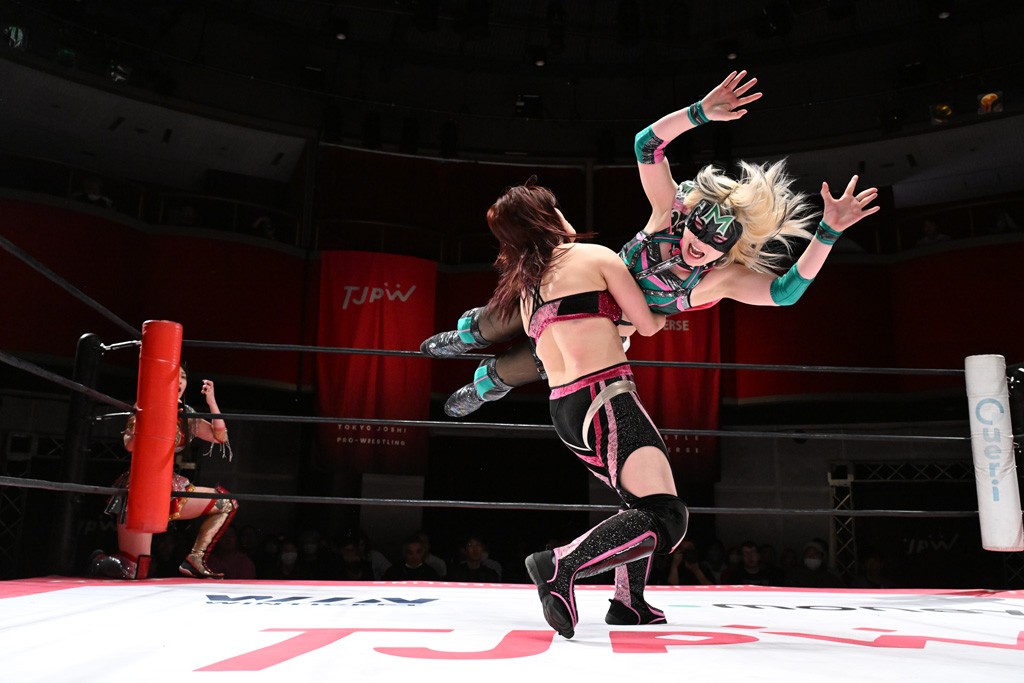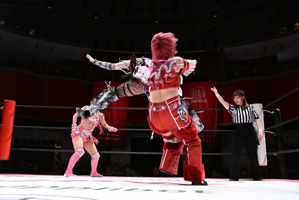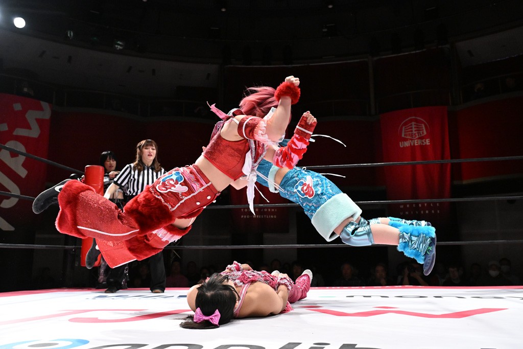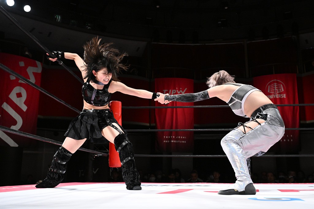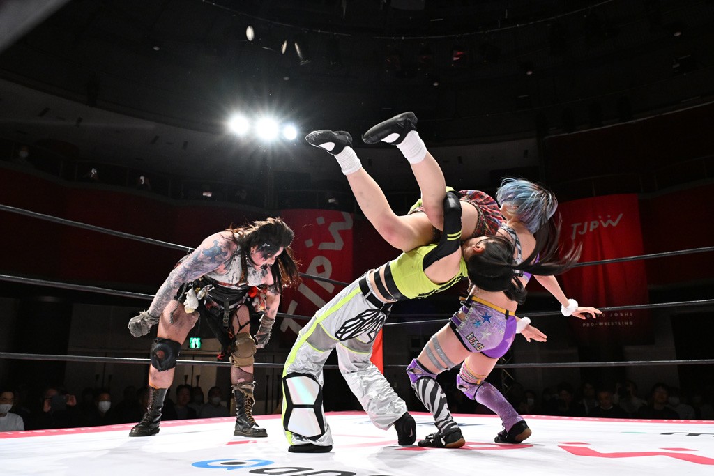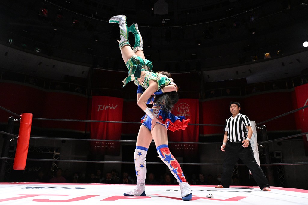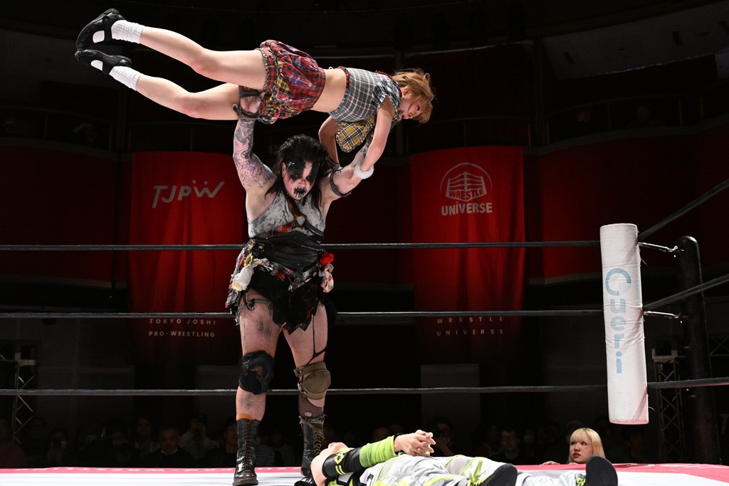 タッグトーナメントで実現しなかったぽむペイラーvsでじもん。ぽむが「お願いしま~す」と大声で口撃してコーナーの上で待機。インペイラーはでじもんを威嚇してからゴング。先発の鈴芽のエルボーに微動だにしない。スクールボーイも倒れず。インペイラーはボディーアタックを食らわせ、ヘアーホイップから踏みつけていく。ぽむがタッチを要求してかわると、でんでん太鼓。カウント2。コーナーに駆け上がってアームドラッグからドロップキックで追撃。すね蹴りをかわした鈴芽がドロップキック。有栖にスイッチしてドロップキック、ロープギロチン、フライング・ボディープレスとたたみかける。キャメルクラッチは大声で叫んで脱すると、インペイラーにスイッチ。セントーンはカウント2。串刺しボディーアタックや串刺しショルダー。続いて担ぎ上げたが、脱した有栖がドロップキックからエルボー連打。突進をかわして自コーナーに押し込むと、かわった鈴芽がハチノス・エイトノット。強引に振りほどかれるも、エプロンで捕獲して有栖がドロップキックで追い打ち。5分経過。連係狙いはインペイラーが阻止して2人まとめてバックドロップで投げ捨てる。ぽむにタッチしてぽむ投げでプレス。コーナーに登ると追ってきた鈴芽を大声で落下させてミサイルキック投下。反撃した鈴芽が丸め込んでからグラウンドのハチノス・エイトノット。これをインペイラーがぽむの足を引いてエスケープさせる。でじもんが連係はインペイラーが救出してぽむ投げで2人まとめて圧殺。鈴芽へコーナーからのスーパーぽむ投げ。カットに来た有栖を場外追放してインペイラーがリバース・スプラッシュを放つが自爆。勝機とみたでじもんはインペイラーへダブルのドロップキック。有栖がスーパーキック、鈴芽がフェースクラッシャーでダメージを与えて、有栖がインペイラーに鶴ヶ城、鈴芽がぽむにフェースクラッシャーで分断すると、鈴芽がリング・ア・ベルで3カウントを奪った。
