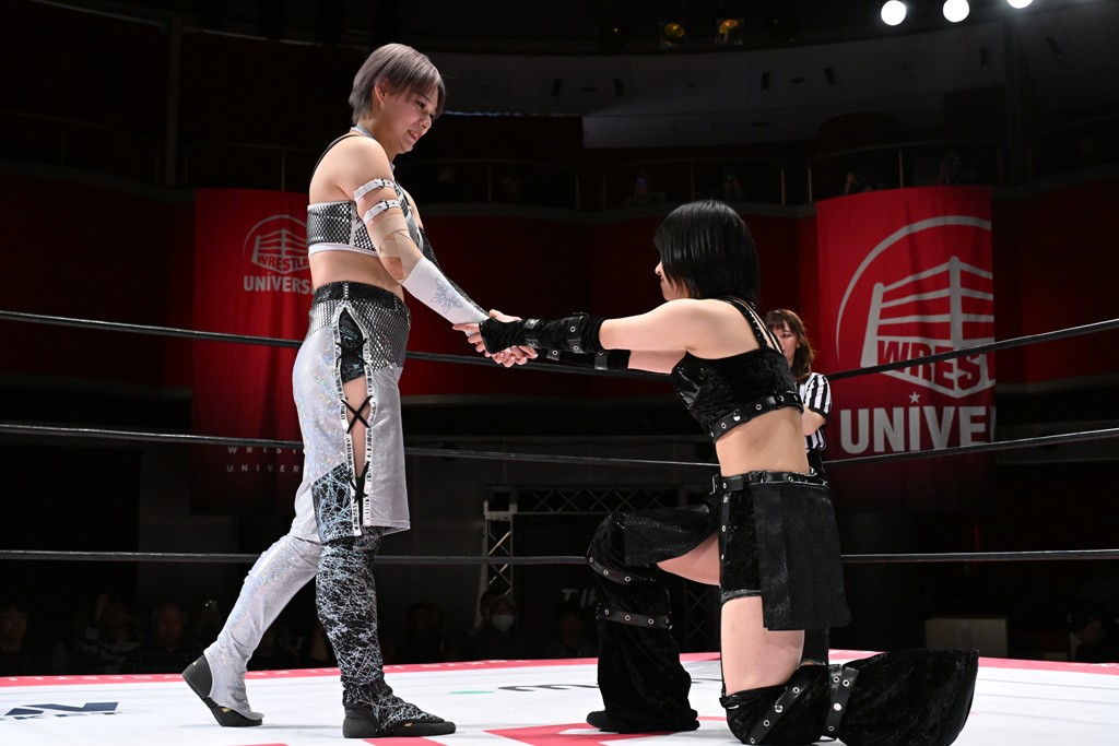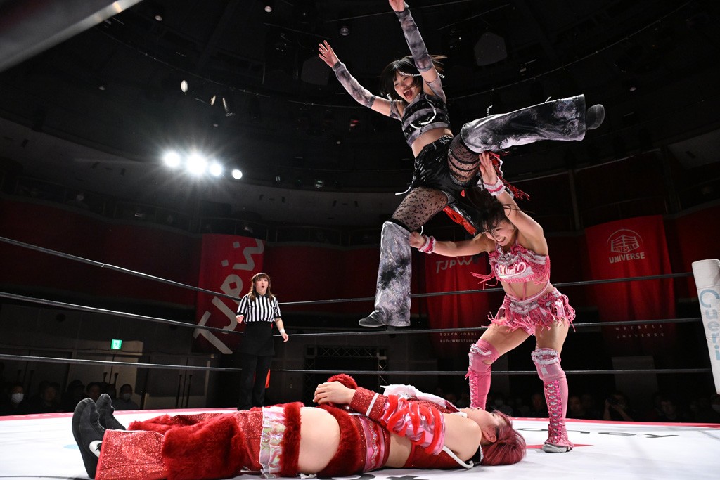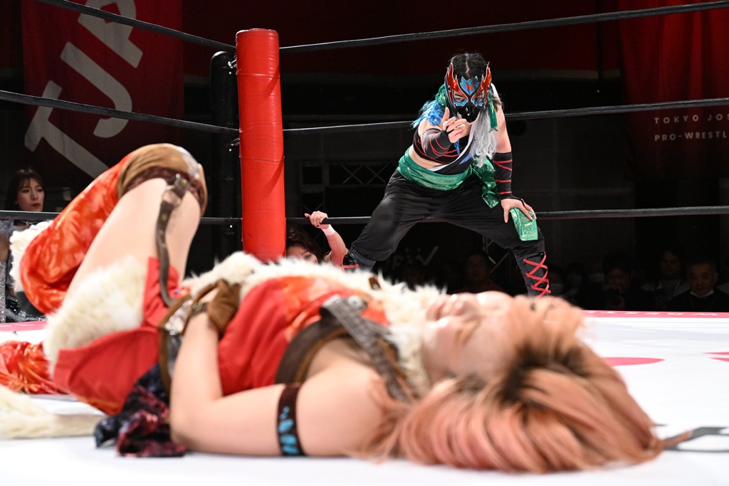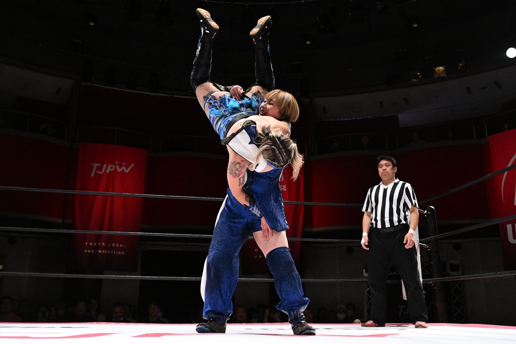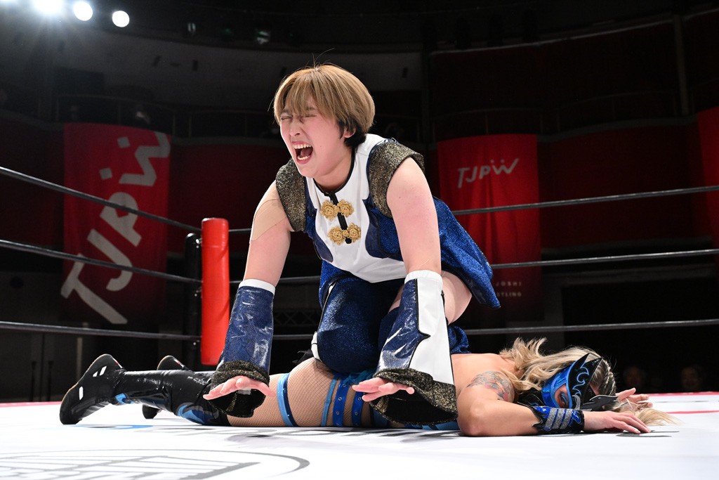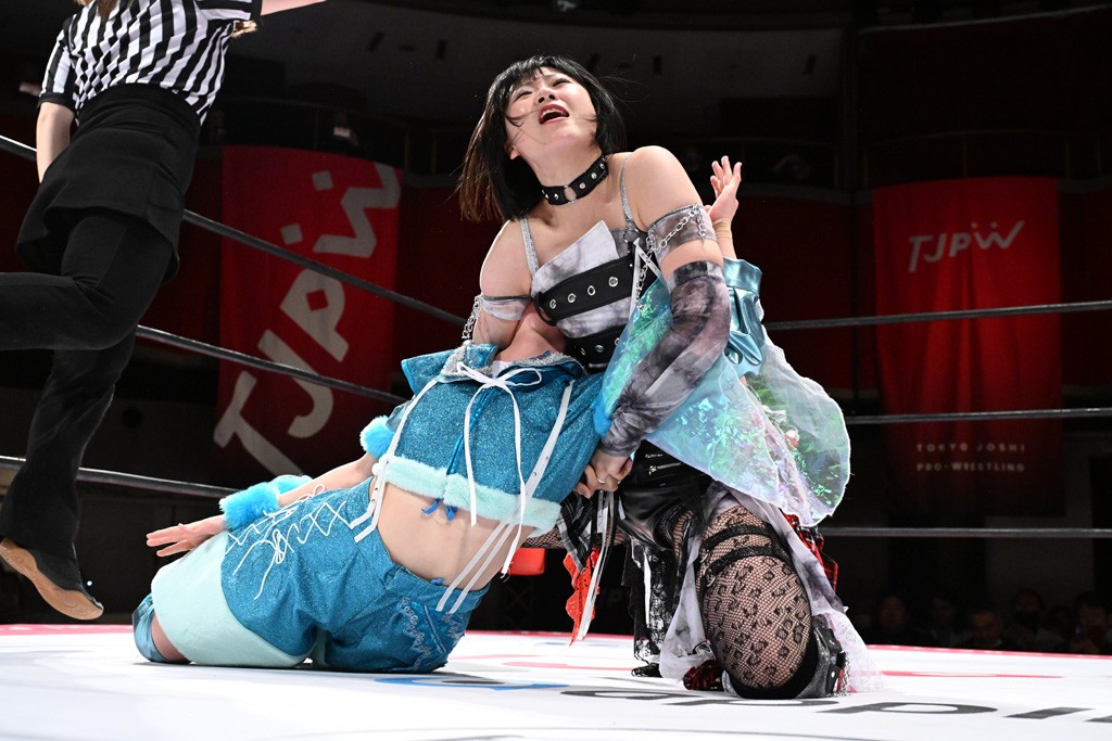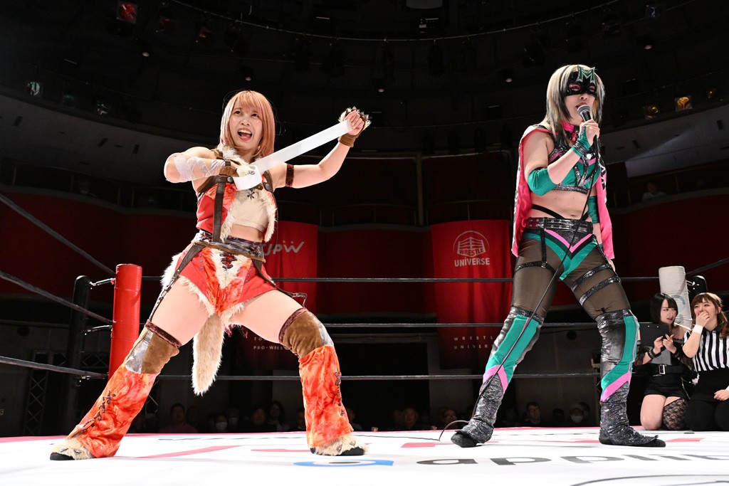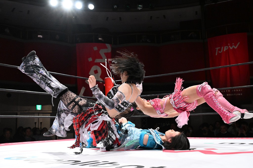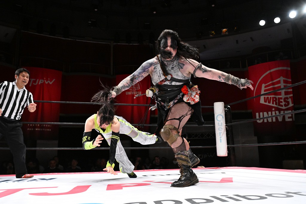 タッグトーナメントで実現しなかったぽむペイラーvsでじもん。ぽむが「お願いしま~す」と大声で口撃してコーナーの上で待機。インペイラーはでじもんを威嚇してからゴング。先発の鈴芽のエルボーに微動だにしない。スクールボーイも倒れず。インペイラーはボディーアタックを食らわせ、ヘアーホイップから踏みつけていく。ぽむがタッチを要求してかわると、でんでん太鼓。カウント2。コーナーに駆け上がってアームドラッグからドロップキックで追撃。すね蹴りをかわした鈴芽がドロップキック。有栖にスイッチしてドロップキック、ロープギロチン、フライング・ボディープレスとたたみかける。キャメルクラッチは大声で叫んで脱すると、インペイラーにスイッチ。セントーンはカウント2。串刺しボディーアタックや串刺しショルダー。続いて担ぎ上げたが、脱した有栖がドロップキックからエルボー連打。突進をかわして自コーナーに押し込むと、かわった鈴芽がハチノス・エイトノット。強引に振りほどかれるも、エプロンで捕獲して有栖がドロップキックで追い打ち。5分経過。連係狙いはインペイラーが阻止して2人まとめてバックドロップで投げ捨てる。ぽむにタッチしてぽむ投げでプレス。コーナーに登ると追ってきた鈴芽を大声で落下させてミサイルキック投下。反撃した鈴芽が丸め込んでからグラウンドのハチノス・エイトノット。これをインペイラーがぽむの足を引いてエスケープさせる。でじもんが連係はインペイラーが救出してぽむ投げで2人まとめて圧殺。鈴芽へコーナーからのスーパーぽむ投げ。カットに来た有栖を場外追放してインペイラーがリバース・スプラッシュを放つが自爆。勝機とみたでじもんはインペイラーへダブルのドロップキック。有栖がスーパーキック、鈴芽がフェースクラッシャーでダメージを与えて、有栖がインペイラーに鶴ヶ城、鈴芽がぽむにフェースクラッシャーで分断すると、鈴芽がリング・ア・ベルで3カウントを奪った。