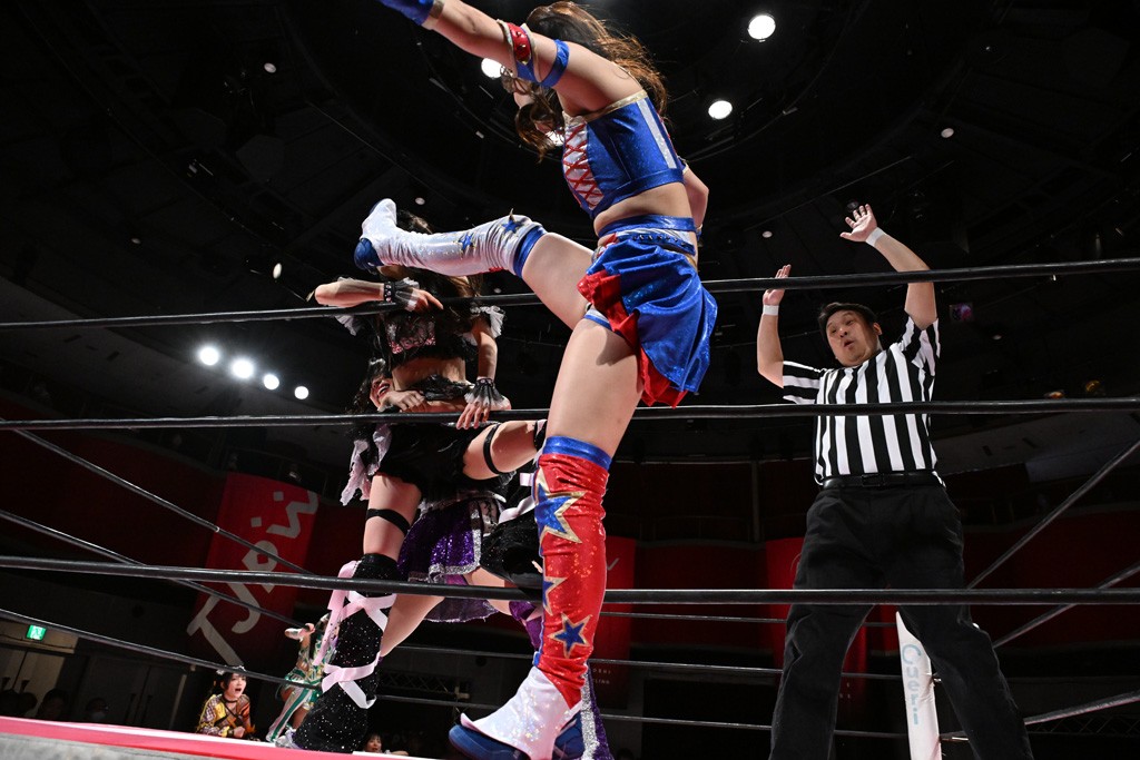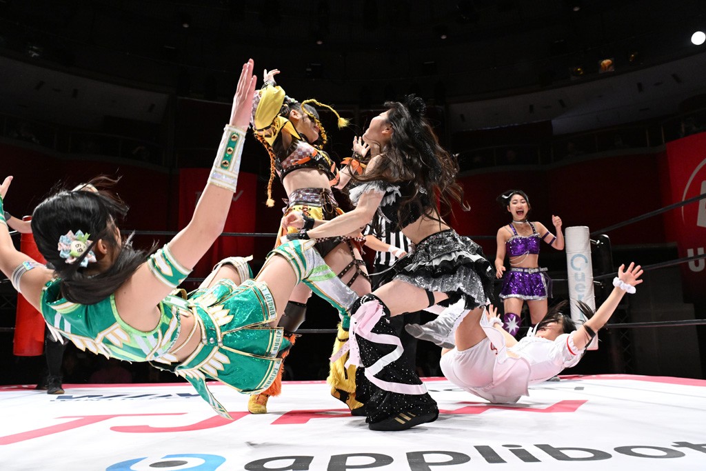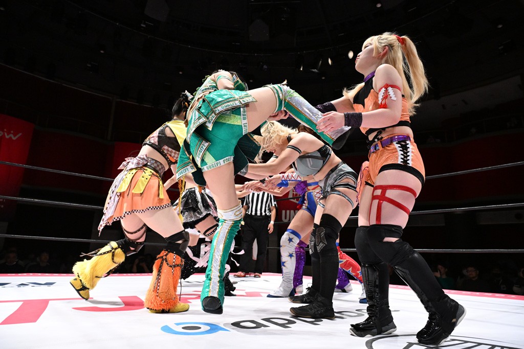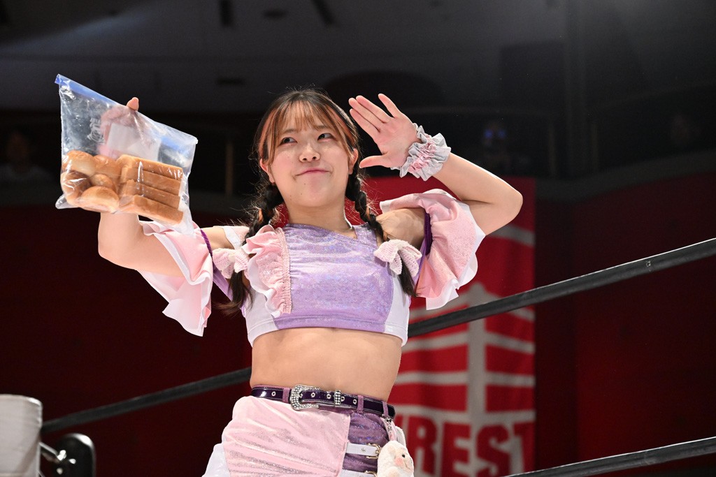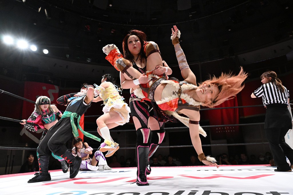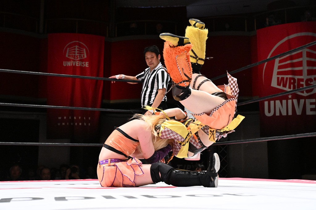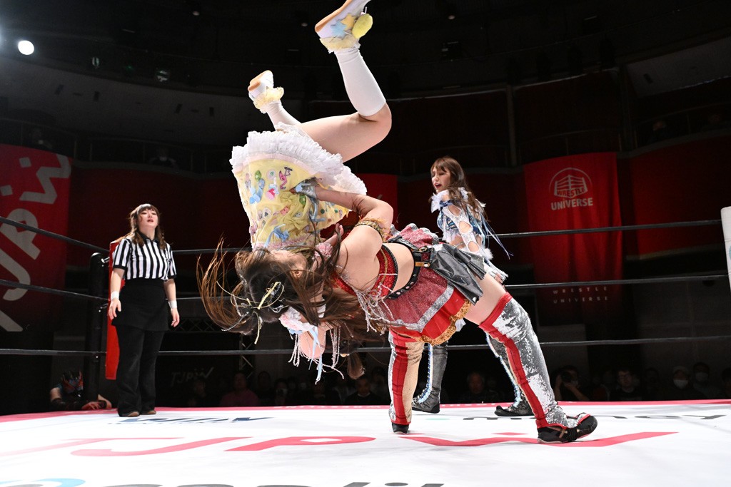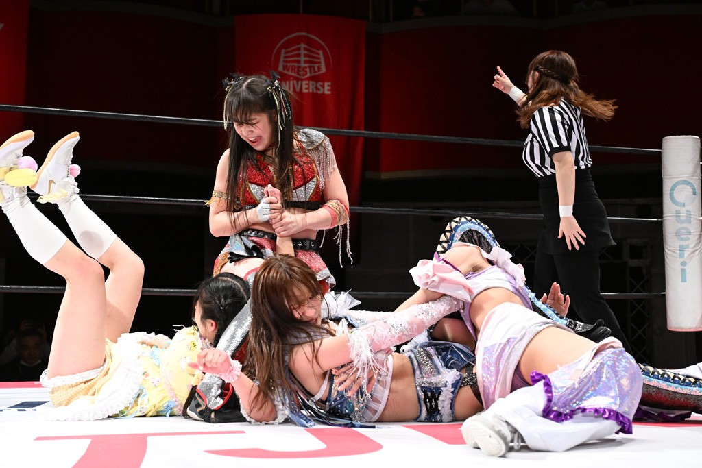 Ober Eats&K!SS//が入場する前にミサヲがマイクで作戦を「鳥喰はらくのアイマスクで視界を奪い、山下をらくの布団でぐるぐる巻に。くいしんぼうの上原は小夏のパンで釣り、上福を1人にしてミサヲのスーパー風呂敷で視界を奪う」と発表。山下が入場すると中島組が襲って鳥喰を視界不良に、山下が布団に包まれて戦闘不能に。続けてトロフィーとともOber Eatsが入場すると、上原がパンに釣られて場外に追放すると、リング内に1人になった上福にミサヲが風呂敷で視界を奪う。さらに山下をリング内に上げてると、風呂敷を取った上福が山下にストンピング。「コナツ」コールの中、山下が露わになると、同士討ちに気付いた上福をミサヲ組が奇襲しておやすみエクスプレス&おやすみなさいフォール。カウント2。サミングの乱れ打ちでピンチを脱した上福は小夏を捕まえて上原を呼び込むも、返事がない。慌てて上原がリングインして大謝り。Ober Eatsが合体の複合関節を決めながらポーズ。さらに上原がドロップキックを放って山下にスイッチ。サッカーボールキックはカウント2。鳥喰にかわると串刺しエルボー。5分経過。カウンターのドロップキックを決めた小夏から中島にスイッチ。鳥喰にハリケーンラナからスワンダイブのハリケーンラナ。カウント2。ノーザンライトSHは決まらず、鳥喰のオーバーヘッドキックを食らうも中島が619の体勢。これを山下がカットしてK!SS//が連係でダブルのミドルキック。ロープワークでスイッチしたミサヲが山下に背後からニーストライク。クロスボディーからチキンウィング・フェースロック。立ち上がって脱した山下がハイキック。ミサヲはニーストライクで対抗するが、山下がリターン・クラッシュで応戦。両軍スイッチして上原がらくにスペース・ローリングエルボー。ドロップキックはカウント2。抵抗したらくに上福がビッグブーツから上原からスナップ・スープレックス。さらにOber Eatsがビッグブーツの合体技。カバーを中島がカットして、らくがぽっぽーチョップ!!連発でピンチを脱する。10分経過、小夏との連係を上原は側転で回避。Ober Eatsの連係はらくがカットインしてフェースクラッシャー。さらにこなつくらっしゅとスーパービュー踊り子の連係が決まる。カウント2となって小夏が回転エビ固め。カットに入った山下のキックが上福に誤爆してしまうと中島が上原にトペ、ミサヲが山下にニーストライクで分断。リング内では小夏がひつじ座コメット(ステップ式スワンダイブ・ミサイルキック)でダイブするも、避けた上福が串刺しドロップキック。さらに湘南台卍で捕獲すると、上原もバナナ・ピローでらくを捕らえてアシスト。たまらず小夏がギブアップ。